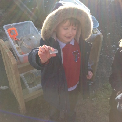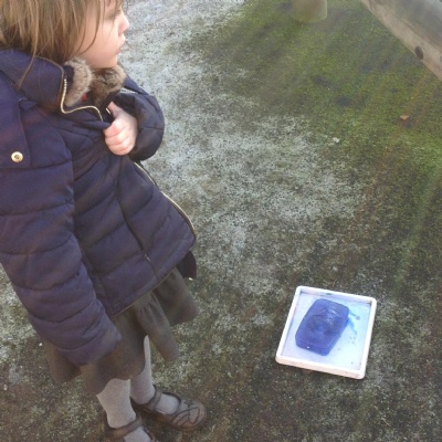 This week we have been out in the garden in the cold weather.  The children discovered ice in different places in the garden and we talked about how the ice formed and why.  We then did an experiment with two coloured ice blocks.  We placed one inside the classroom near the heater and the other outside near the climbing frame.  We watched what happened throughout the day and the children then recorded their findings and talked about what they found out.