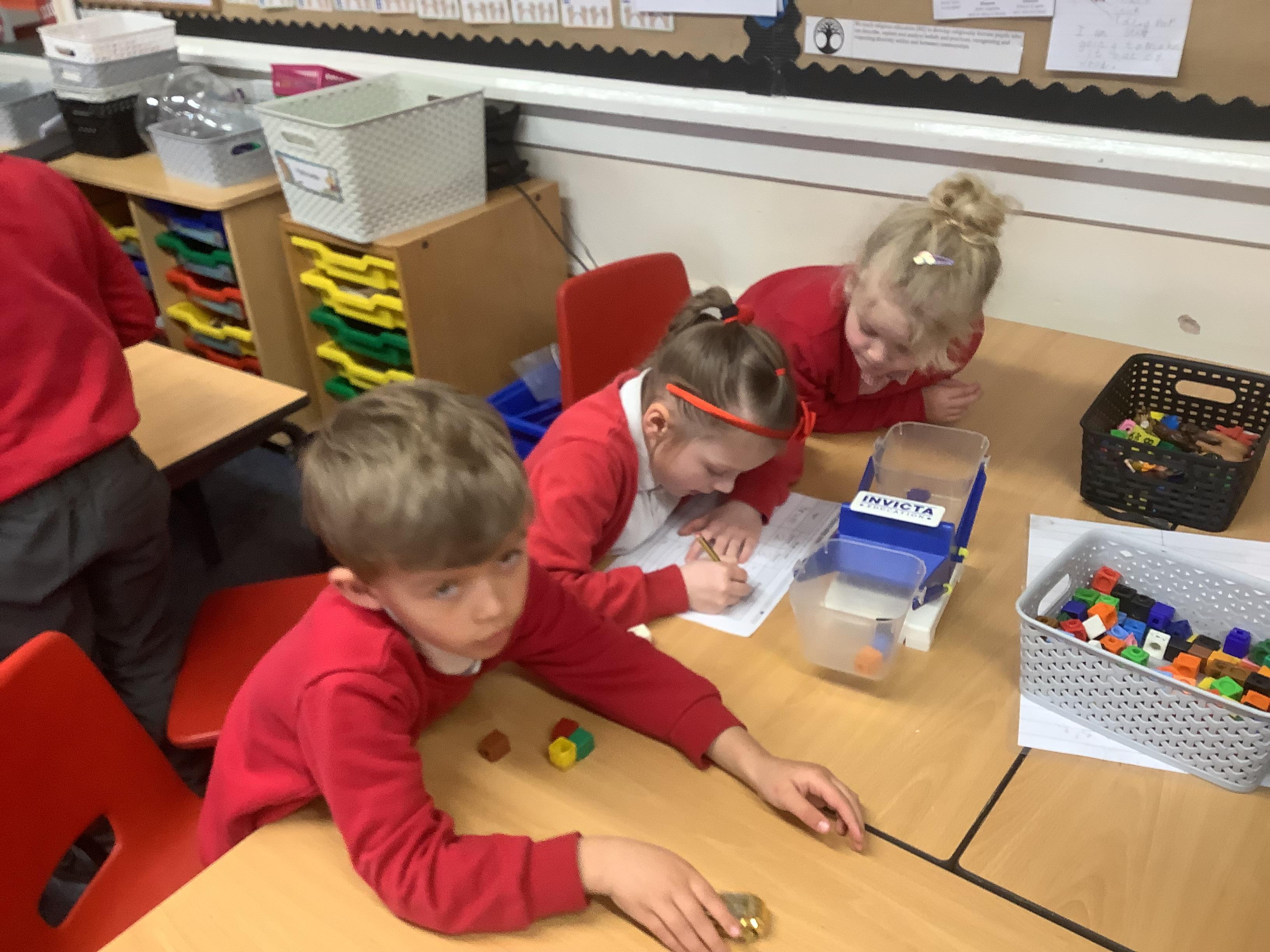 In Year 1 Maths we measured the mass of objects using cubes. We estimated first and then carefully counted the cubes on to the balance. We carefully looked to see if the scales were balanced.