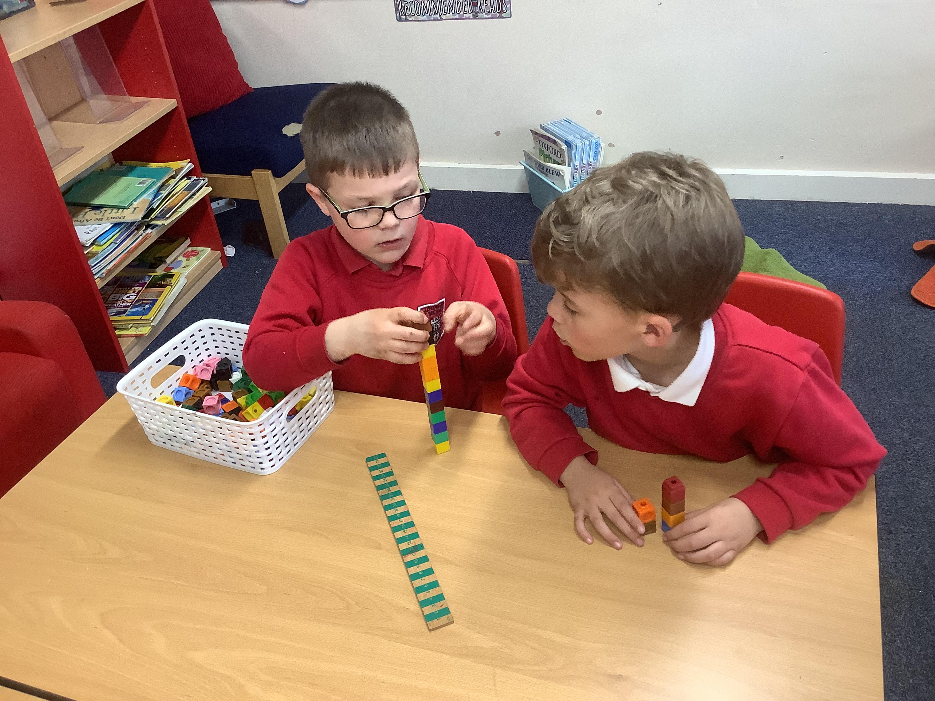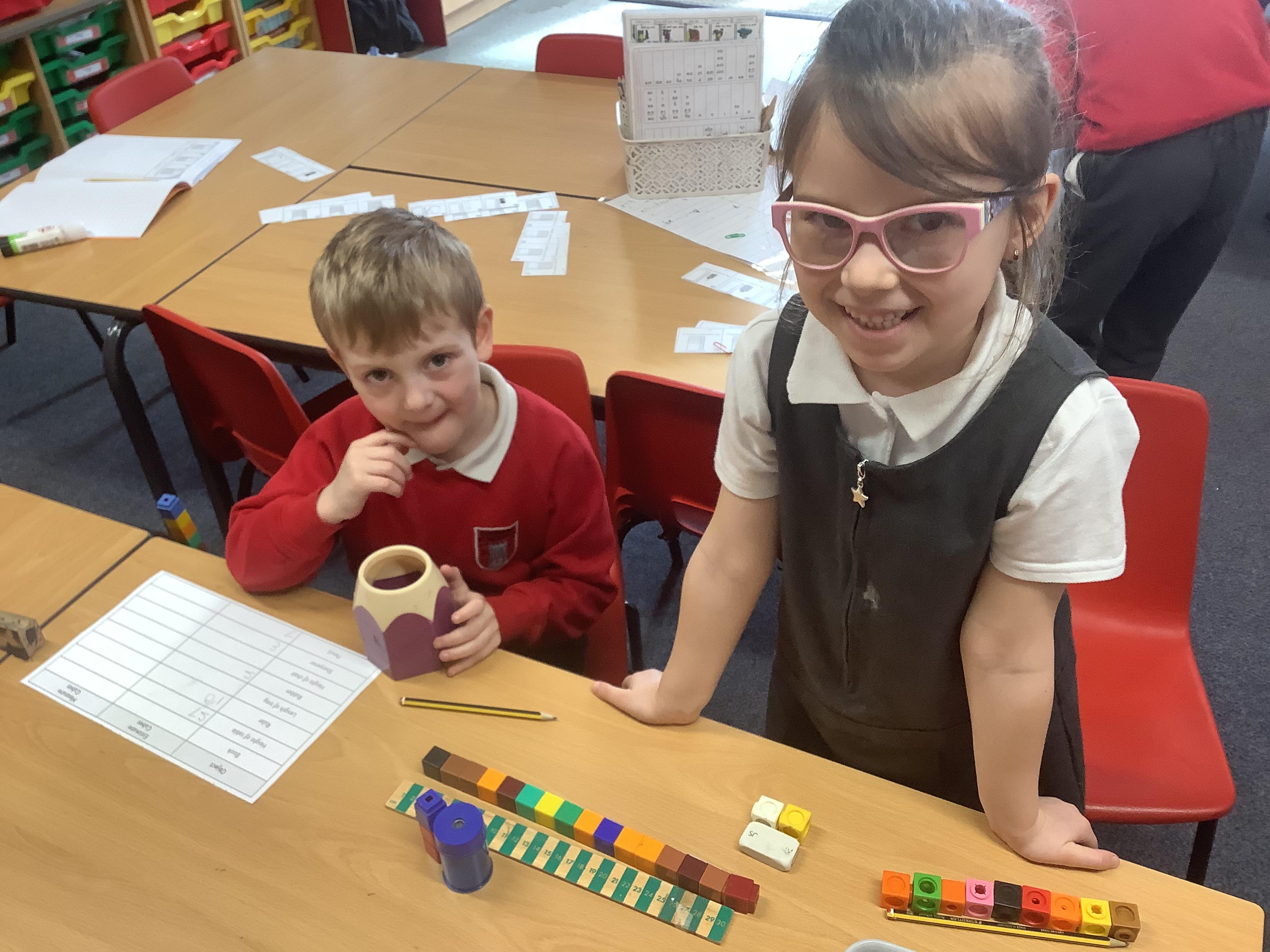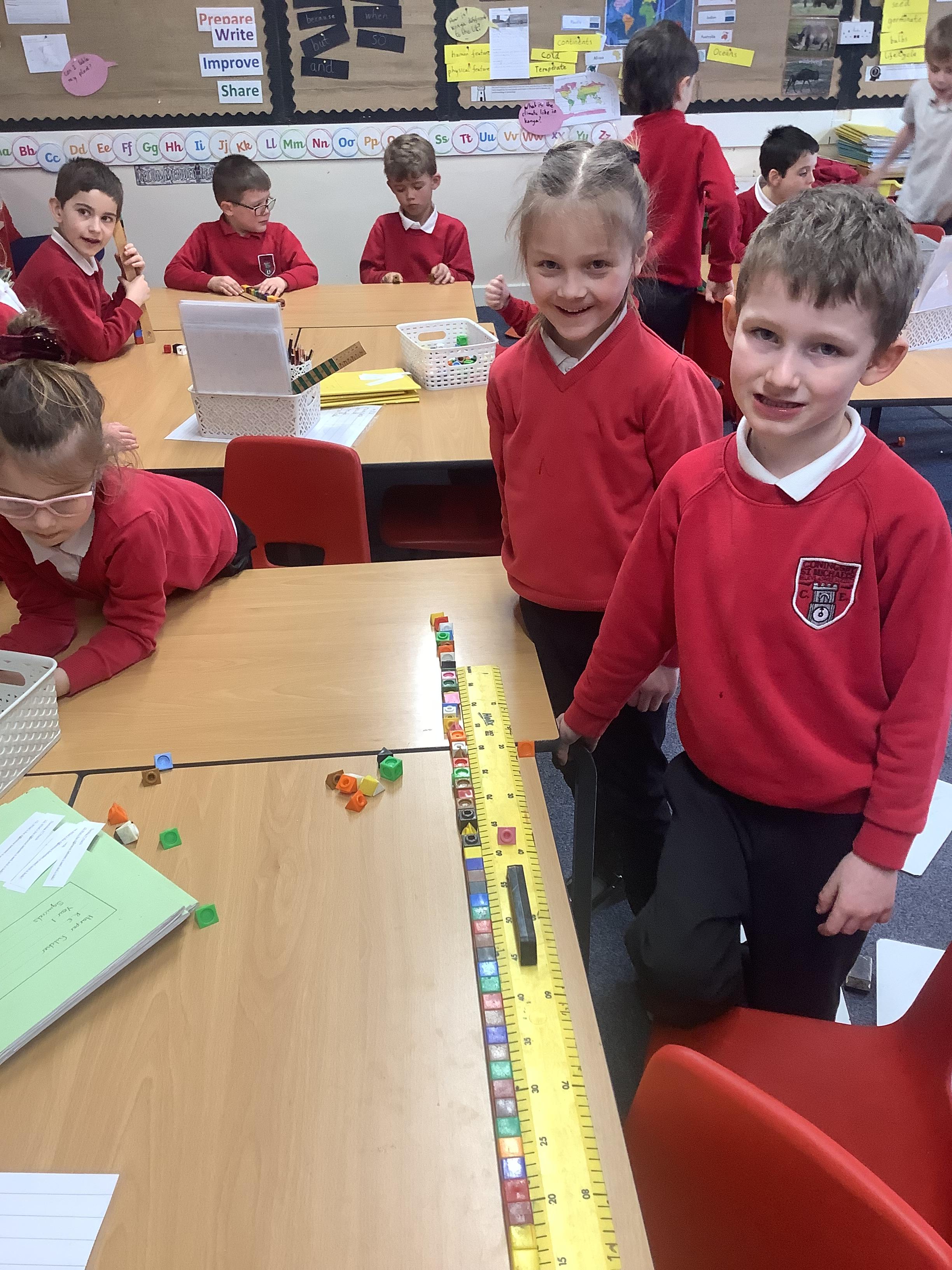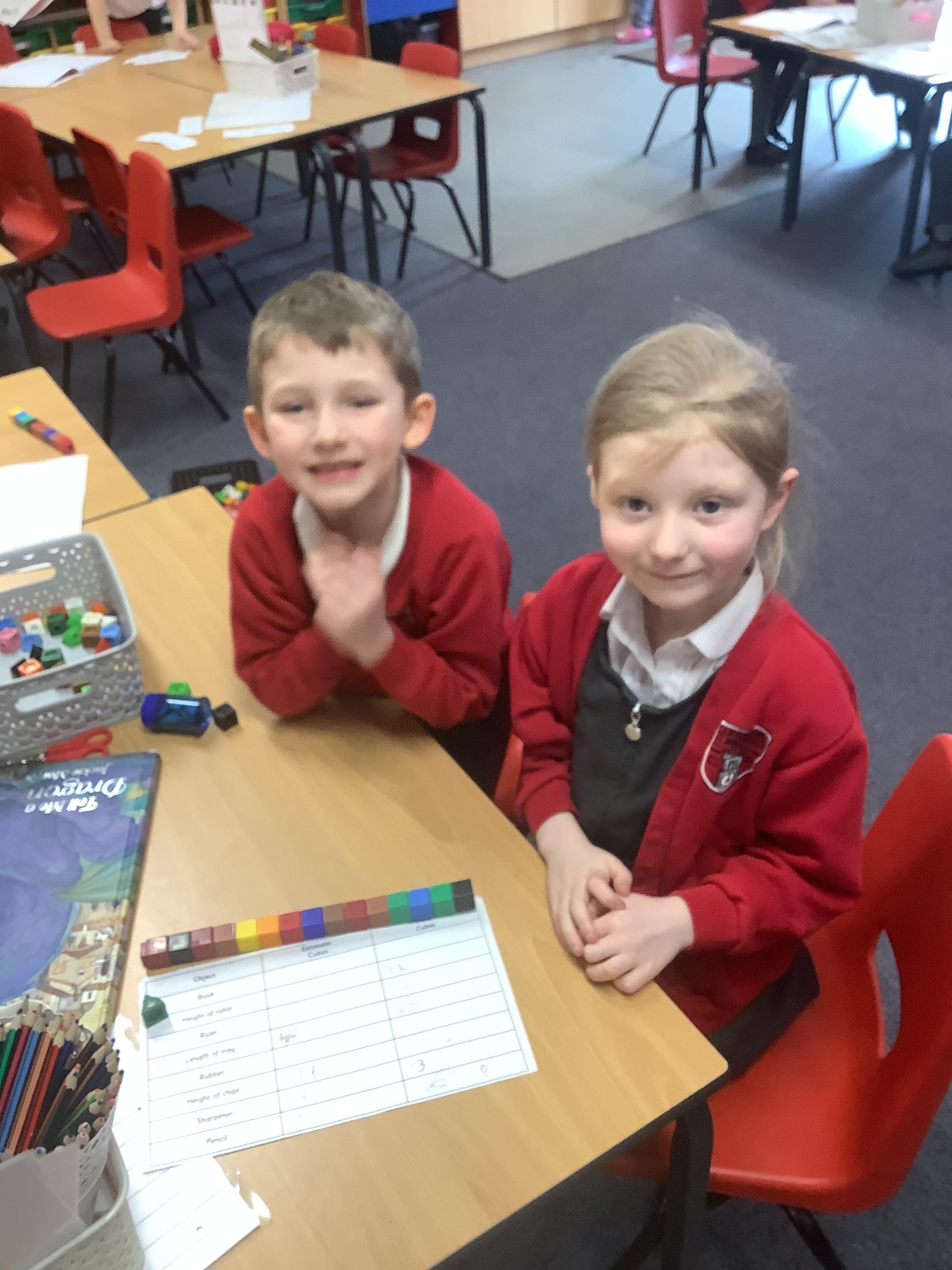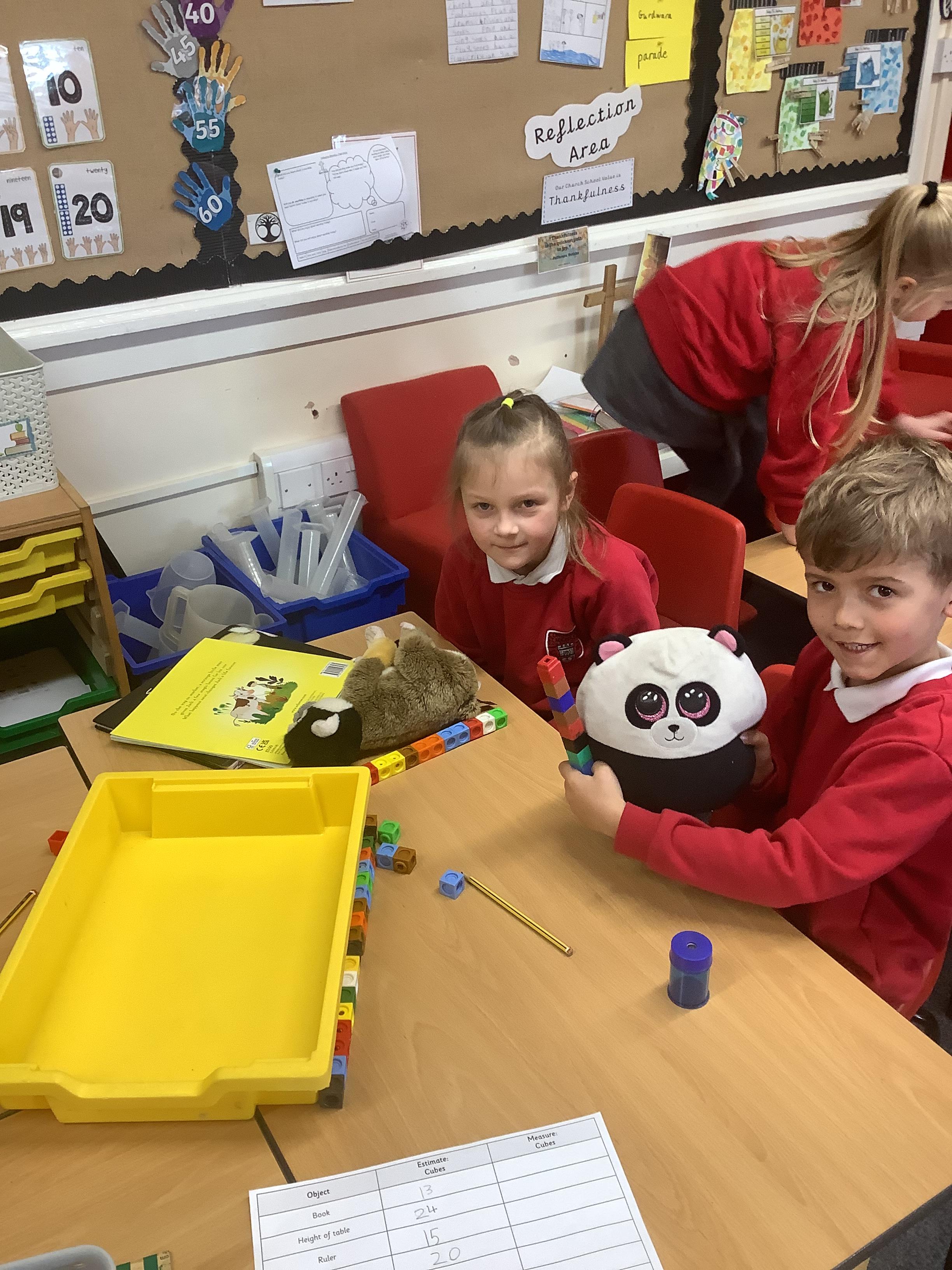 In year 1 maths we were estimating and measuring using cubes. We had a list of objects that we had to measure to see how many cubes long they are. We worked with a partner to find out.