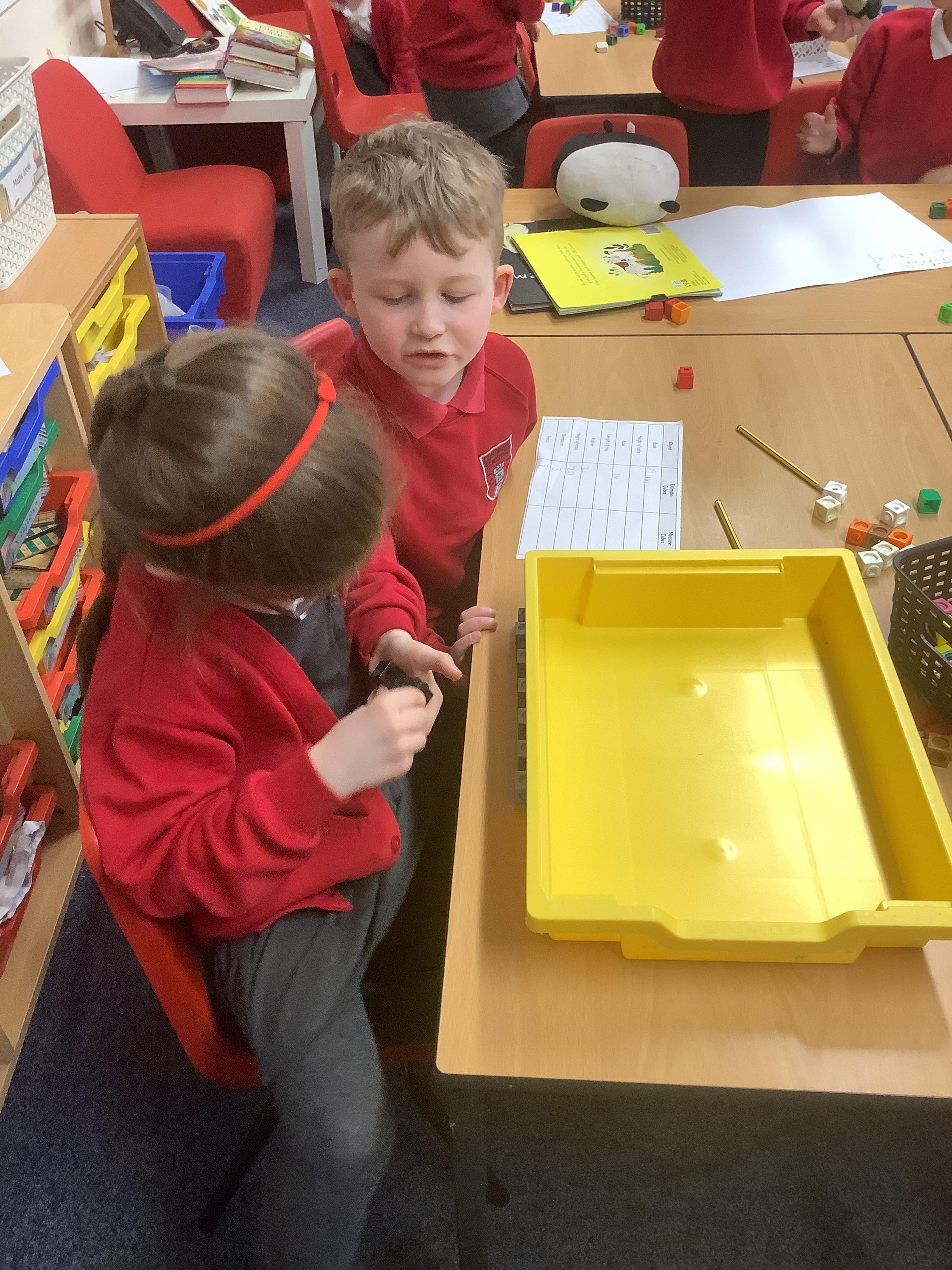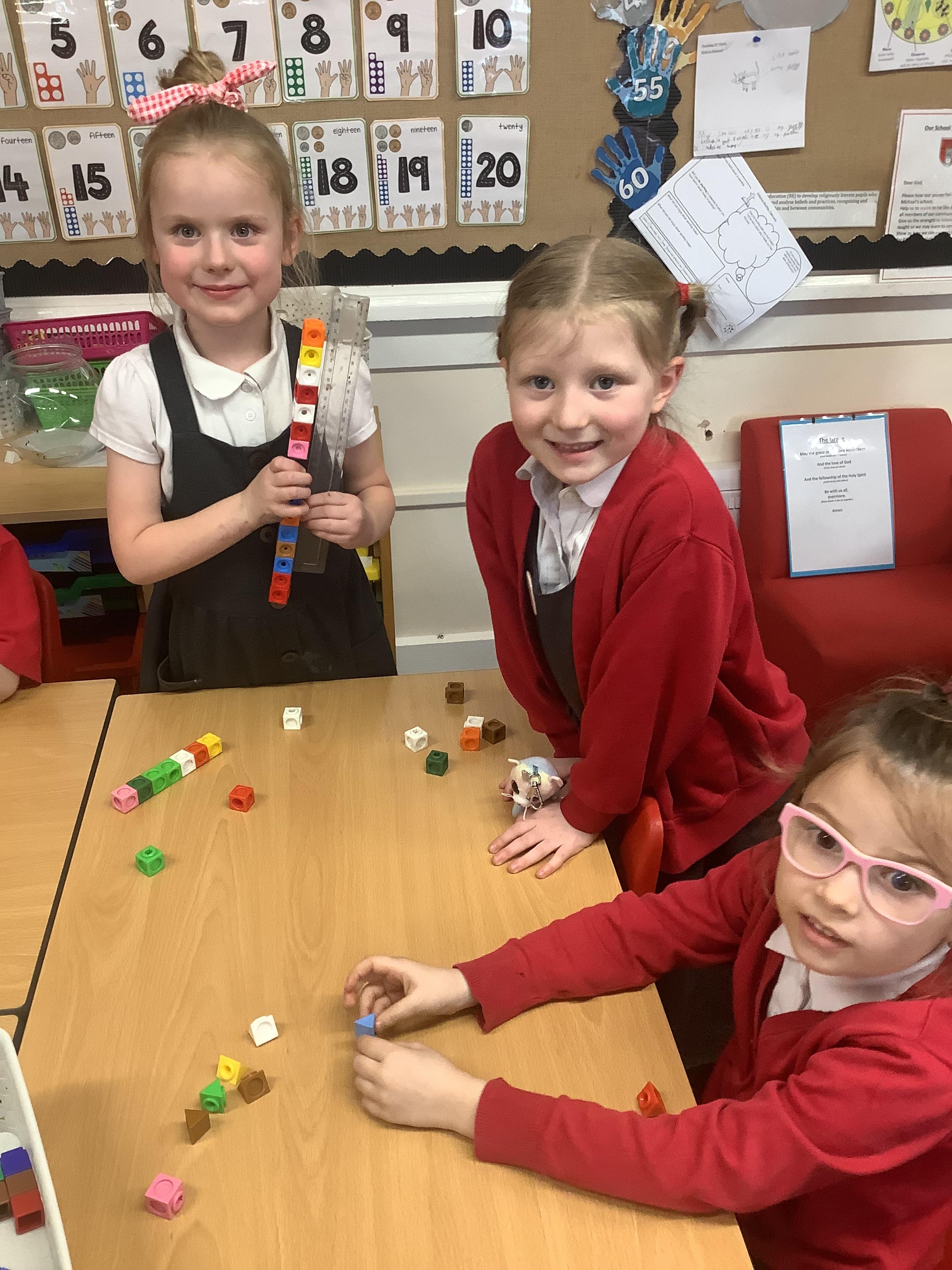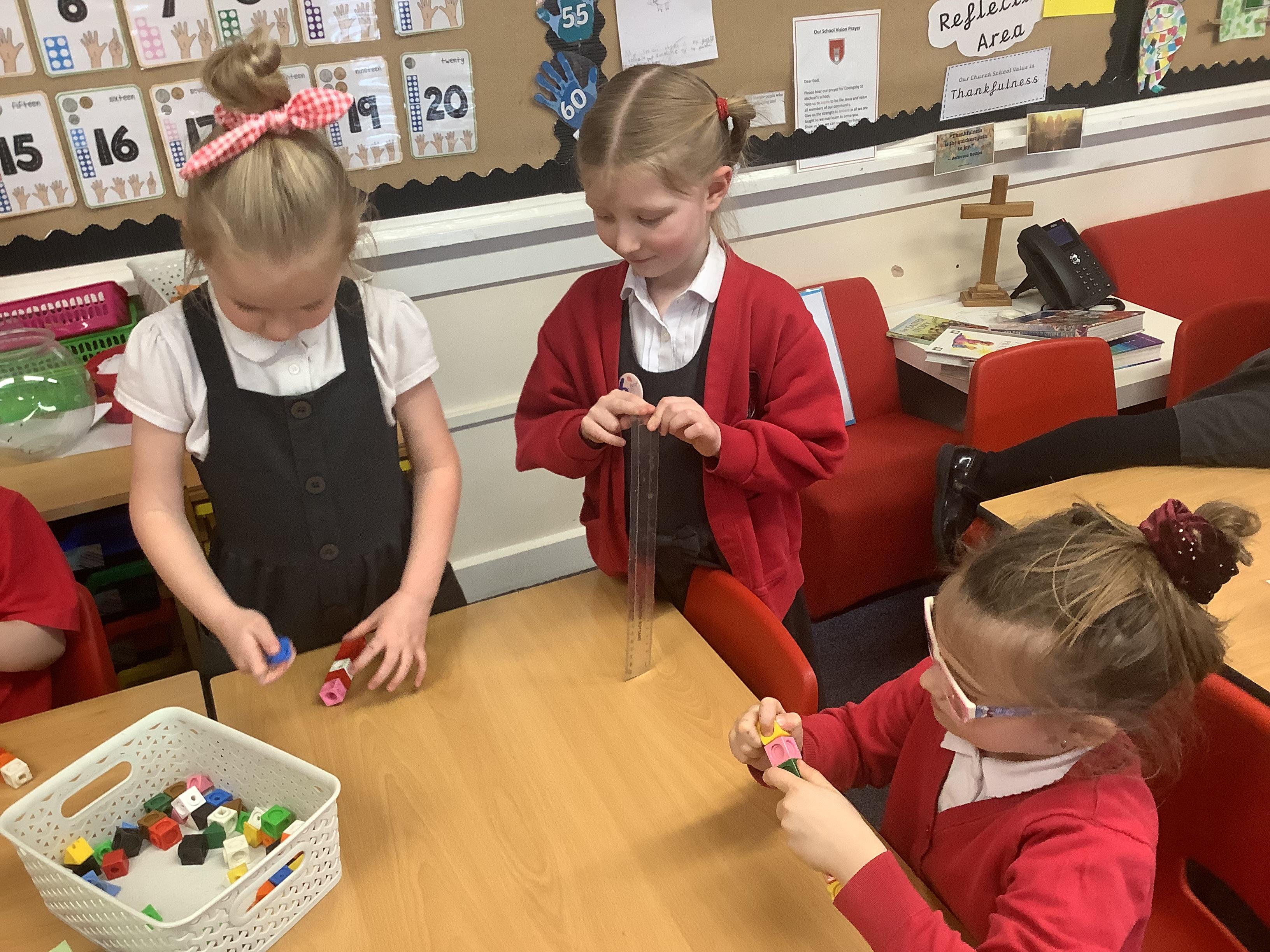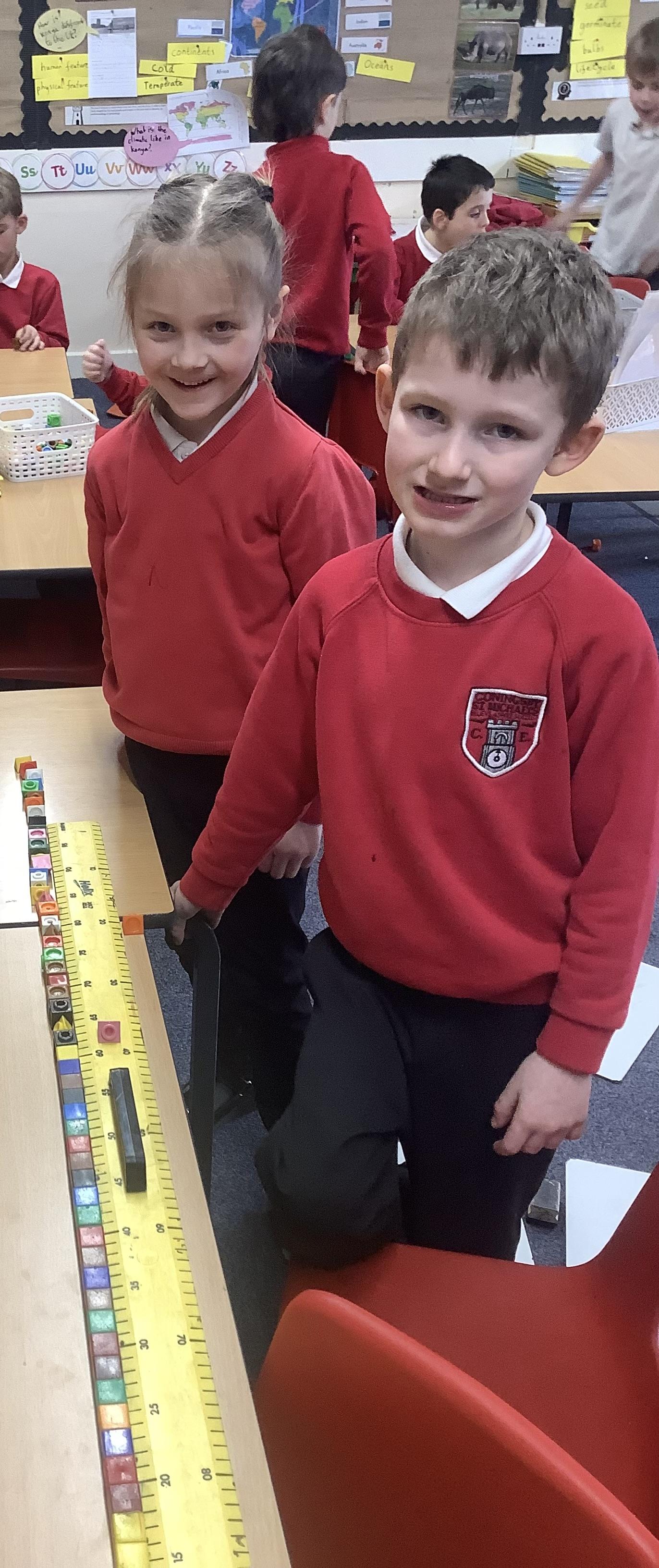 In year 1 maths we were estimating and measuring using cubes. We had a list of objects that we had to measure to see how many cubes long they are. We worked with a partner to find out.