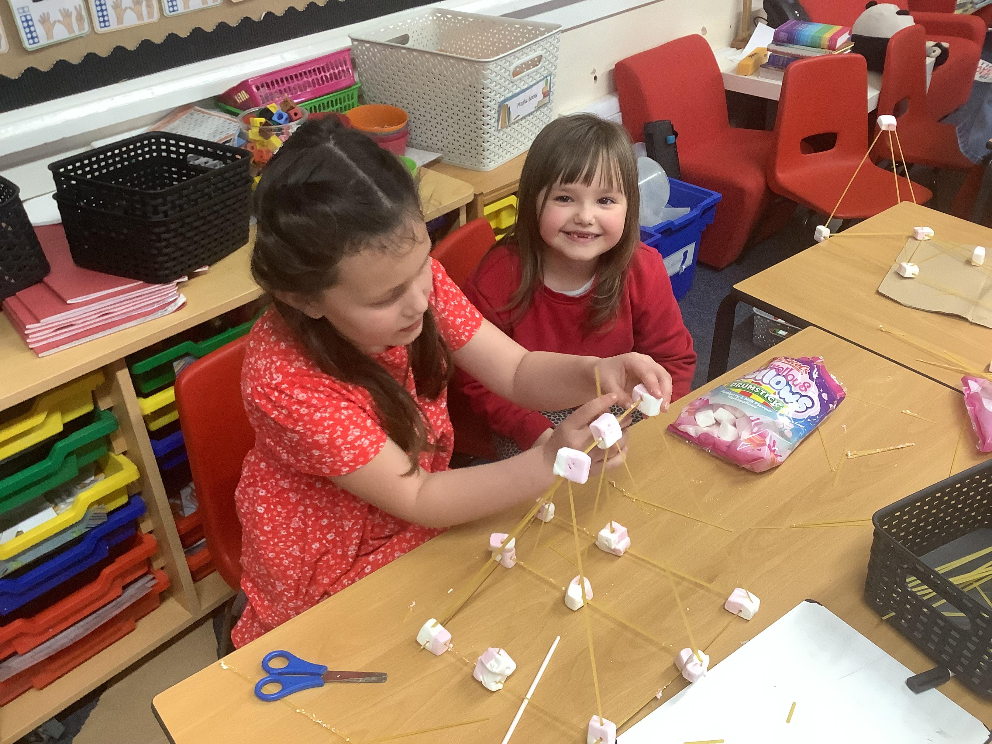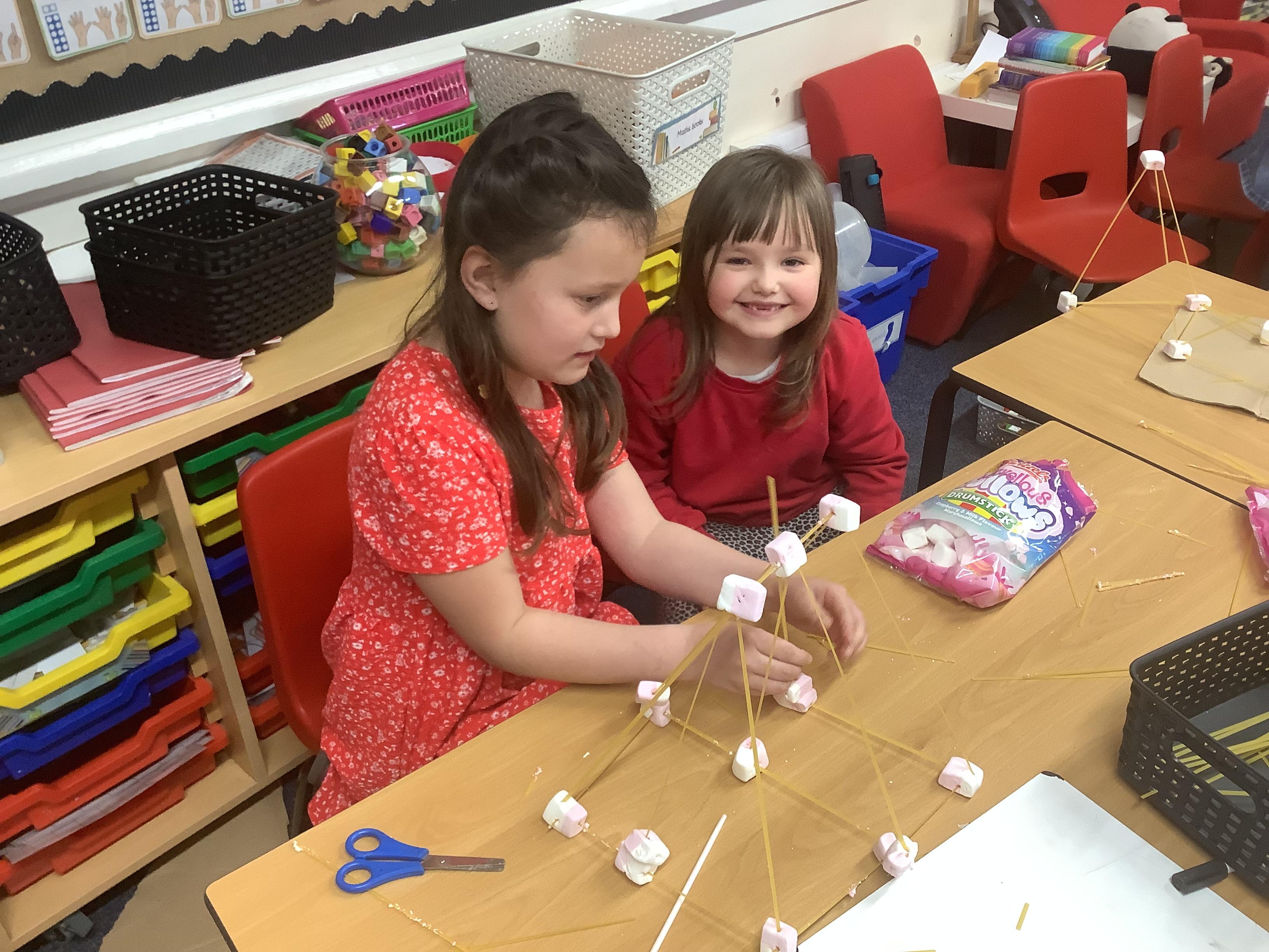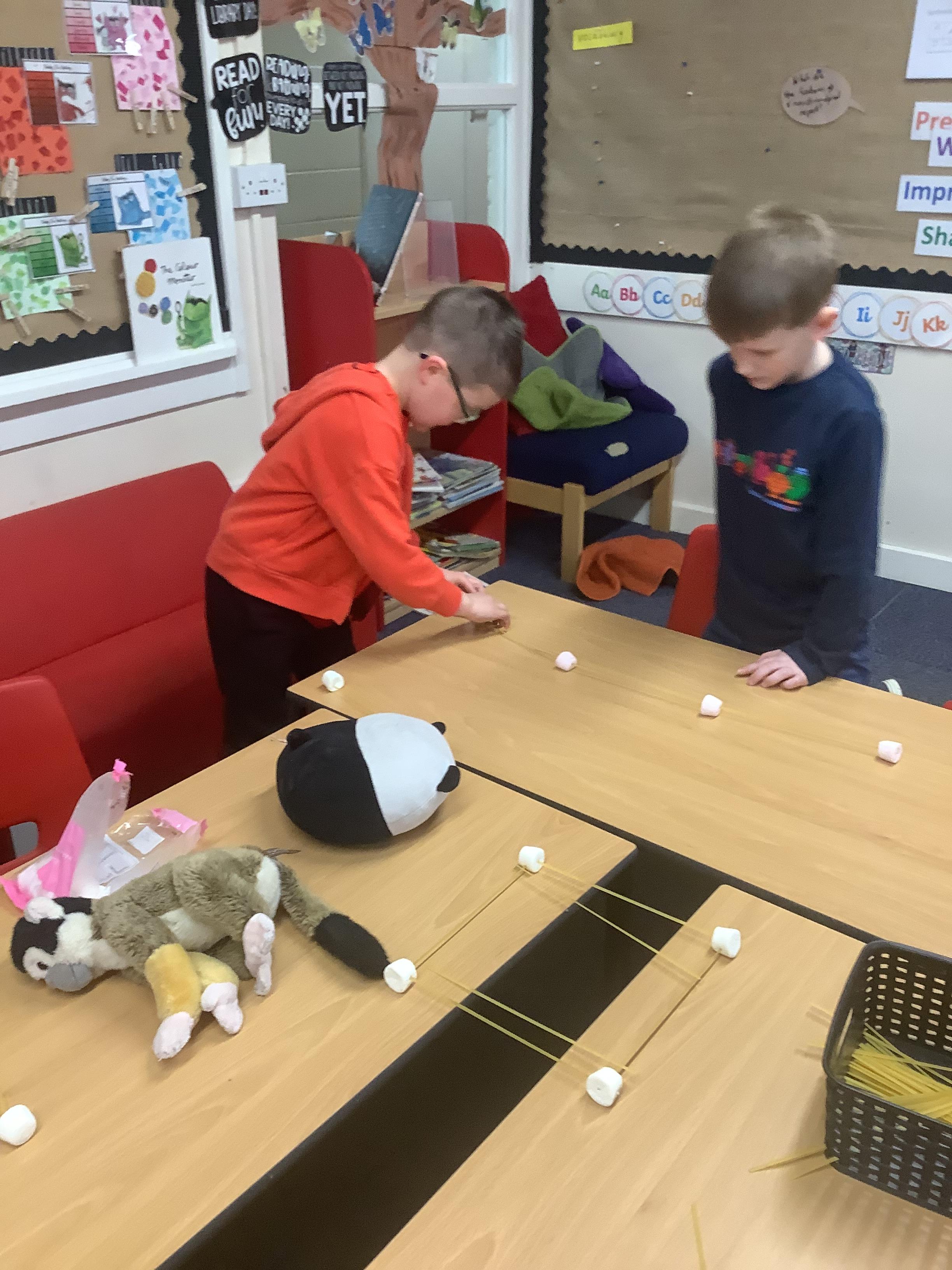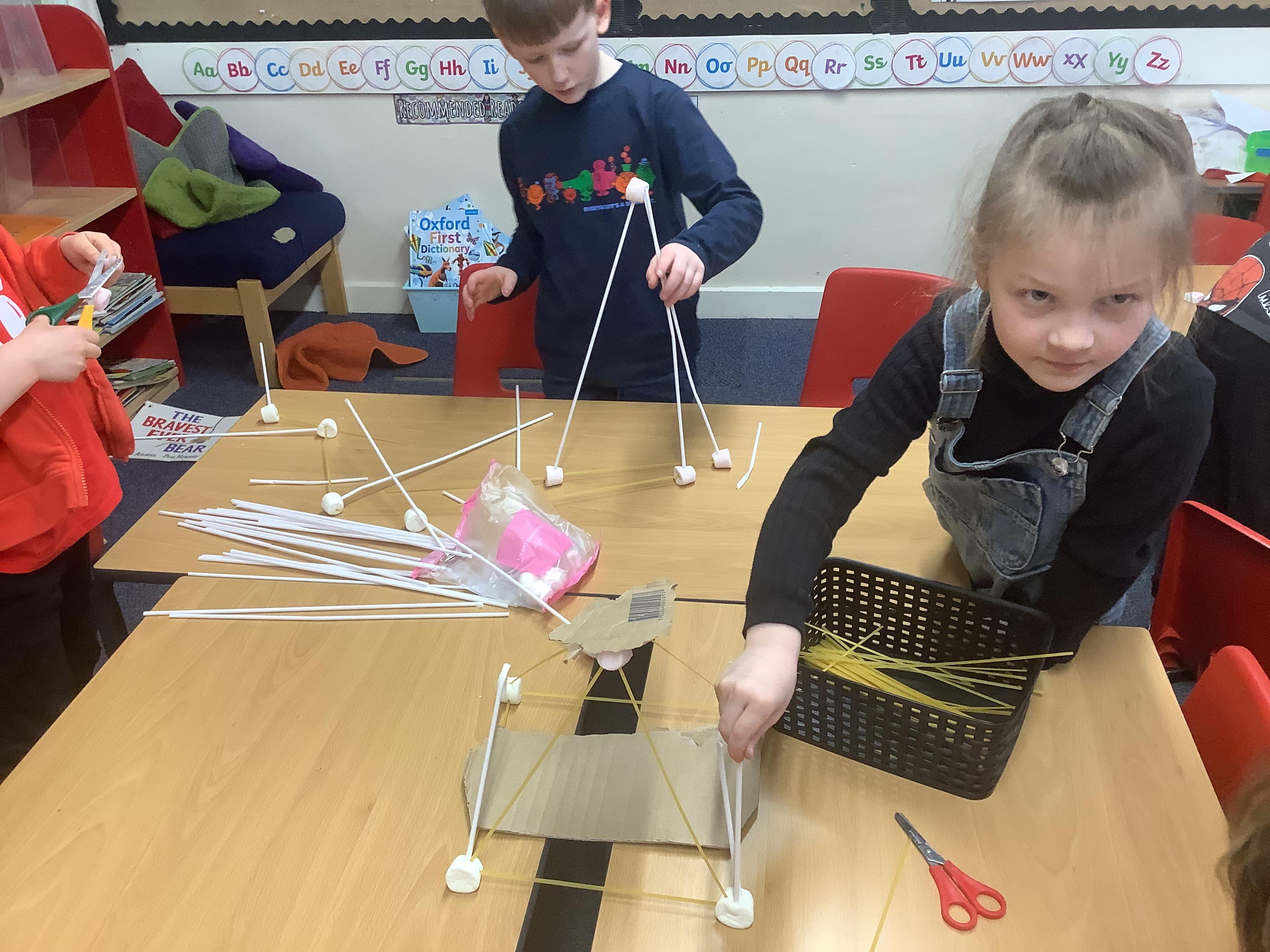 As it is British Science week we decided a challenge was in order. We had to create a bridge using marshmallows and spaghetti that would be strong enough to hold weights.