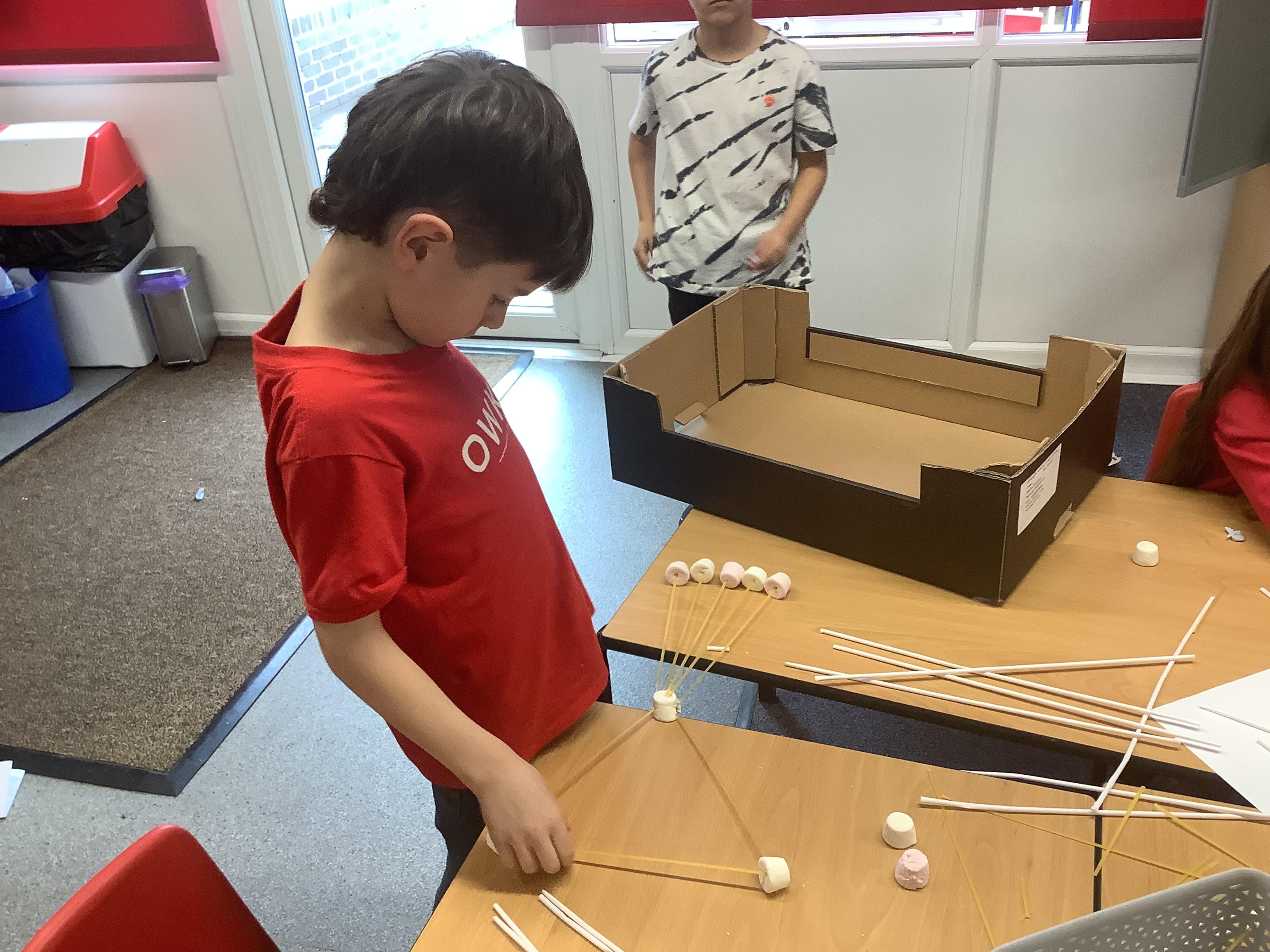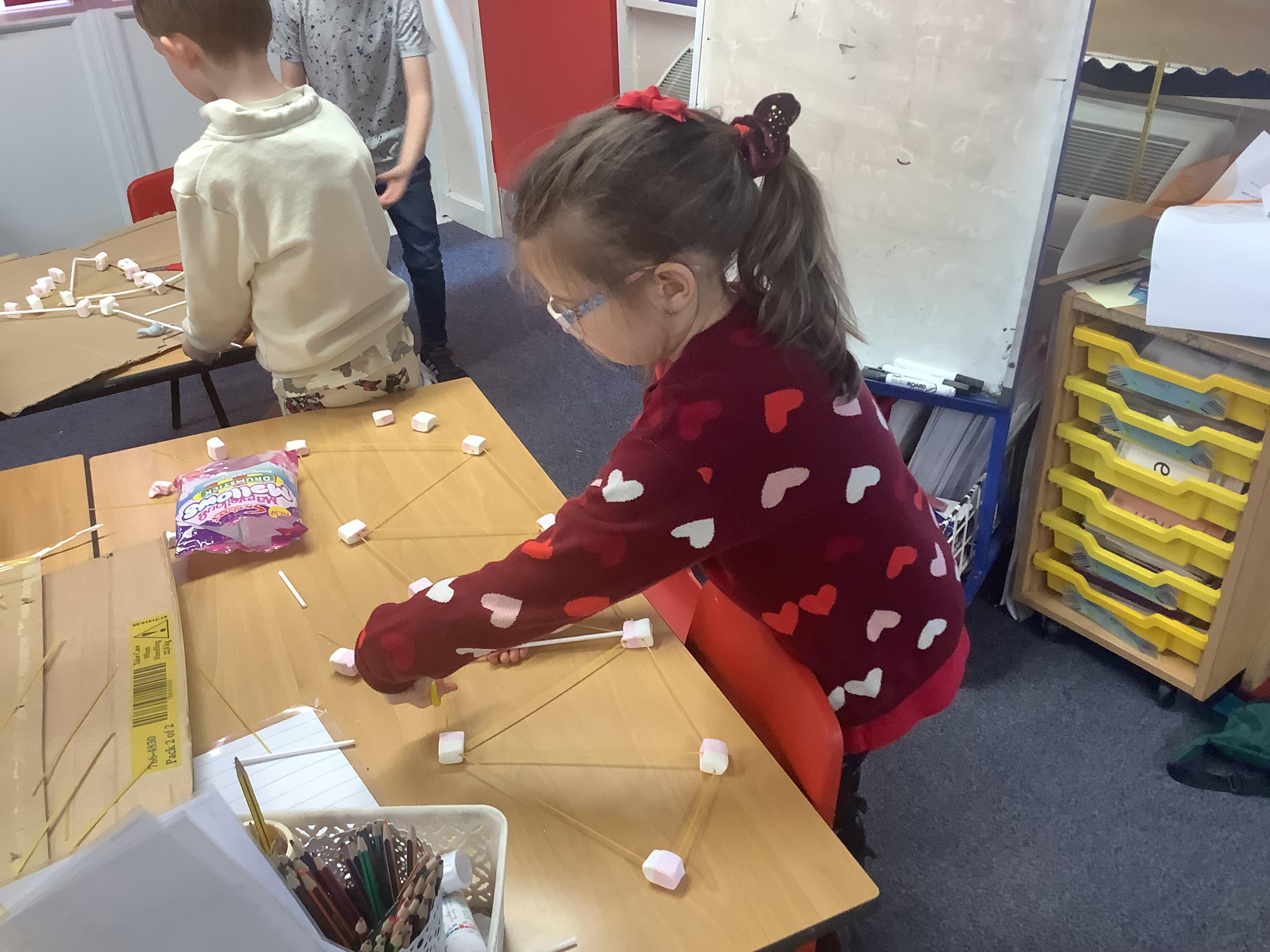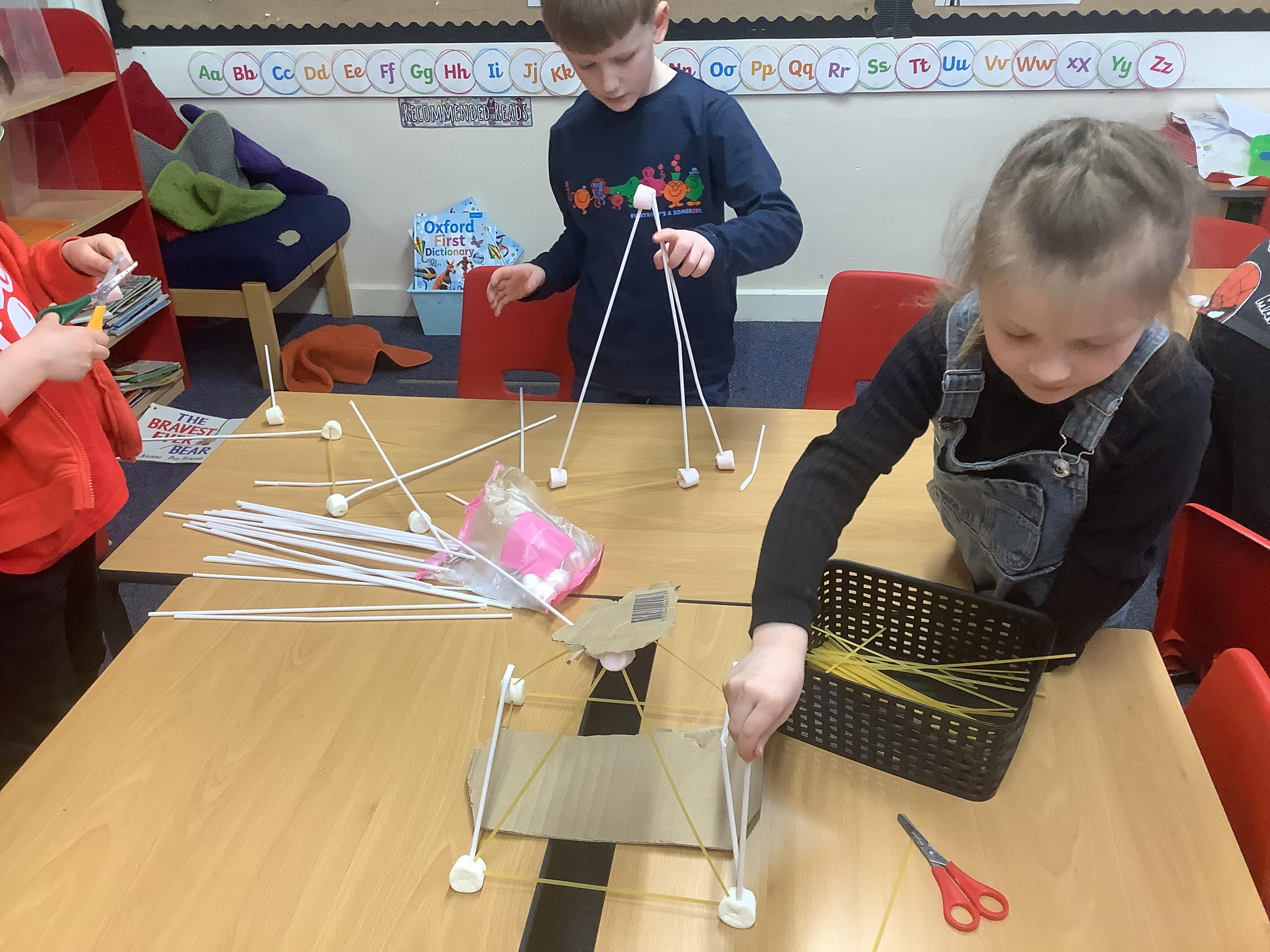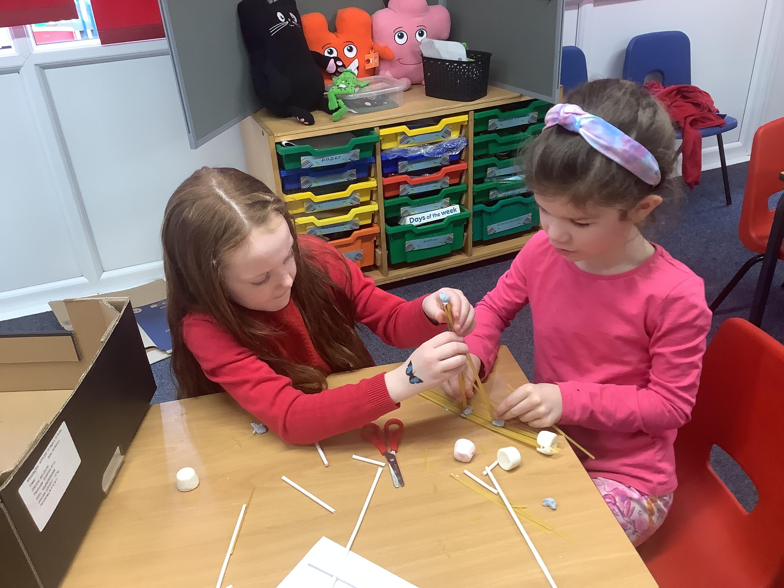 As it is British Science week we decided a challenge was in order. We had to create a bridge using marshmallows and spaghetti that would be strong enough to hold weights.