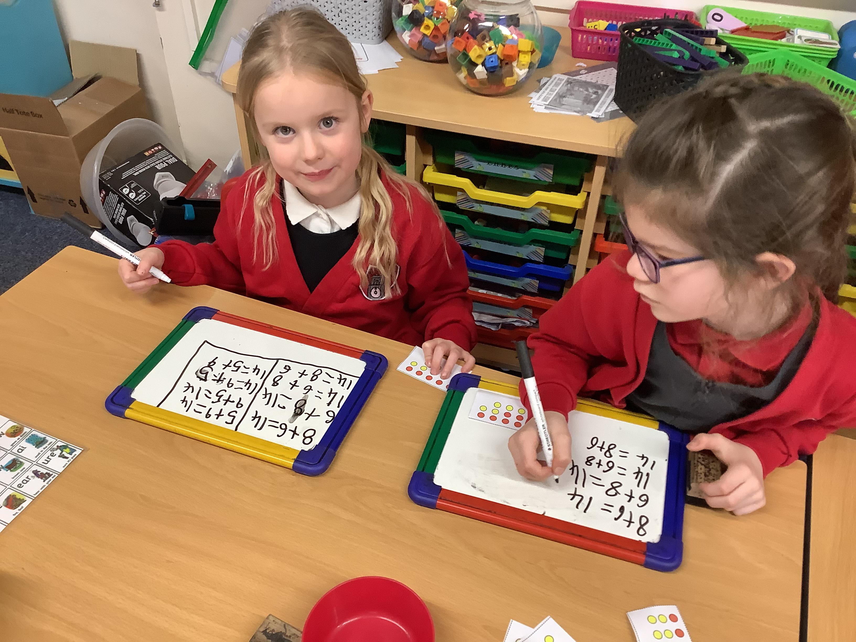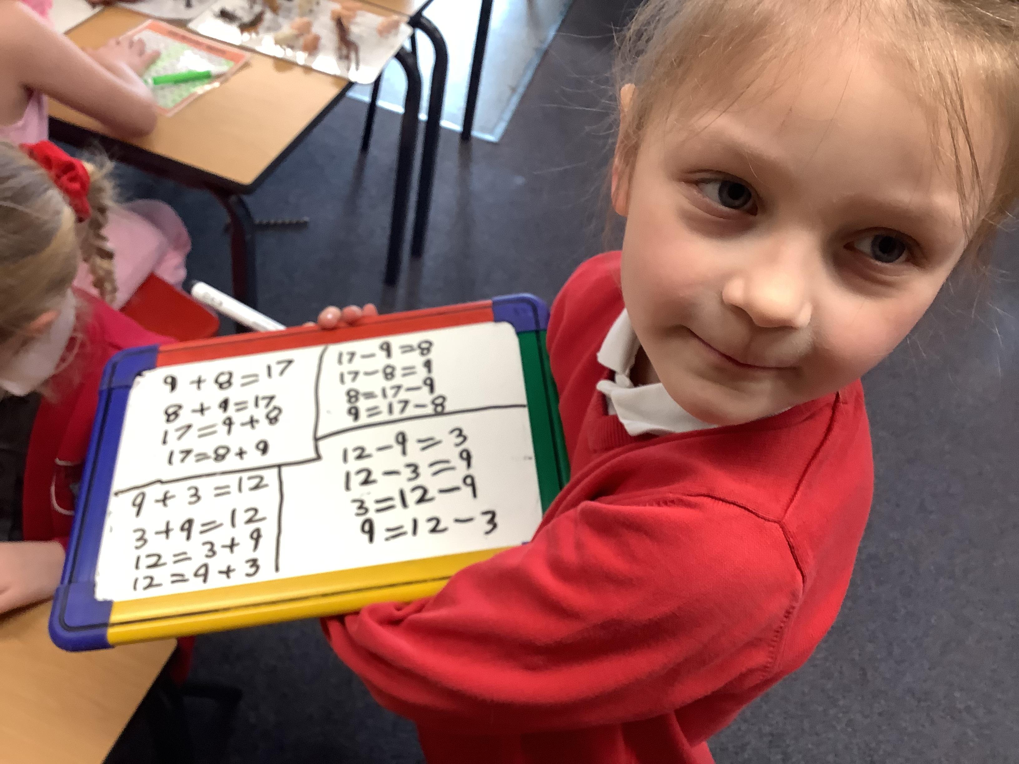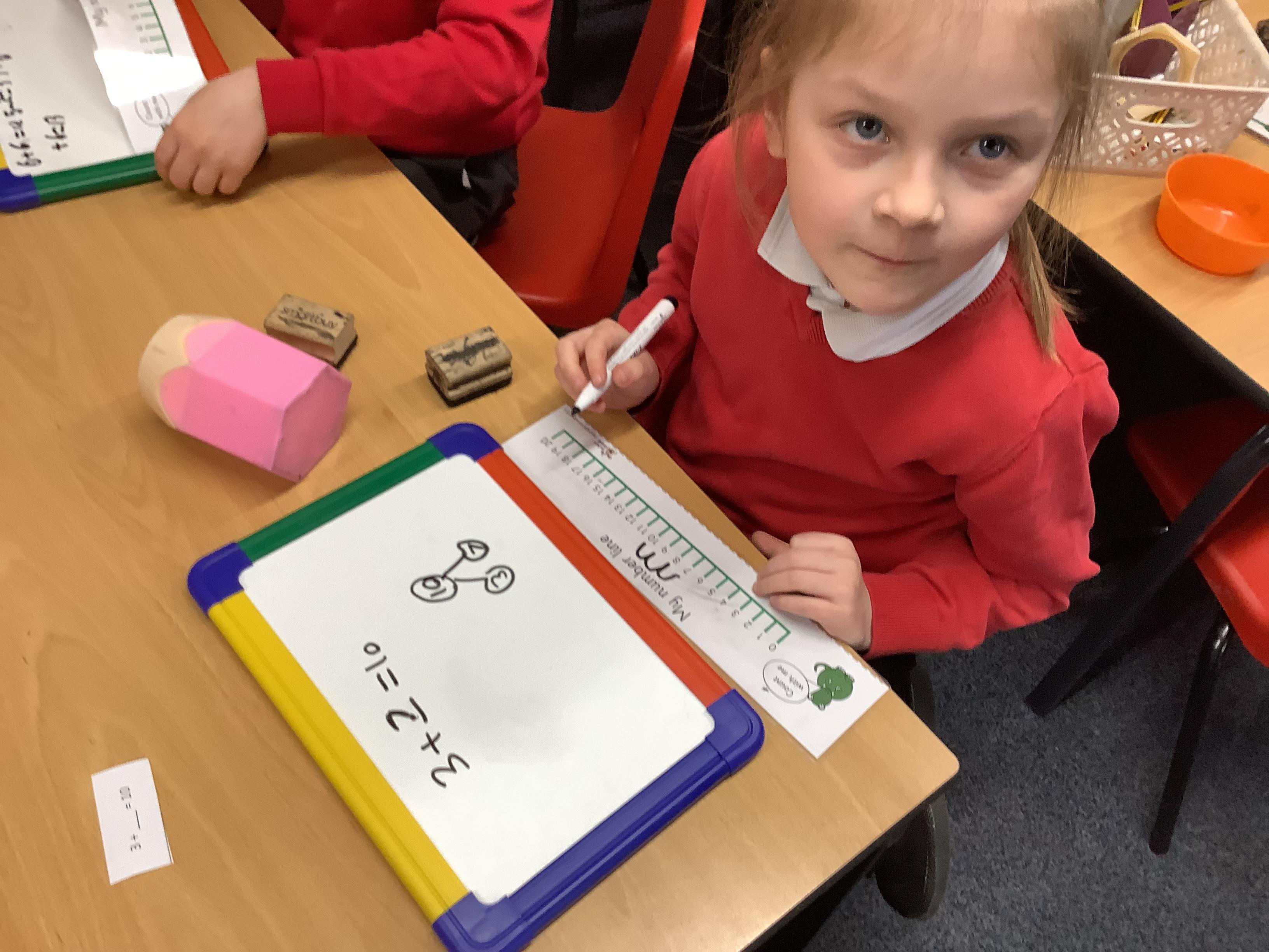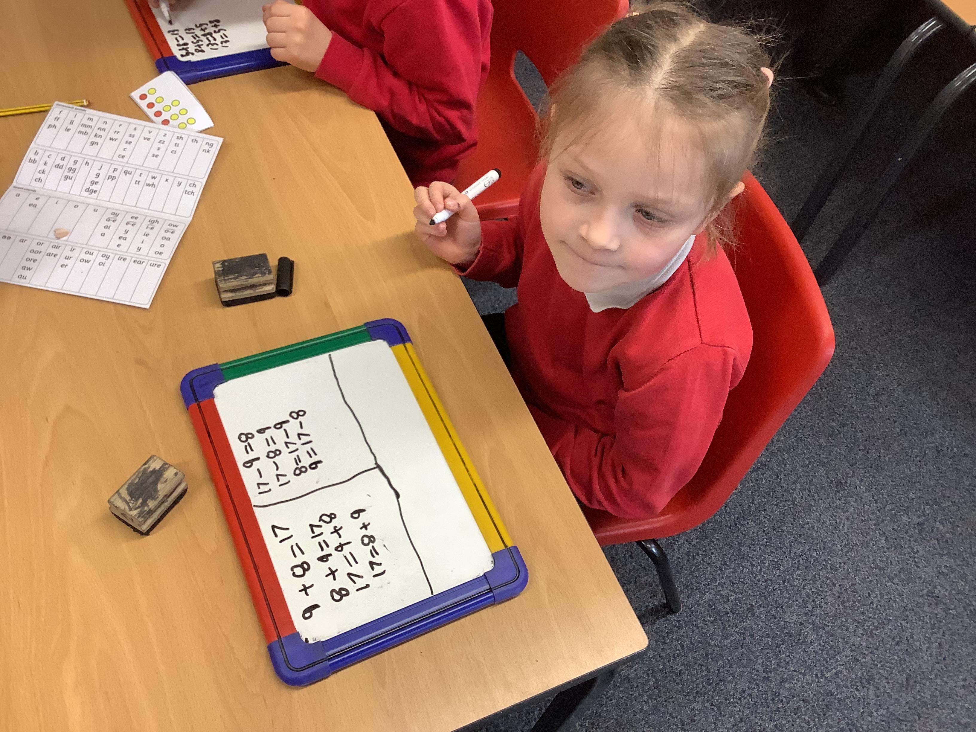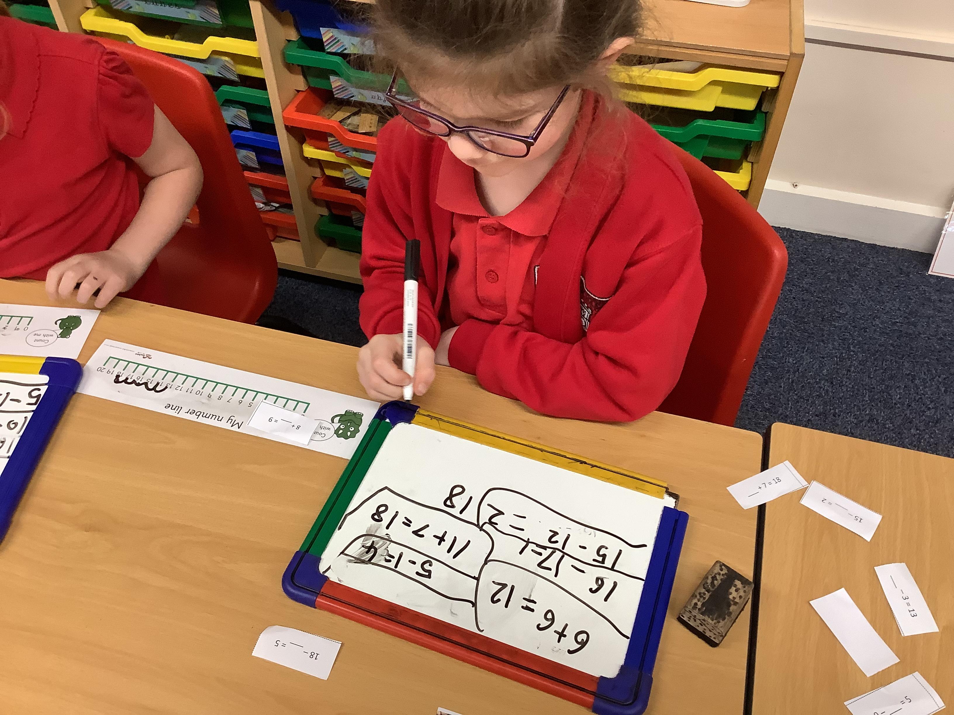 Year 1 in maths we looked at fact families and finding the related facts, so if 4 + 1 = 5 then 1 + 4 = 5 and 5 - 4 =1 and 5 - 1 = 4. We built our number facts on tens frames and then recorded them on whiteboards.