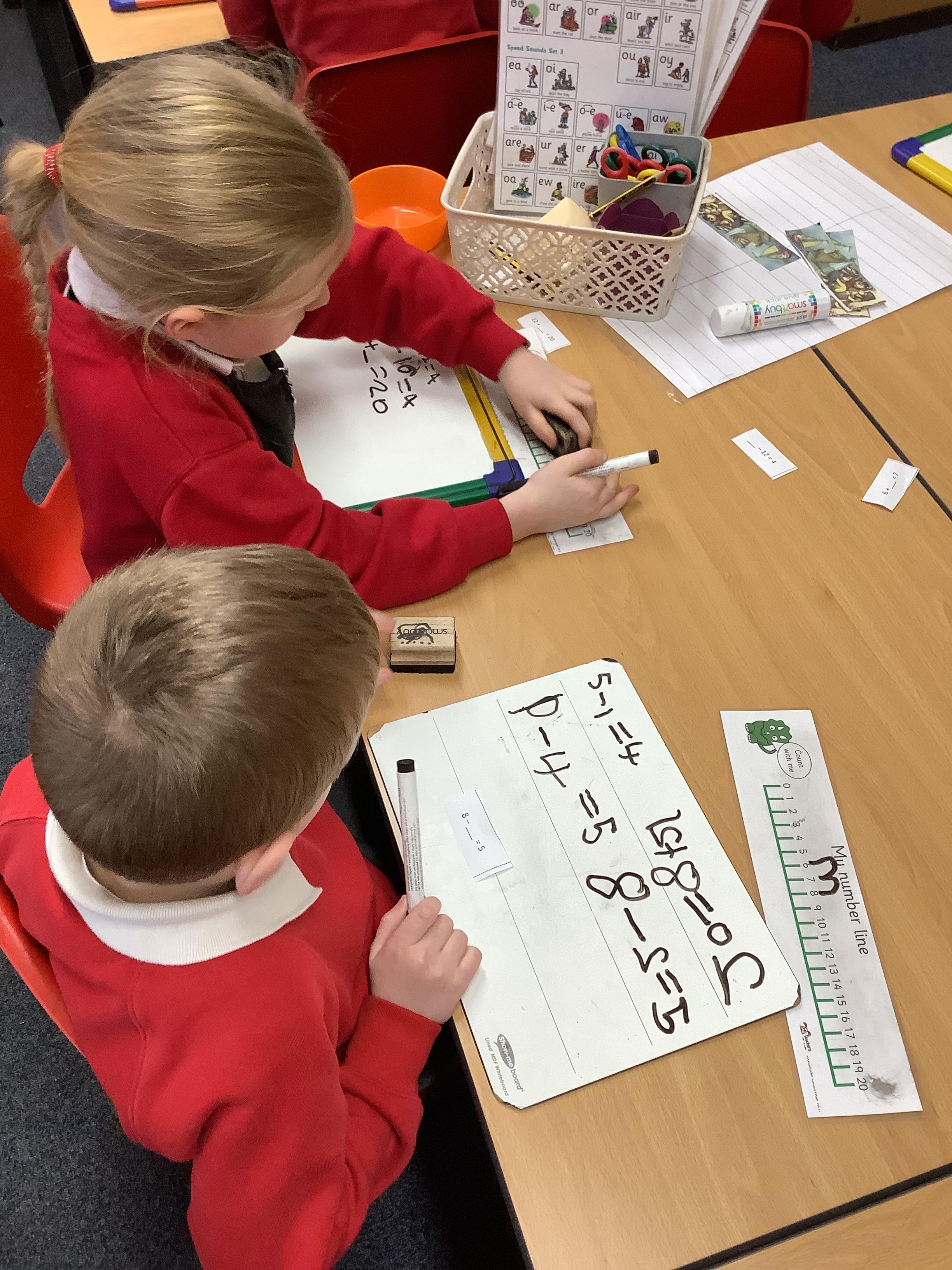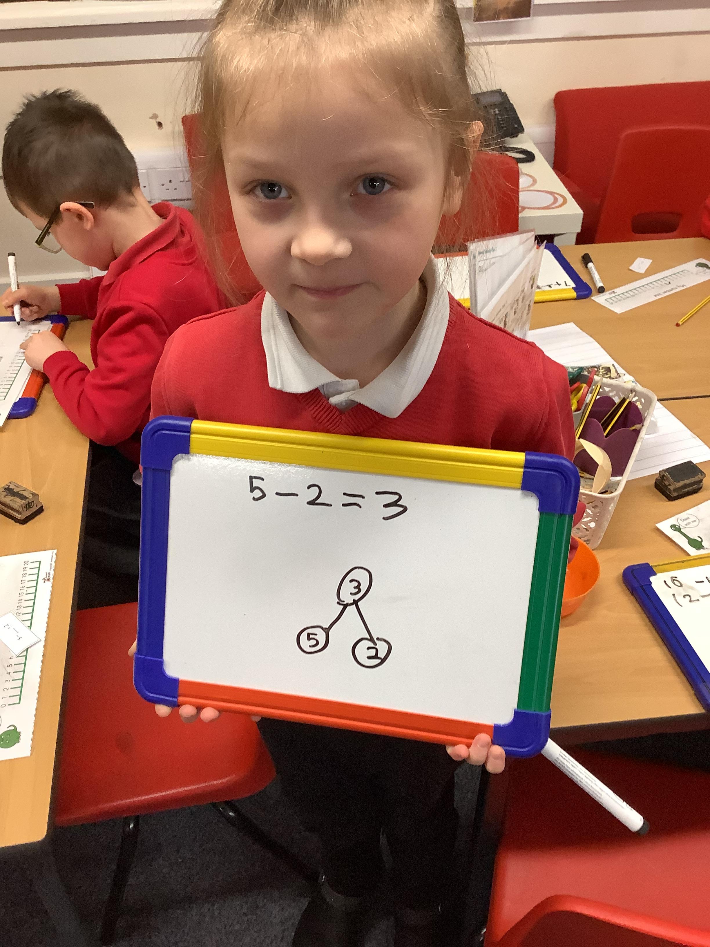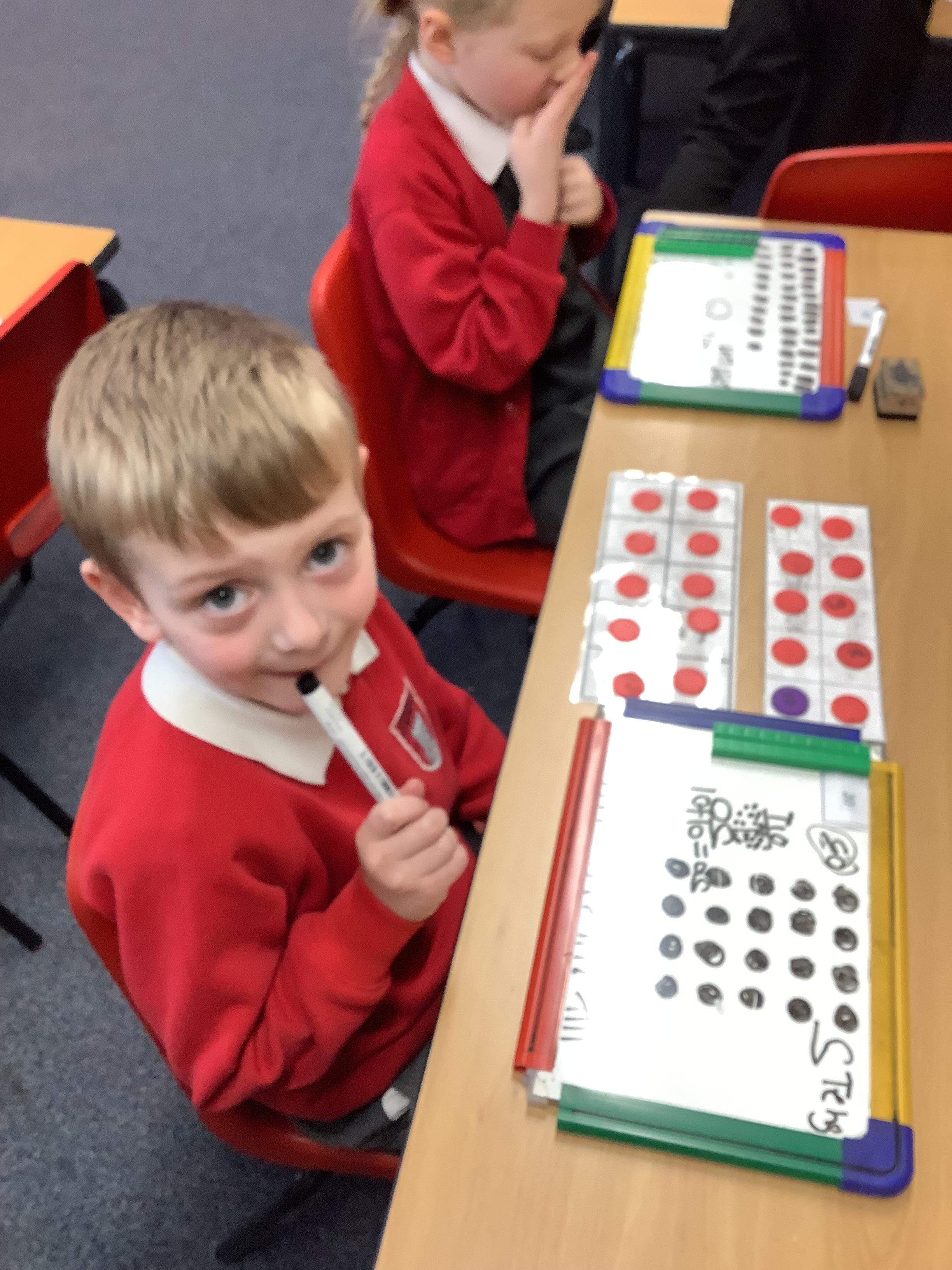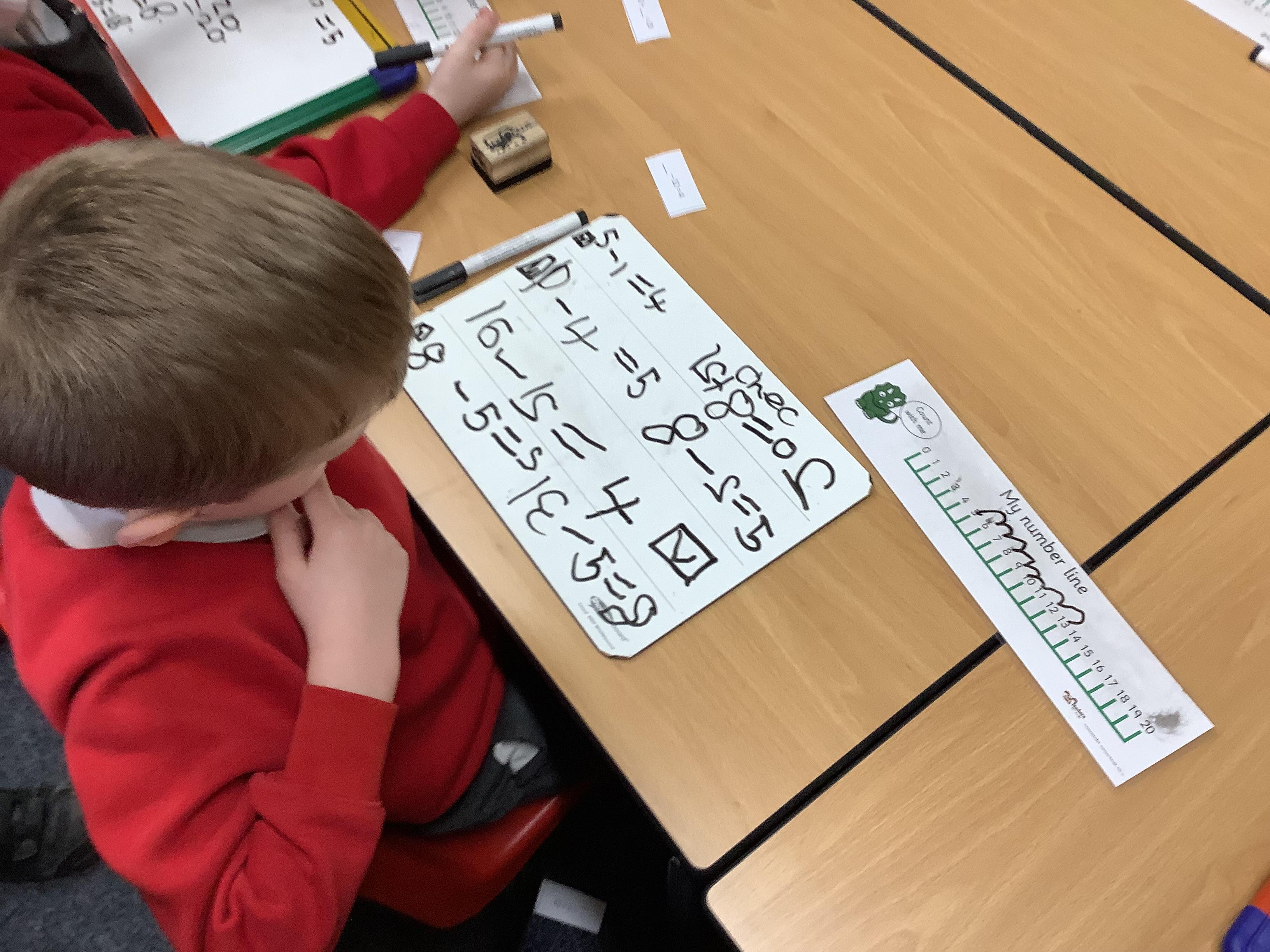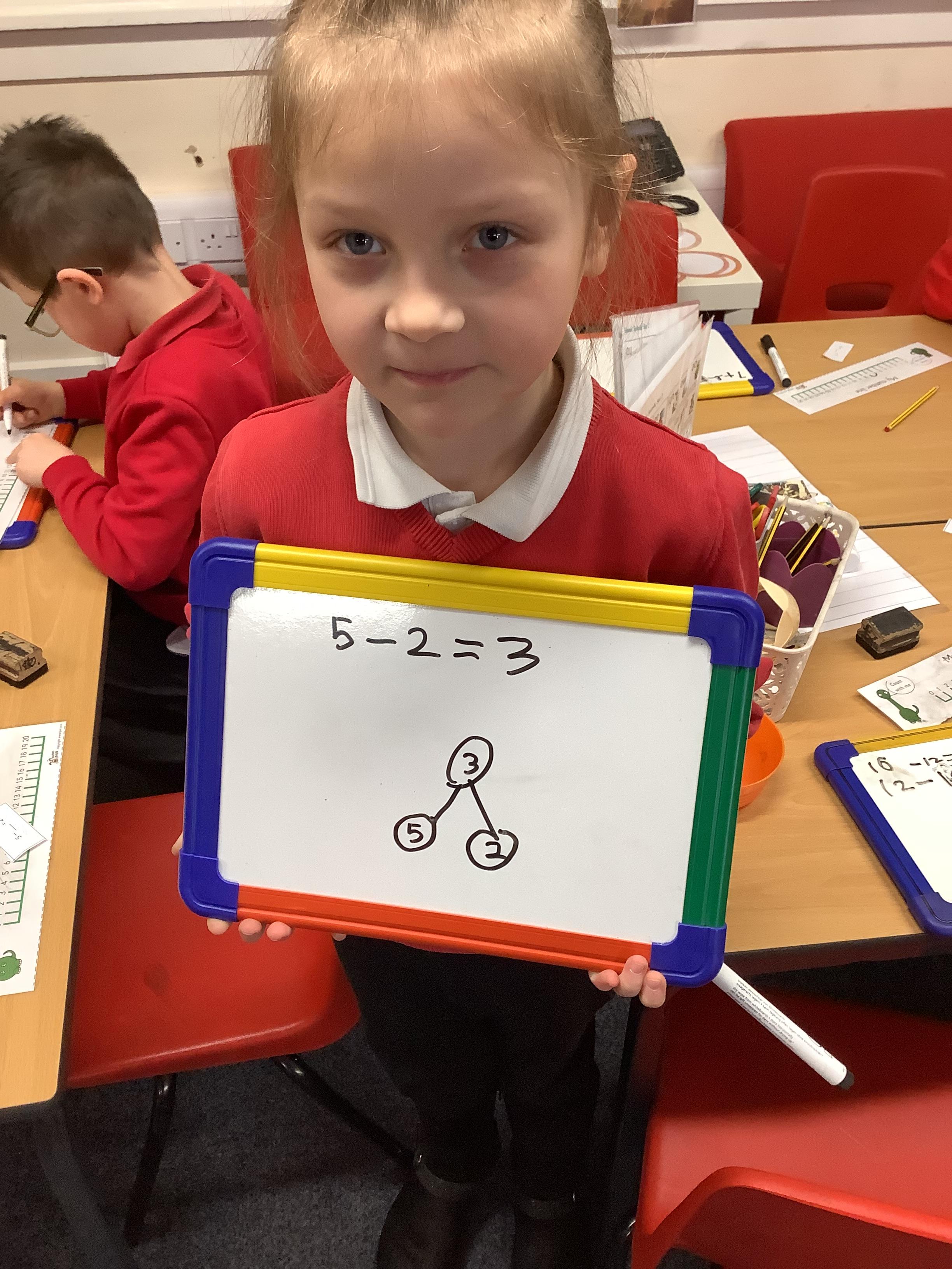 Year 1 in maths we looked at fact families and finding the related facts, so if 4 + 1 = 5 then 1 + 4 = 5 and 5 - 4 =1 and 5 - 1 = 4. We built our number facts on tens frames and then recorded them on whiteboards.