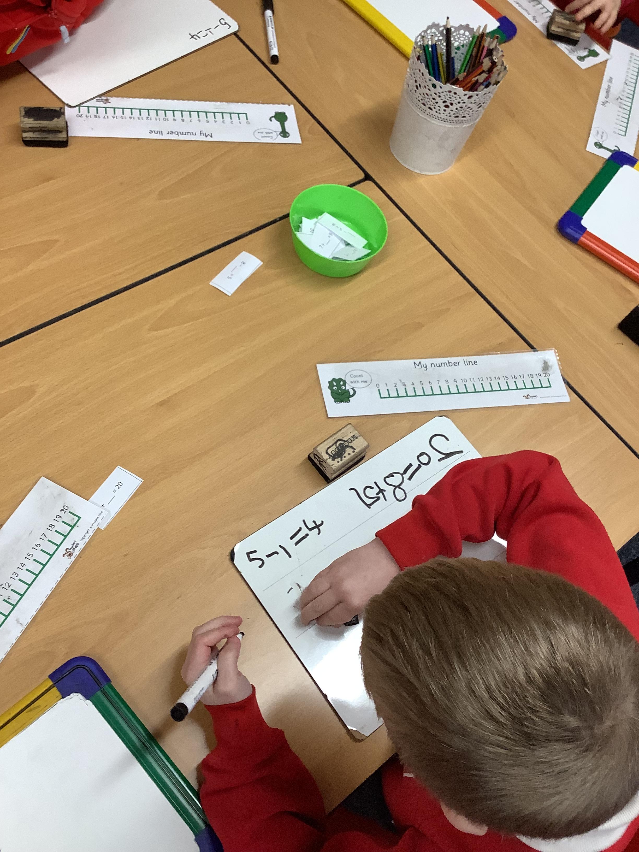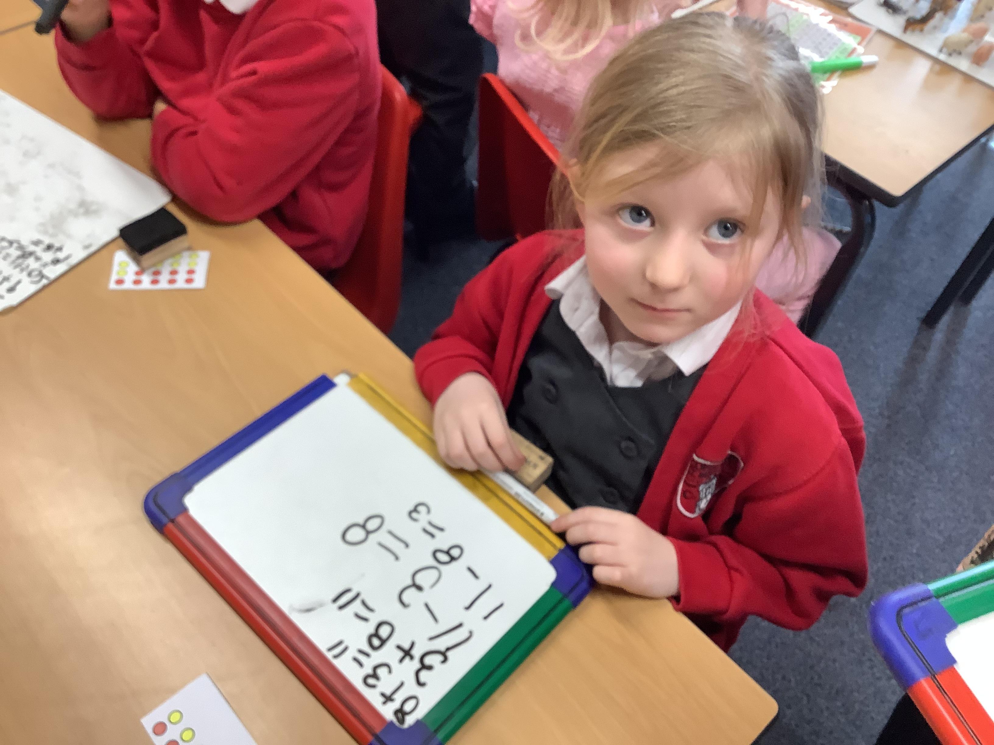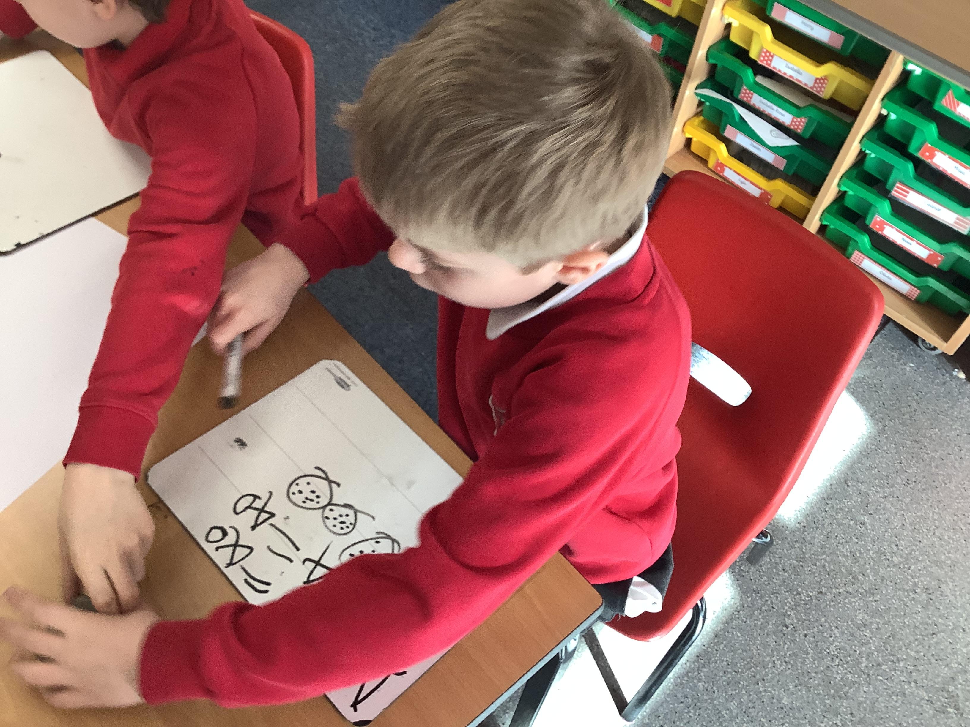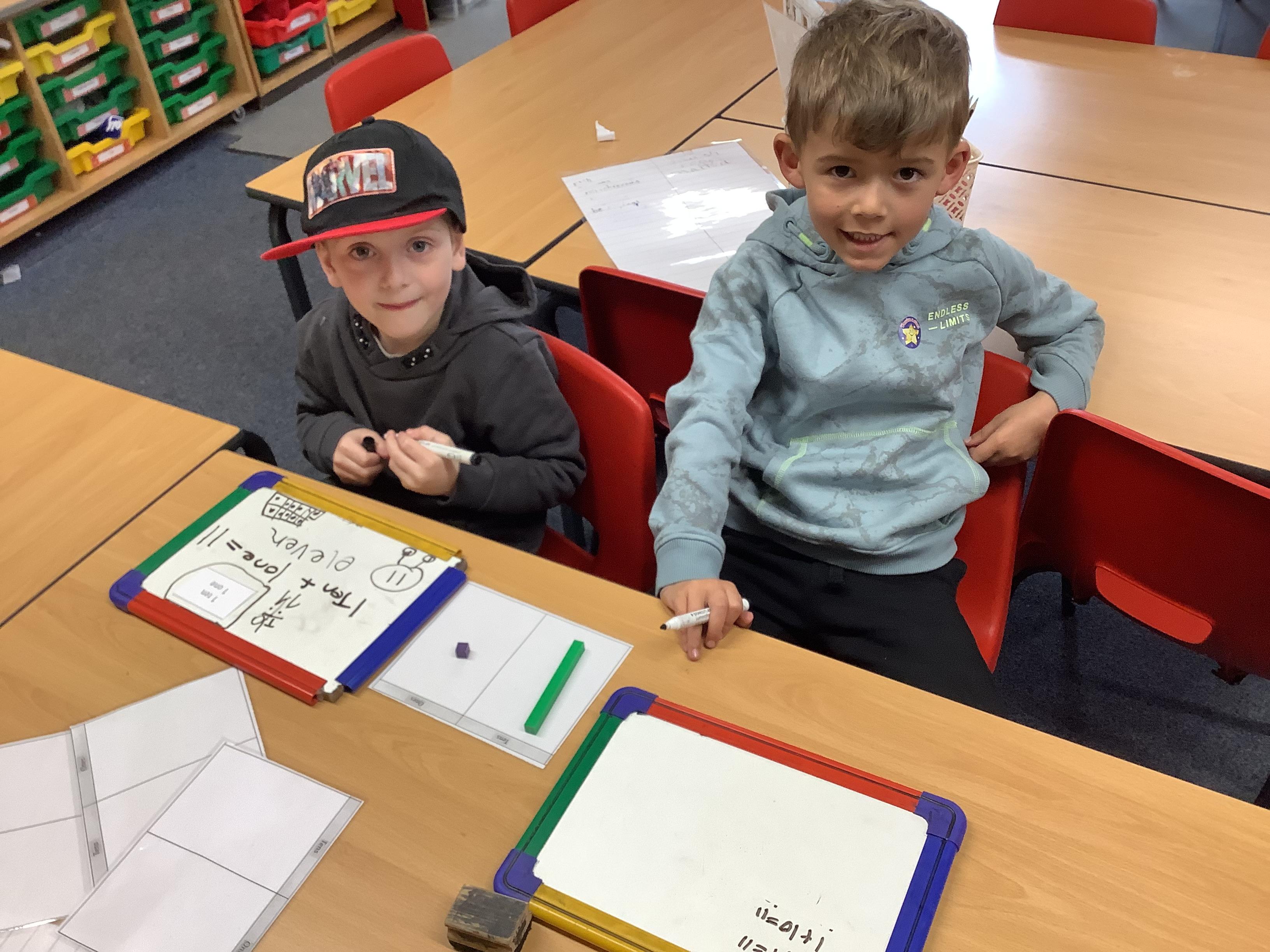 Year 1 in maths we looked at fact families and finding the related facts, so if 4 + 1 = 5 then 1 + 4 = 5 and 5 - 4 =1 and 5 - 1 = 4. We built our number facts on tens frames and then recorded them on whiteboards.