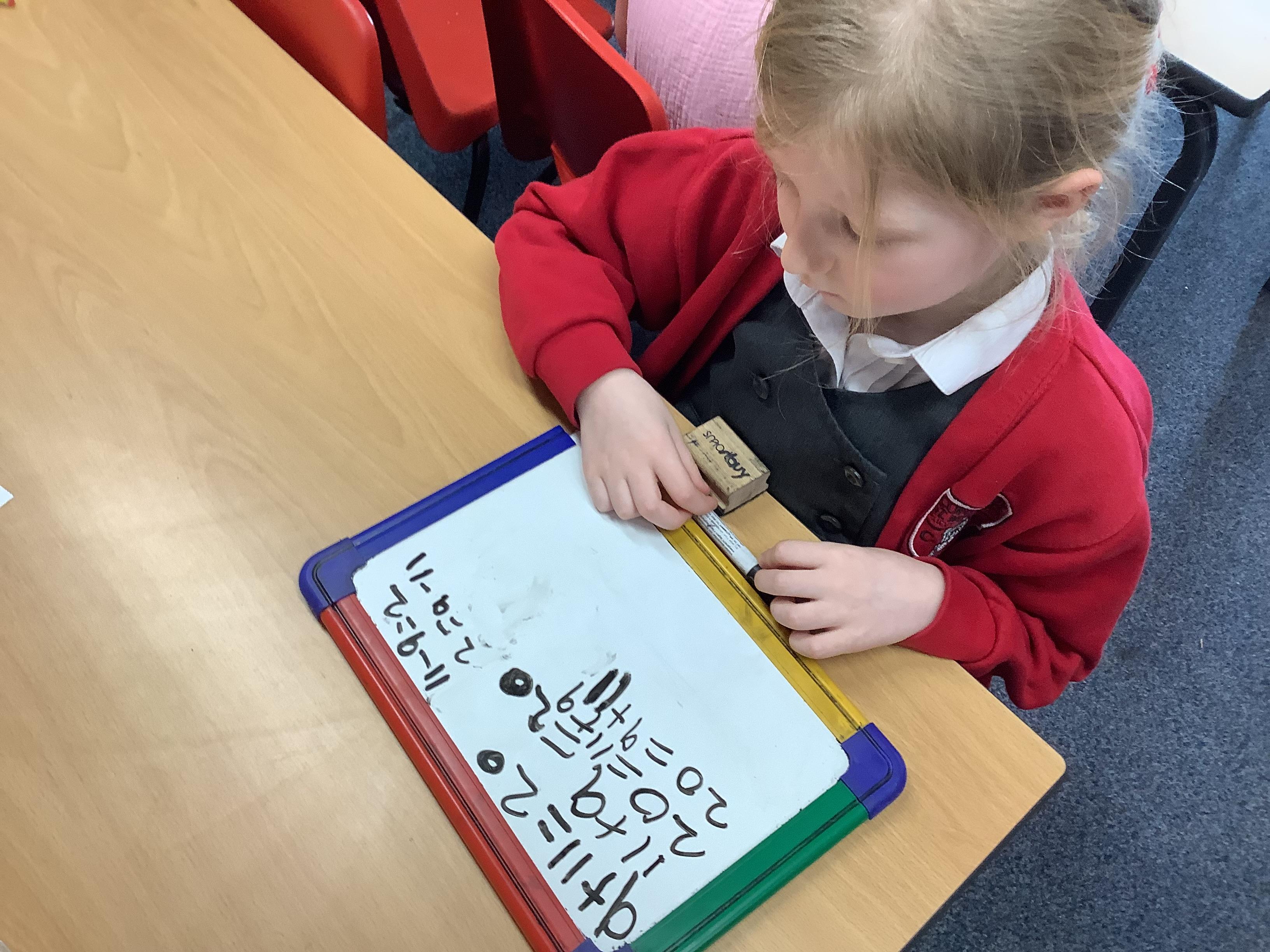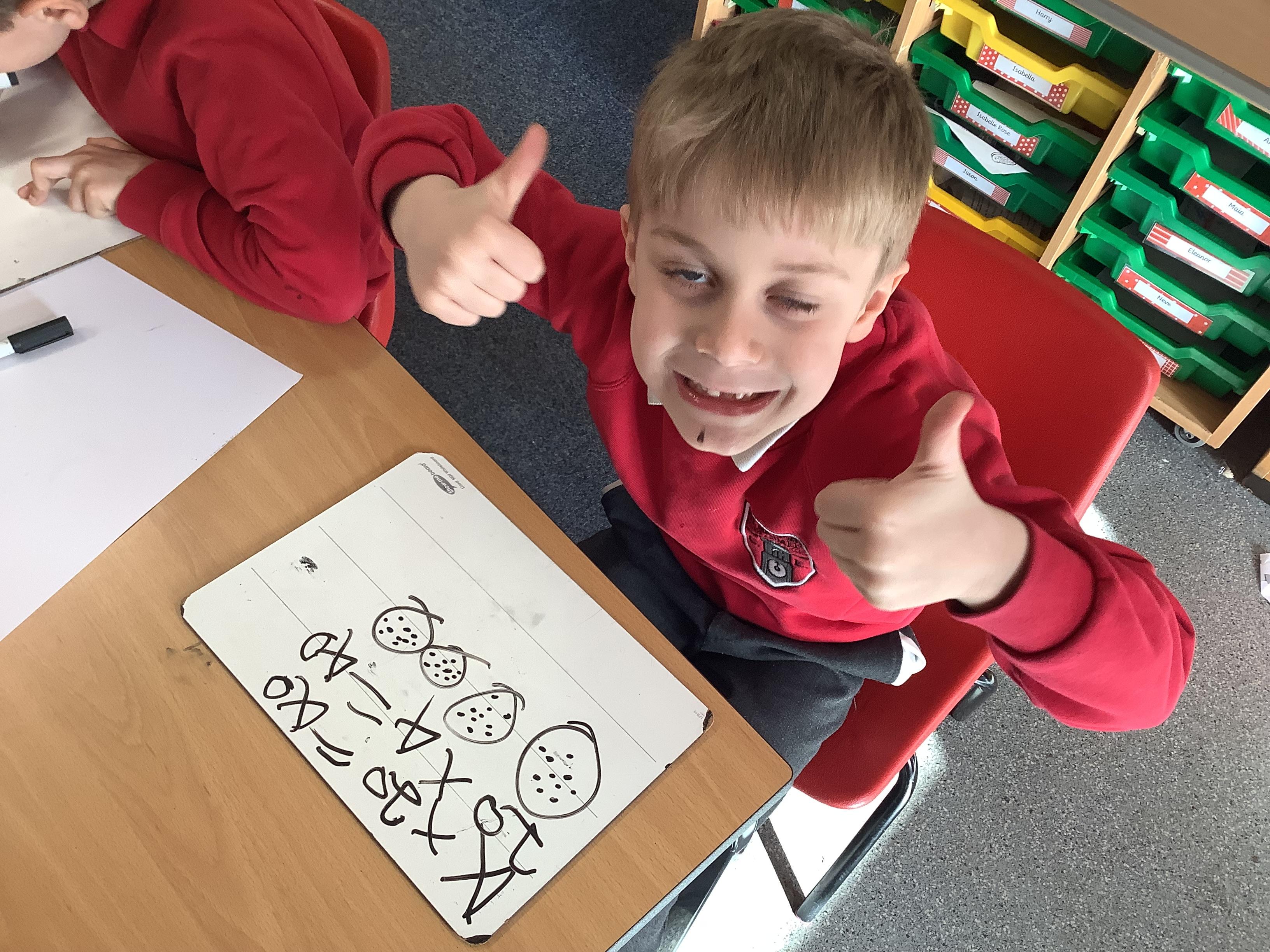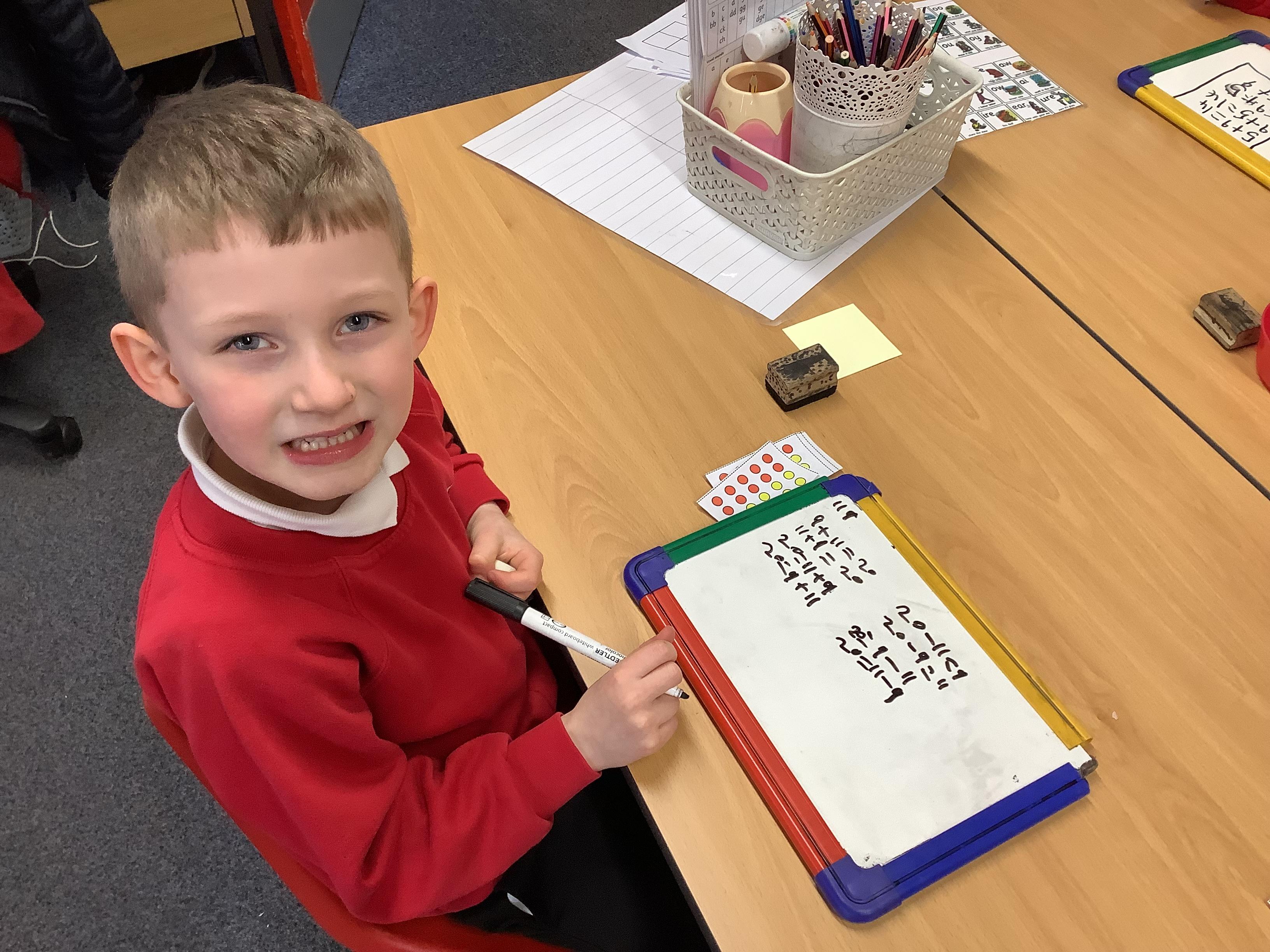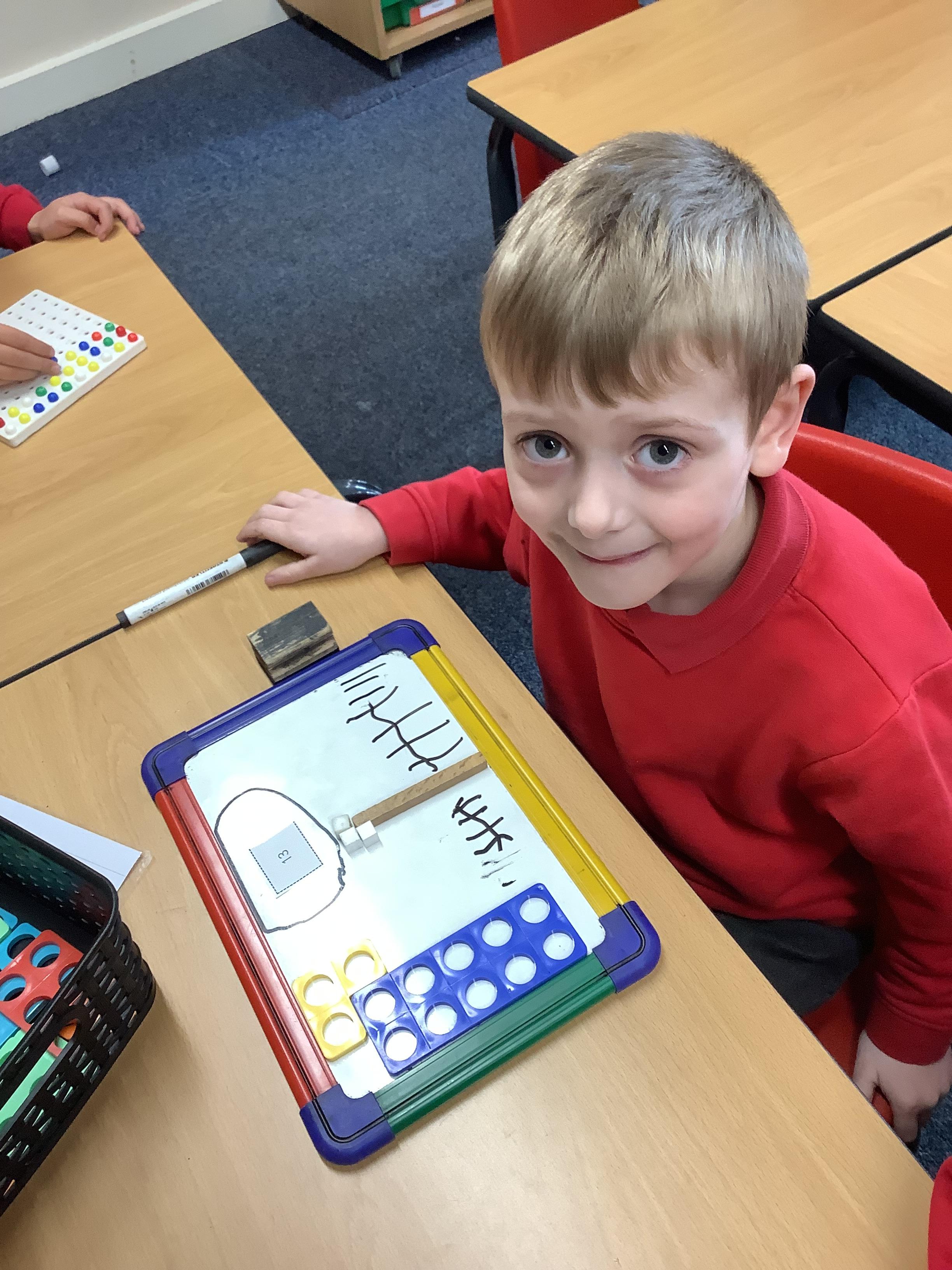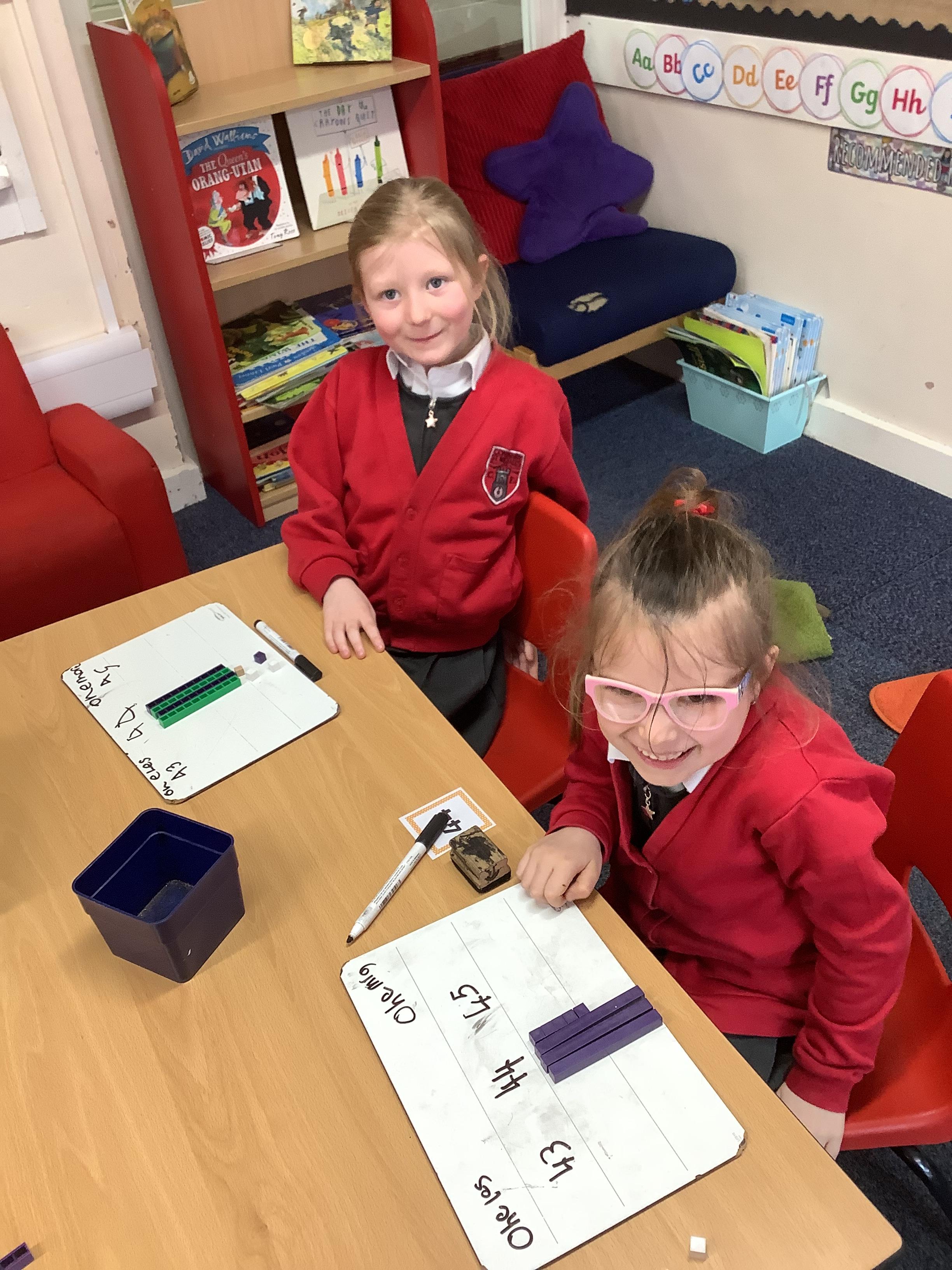 Year 1 in maths we looked at fact families and finding the related facts, so if 4 + 1 = 5 then 1 + 4 = 5 and 5 - 4 =1 and 5 - 1 = 4. We built our number facts on tens frames and then recorded them on whiteboards.