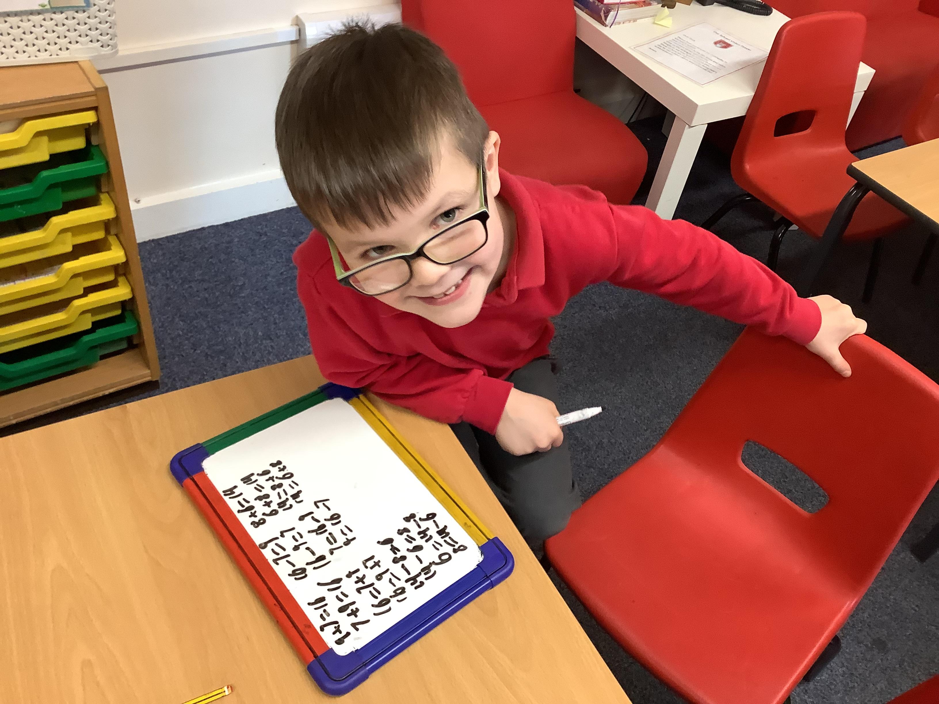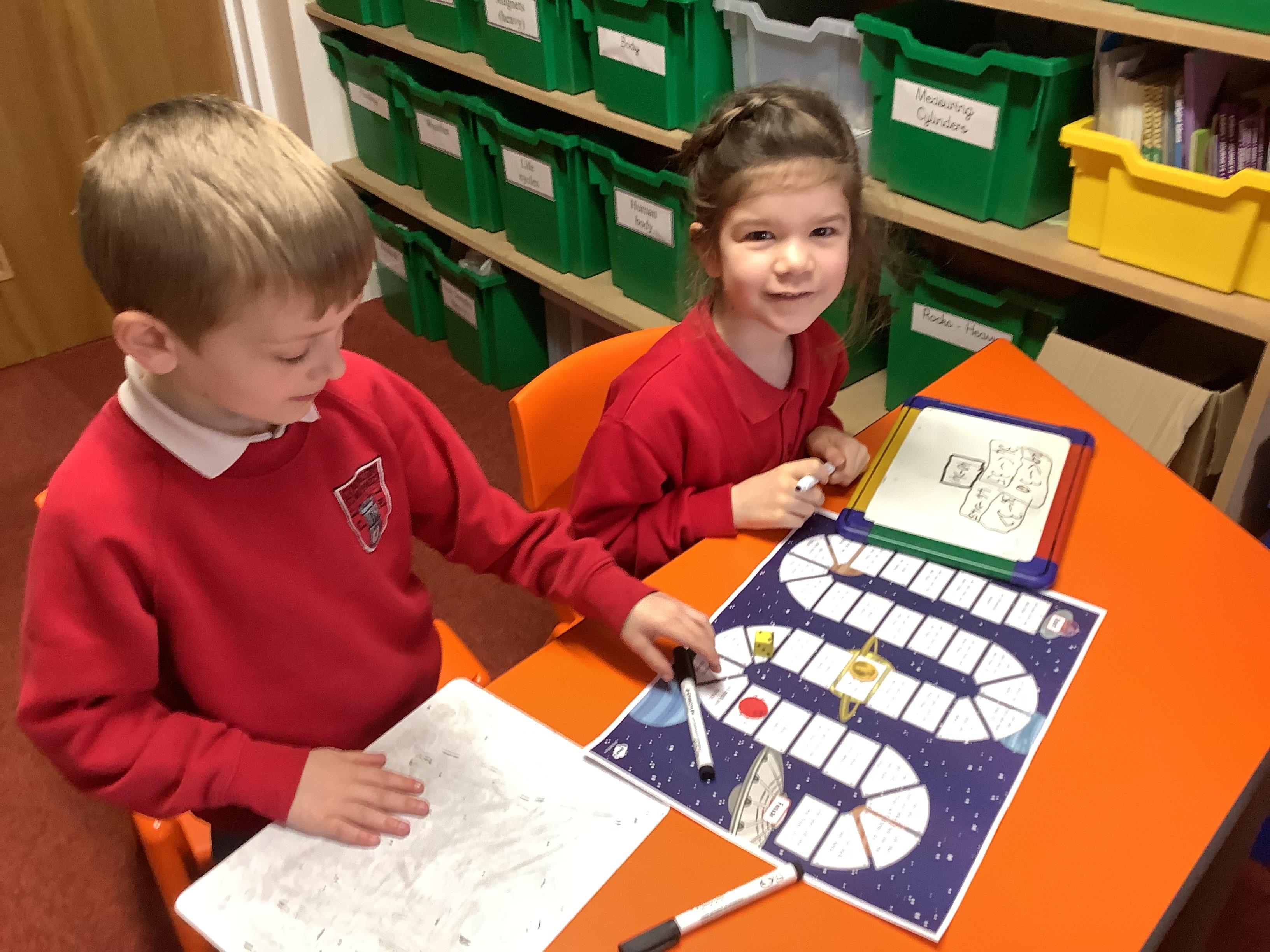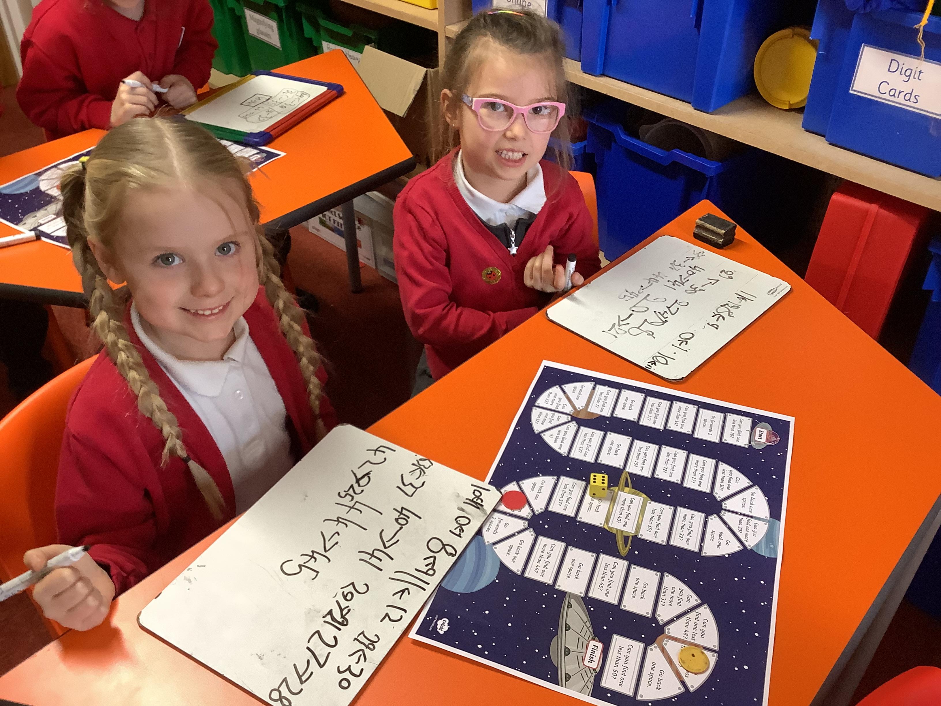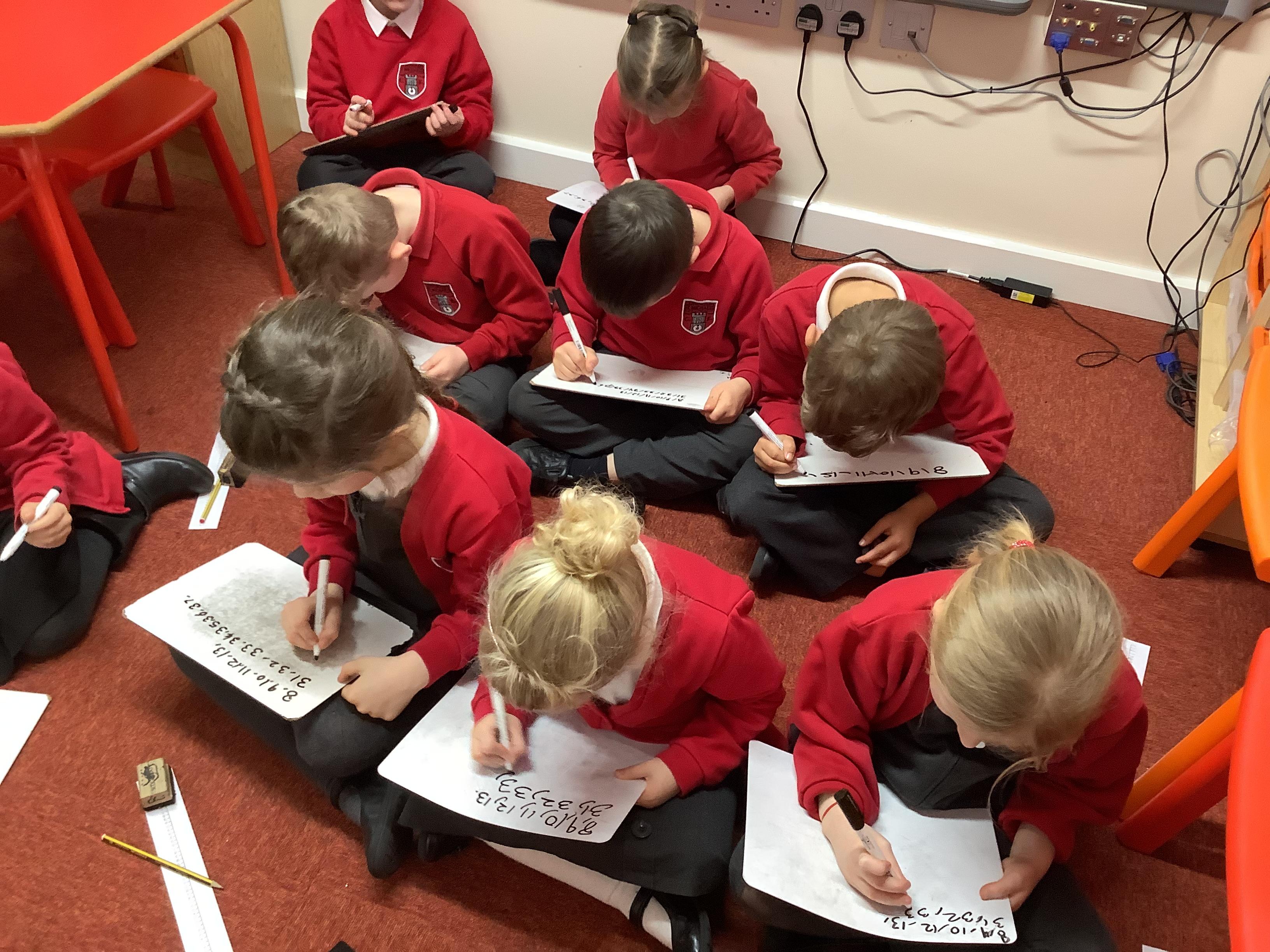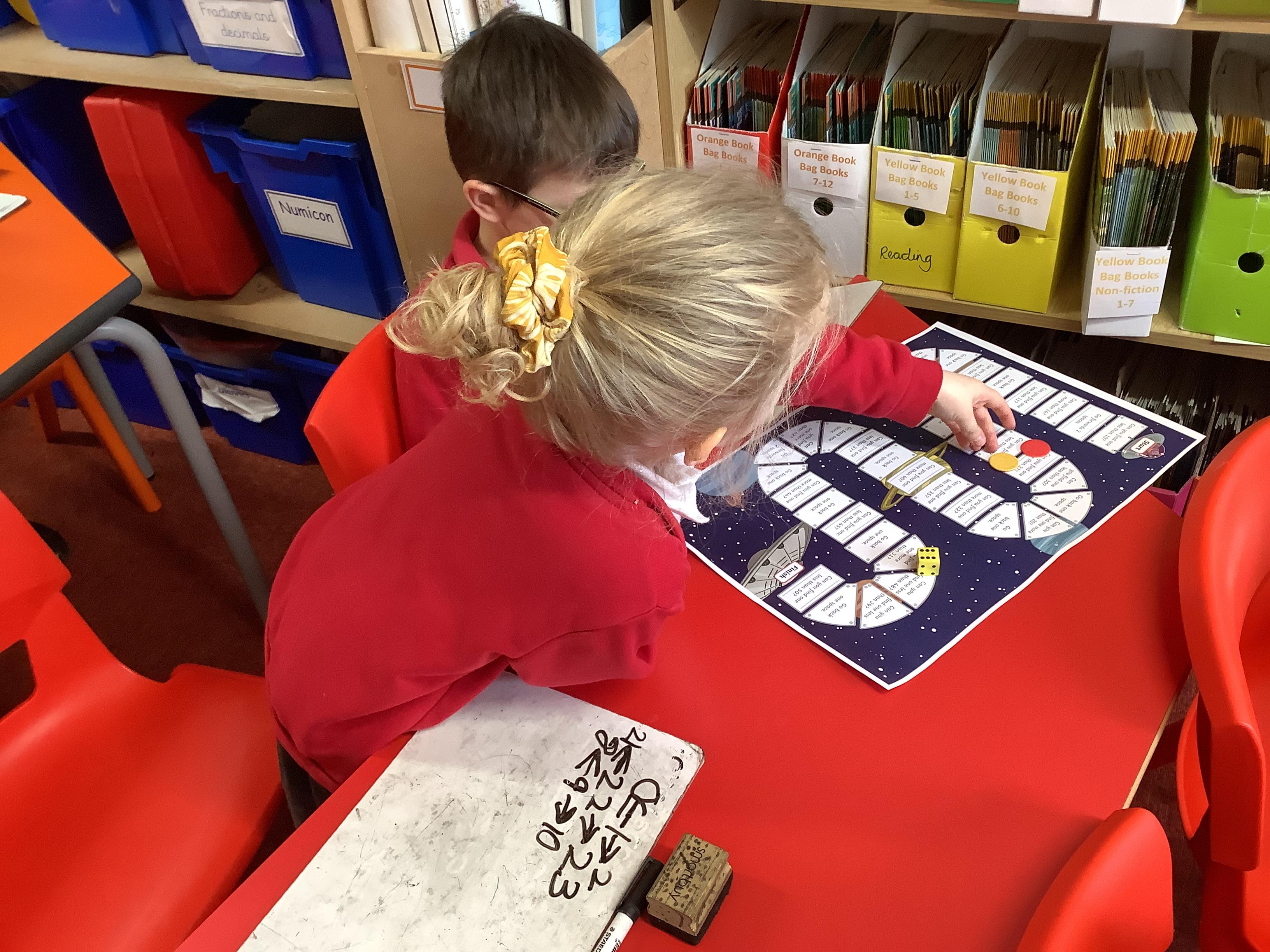 Year 1 in maths we looked at fact families and finding the related facts, so if 4 + 1 = 5 then 1 + 4 = 5 and 5 - 4 =1 and 5 - 1 = 4. We built our number facts on tens frames and then recorded them on whiteboards.