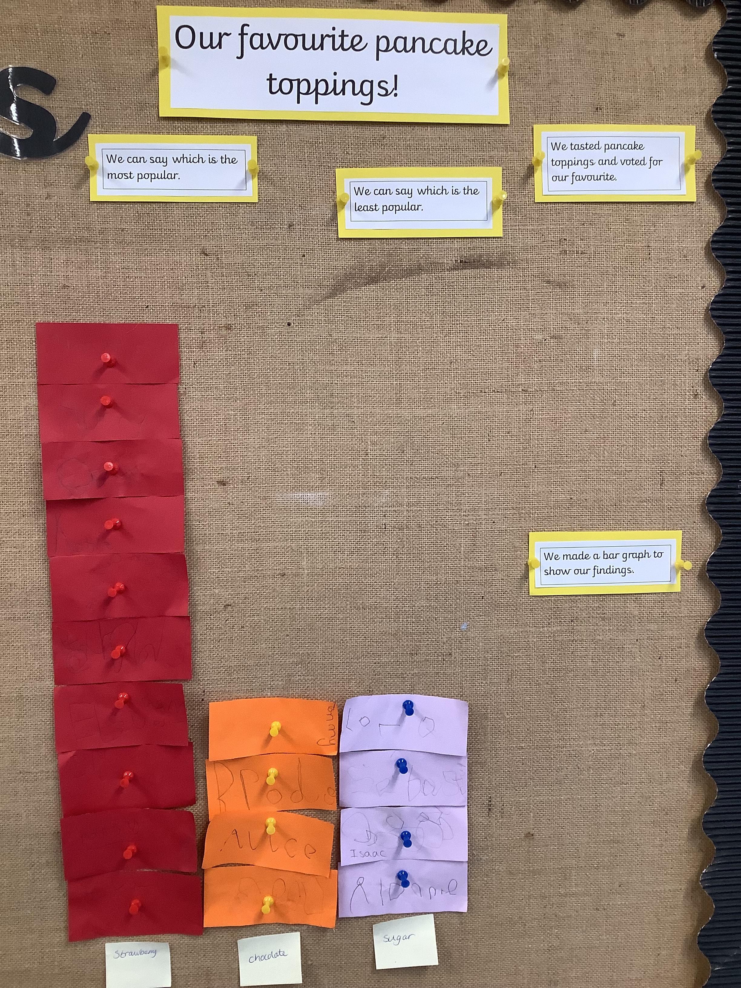 We have had fun celebrating pancake day today. We have tasted different toppings and voted for our favourite. We made a bar graph in two different ways.