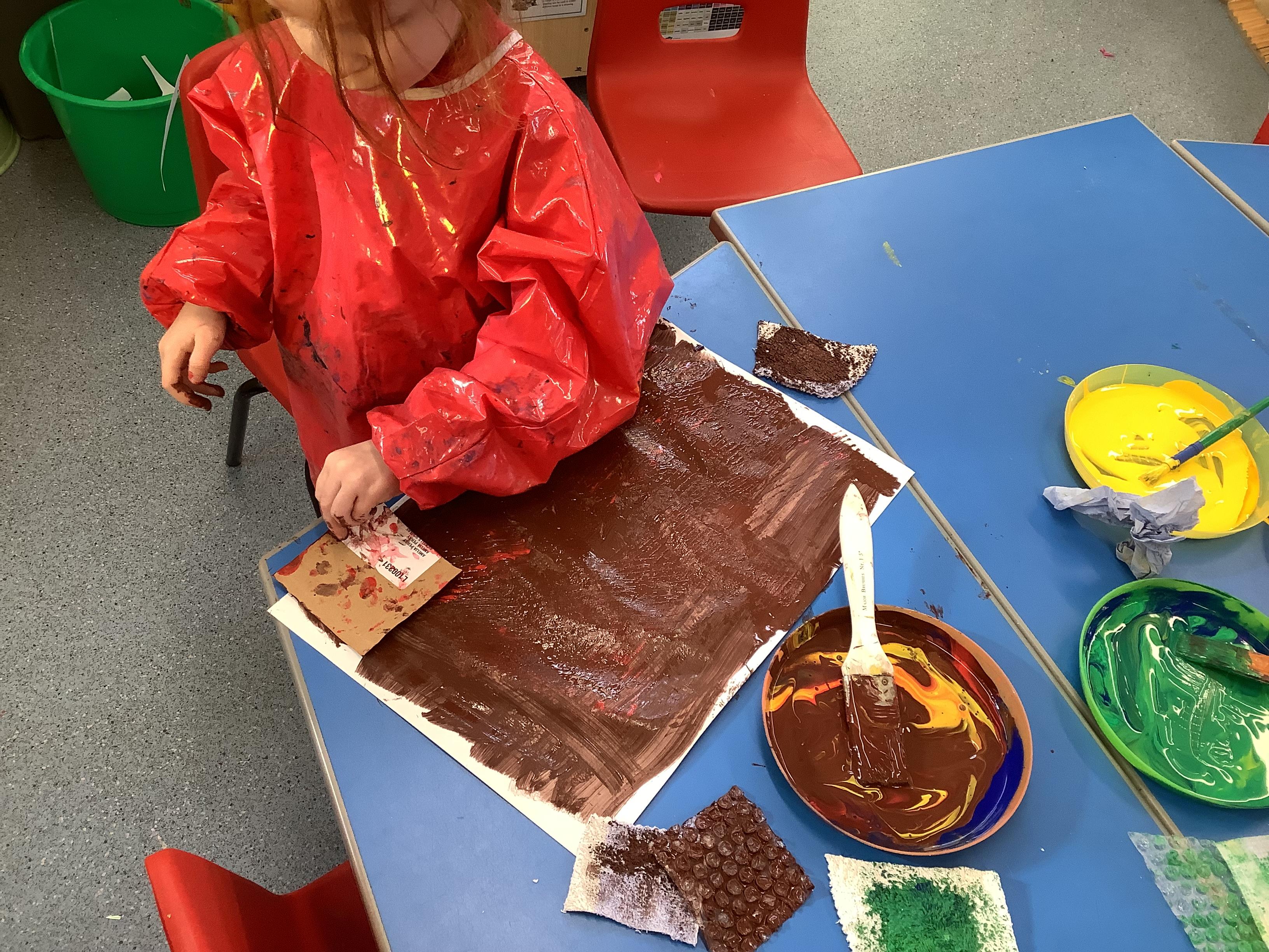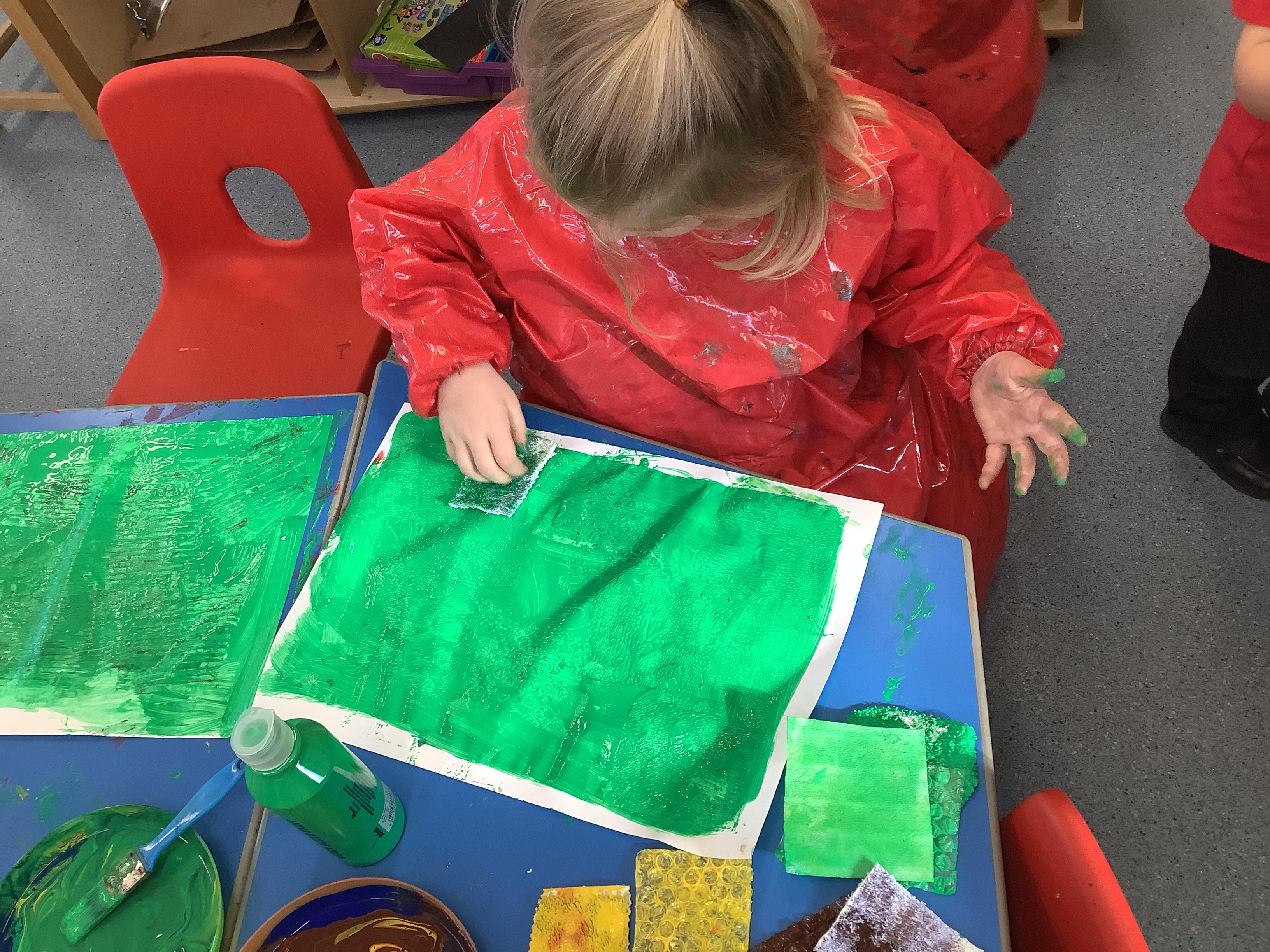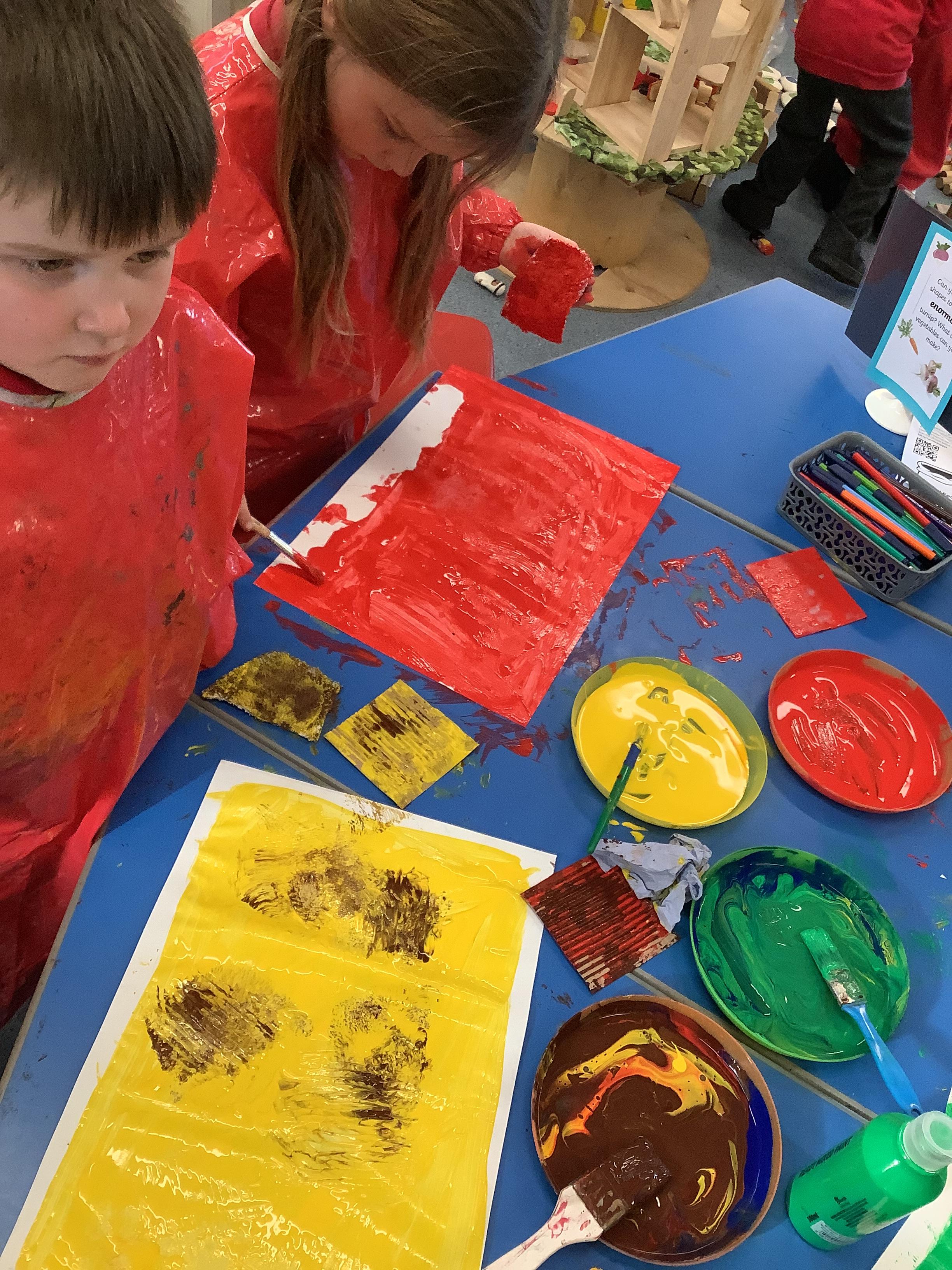 In Art, we have been exploring the work of Eric Carle. We have printed with various materials onto paint to make patterned paper.