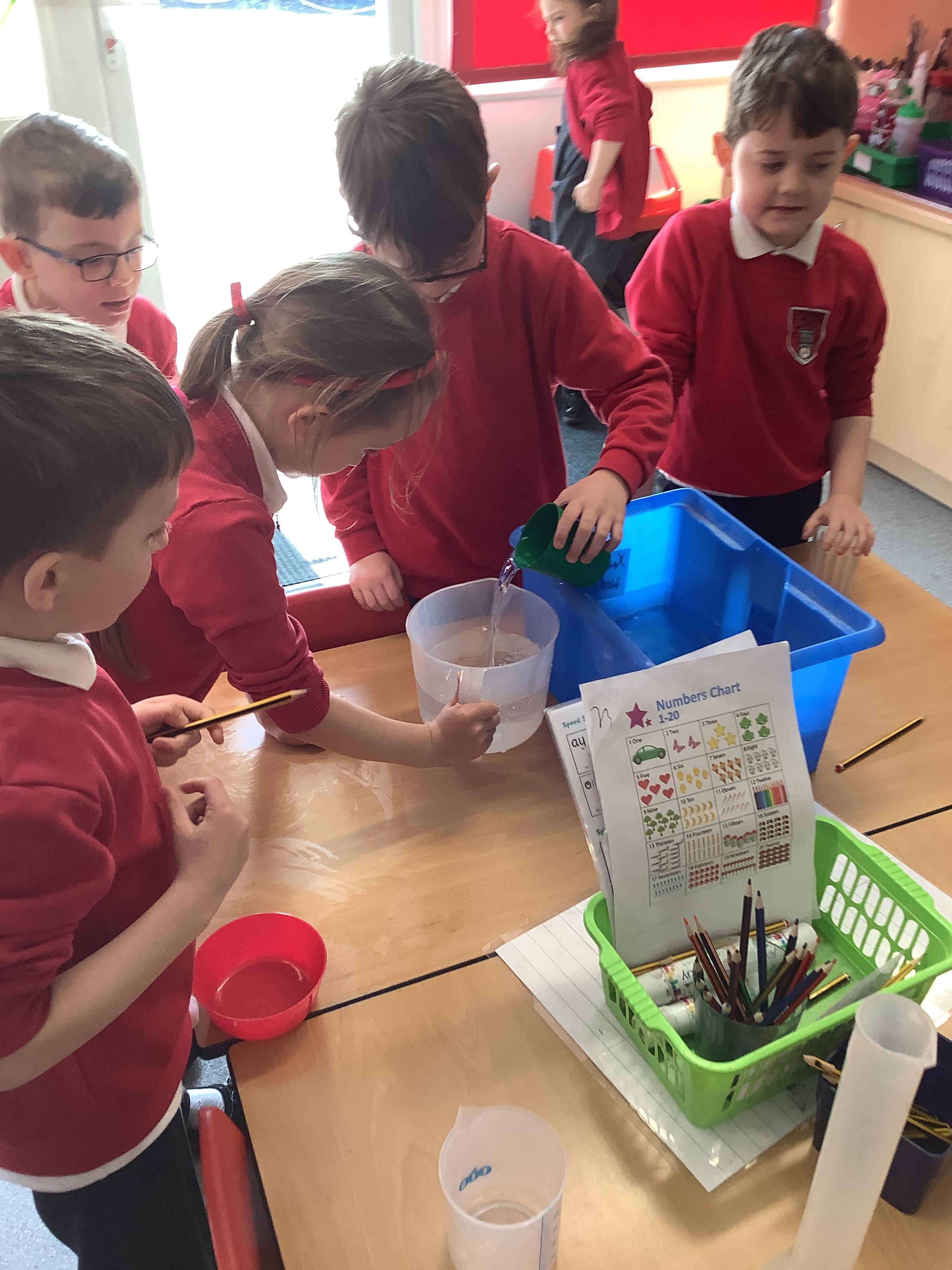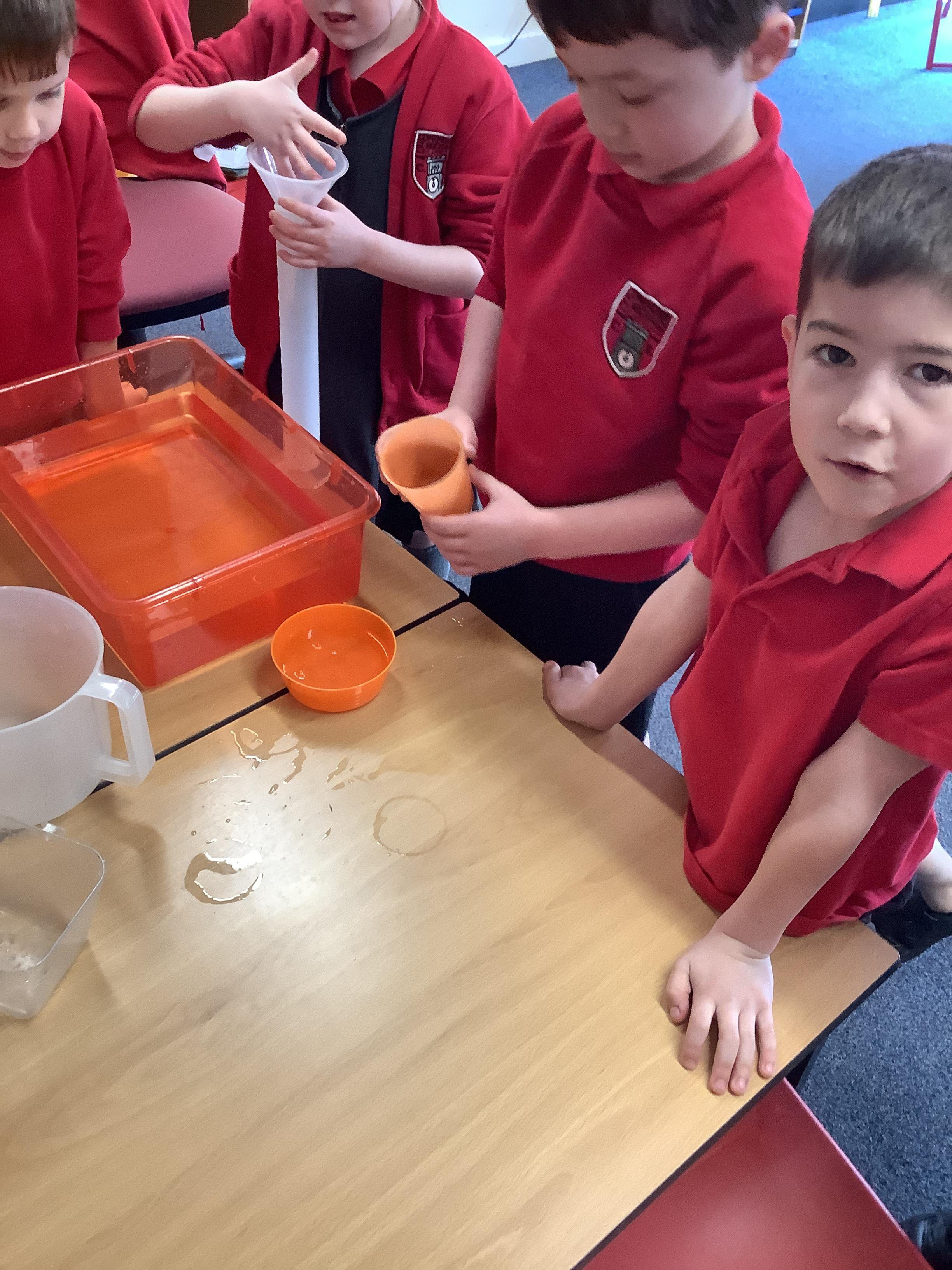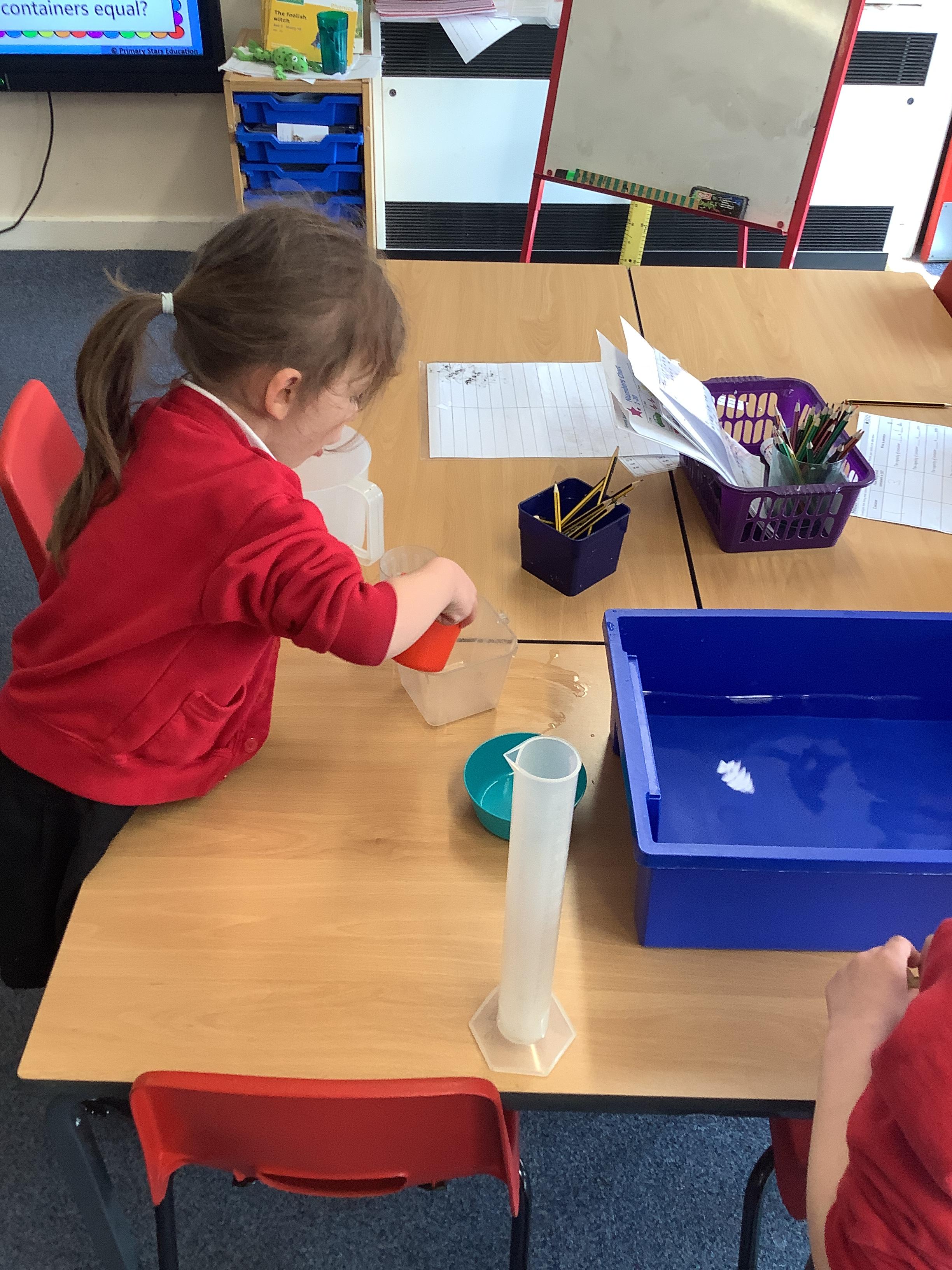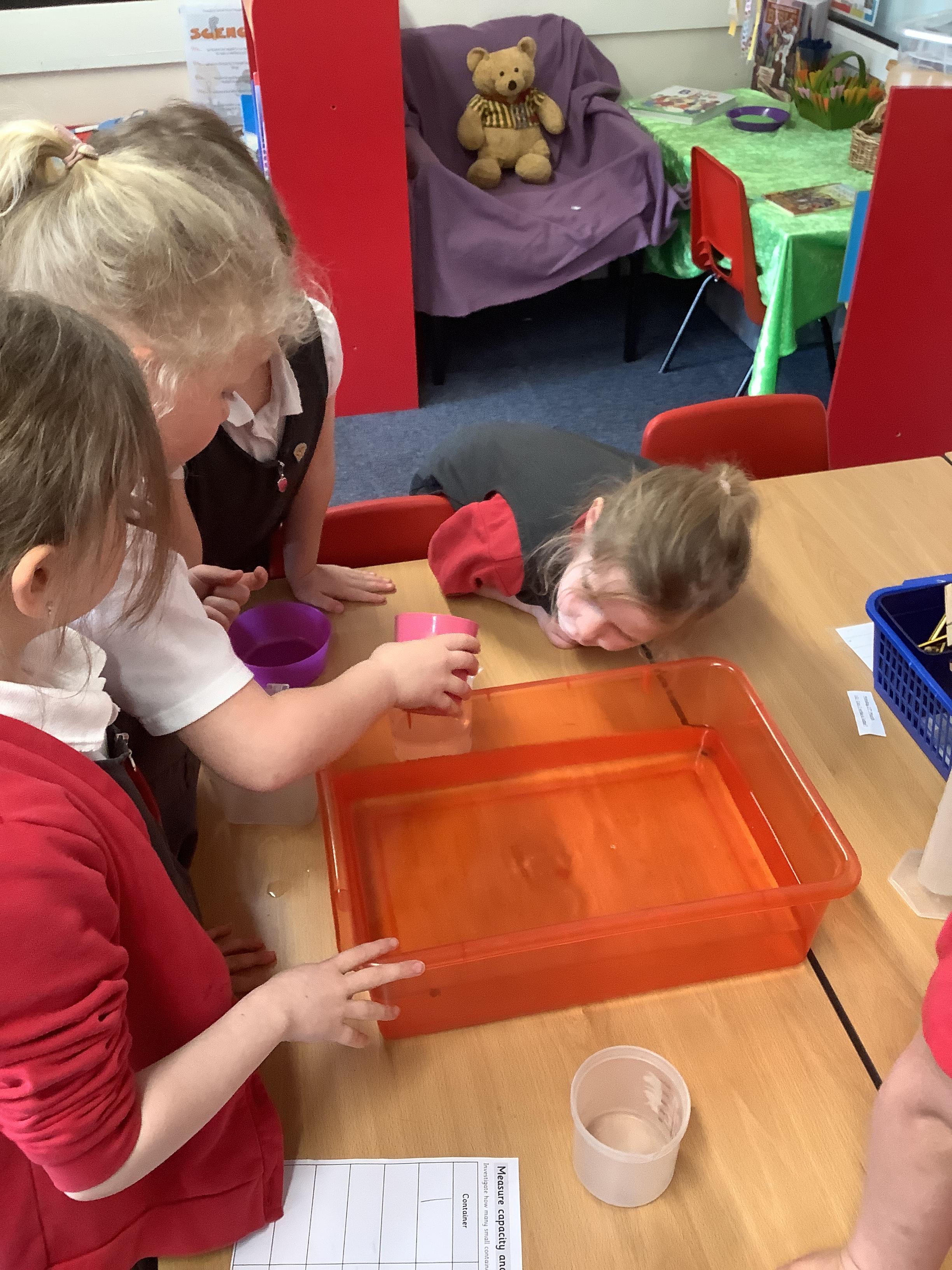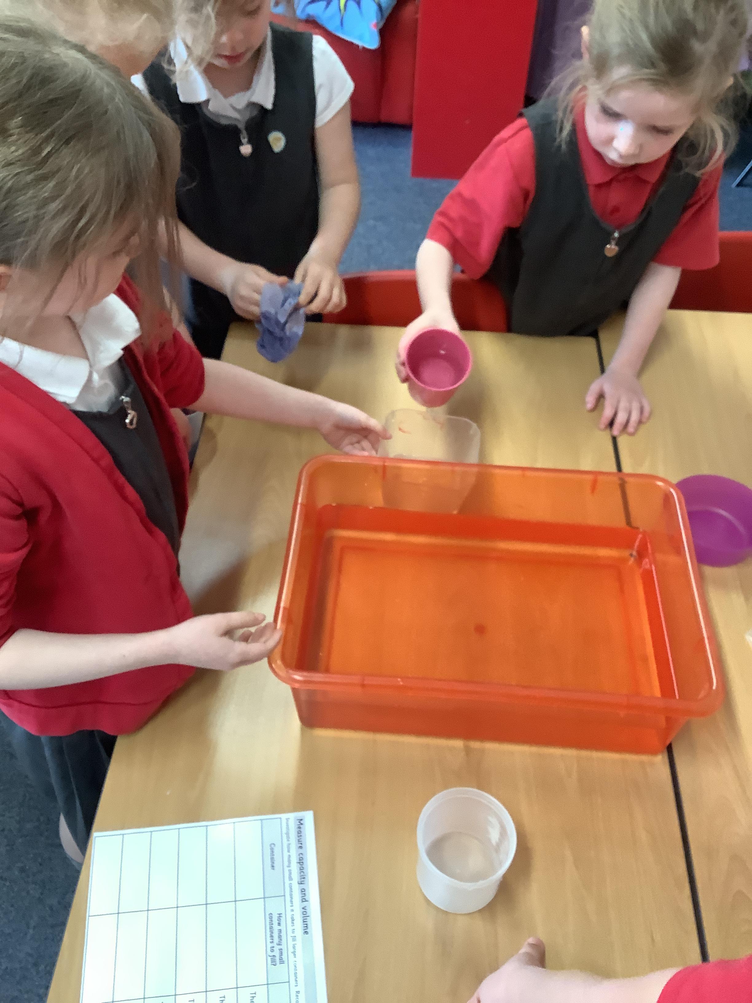 In Maths we have been exploring measuring capacity. We had to fill containers using a cup. We had to count how many cups it took to fill the container finding the volume.