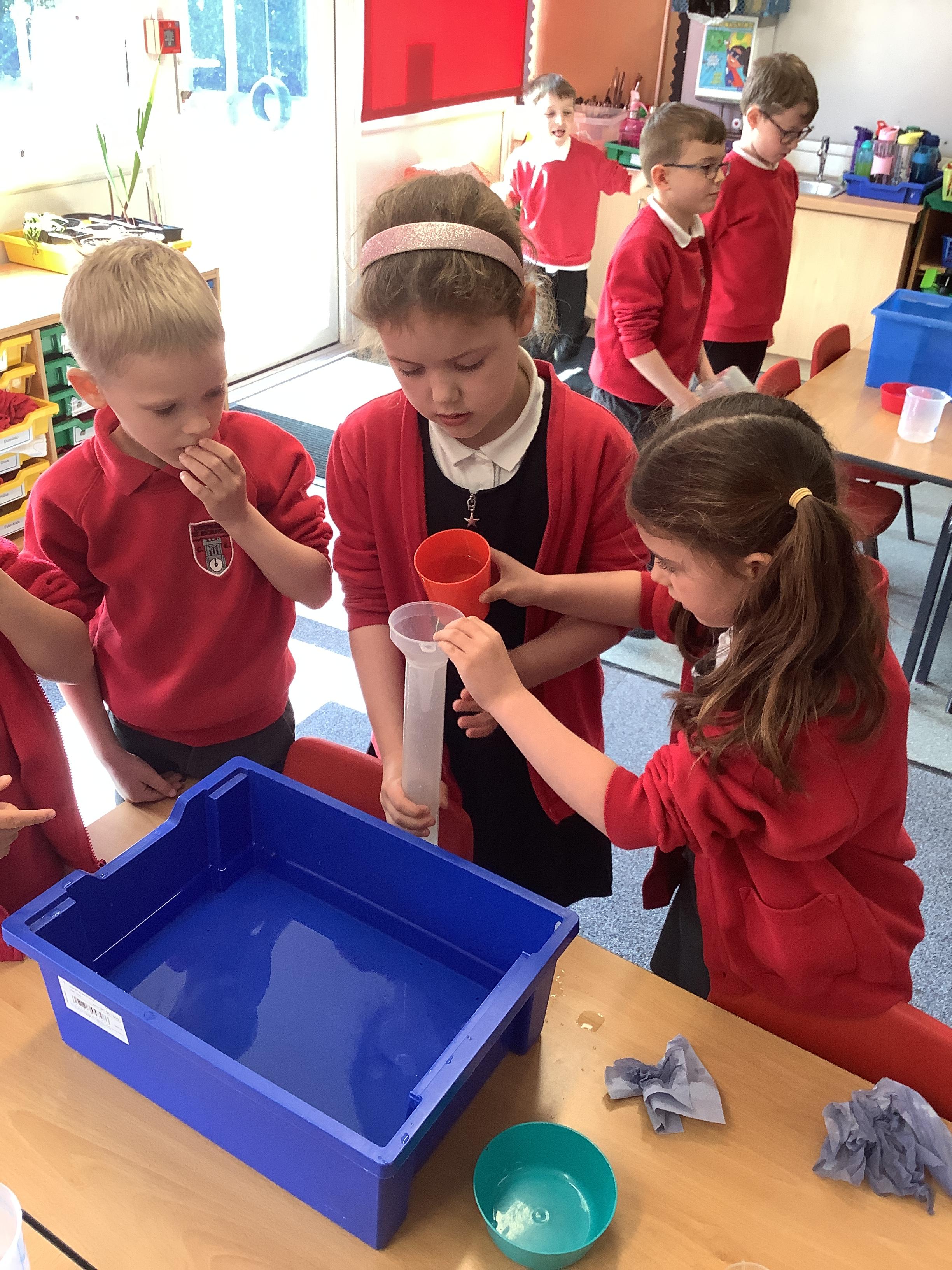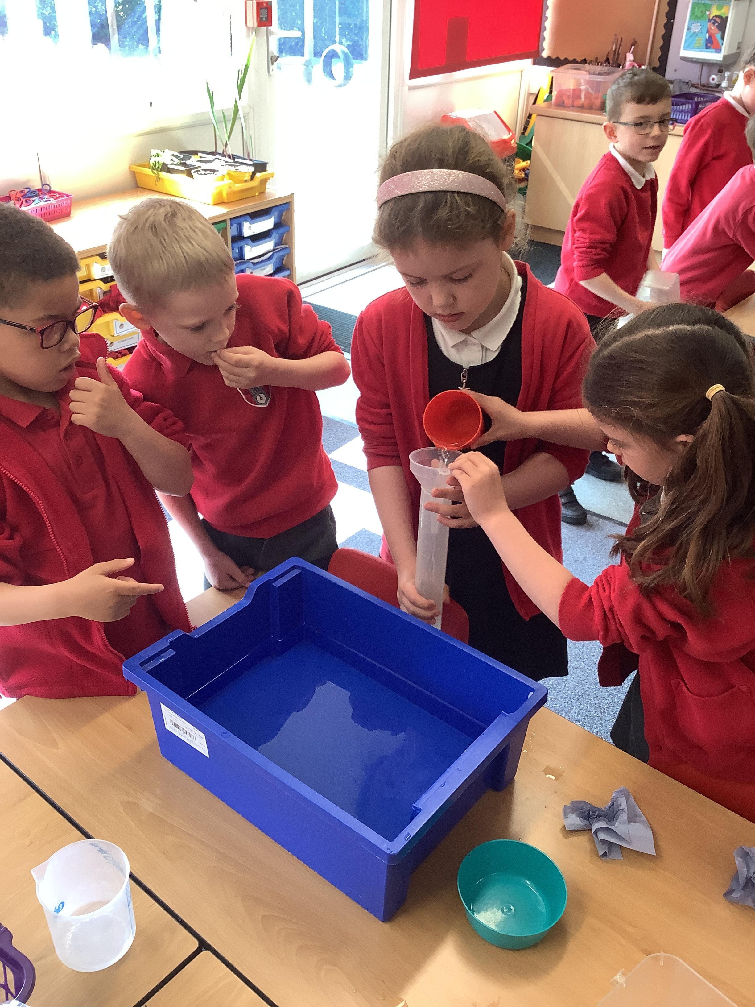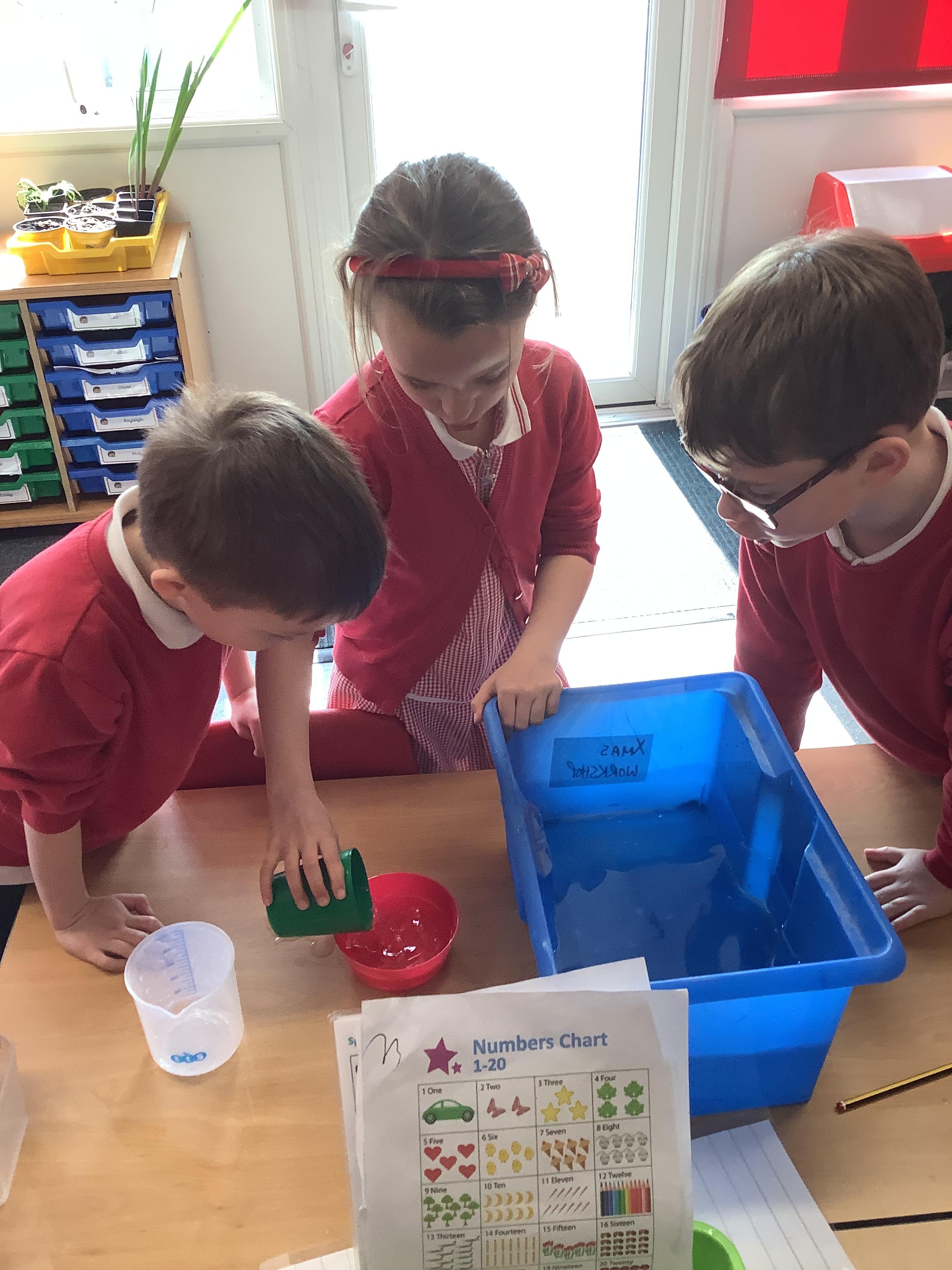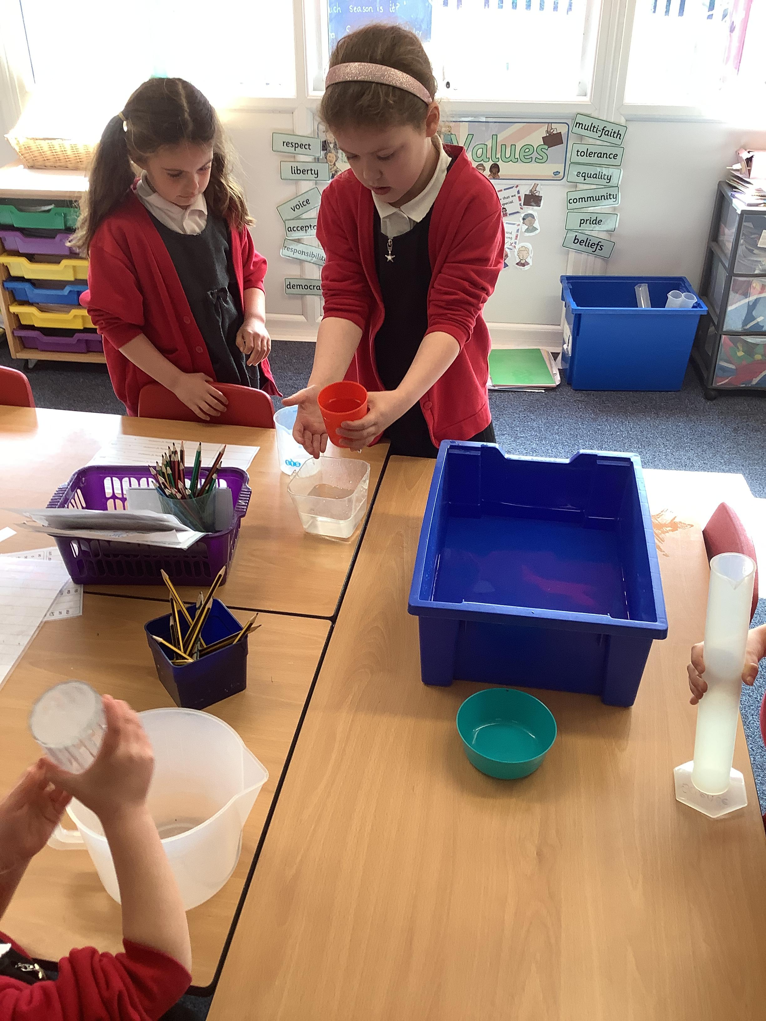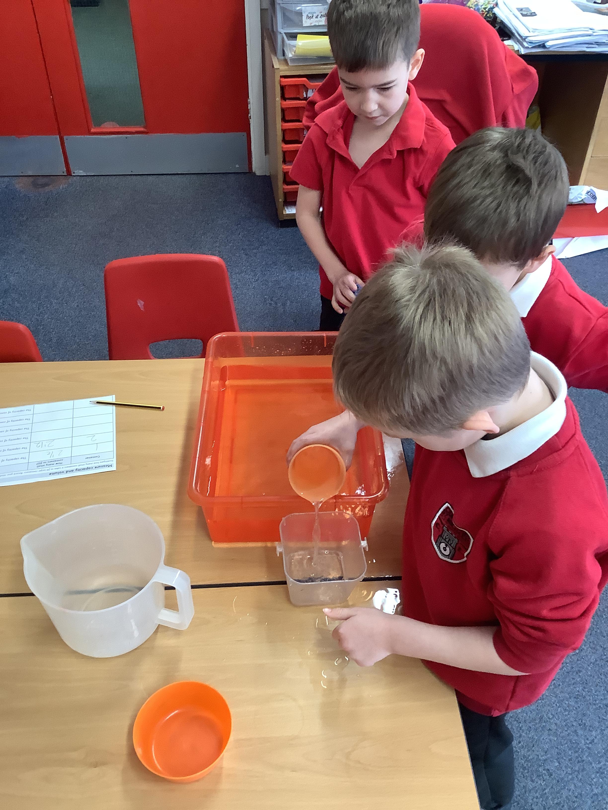 In Maths we have been exploring measuring capacity. We had to fill containers using a cup. We had to count how many cups it took to fill the container finding the volume.