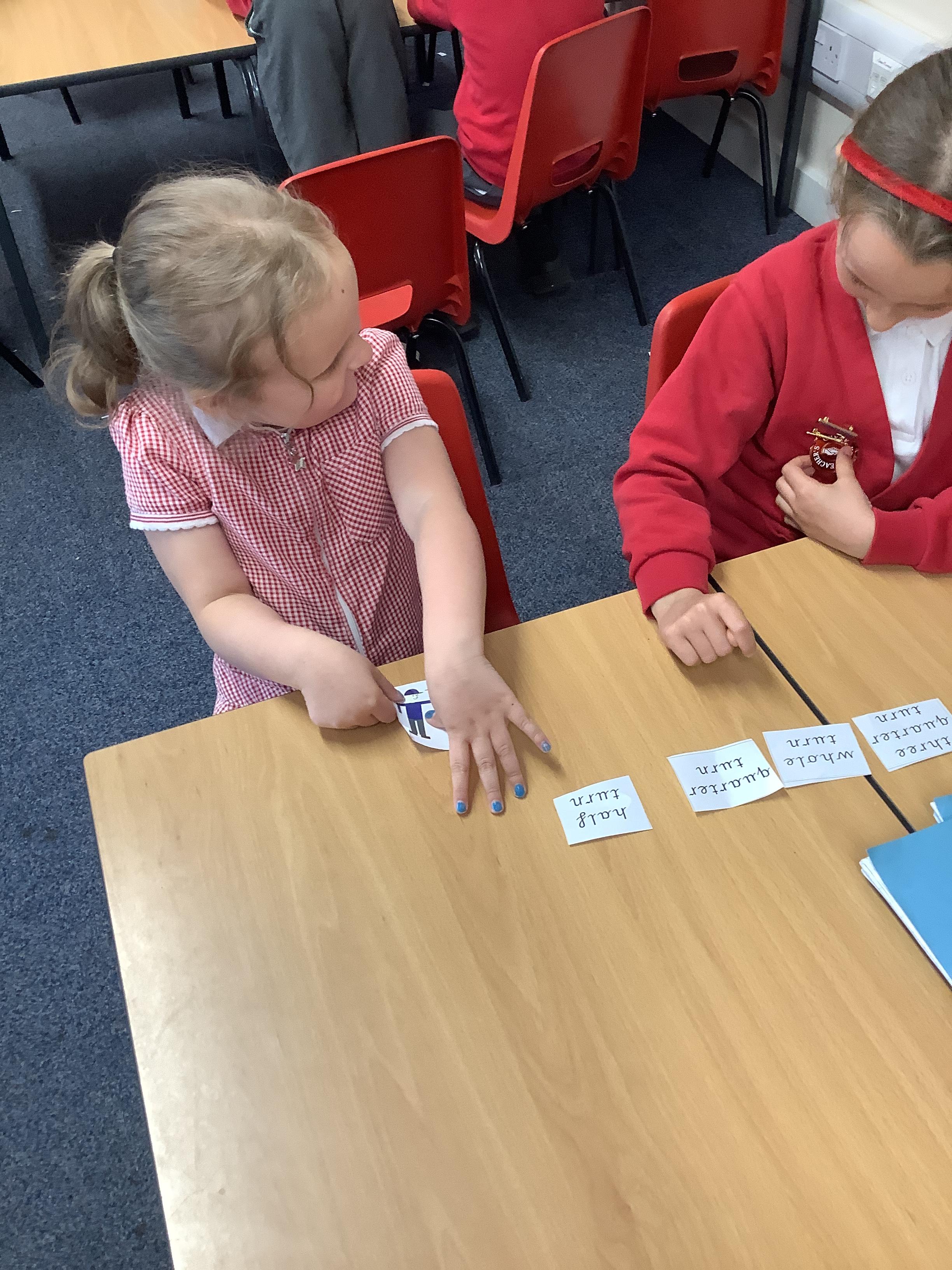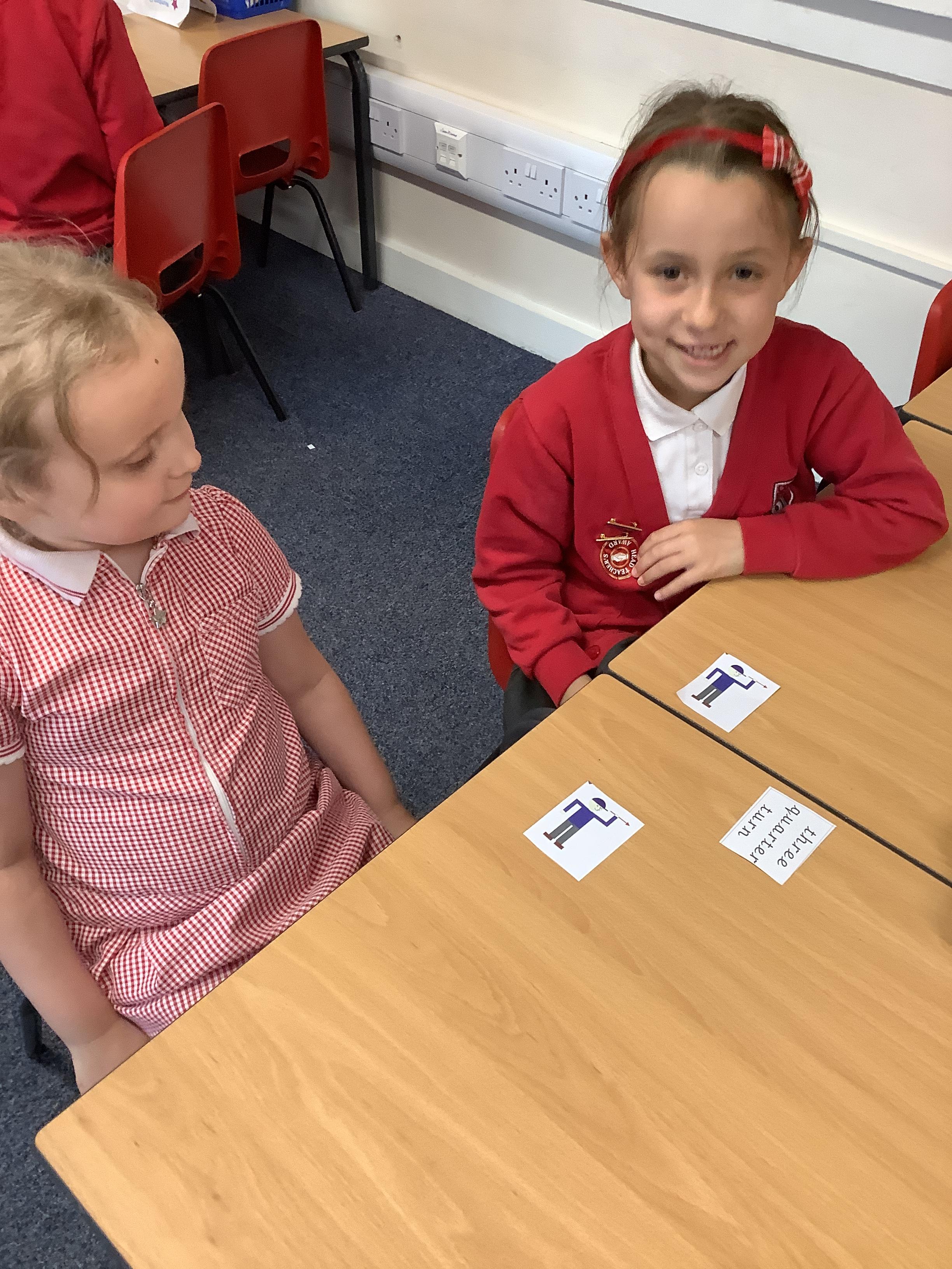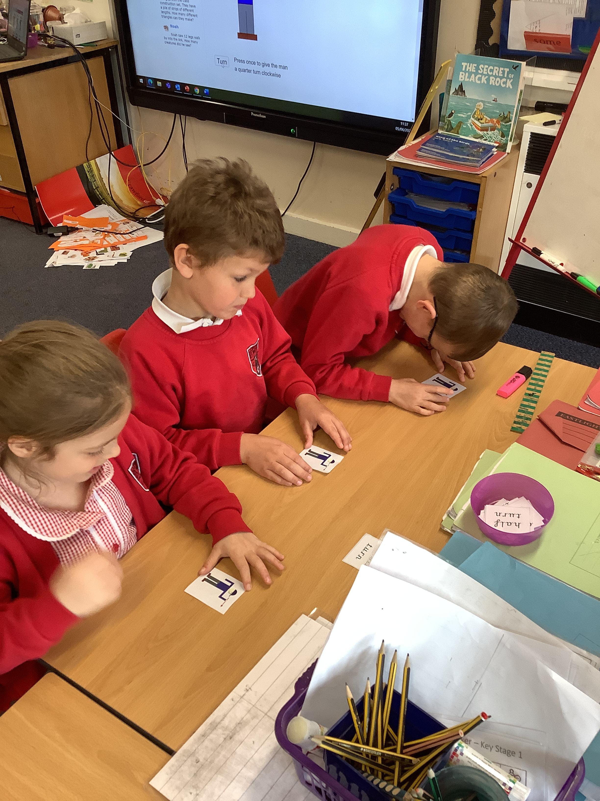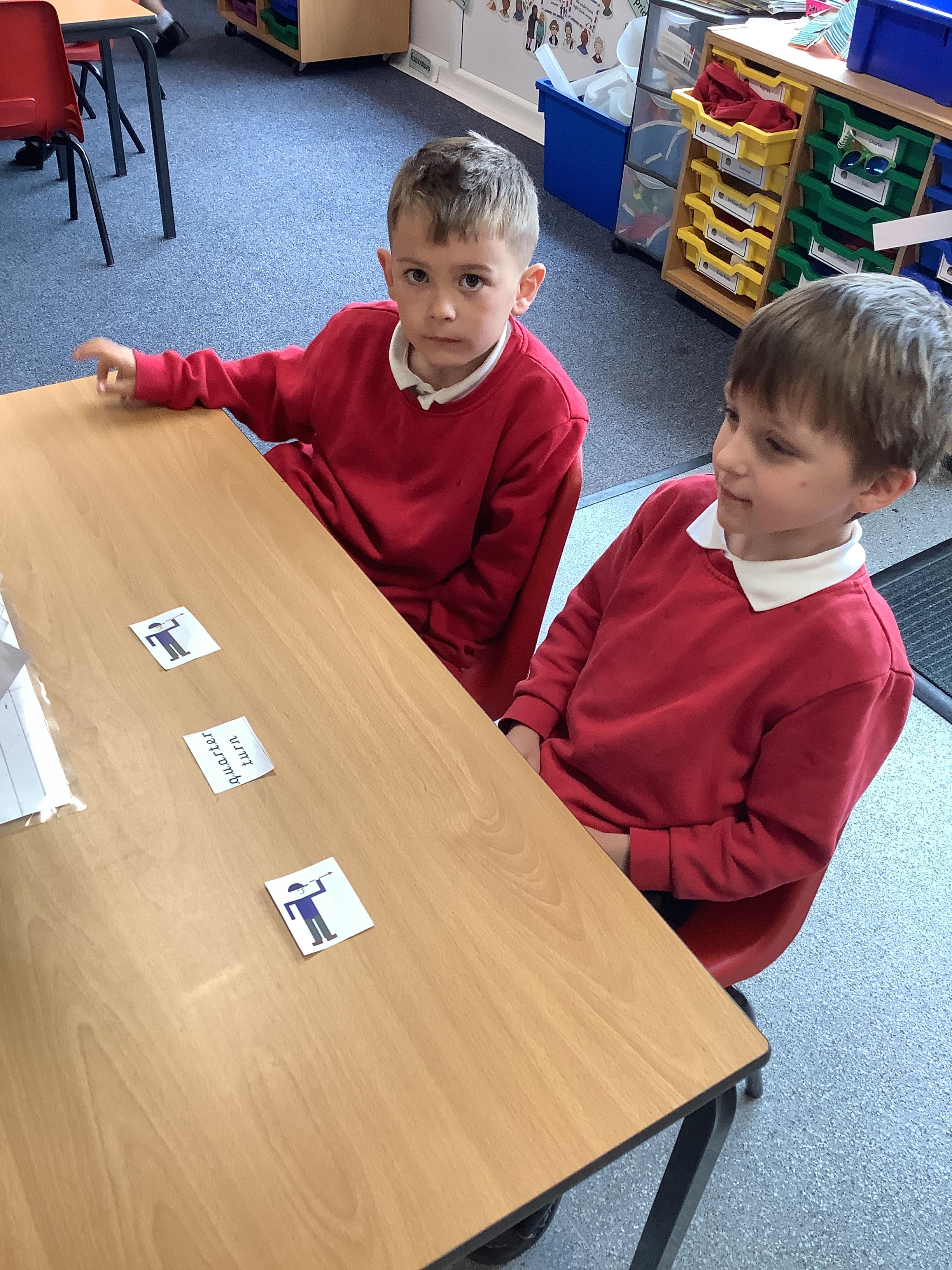 In Maths we each had a turning man that we used to practise a whole turn, half a turn, a quarter turn and a three quarter turn. We checked with our partners that we had made the turn correctly.