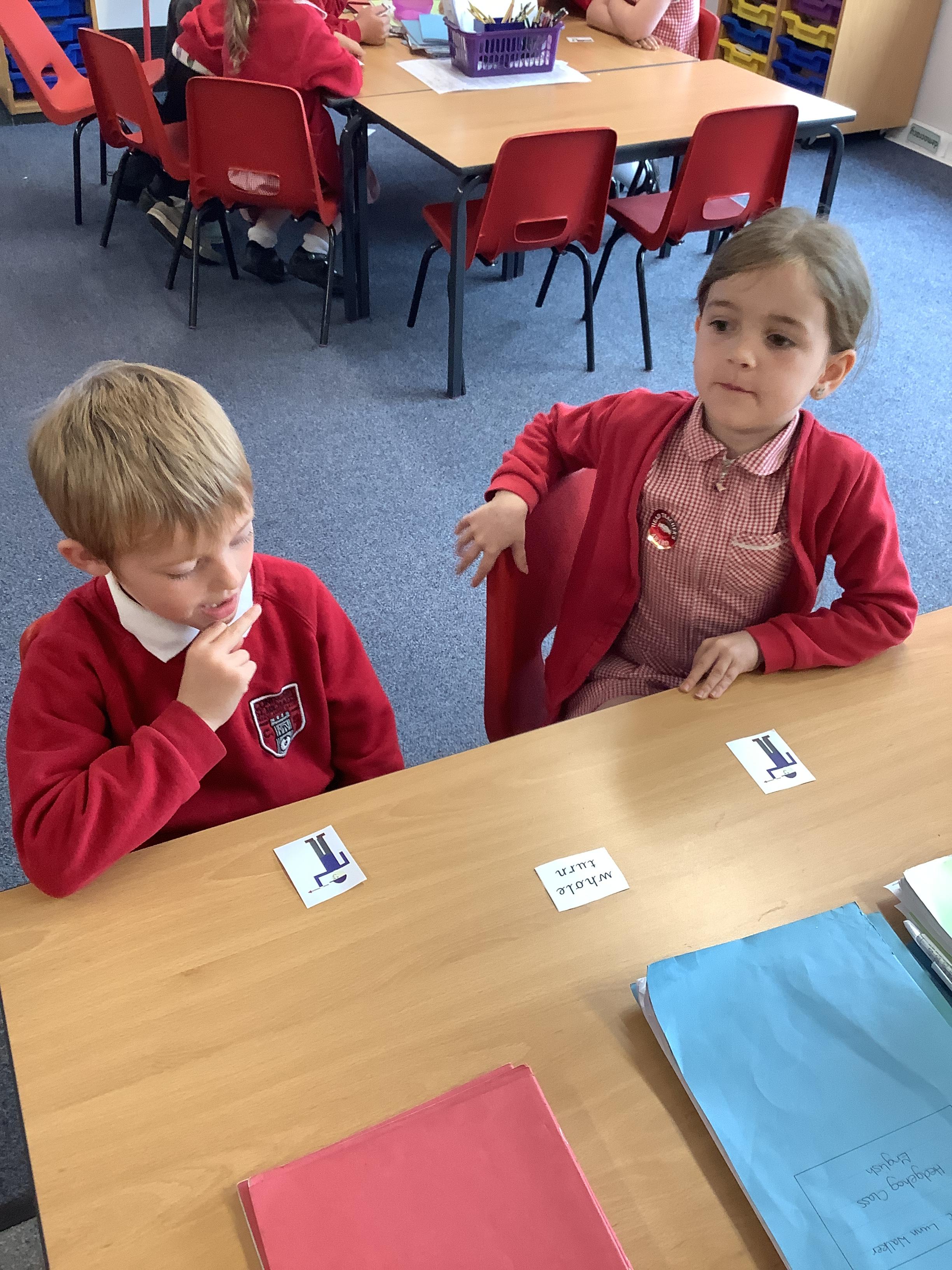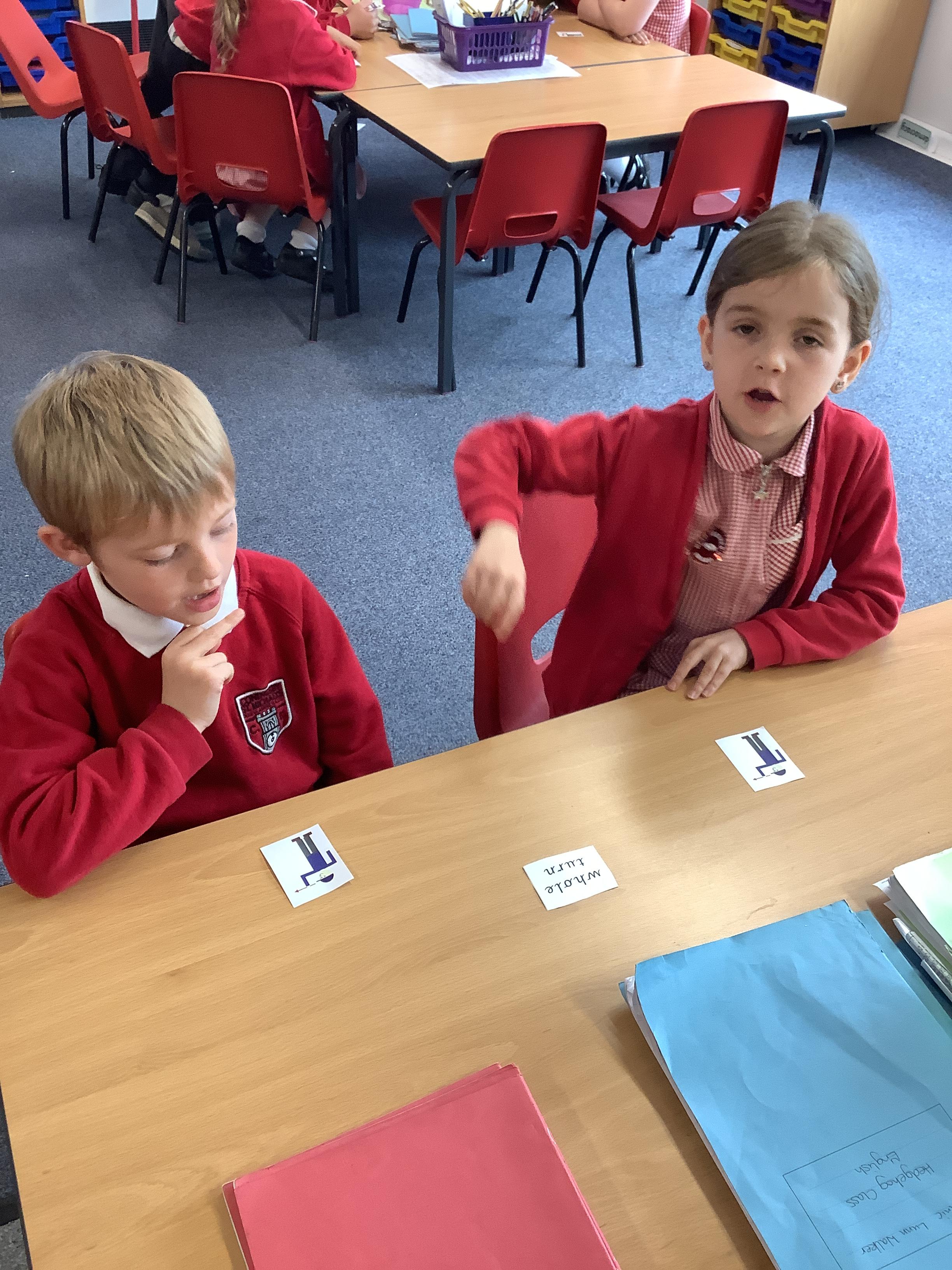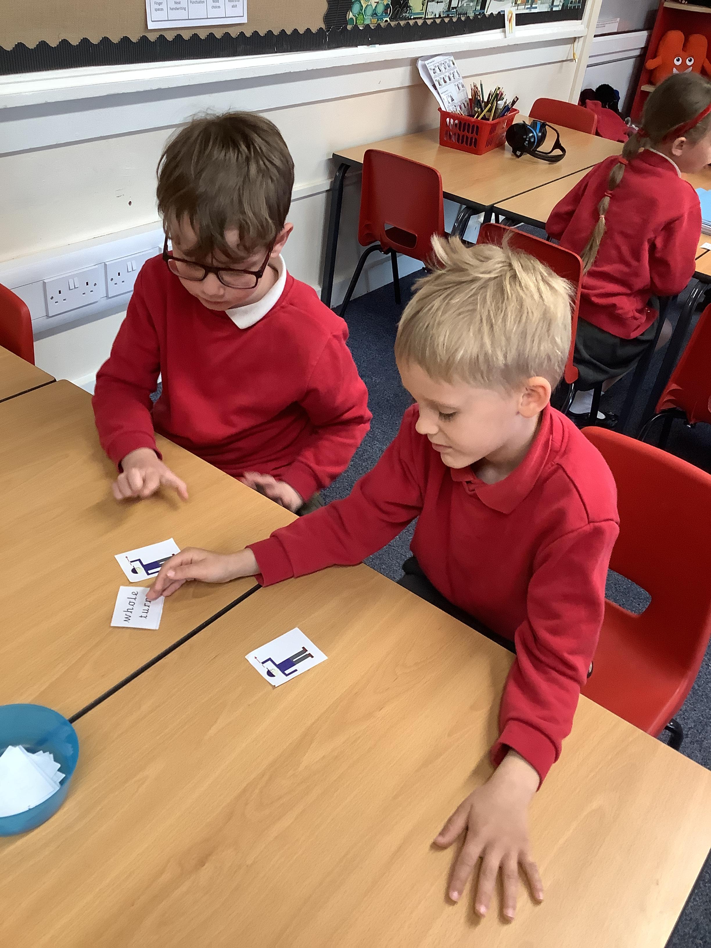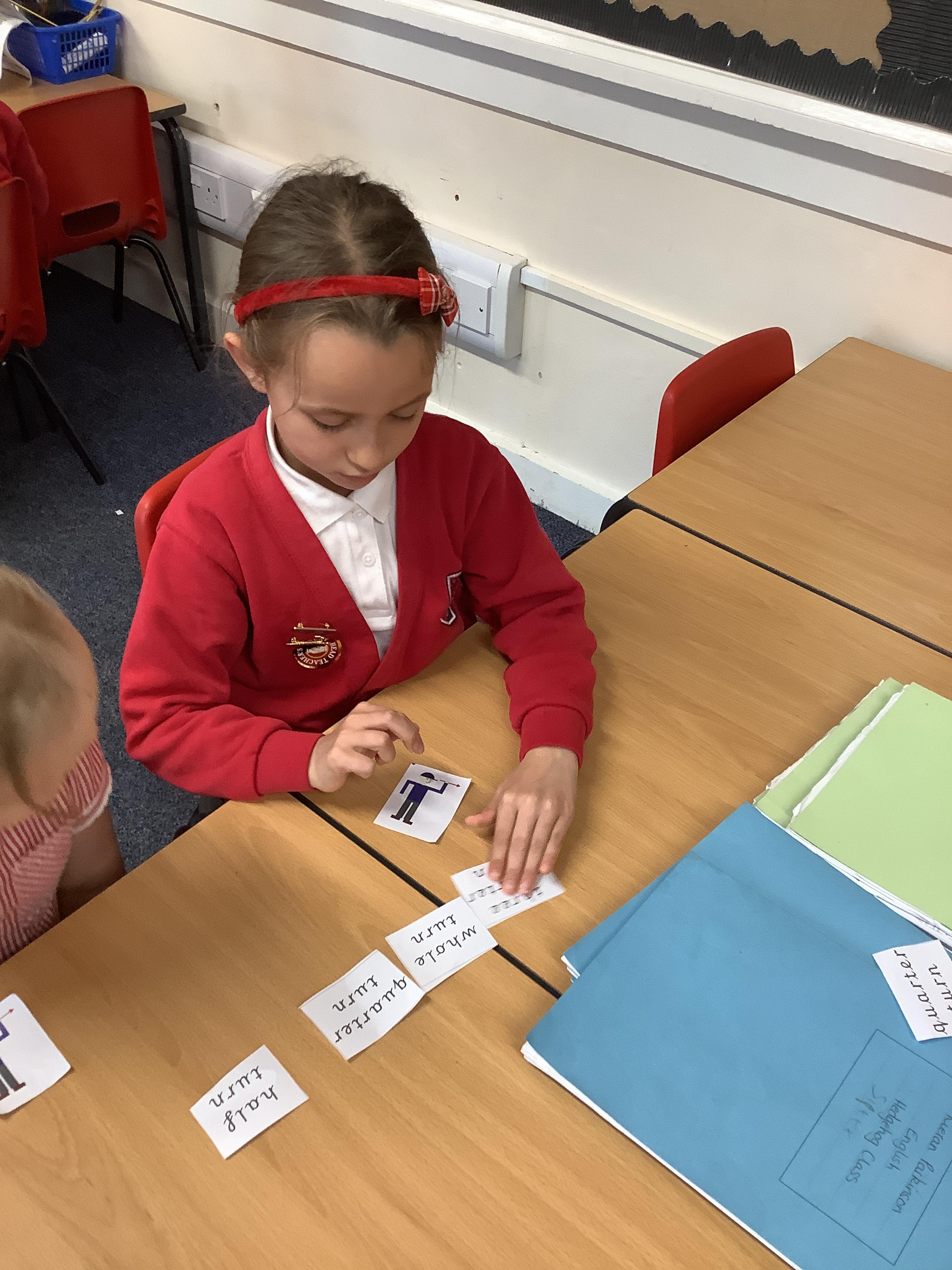In Maths we each had a turning man that we used to practise a whole turn, half a turn, a quarter turn and a three quarter turn. We checked with our partners that we had made the turn correctly.
