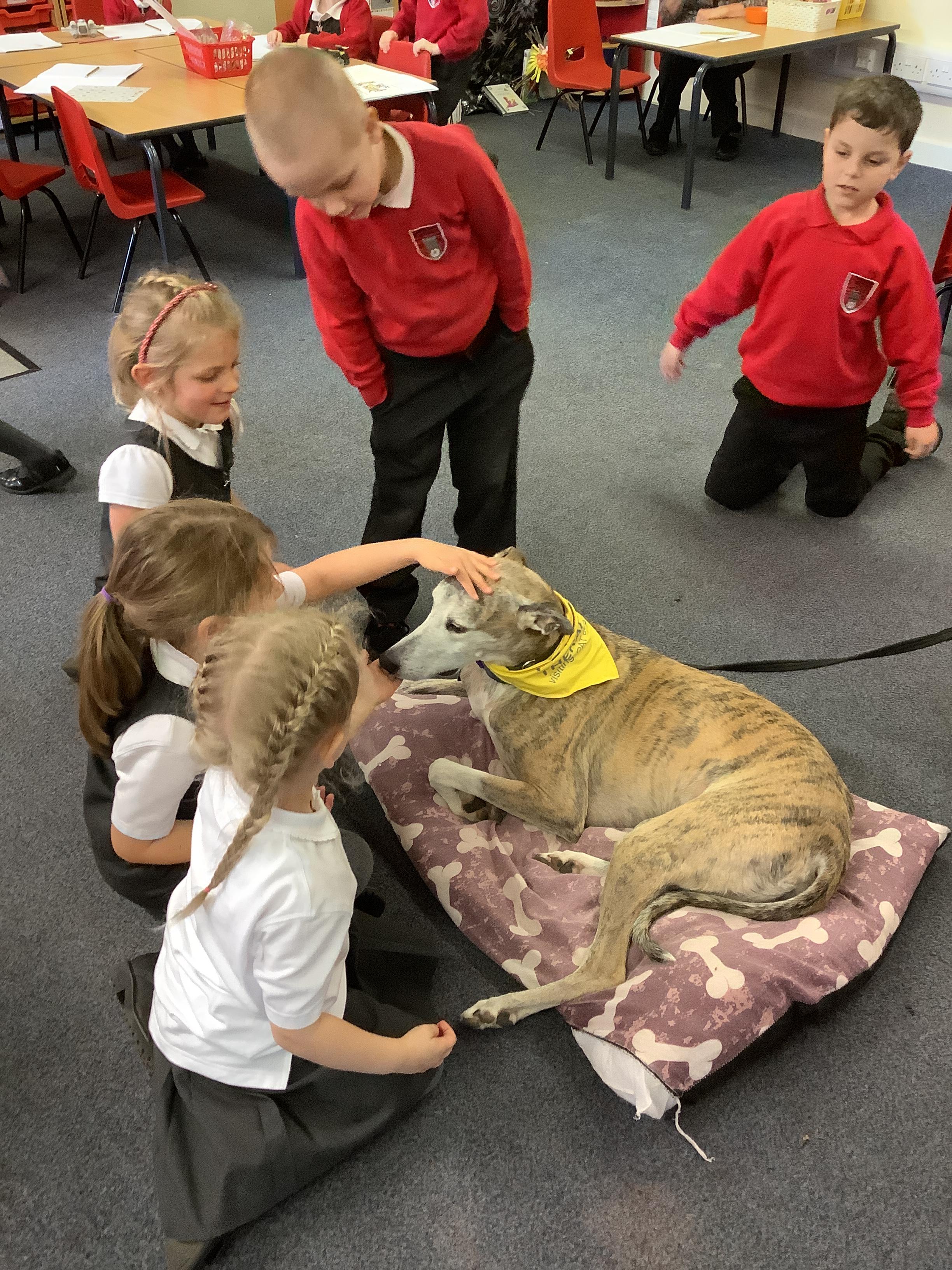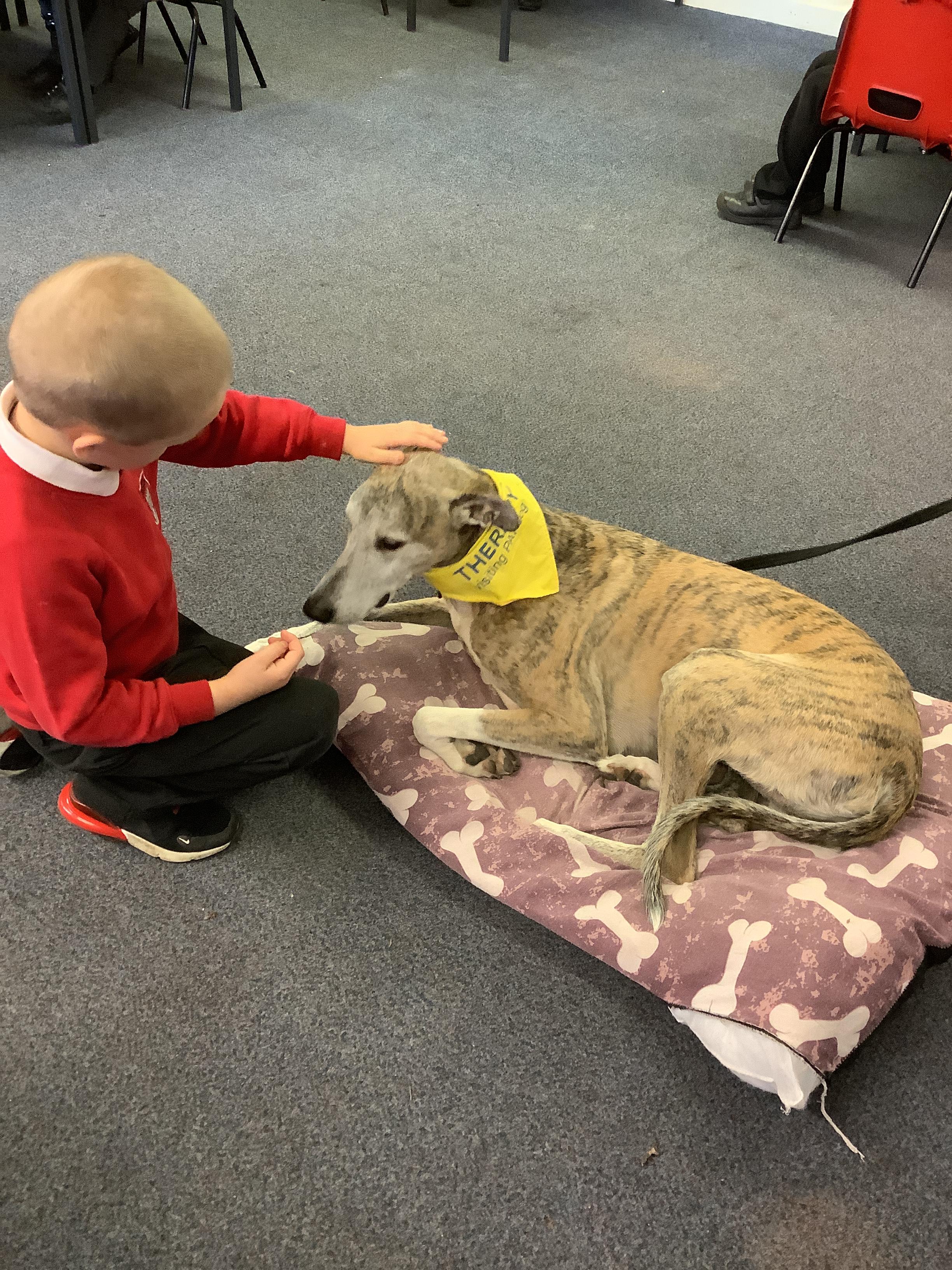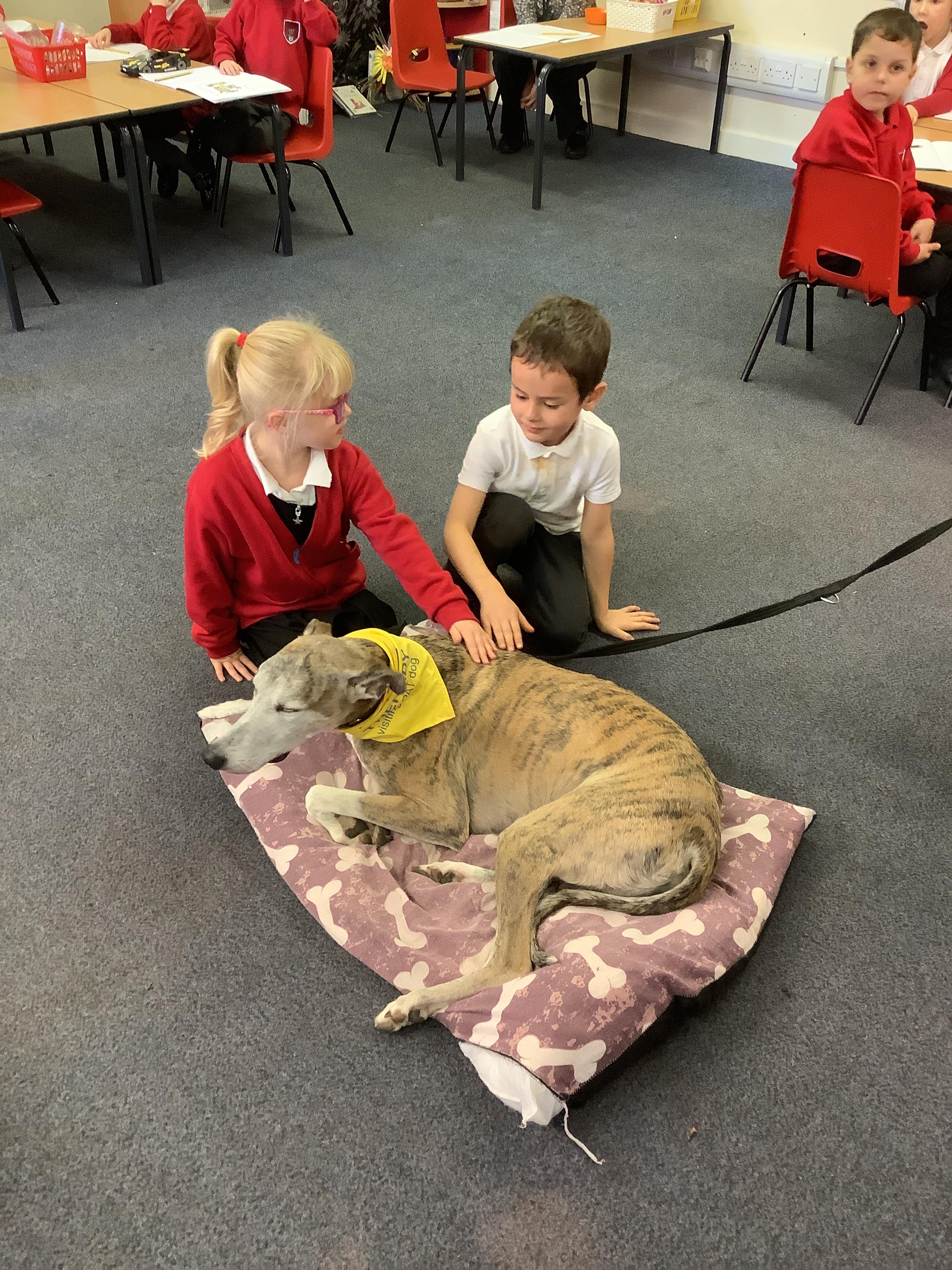 A visit from Axle the reading dog. He will visit every Monday and we will read stories to him.