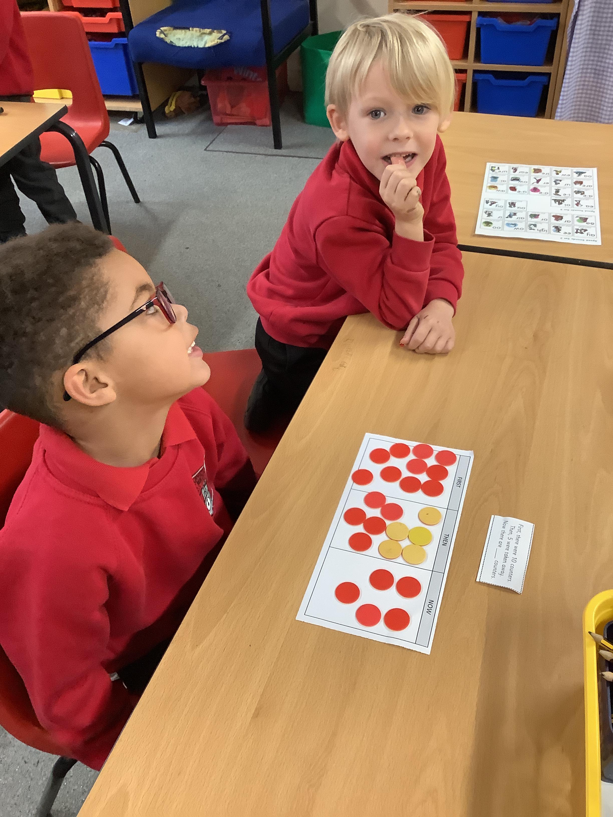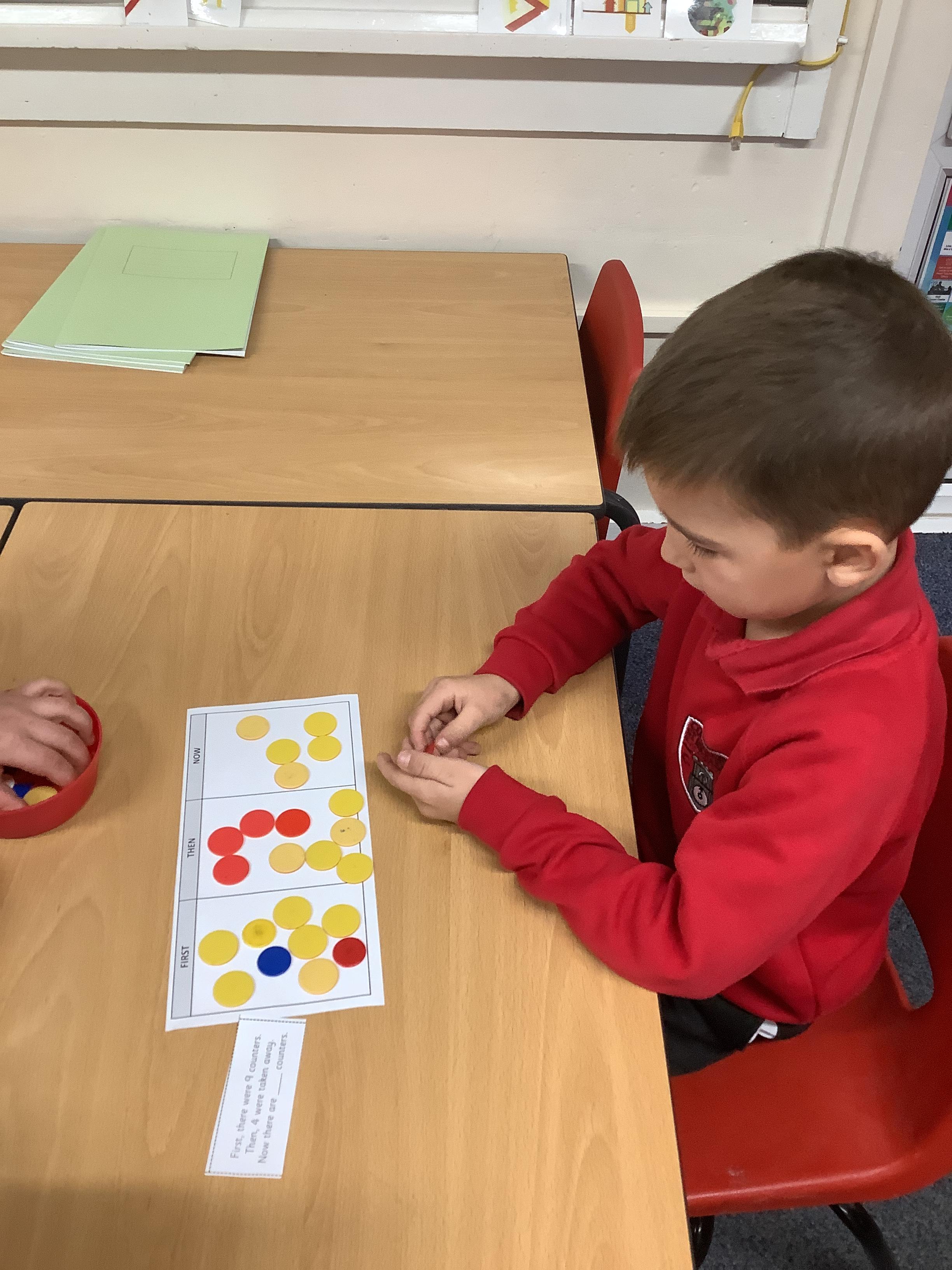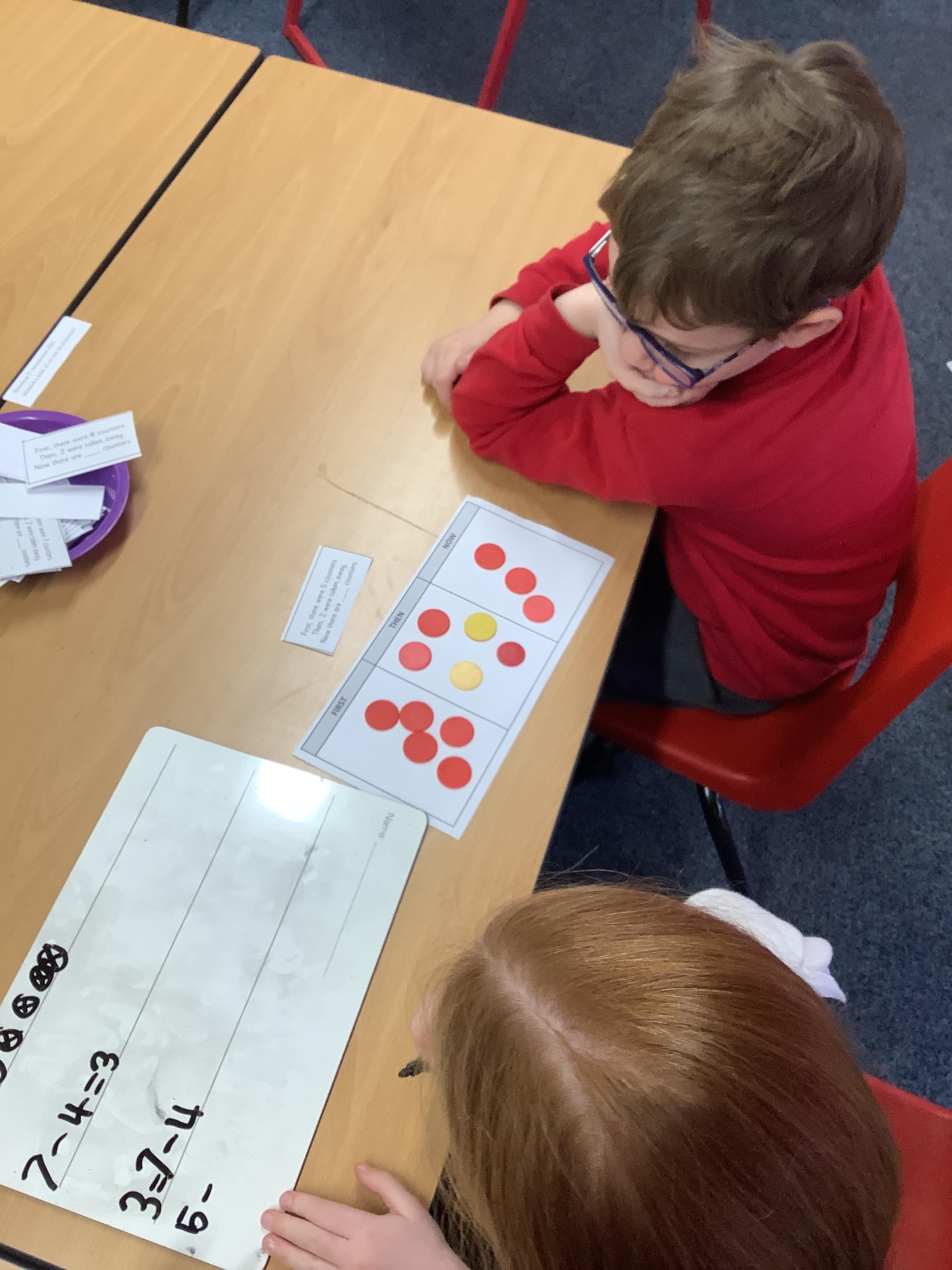 In maths we worked with a partner to subtract. We use a first, then, now board and showed with counters how many we had first, then how many were subtracted and finally what we have now.