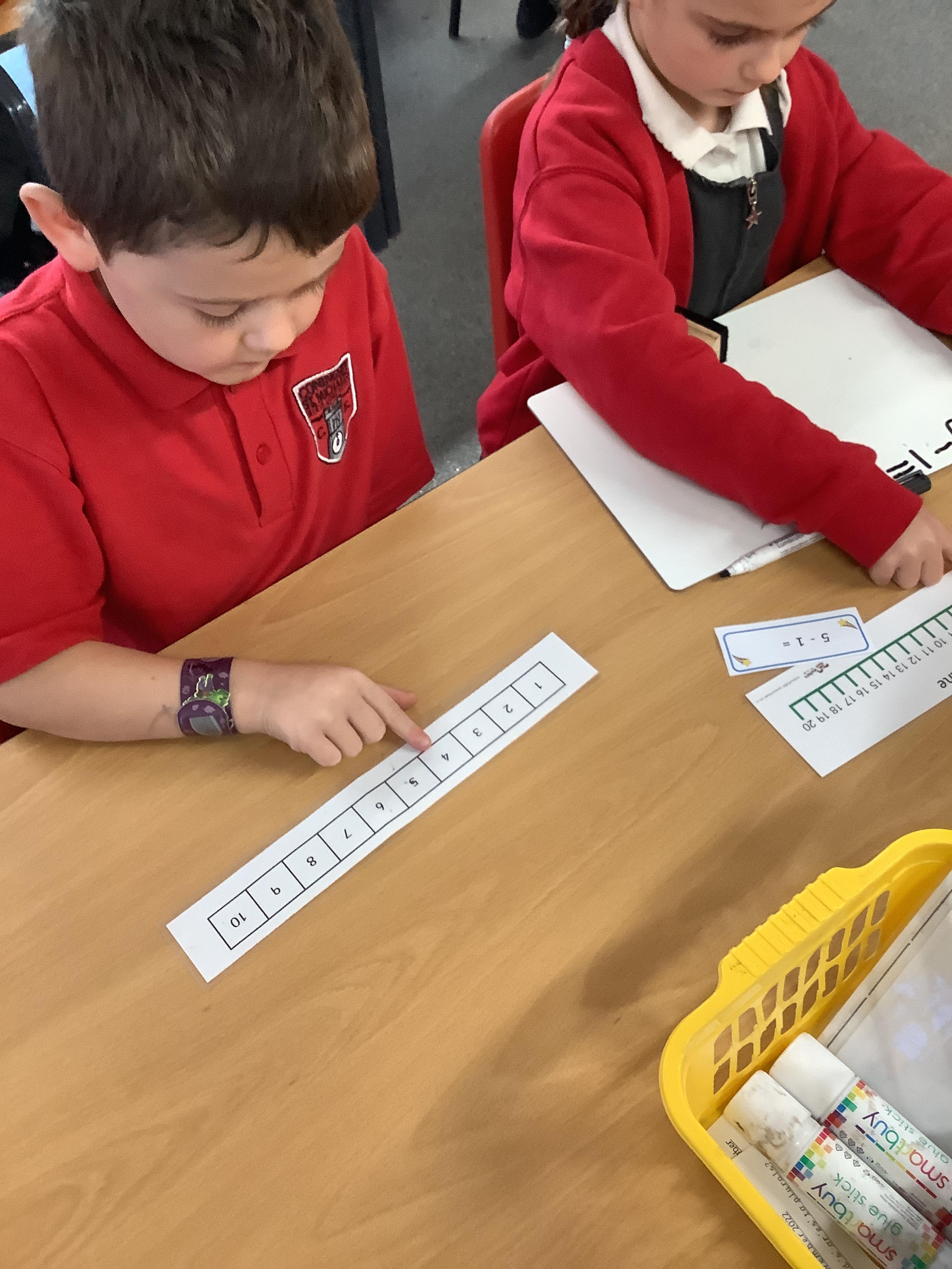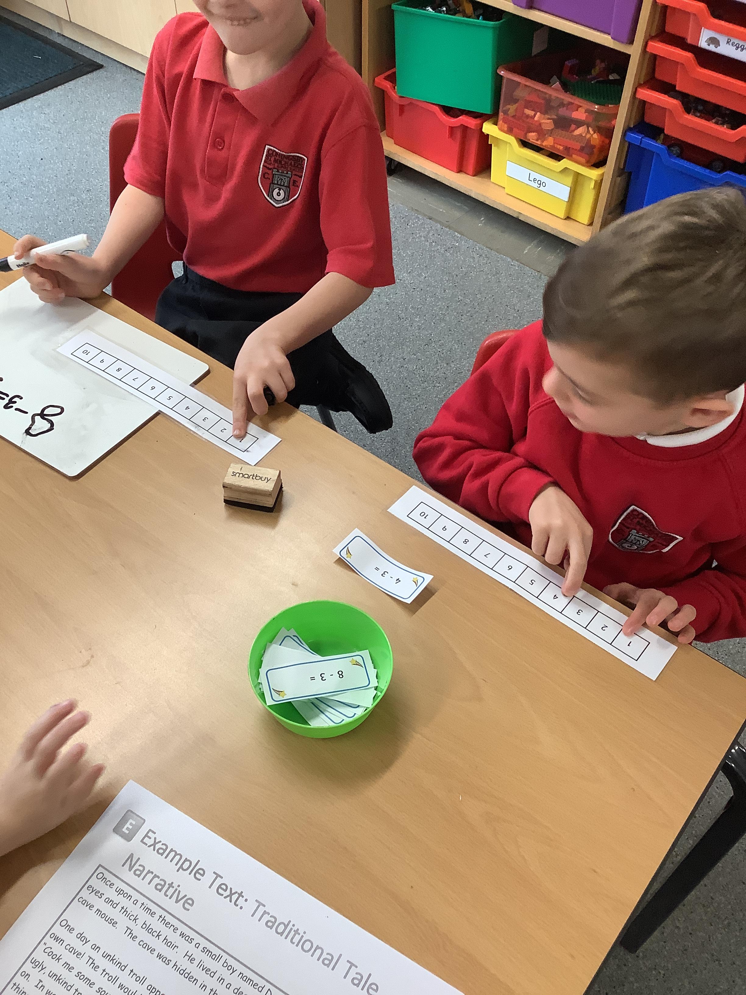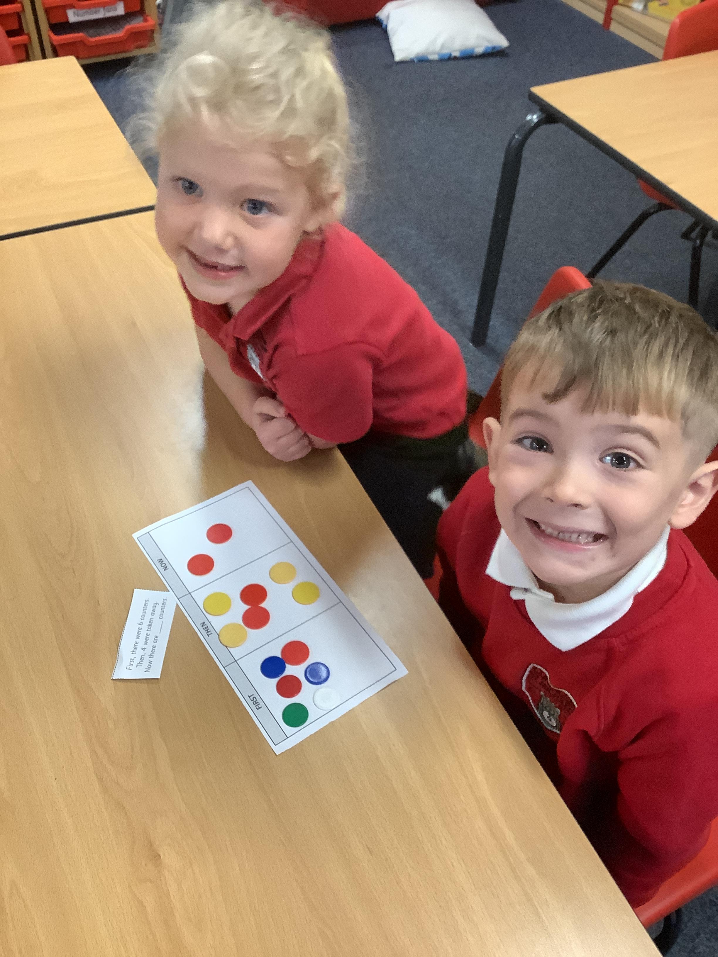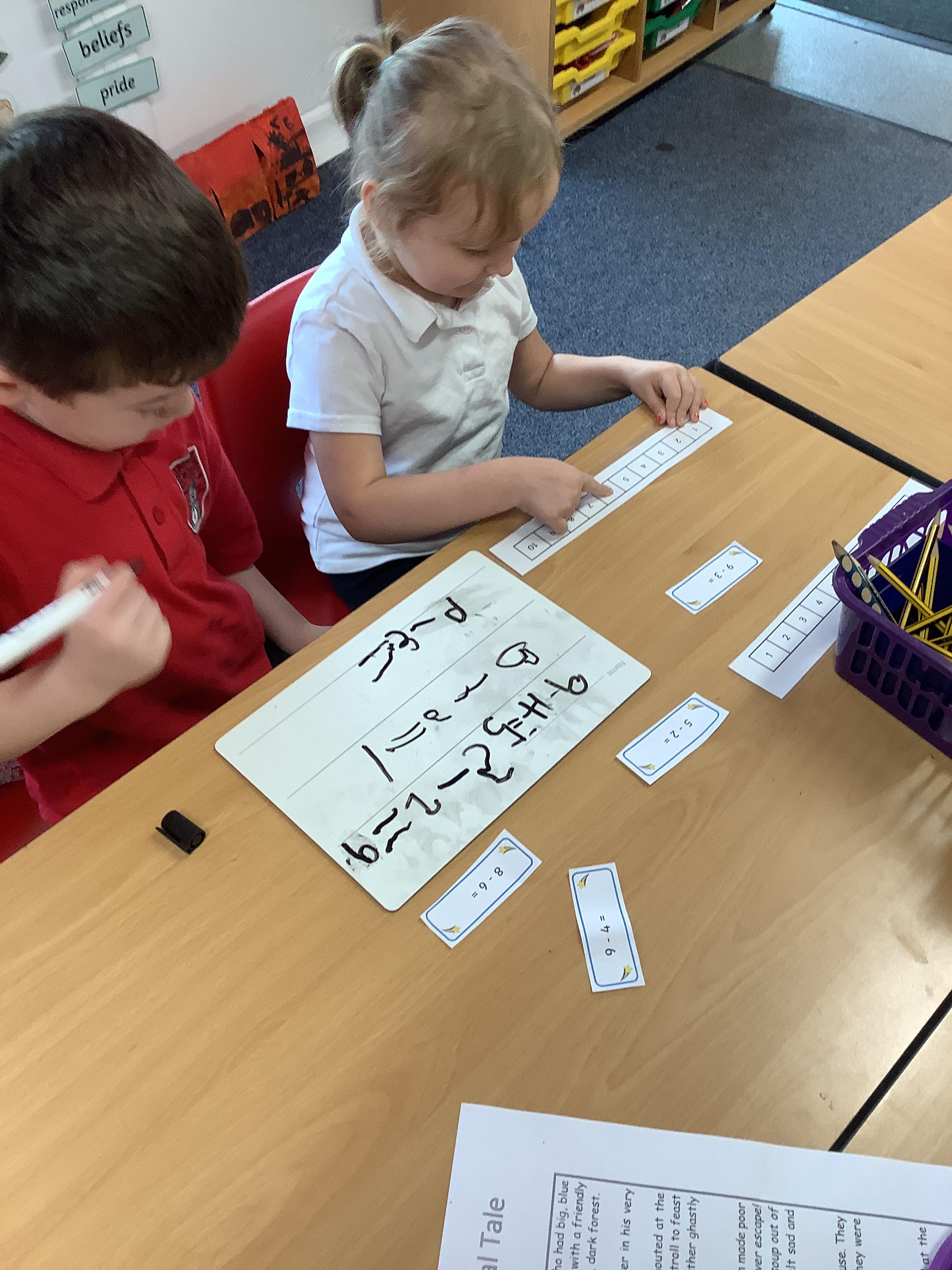 In maths we worked with a partner to subtract. We use a first, then, now board and showed with counters how many we had first, then how many were subtracted and finally what we have now.
