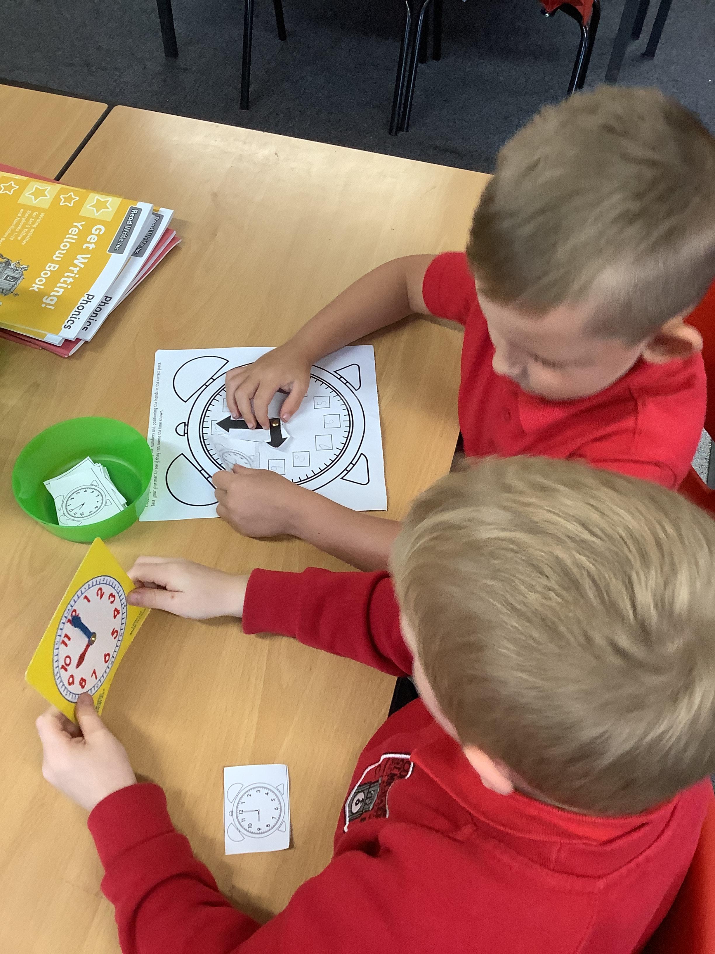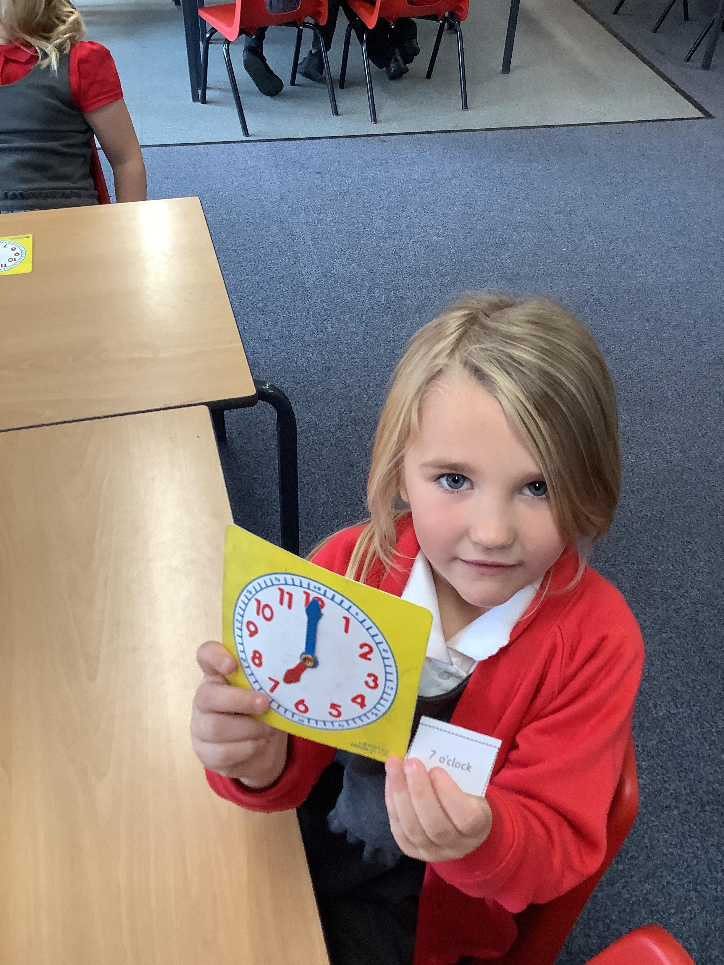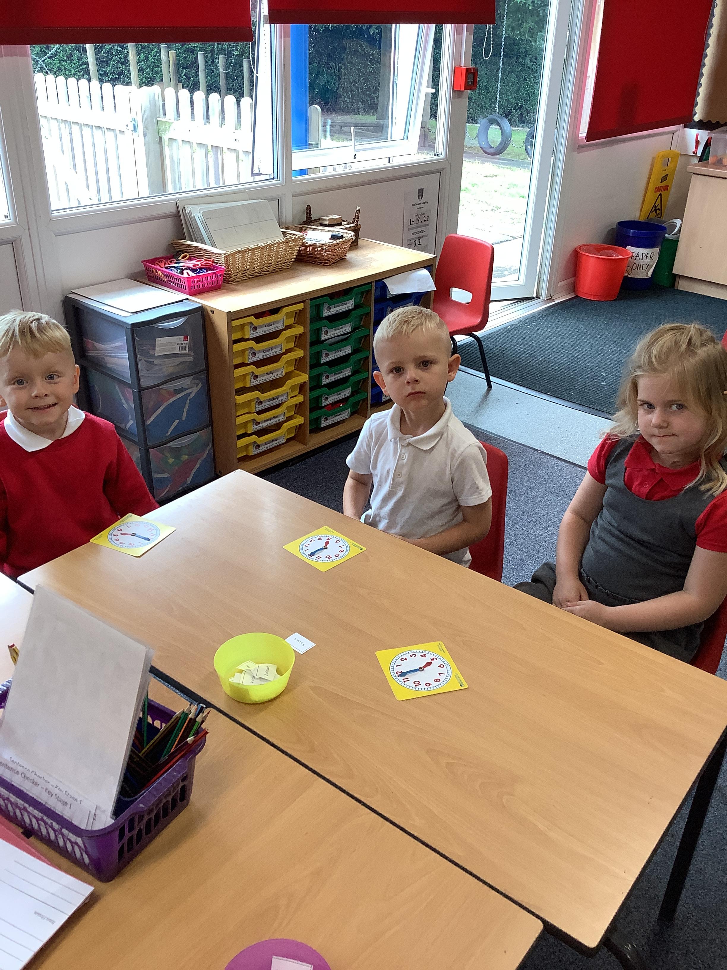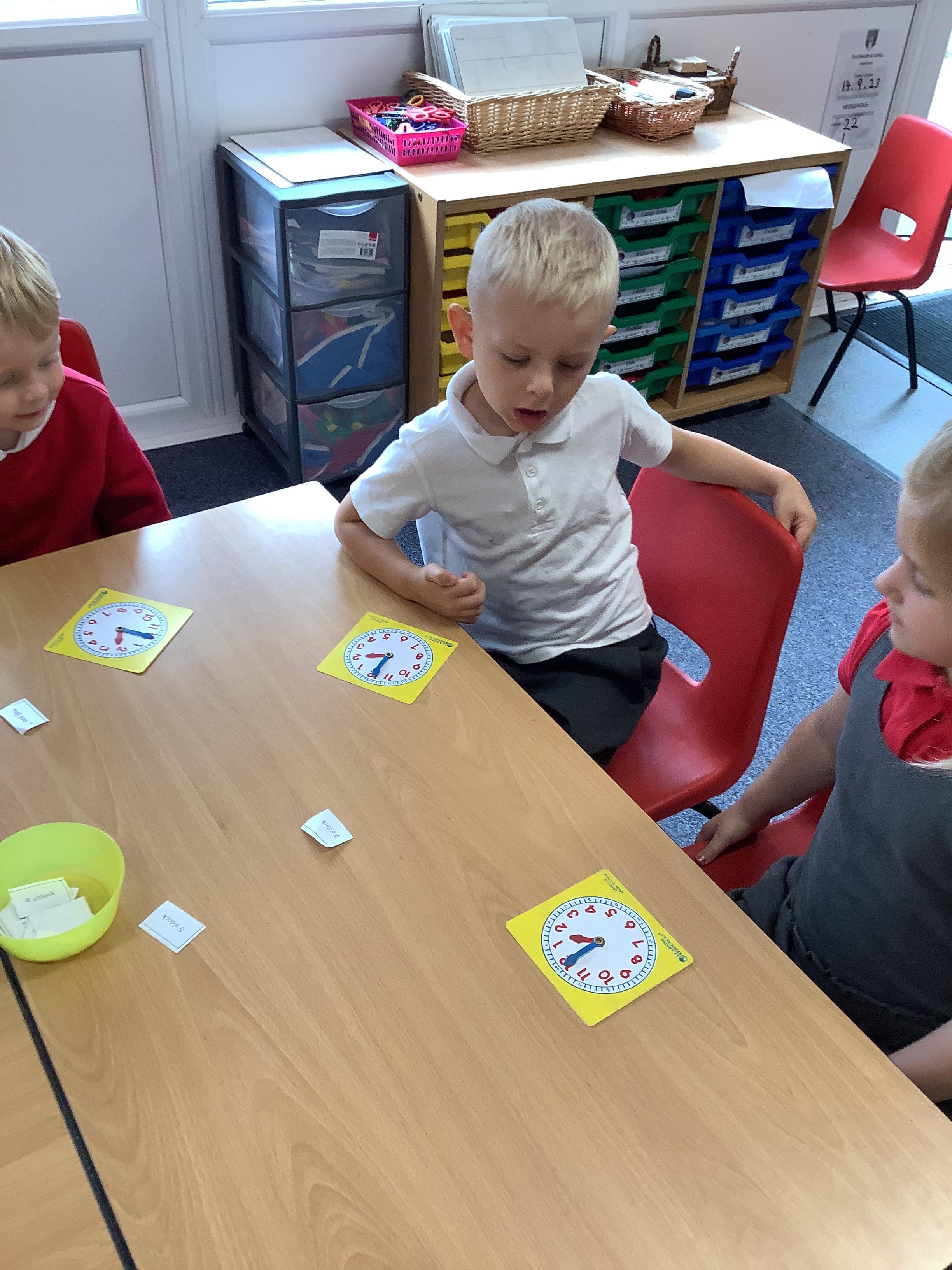 In Maths we have been learning how to tell the time. Here are our Year 1 children practising telling the time to O'clock.