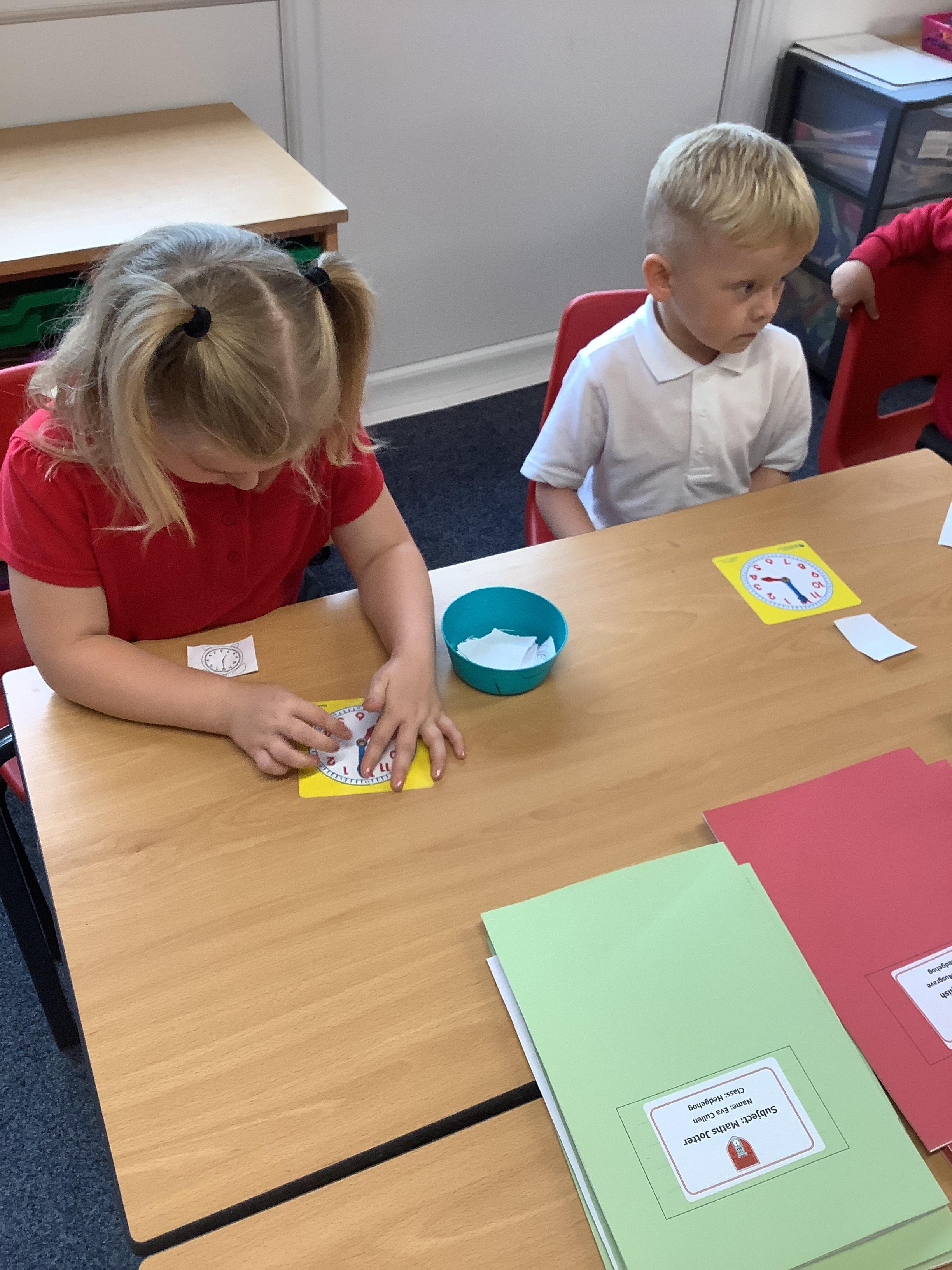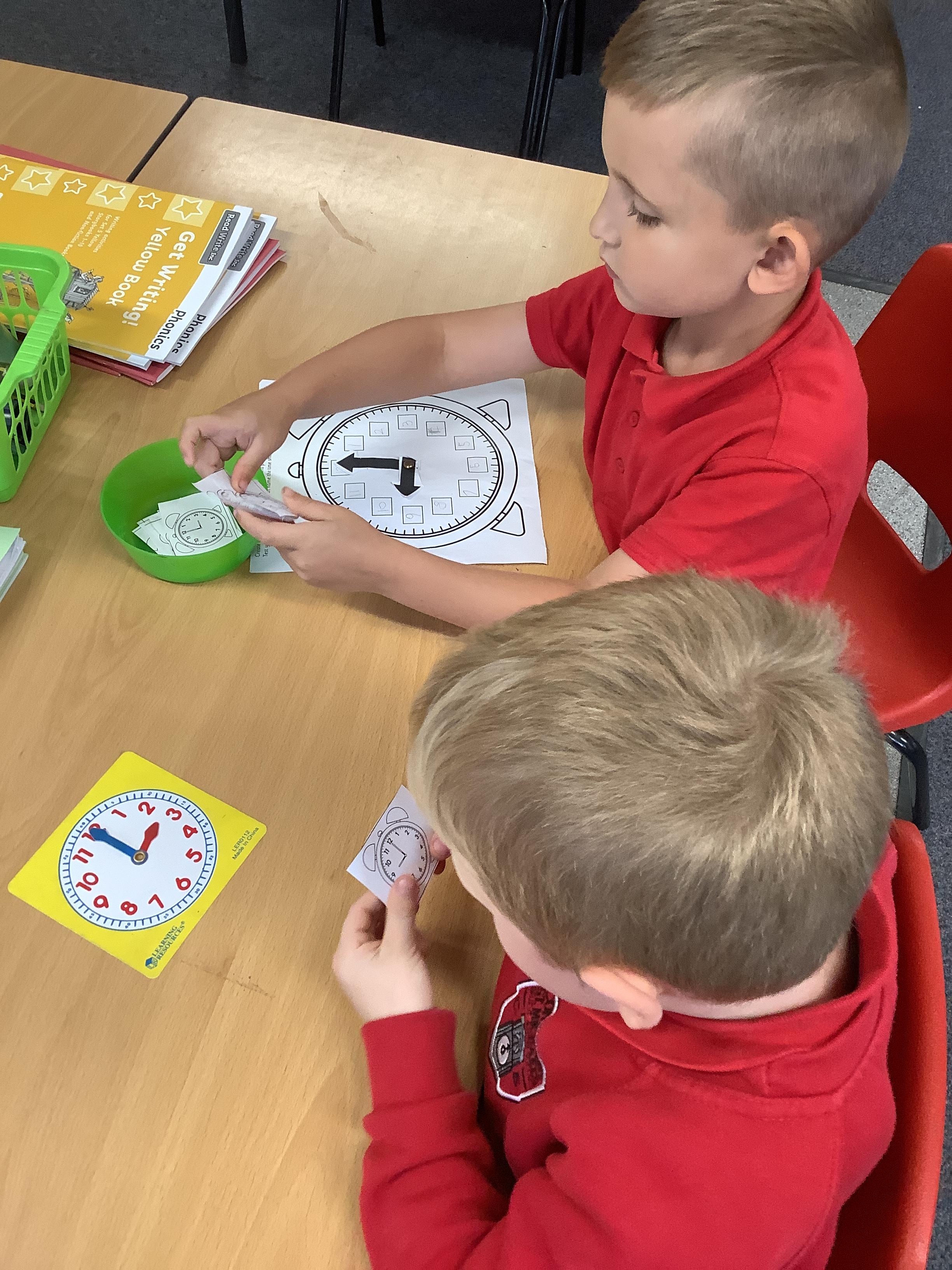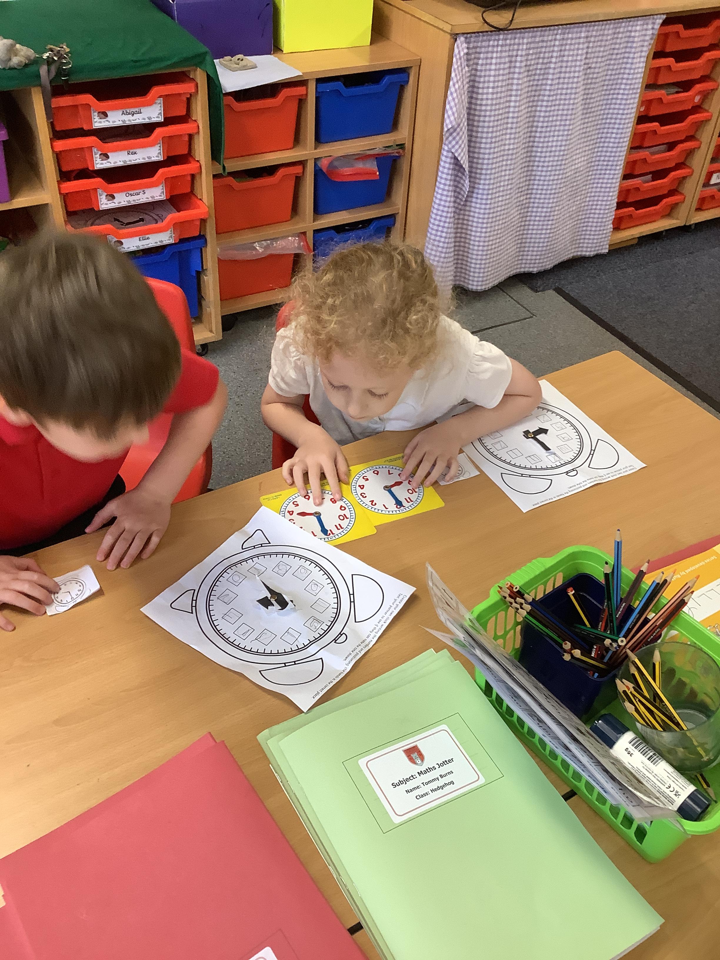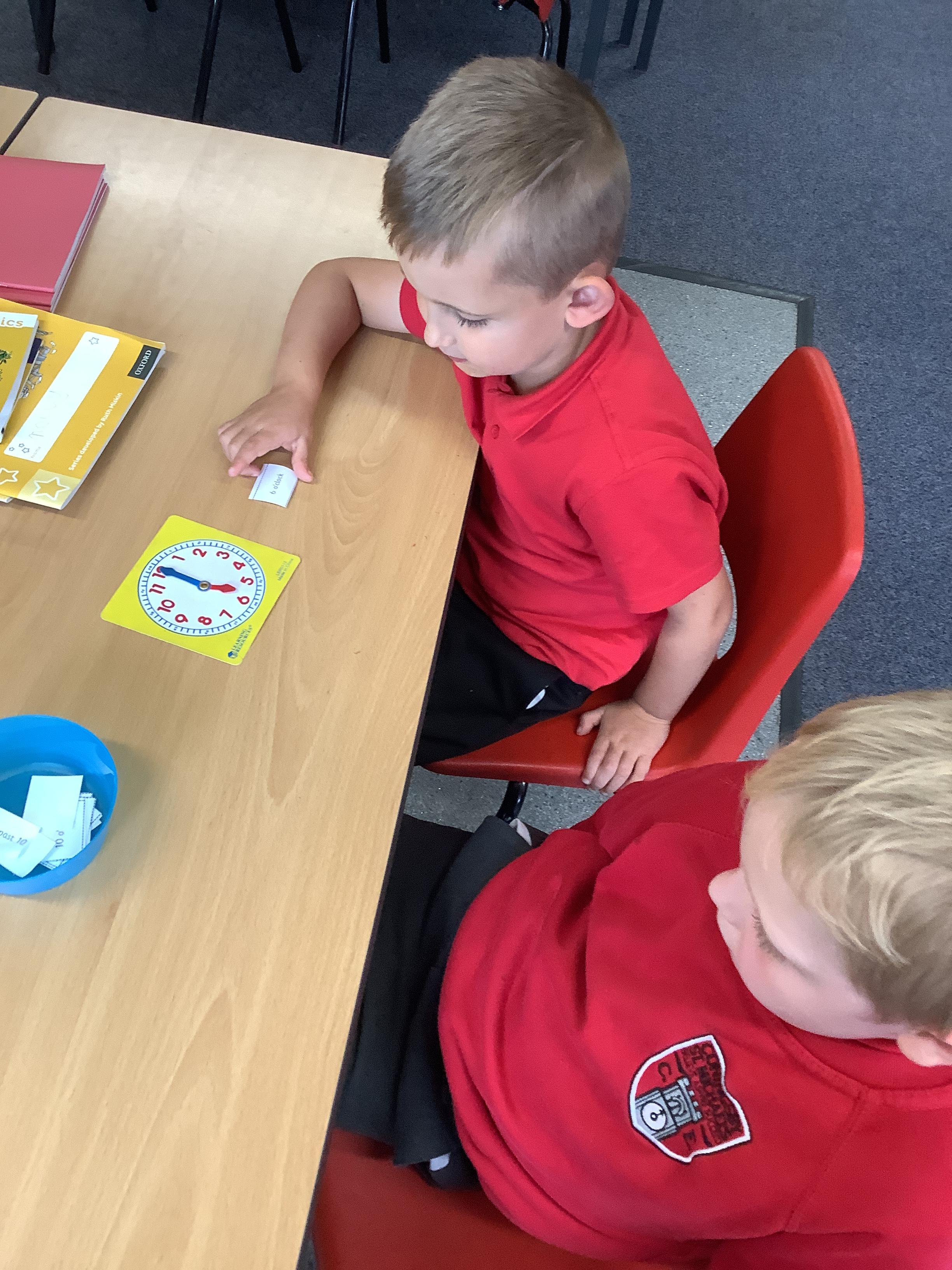 In Maths we have been learning how to tell the time. Here are our Year 1 children practising telling the time to O'clock.