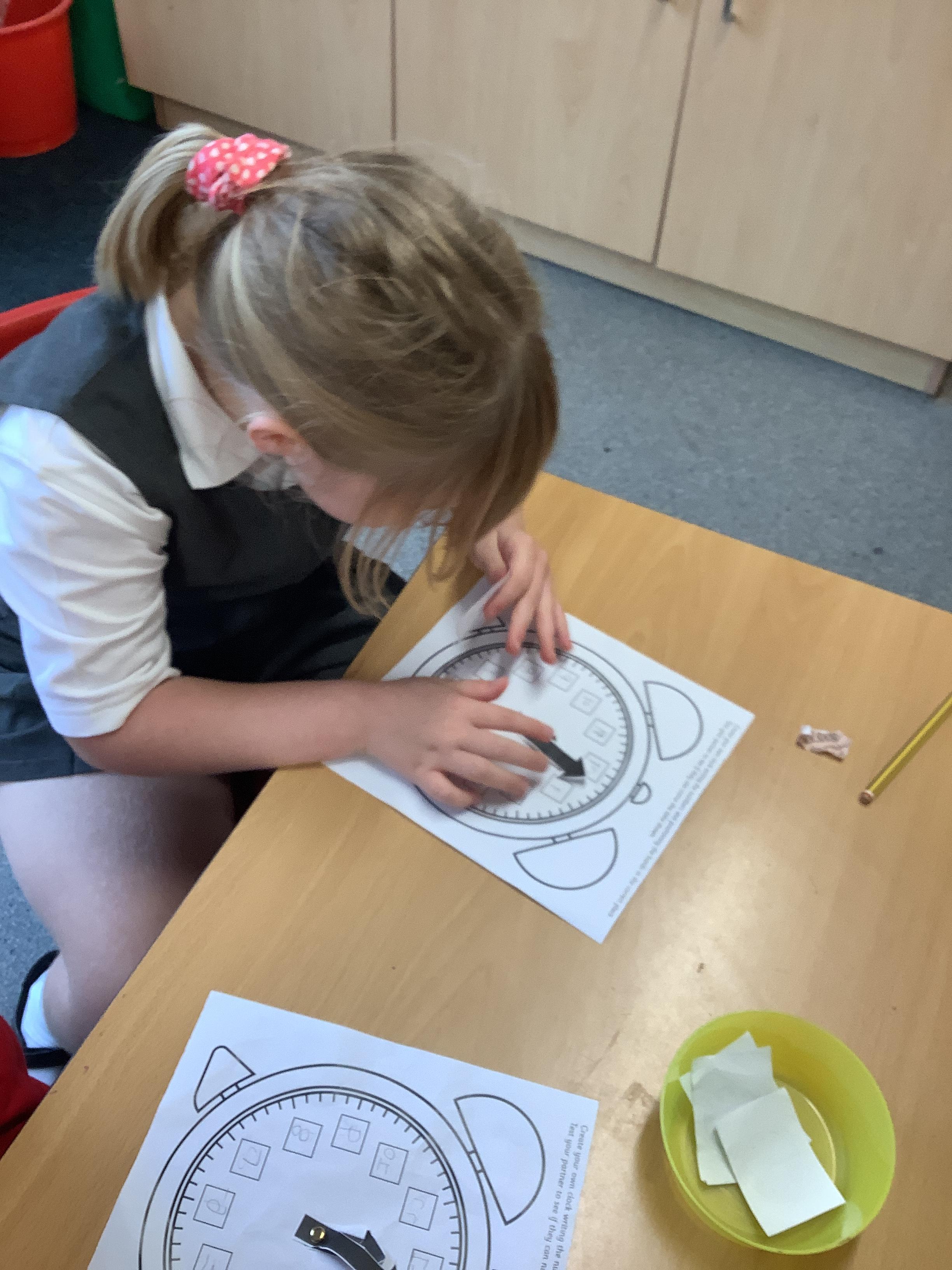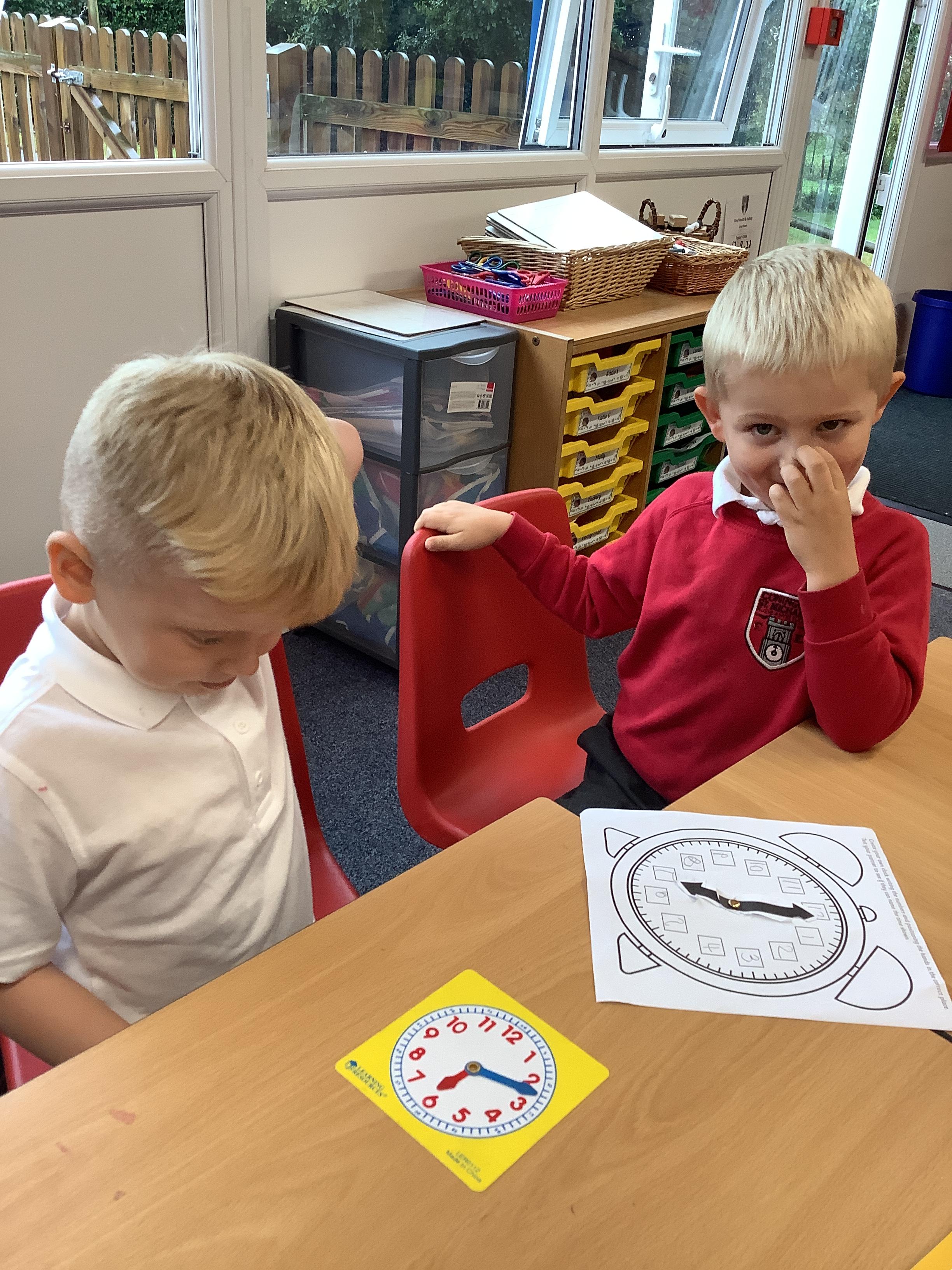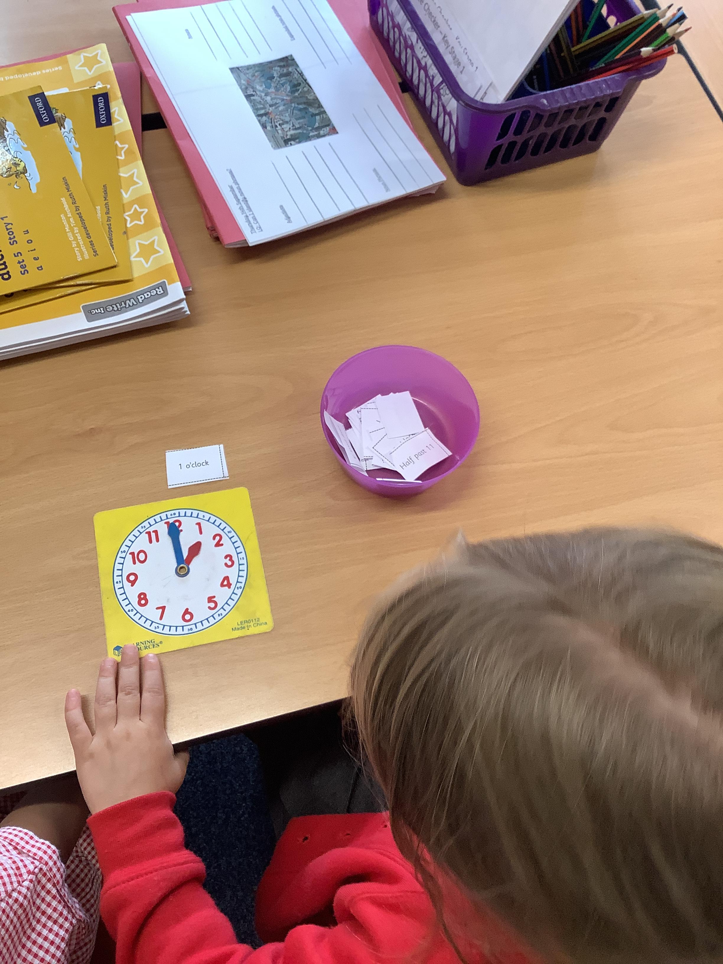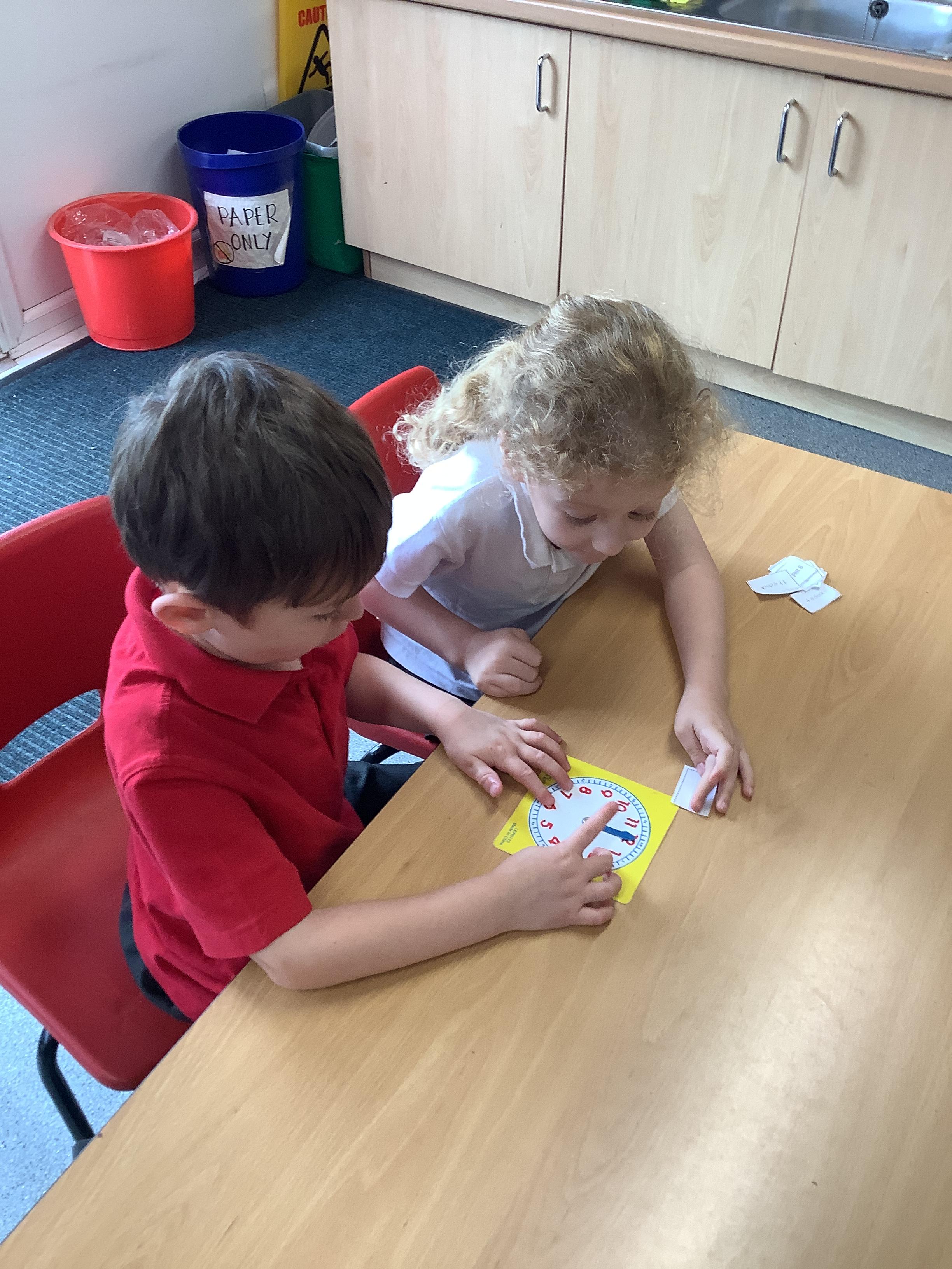 In Maths we have been learning how to tell the time. Here are our Year 1 children practising telling the time to O'clock.