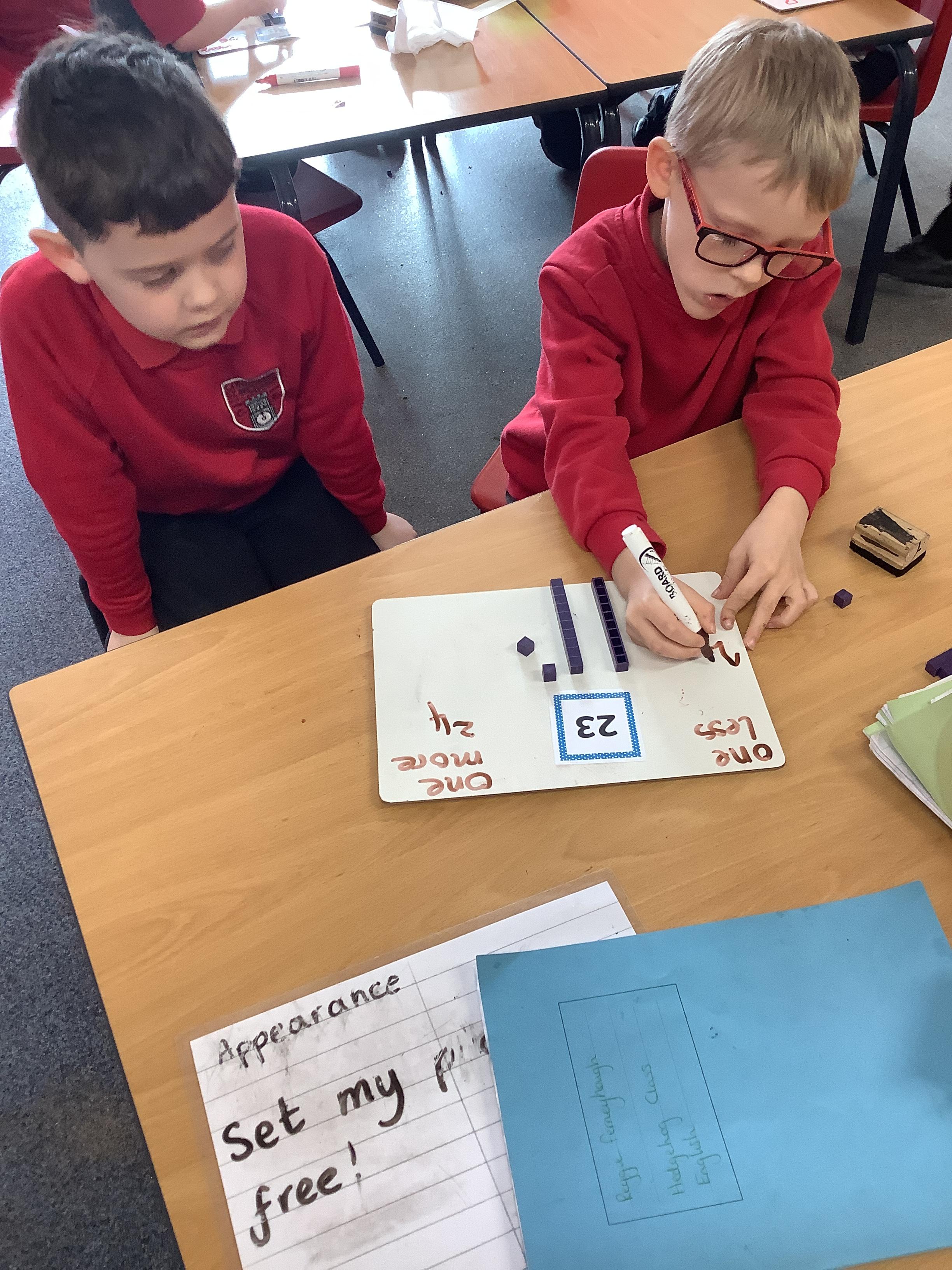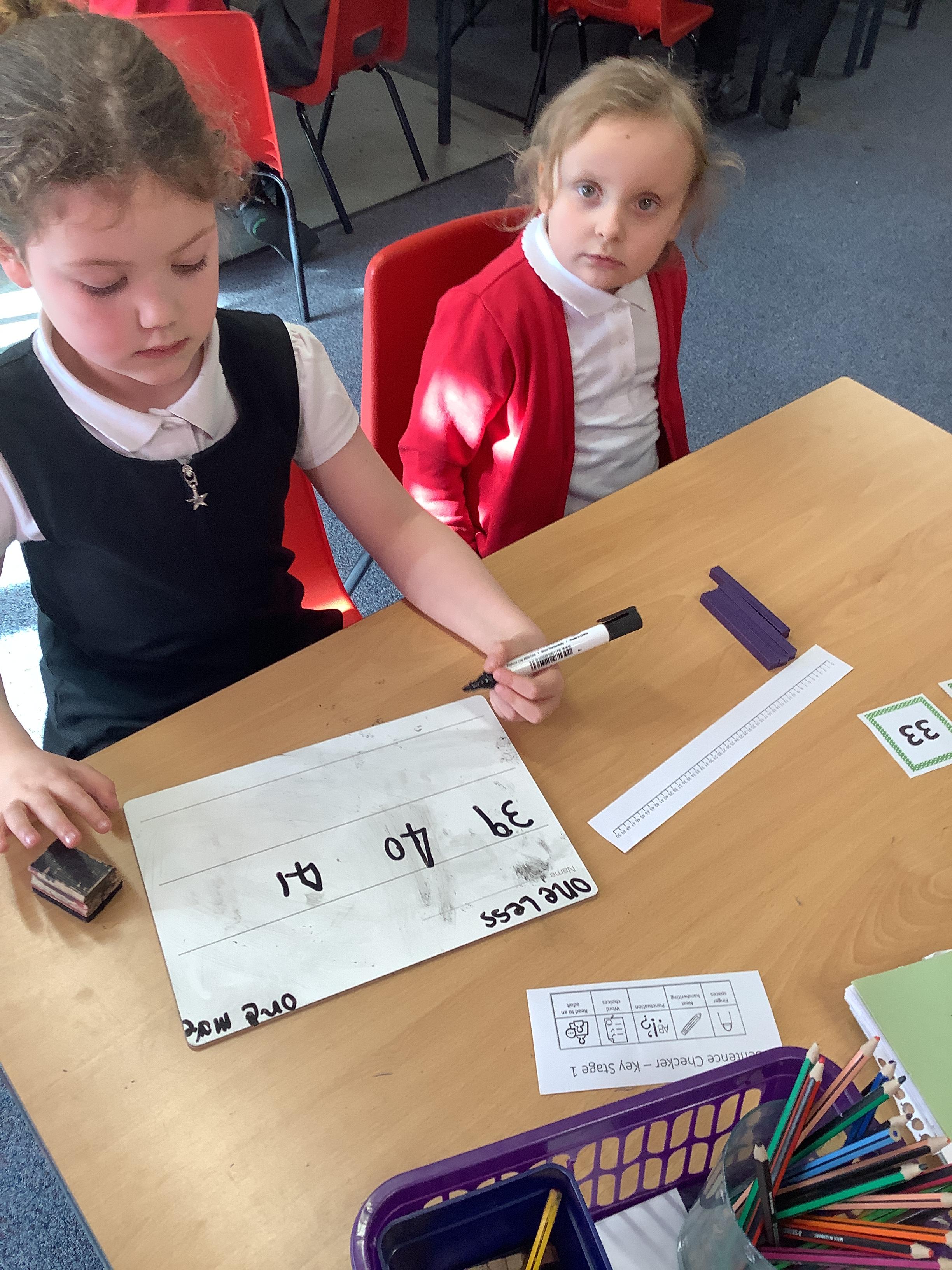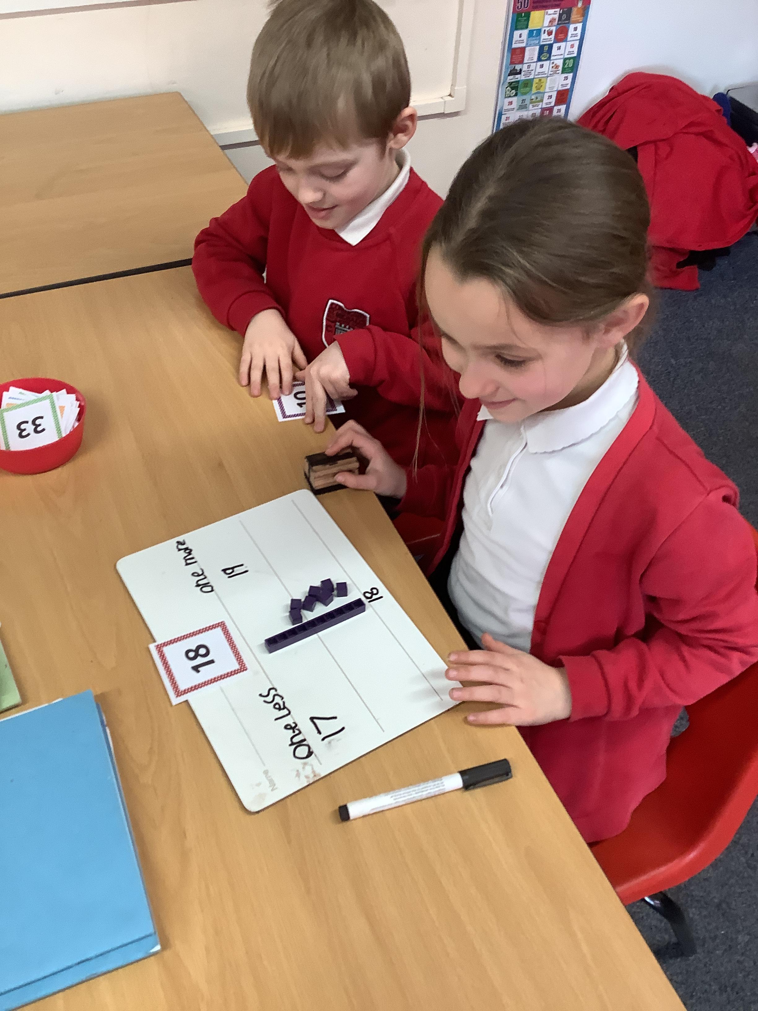 In Maths we were finding one more and one less. We picked a number card and then built that number with tens and ones. We added one more and then took one away to find one less.