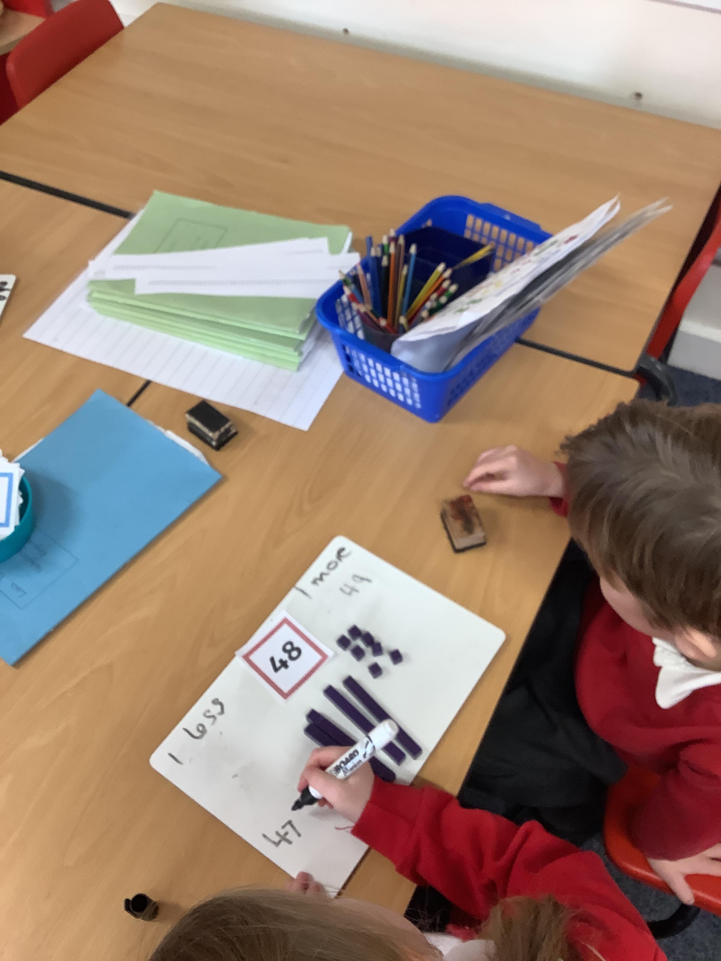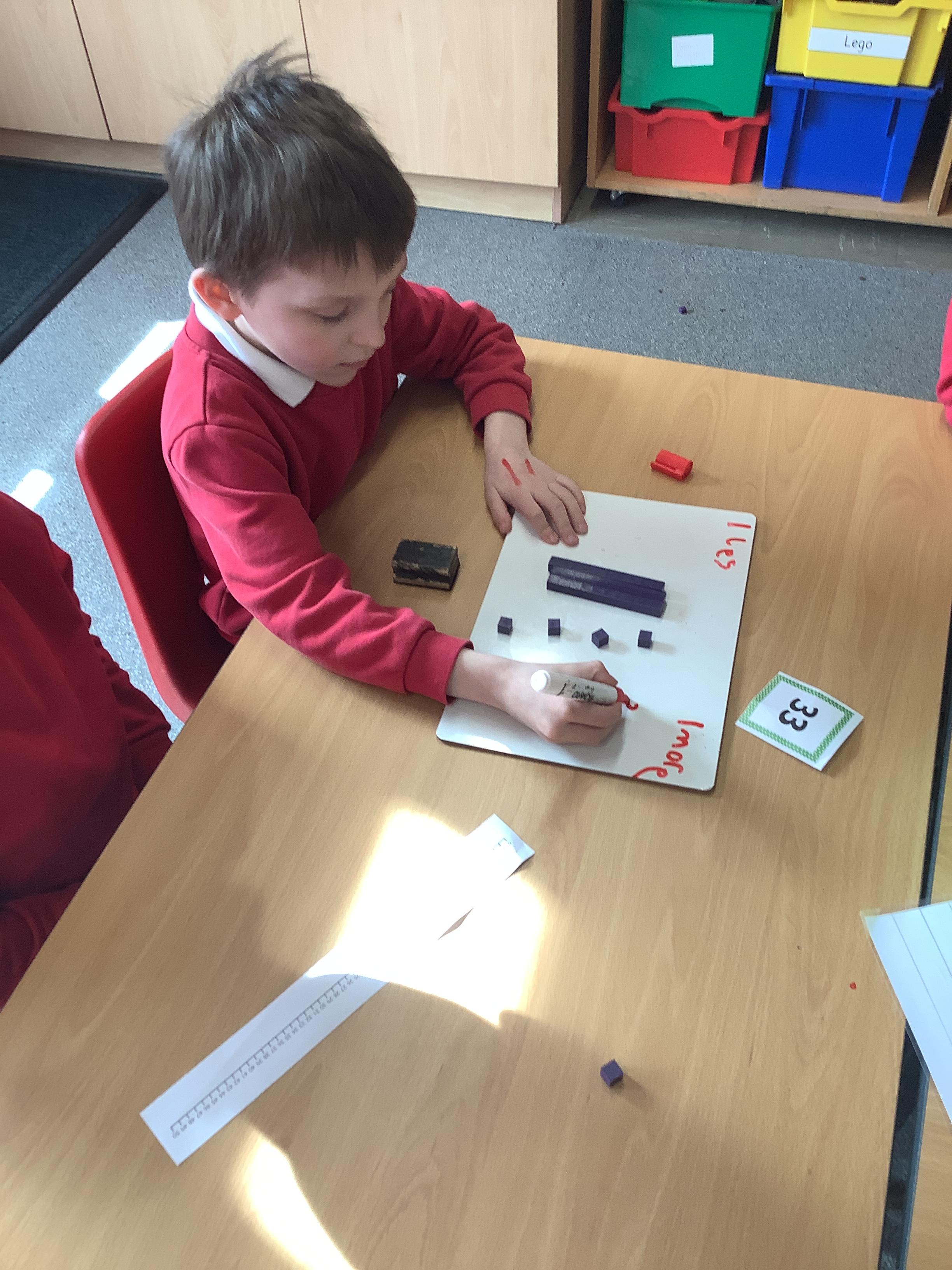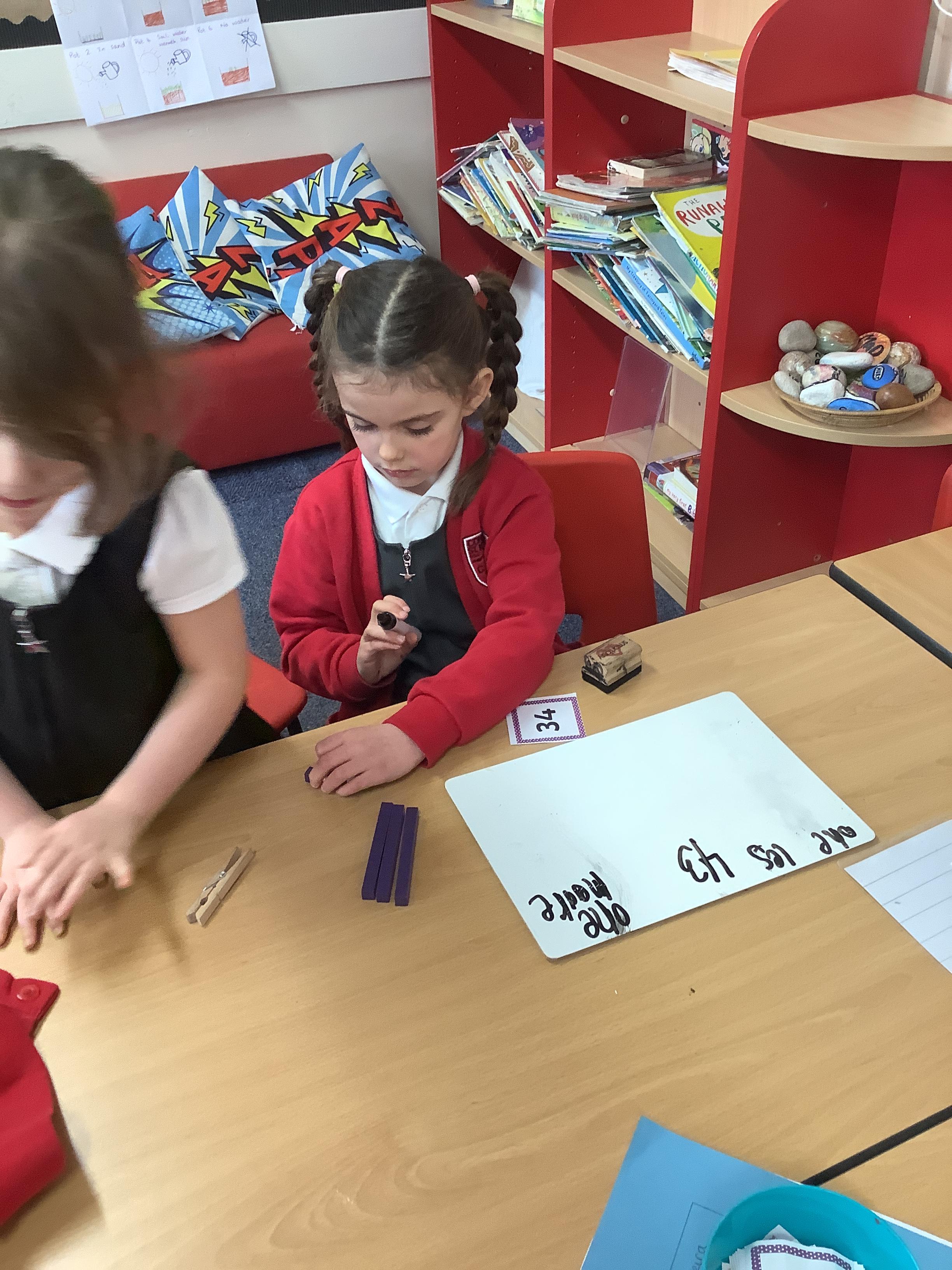 In Maths we were finding one more and one less. We picked a number card and then built that number with tens and ones. We added one more and then took one away to find one less.