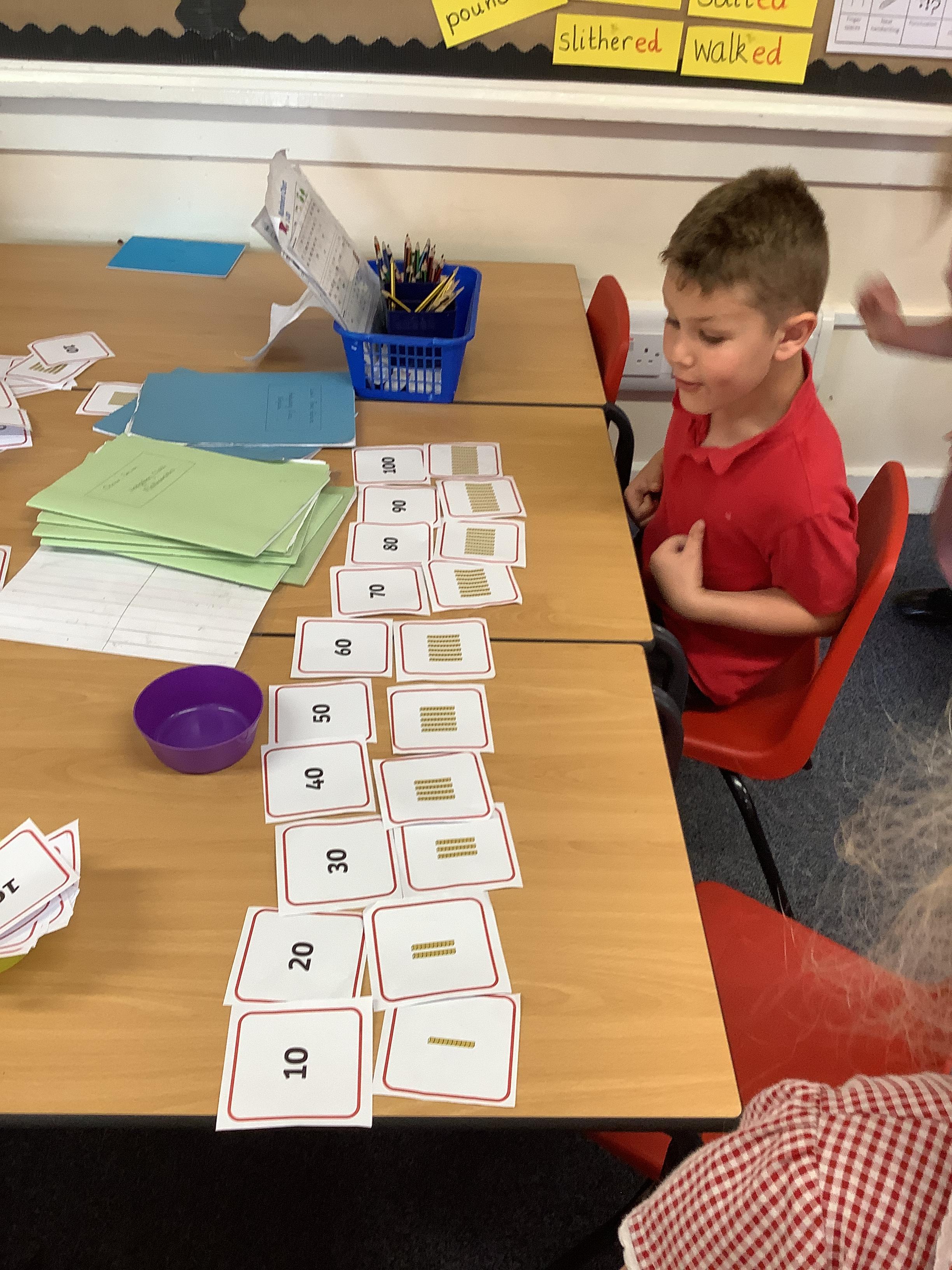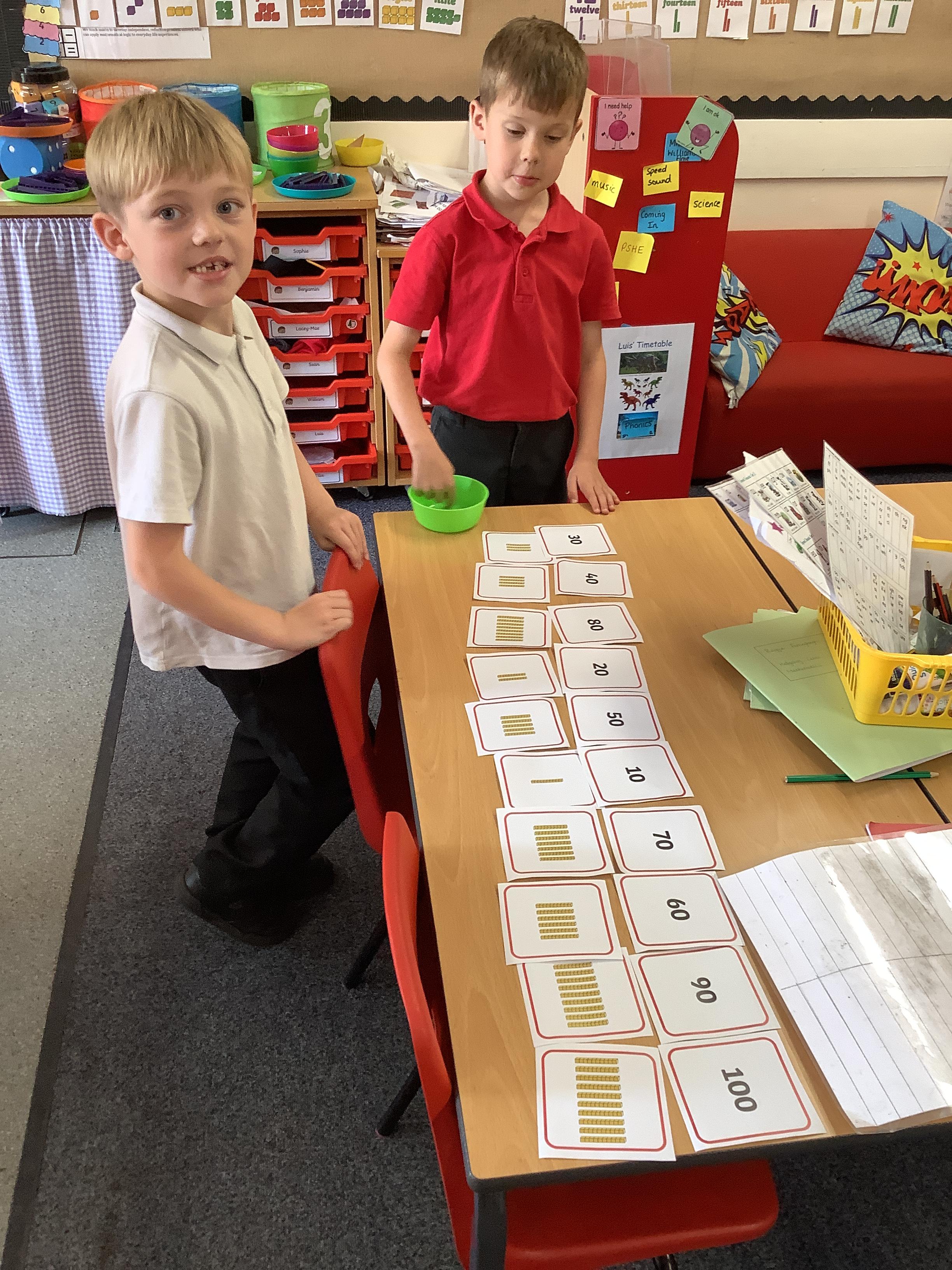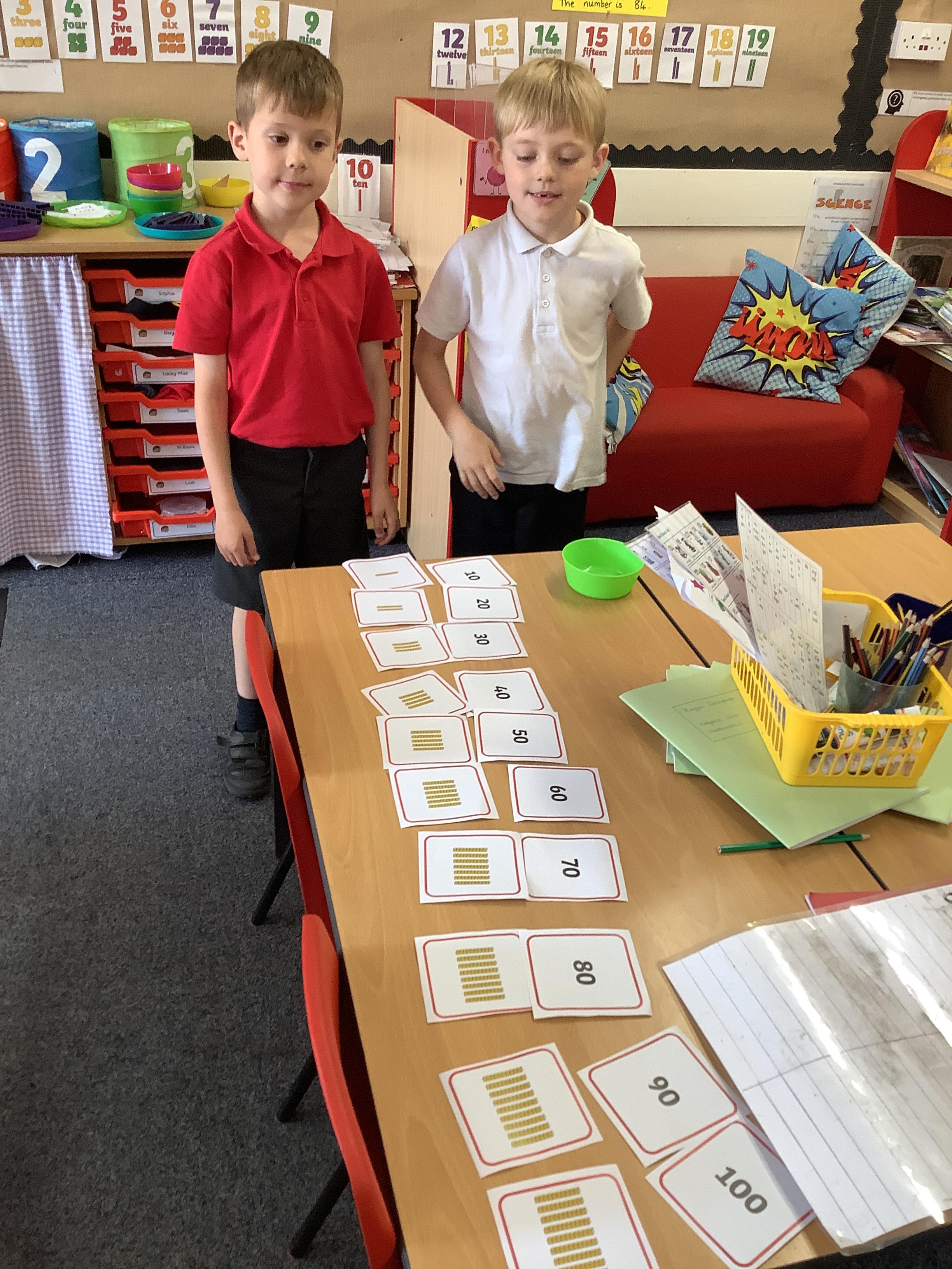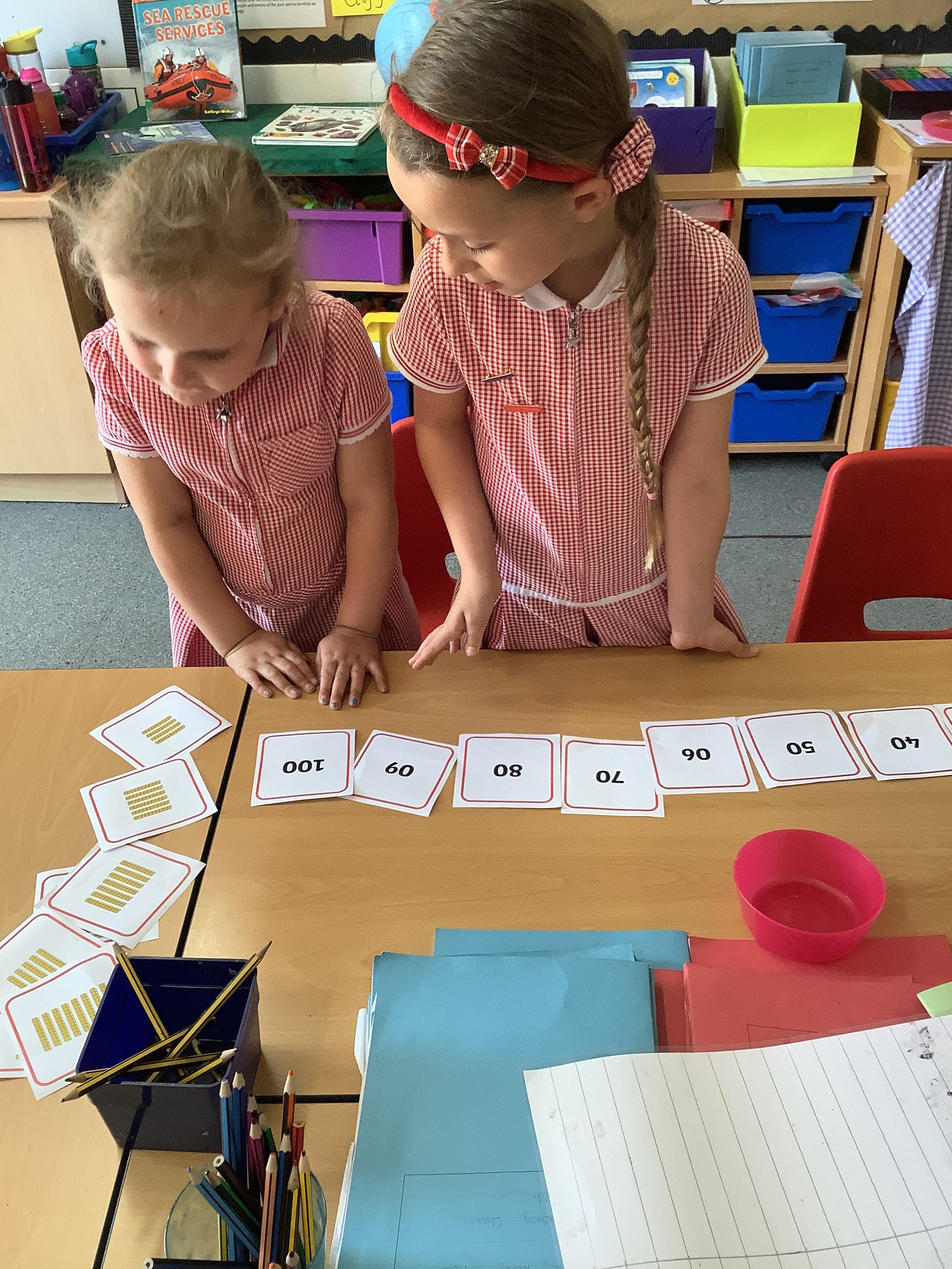 In maths we looked at multiples of ten. We had to order the numerals and find the matching representation. We then set challenges for our friends making them count forwards or backwards from any of the numbers.