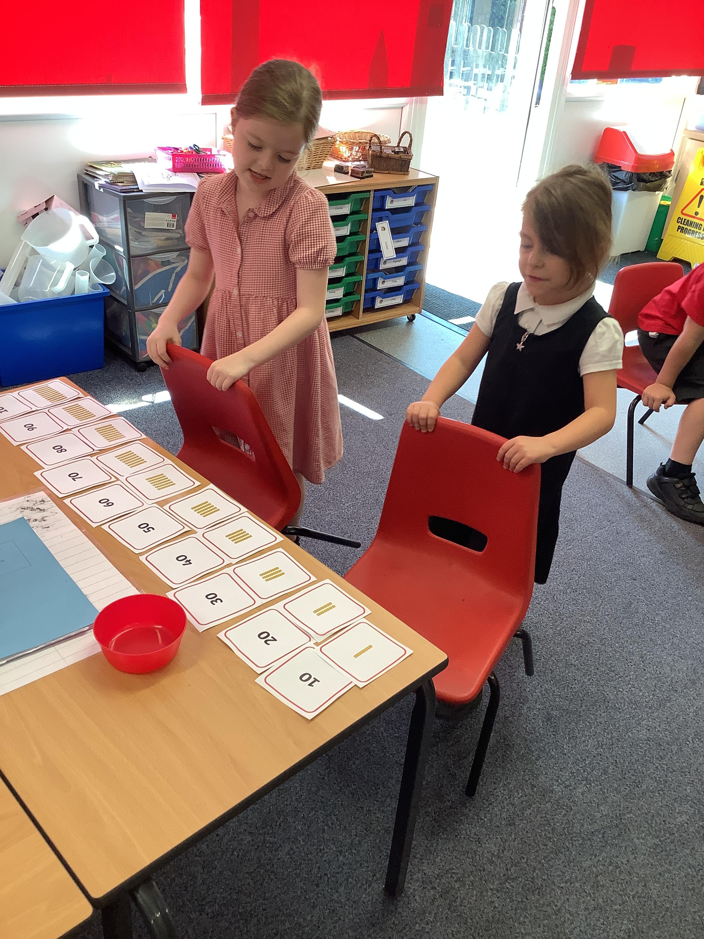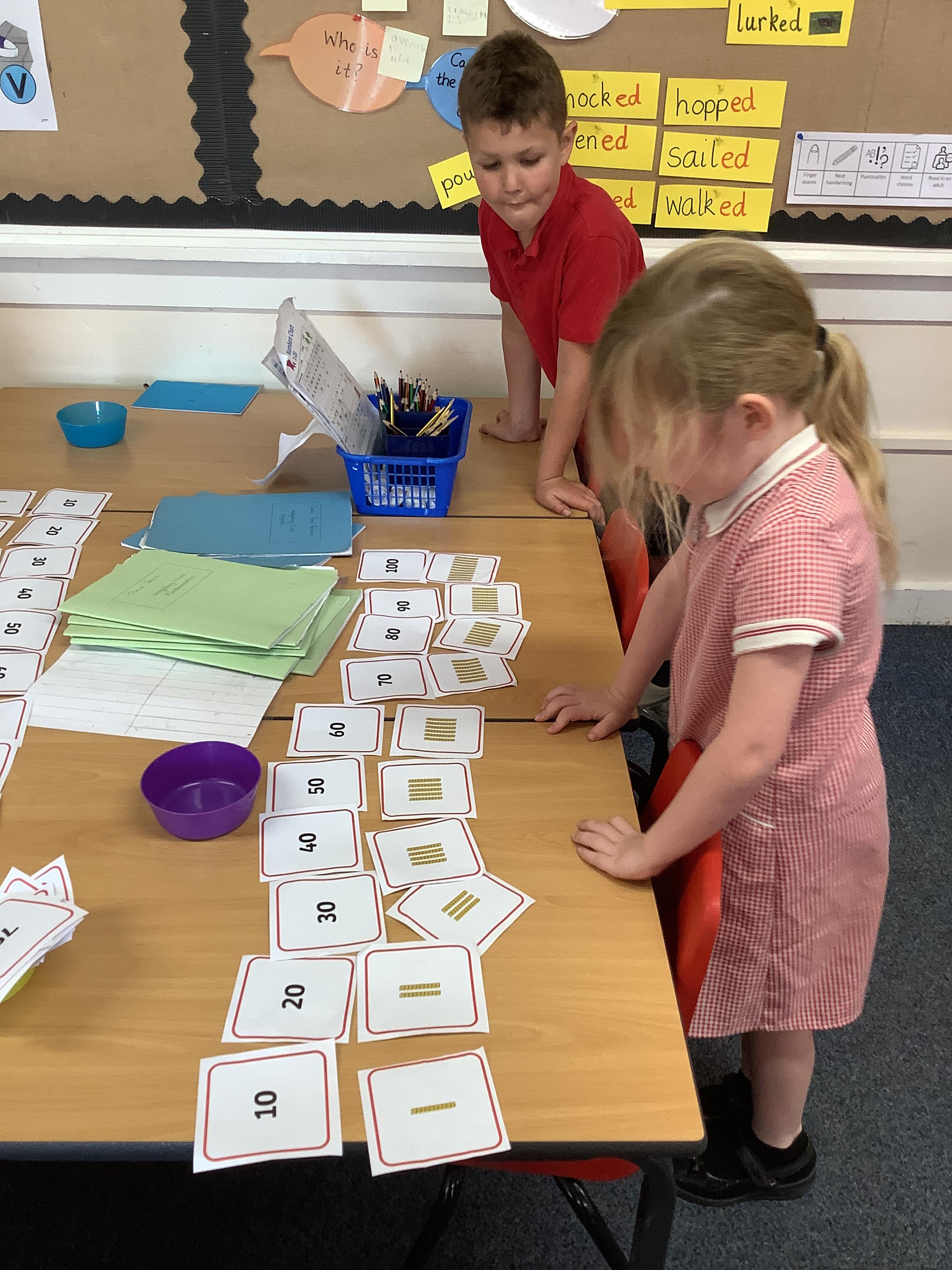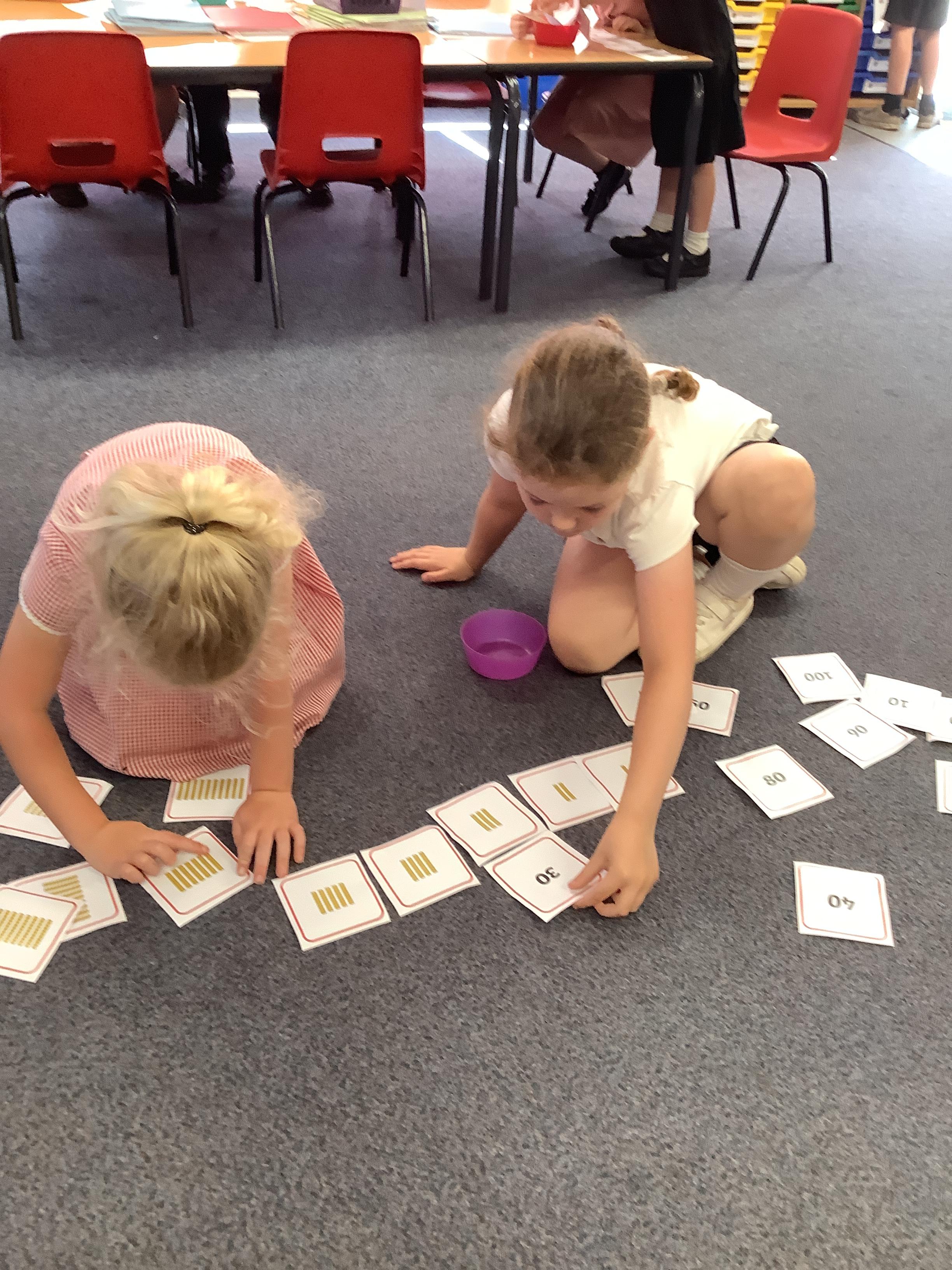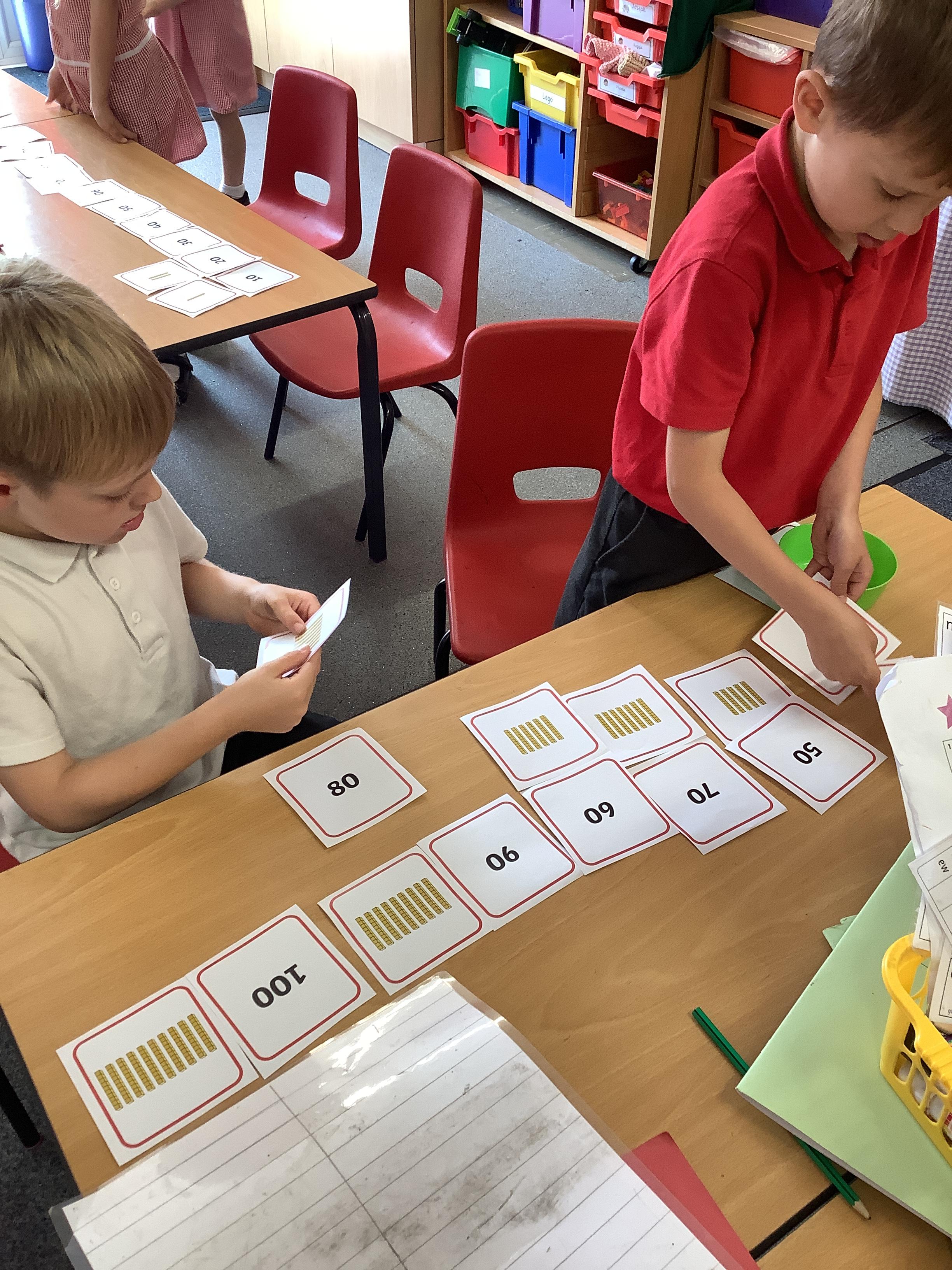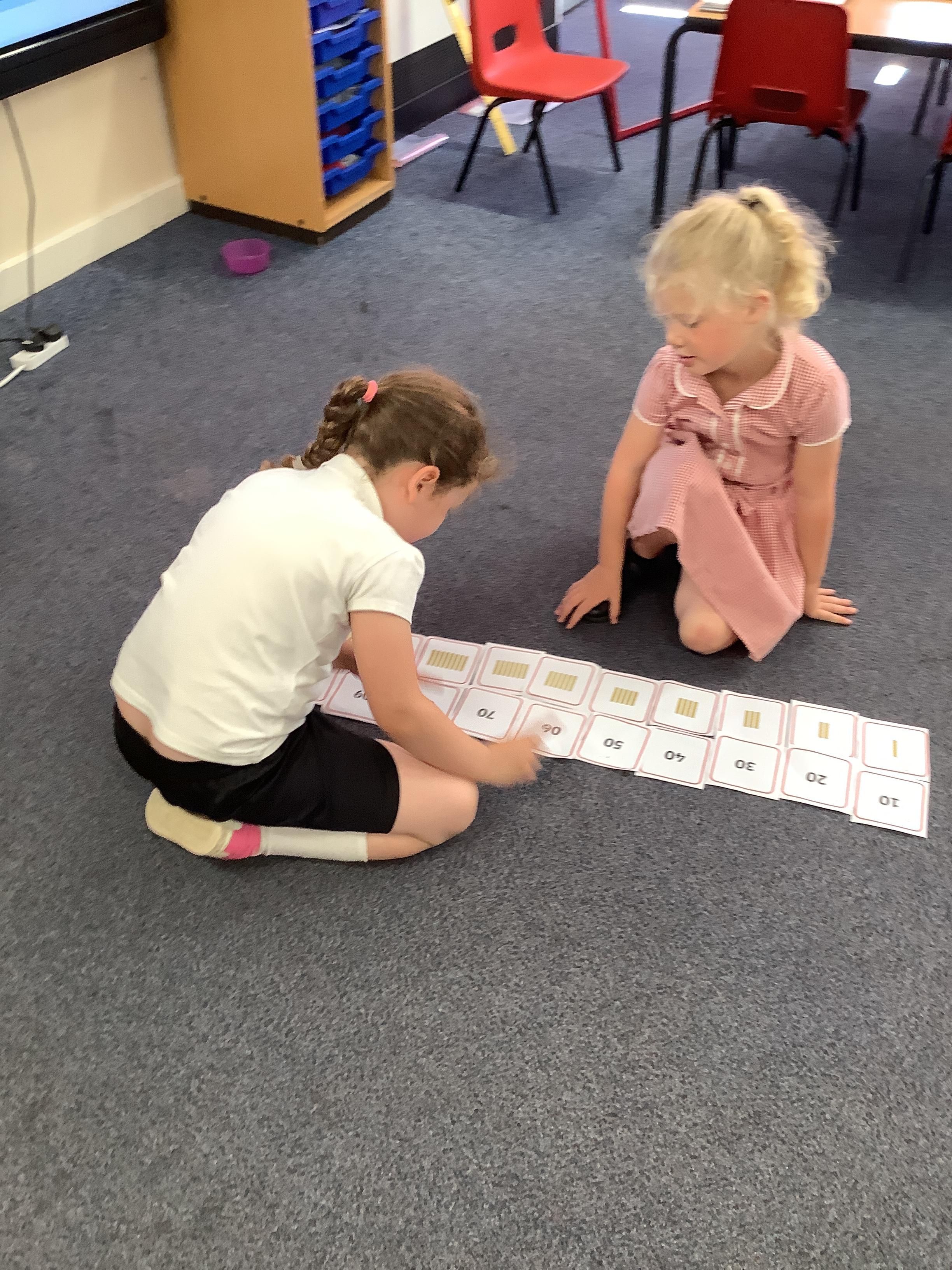 In maths we looked at multiples of ten. We had to order the numerals and find the matching representation. We then set challenges for our friends making them count forwards or backwards from any of the numbers.