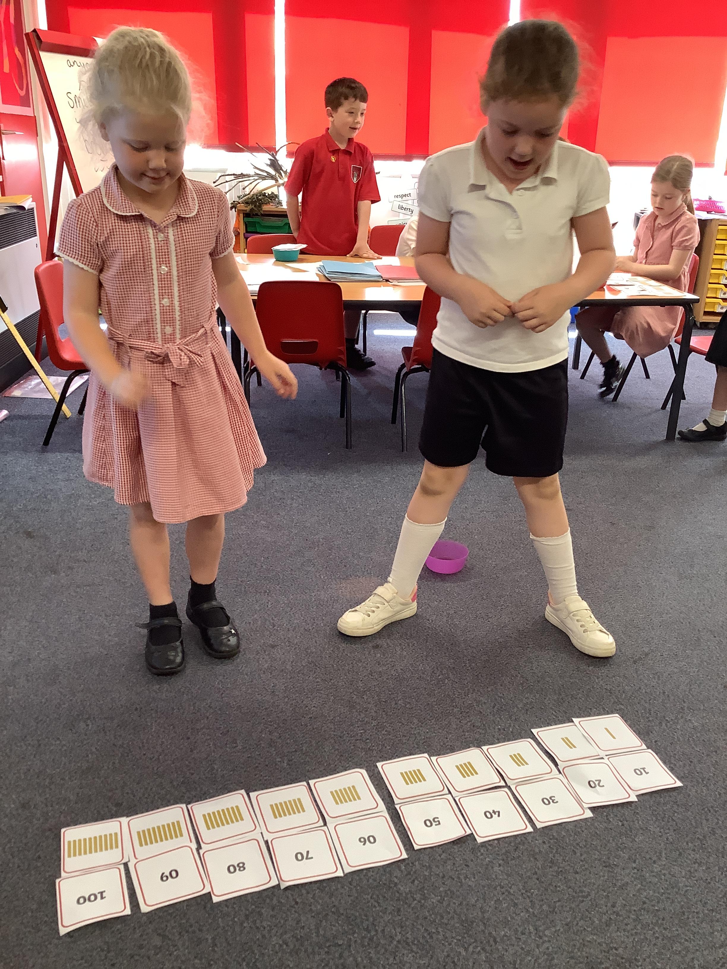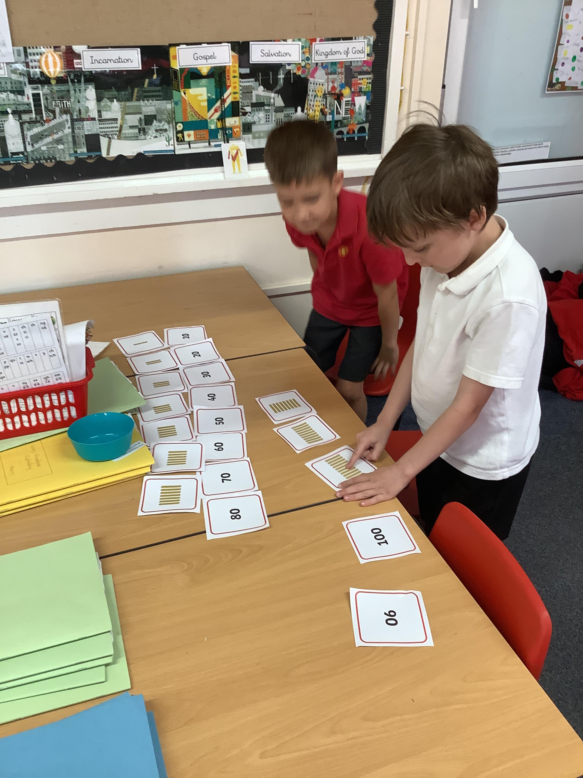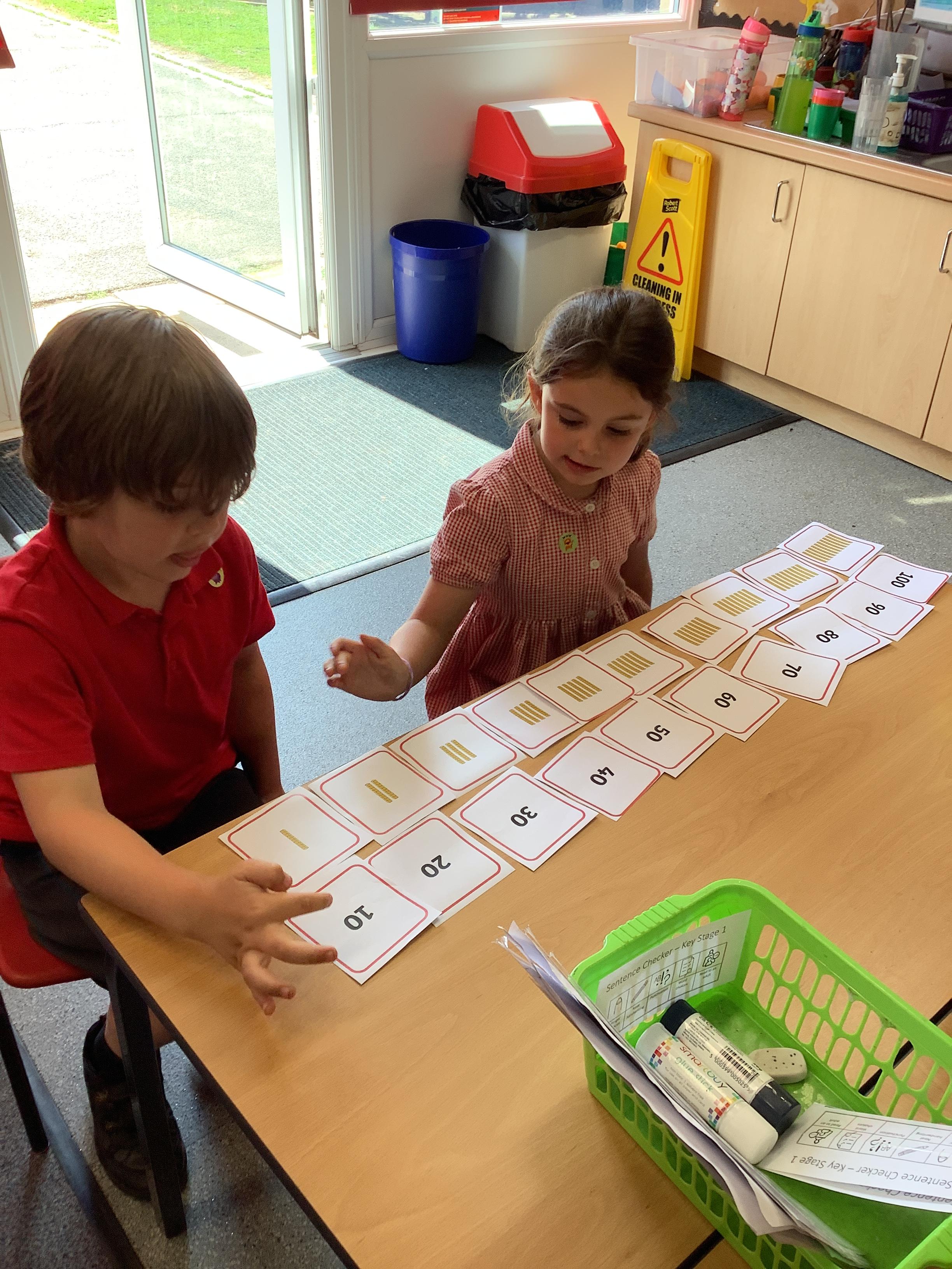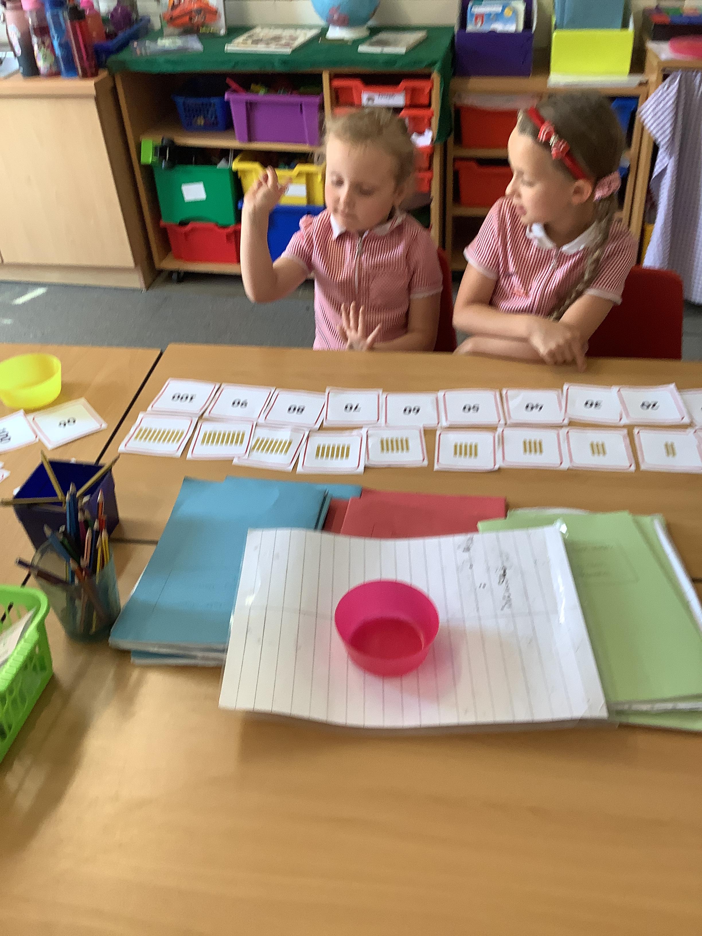 In maths we looked at multiples of ten. We had to order the numerals and find the matching representation. We then set challenges for our friends making them count forwards or backwards from any of the numbers.