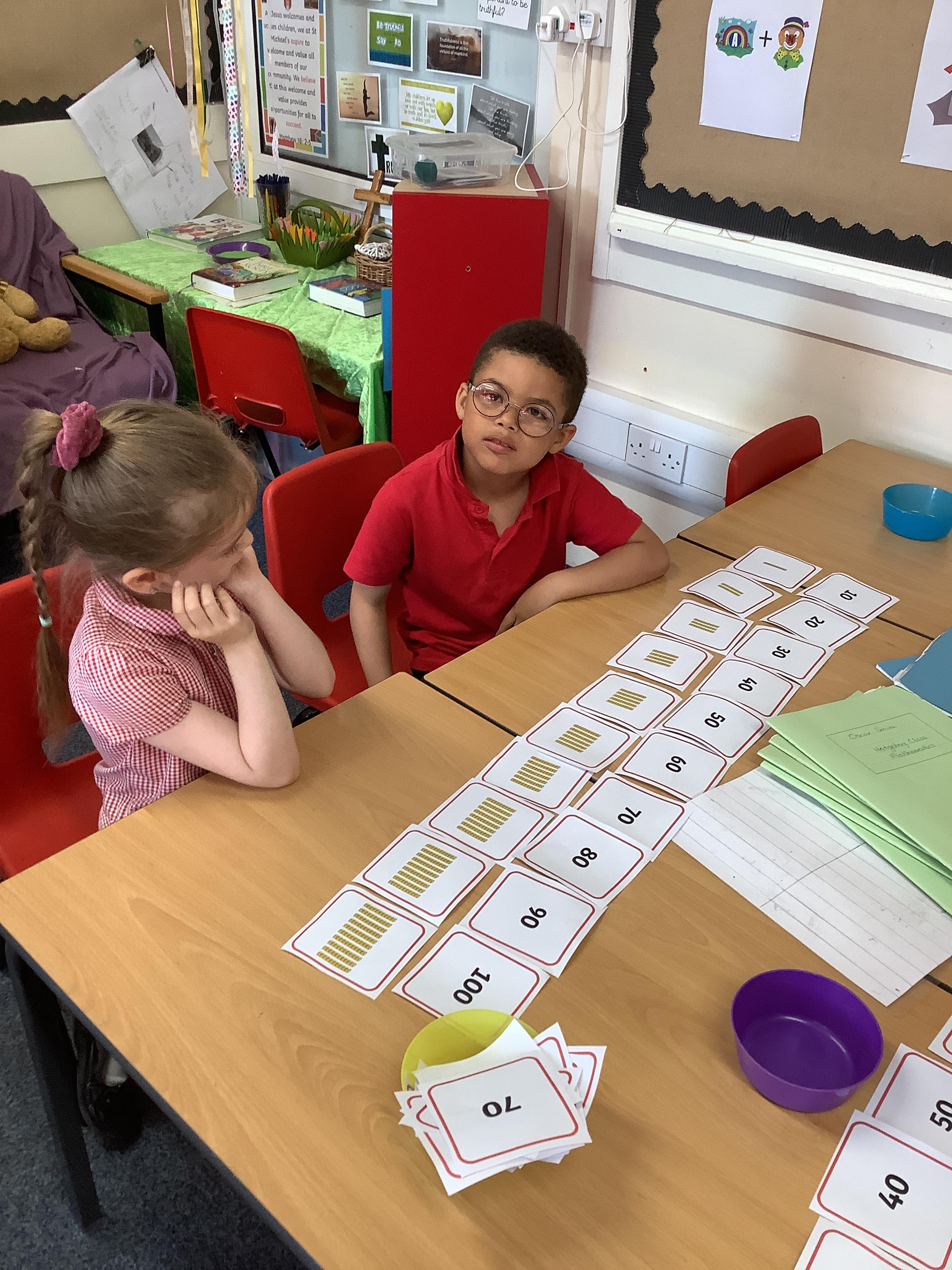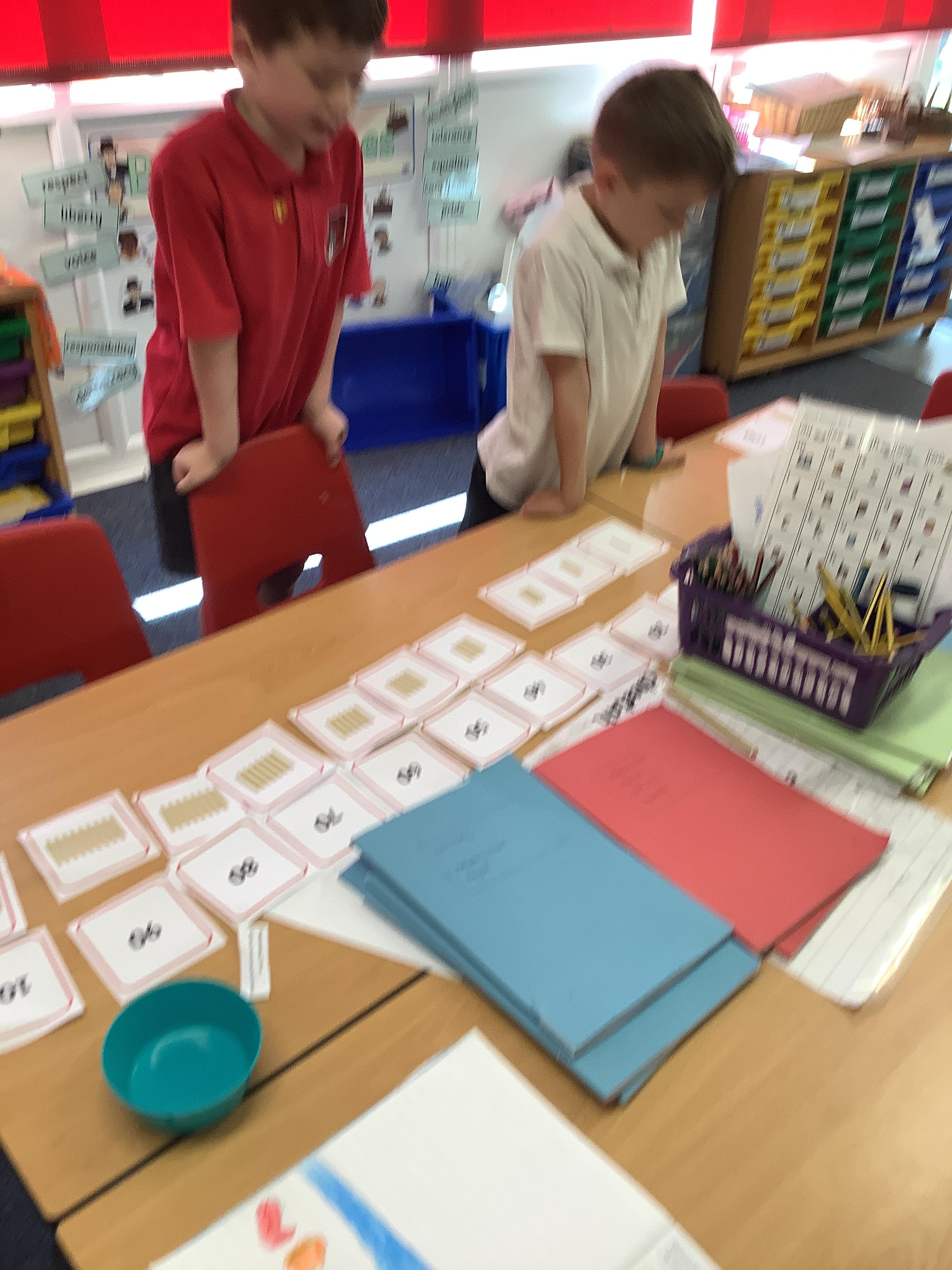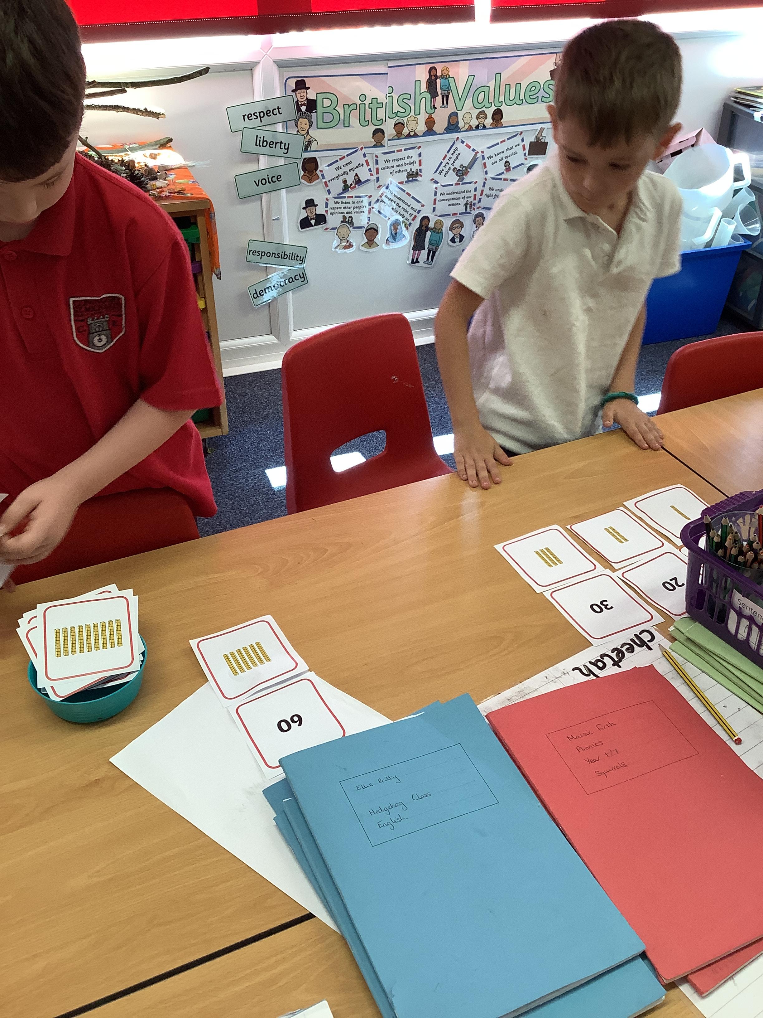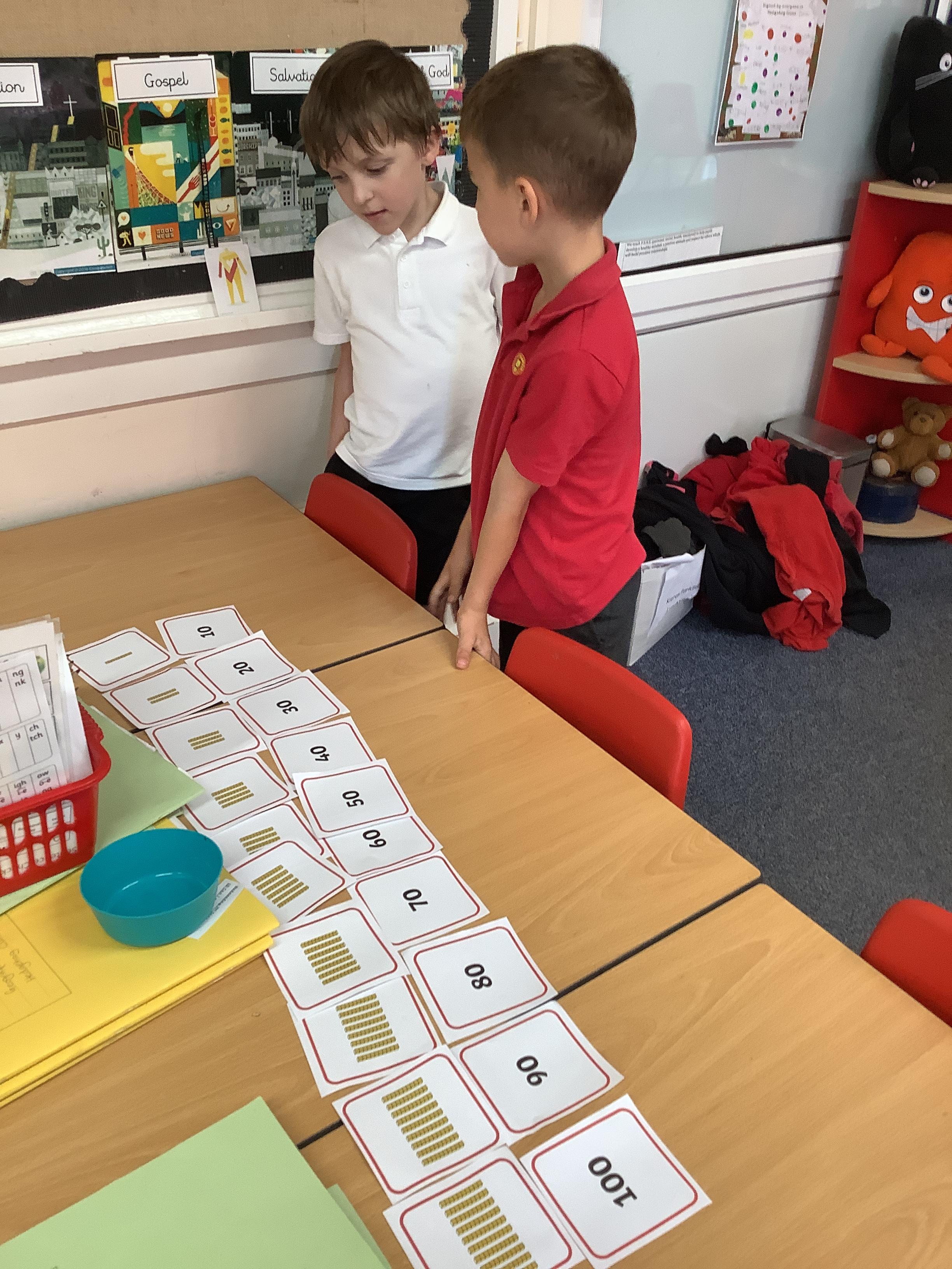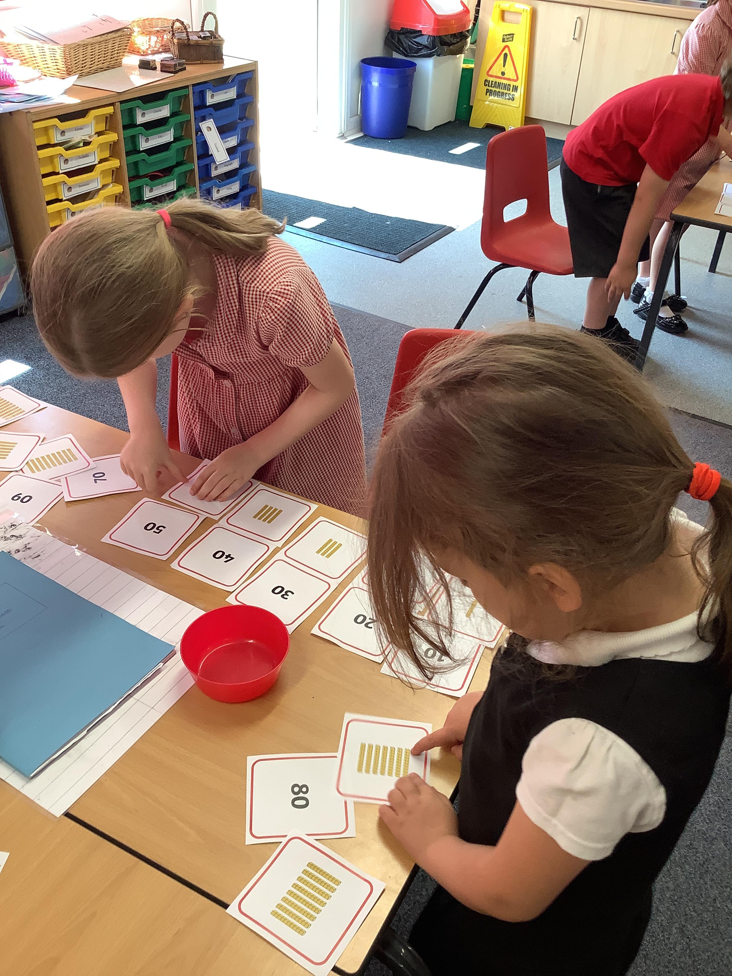 In maths we looked at multiples of ten. We had to order the numerals and find the matching representation. We then set challenges for our friends making them count forwards or backwards from any of the numbers.