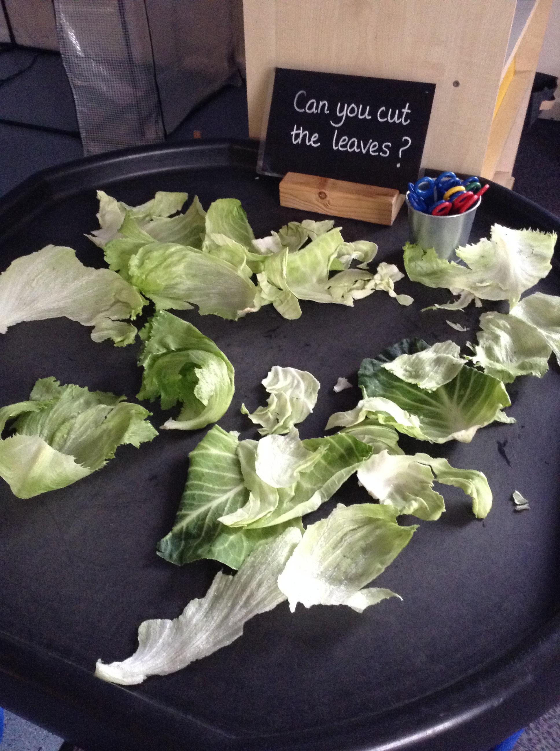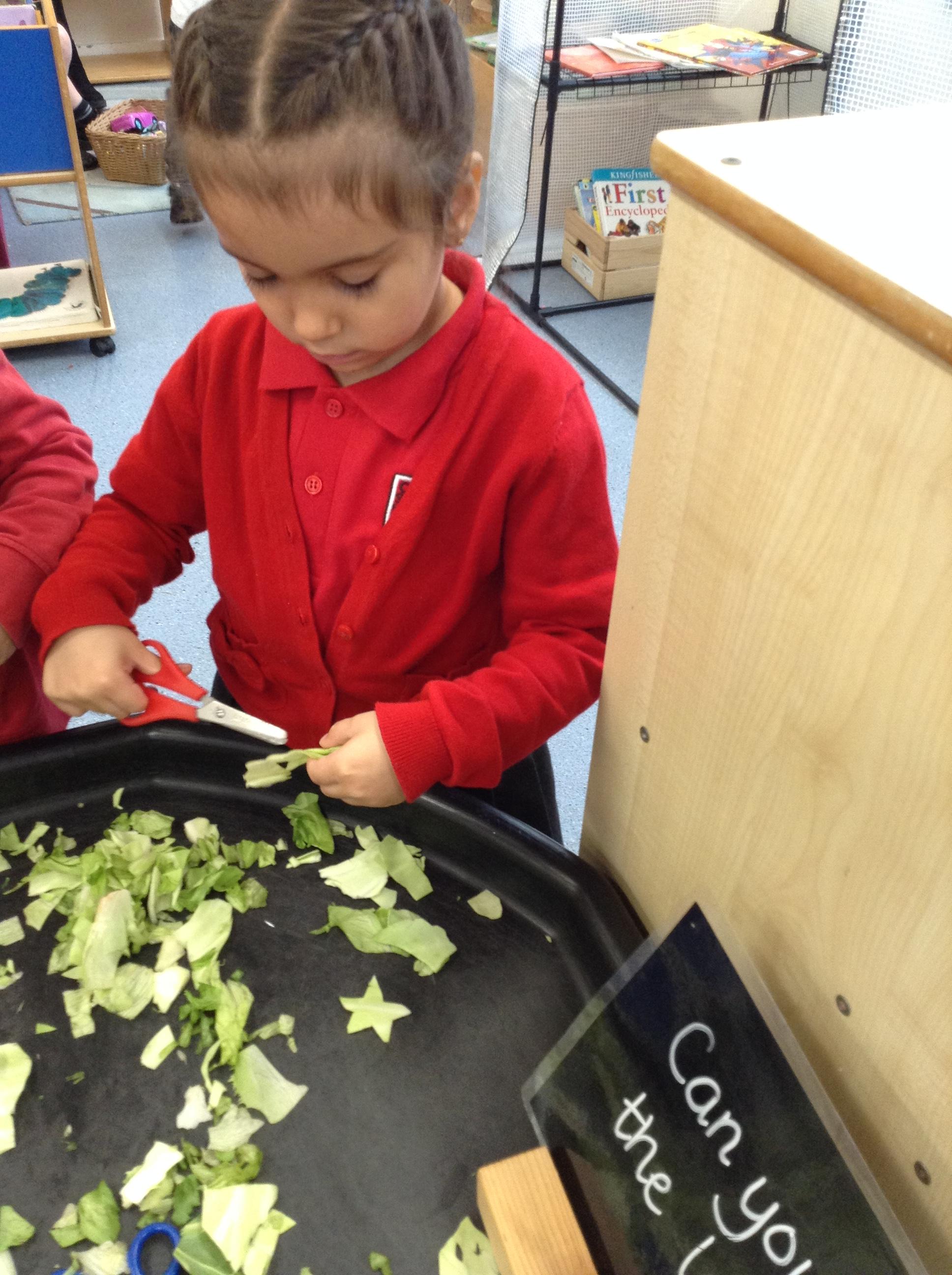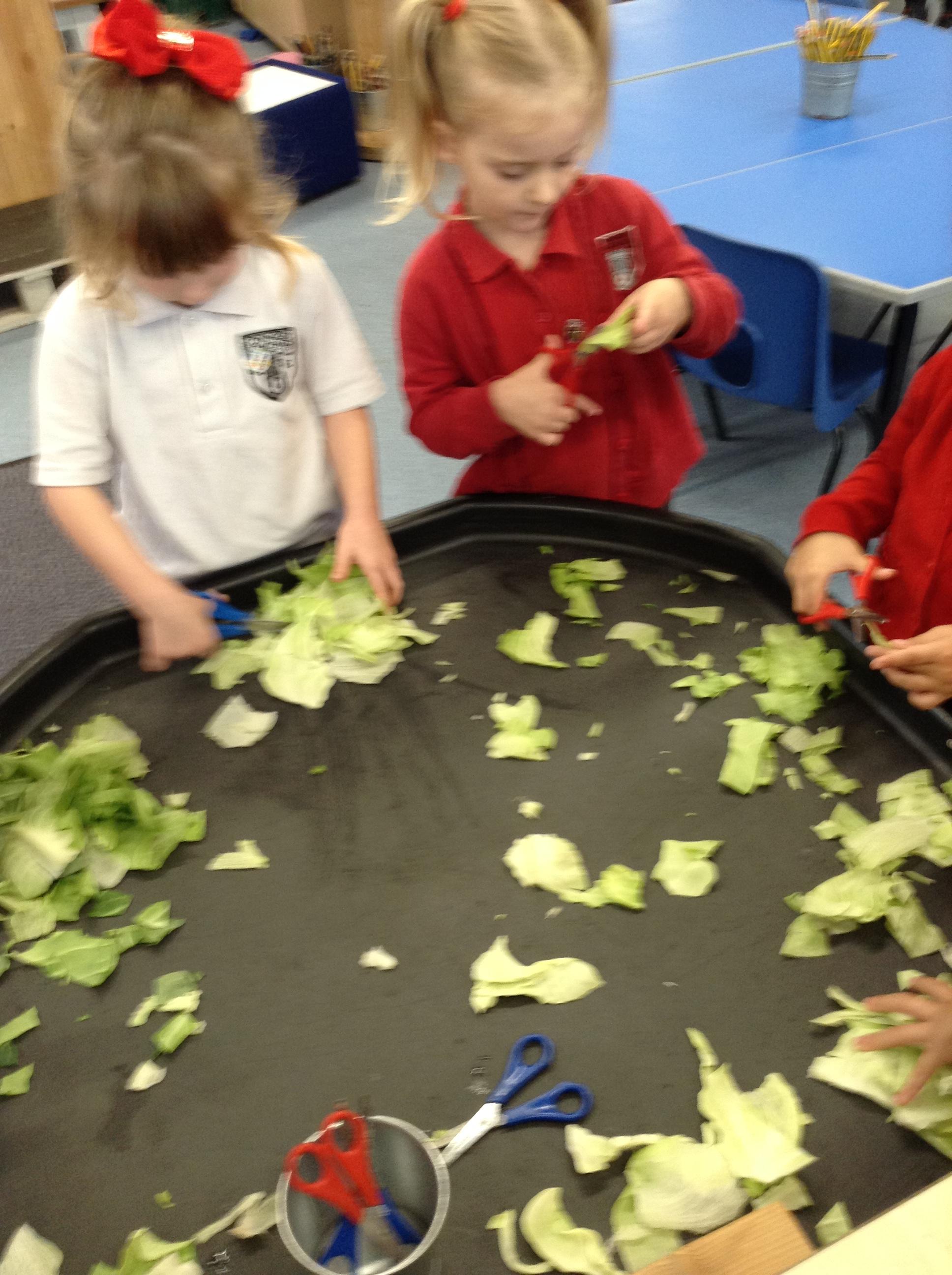 This week we have been using scissors to cut different materials - paper of course but we have also been cutting lettuce and cabbage leaves!