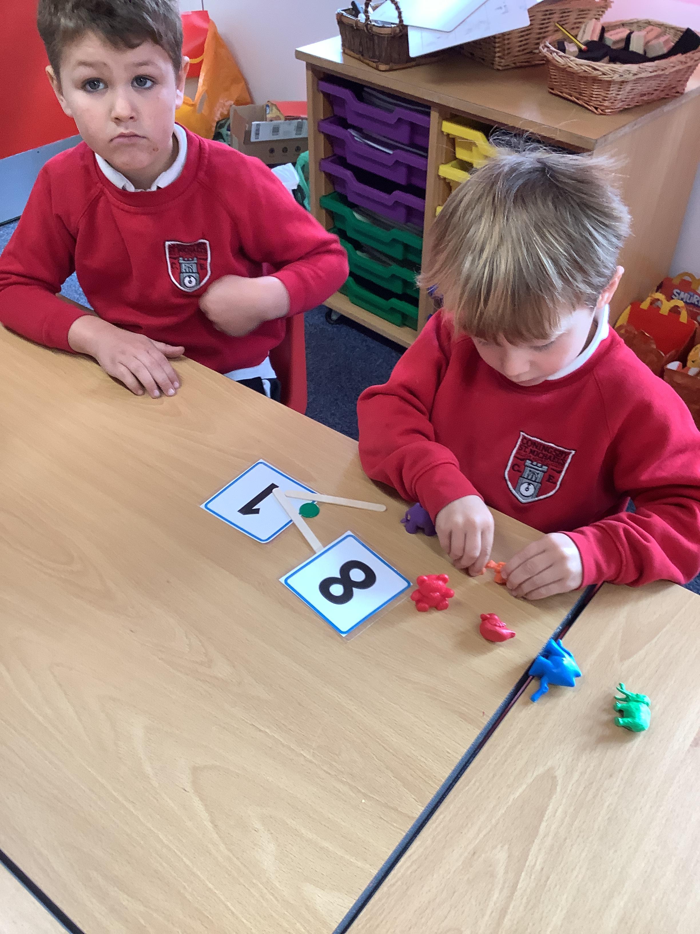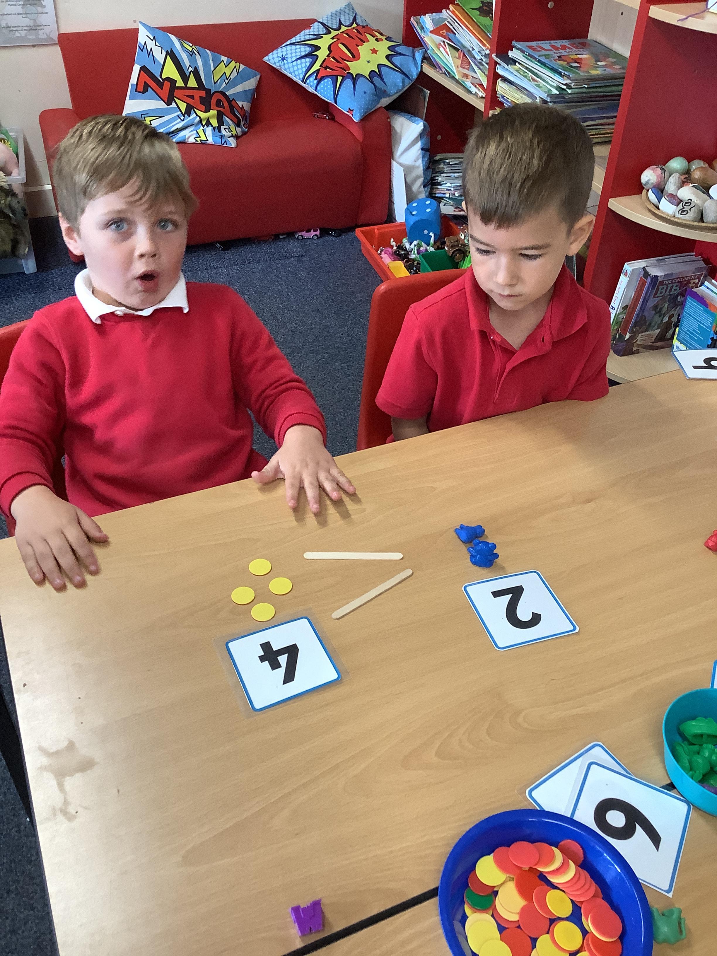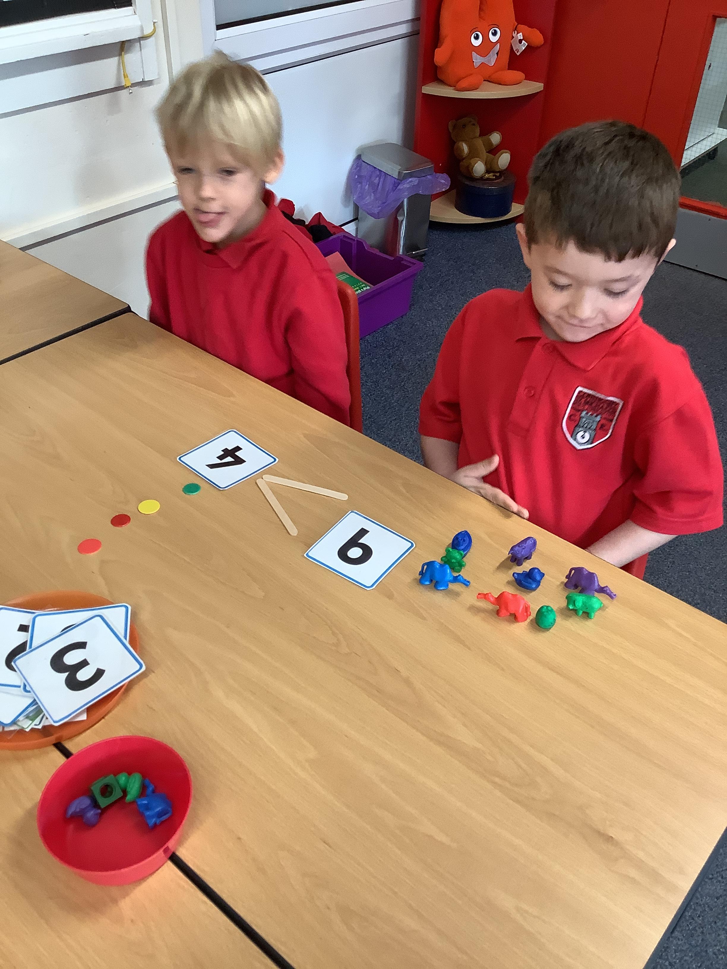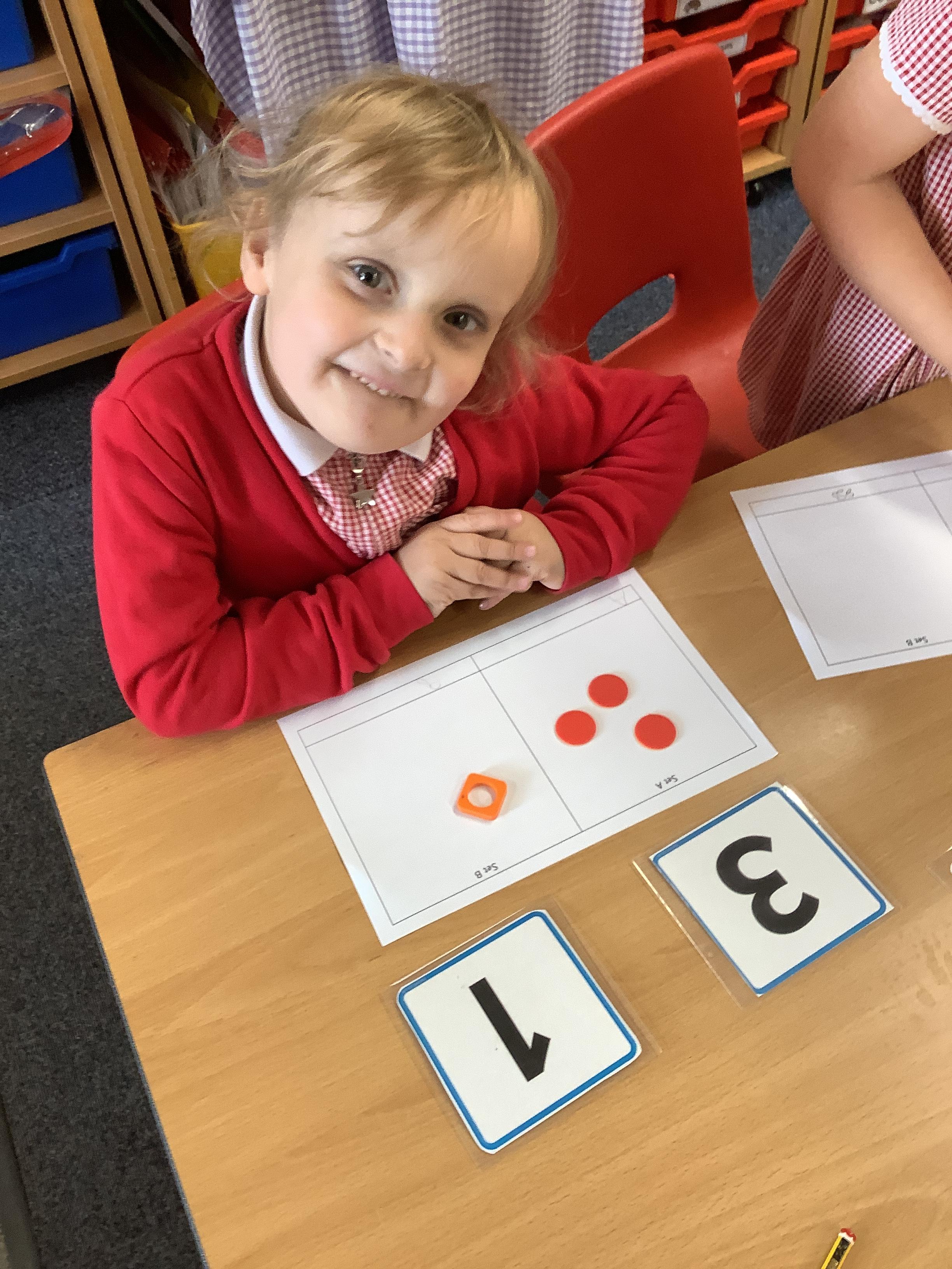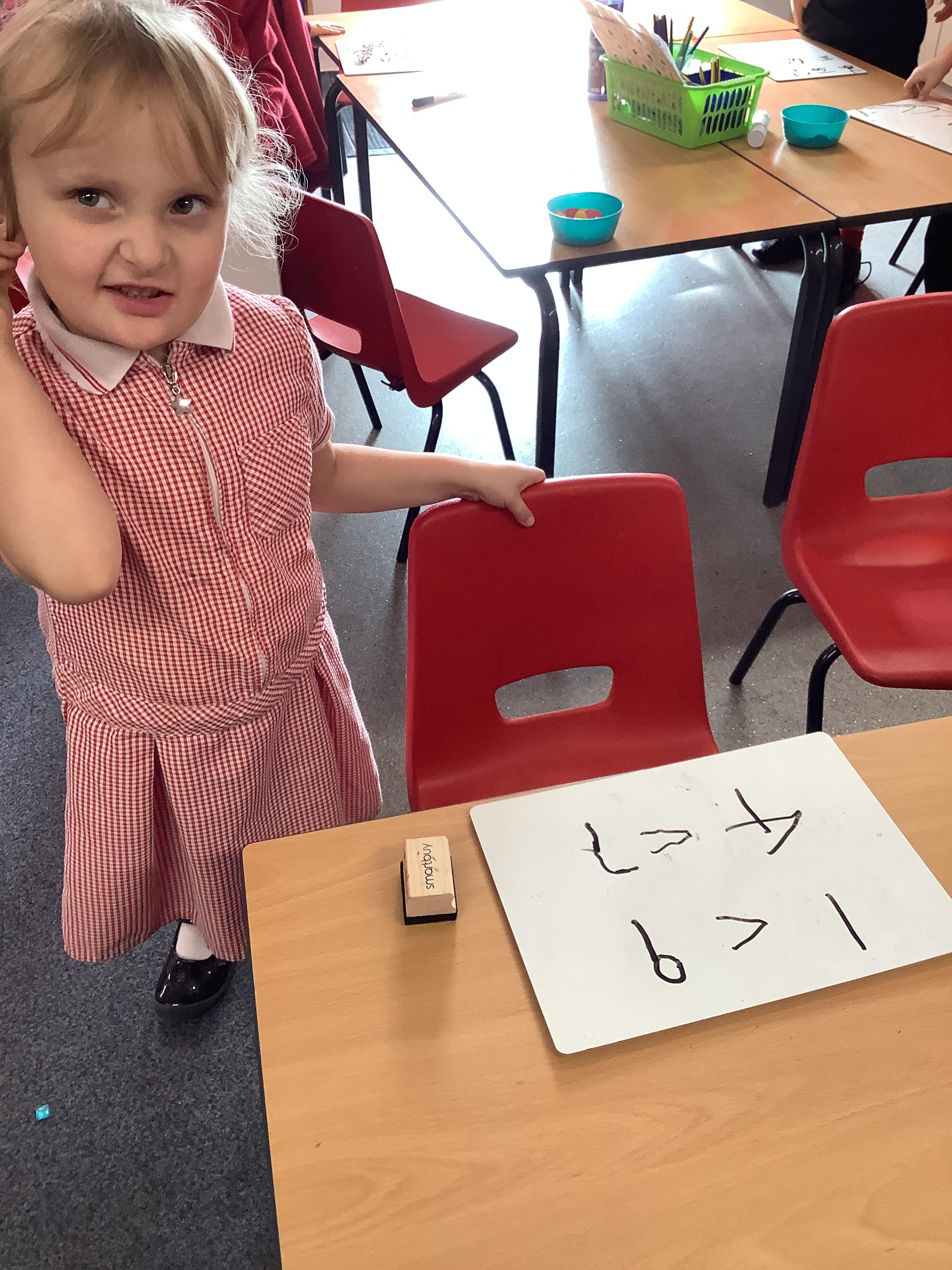 In maths we compared numbers. We used counters and pictures to check which numbers were greater than and less than.
