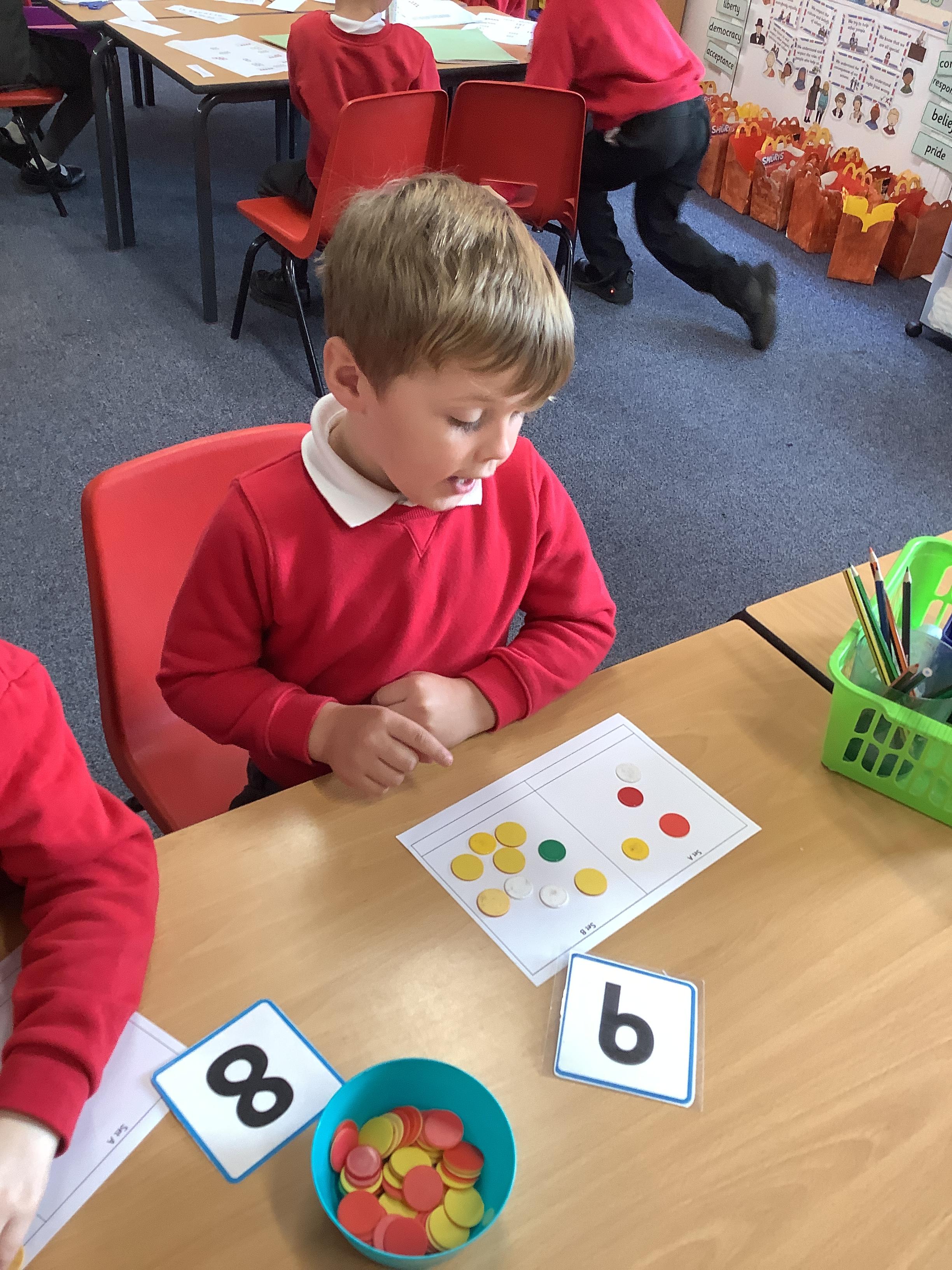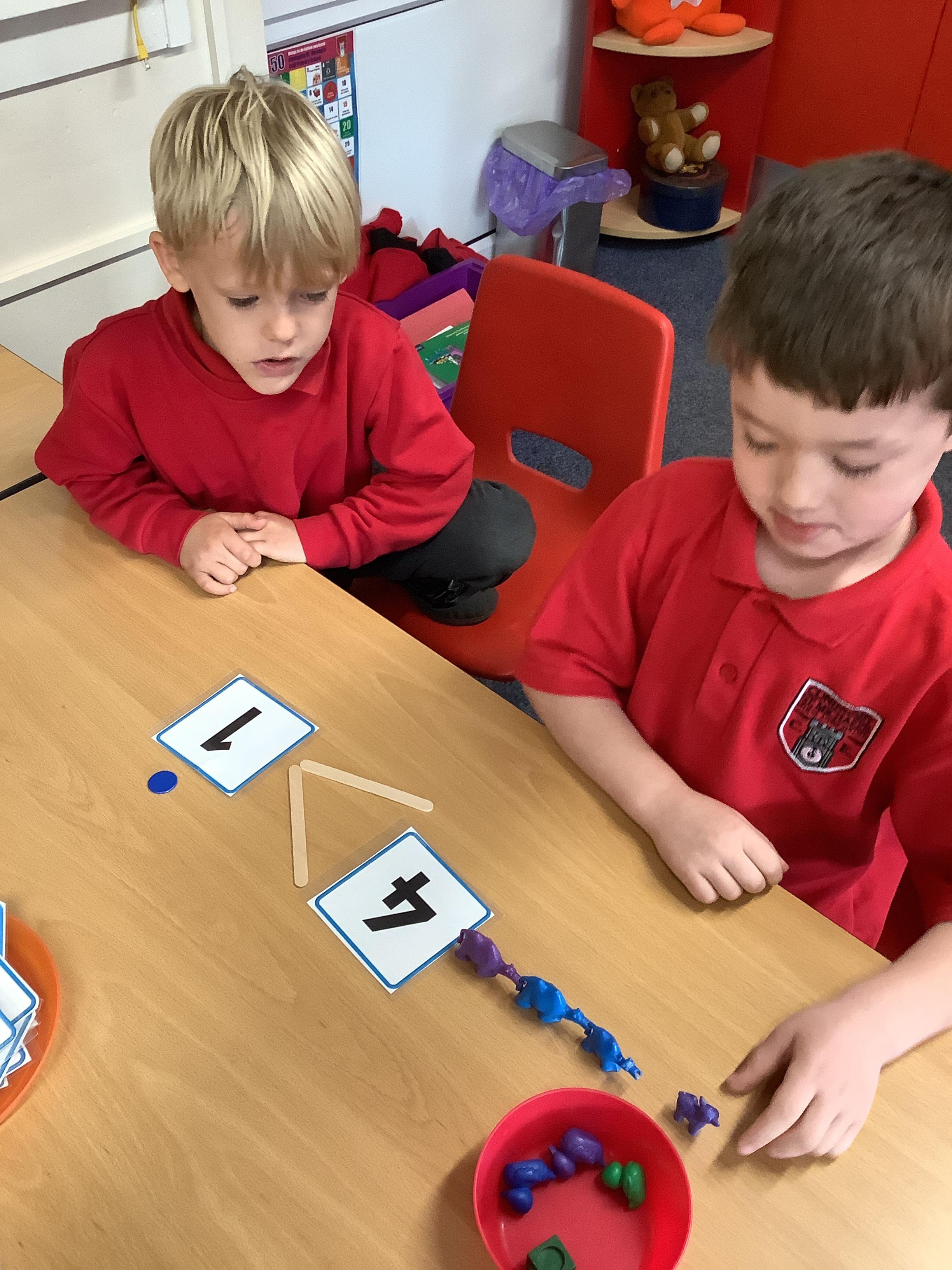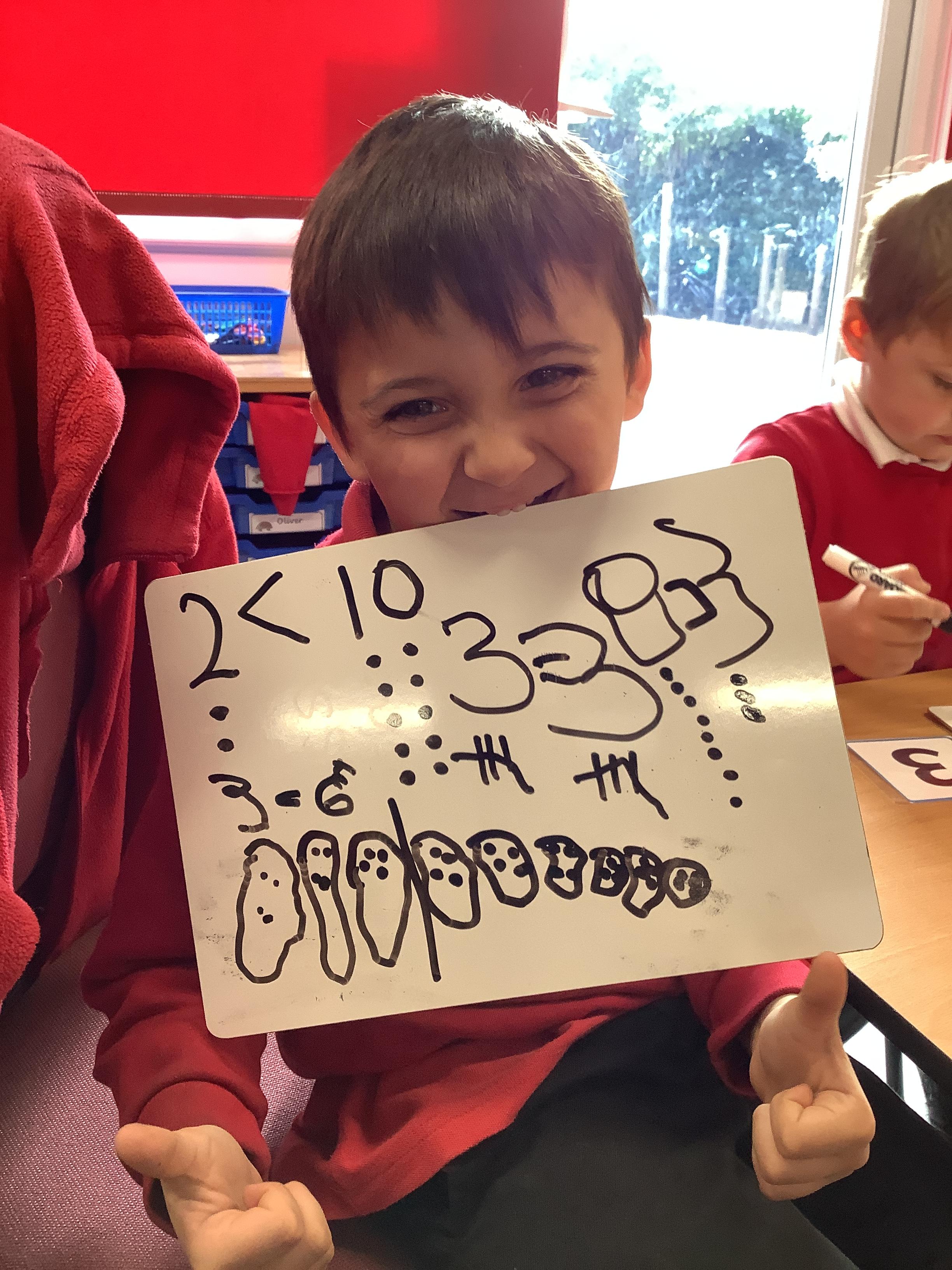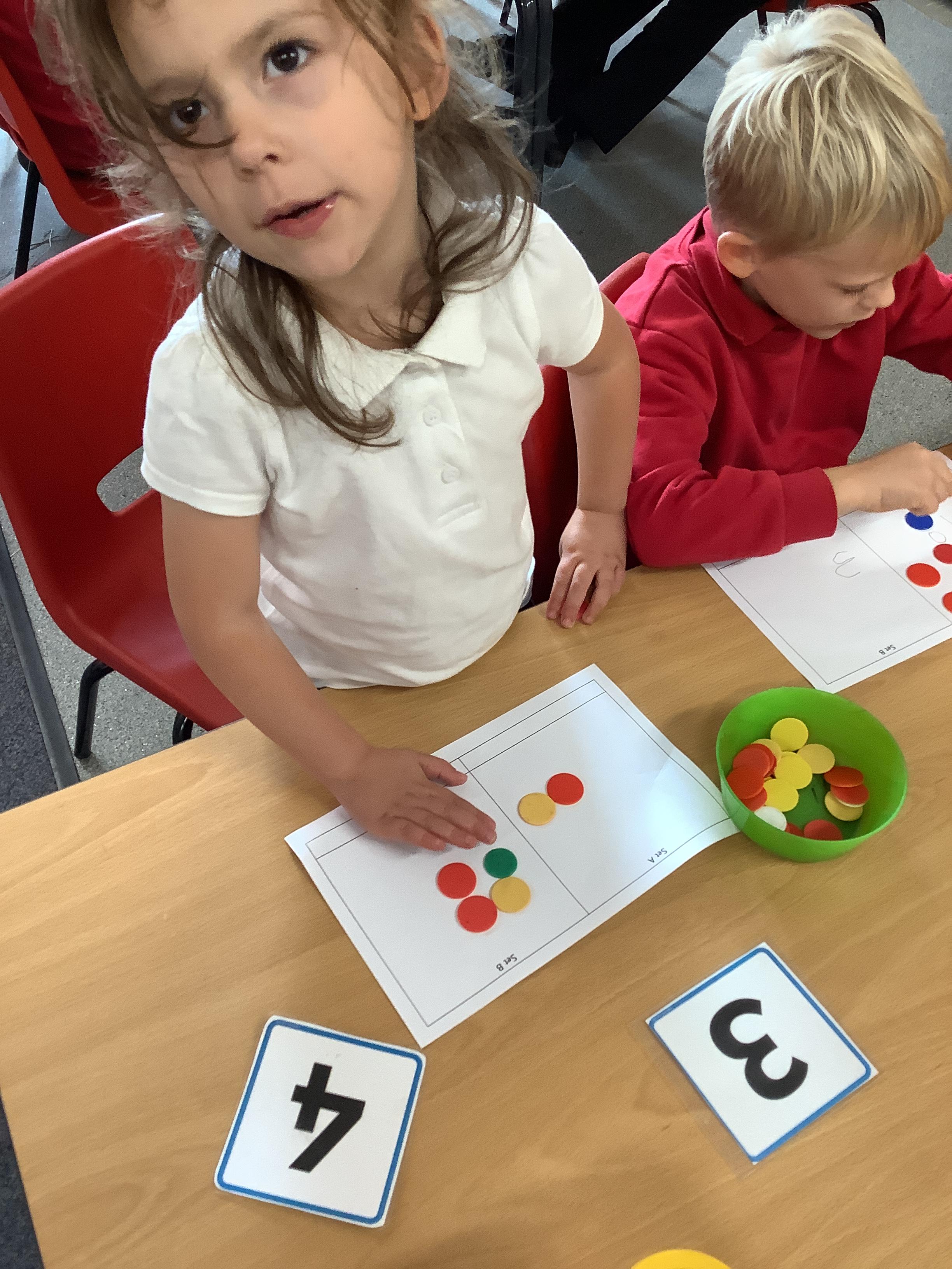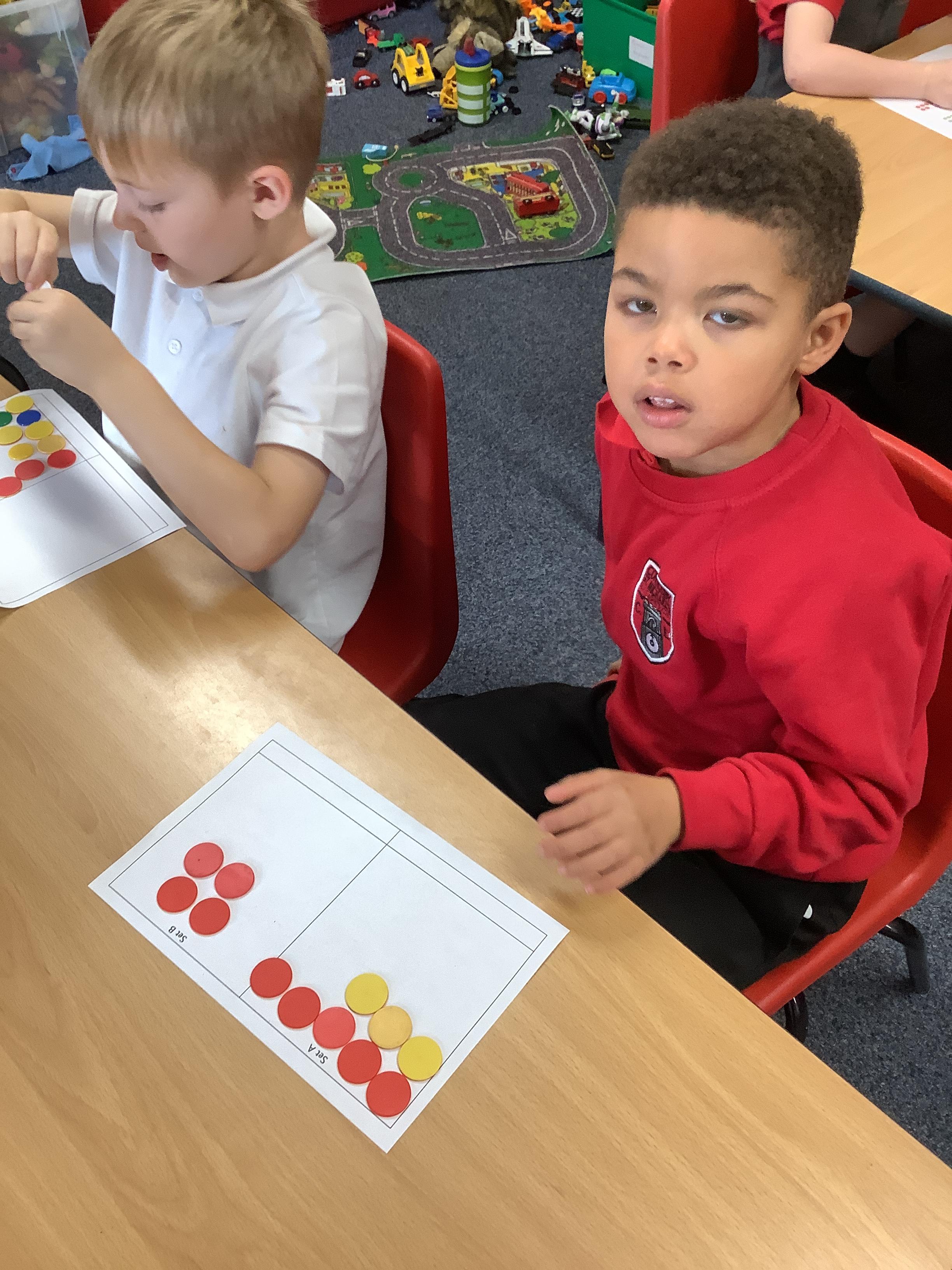 In maths we compared numbers. We used counters and pictures to check which numbers were greater than and less than.