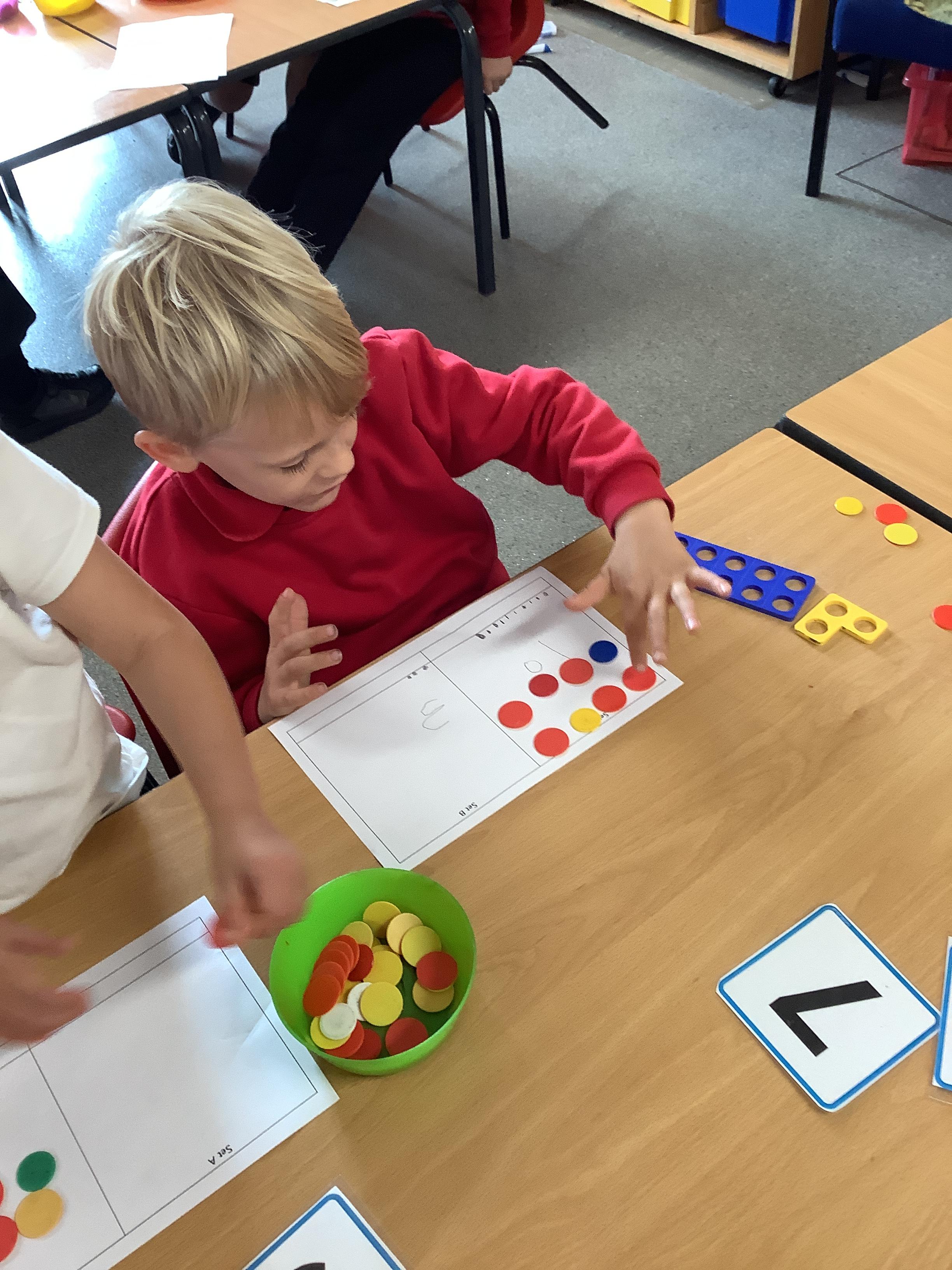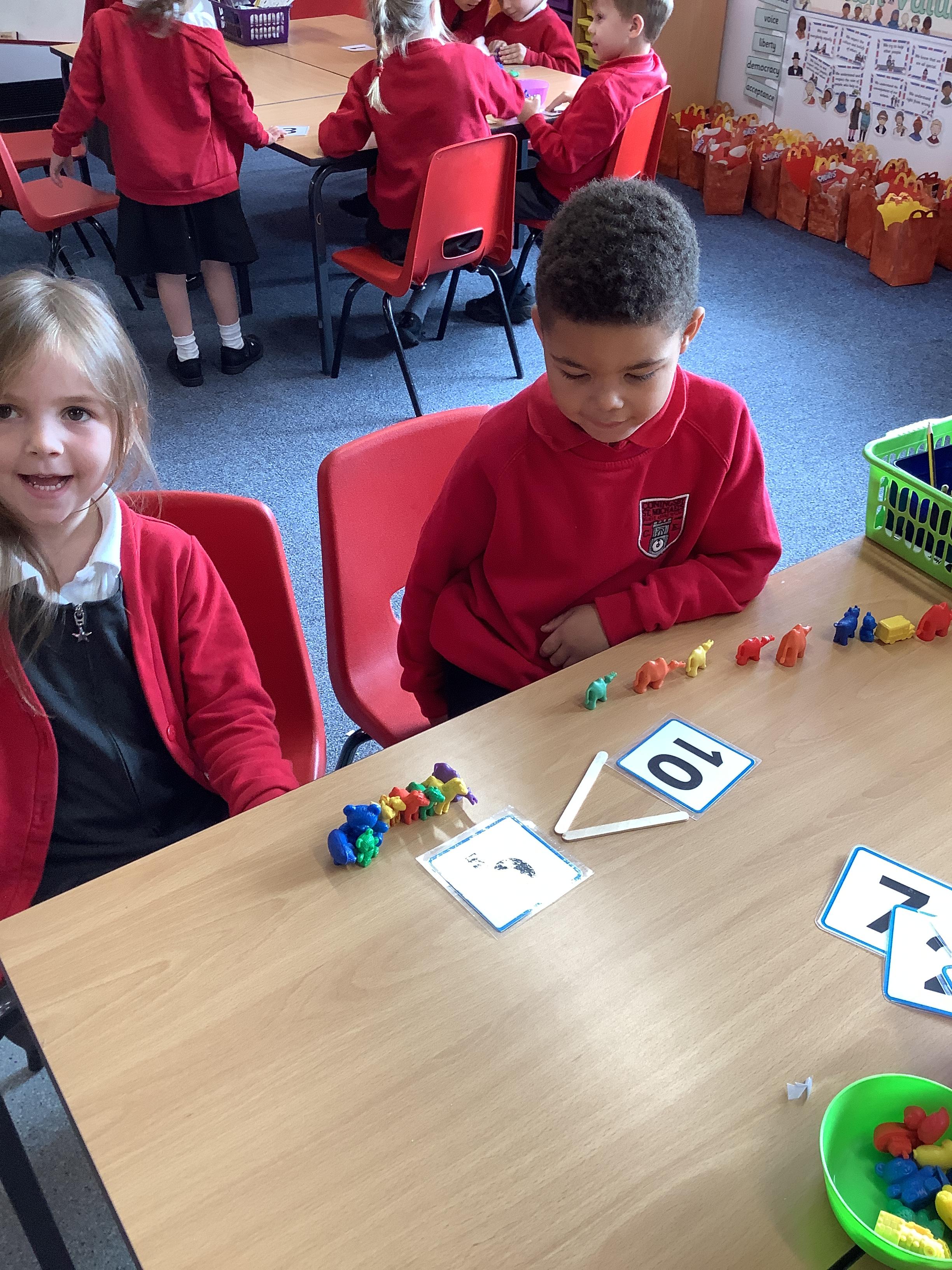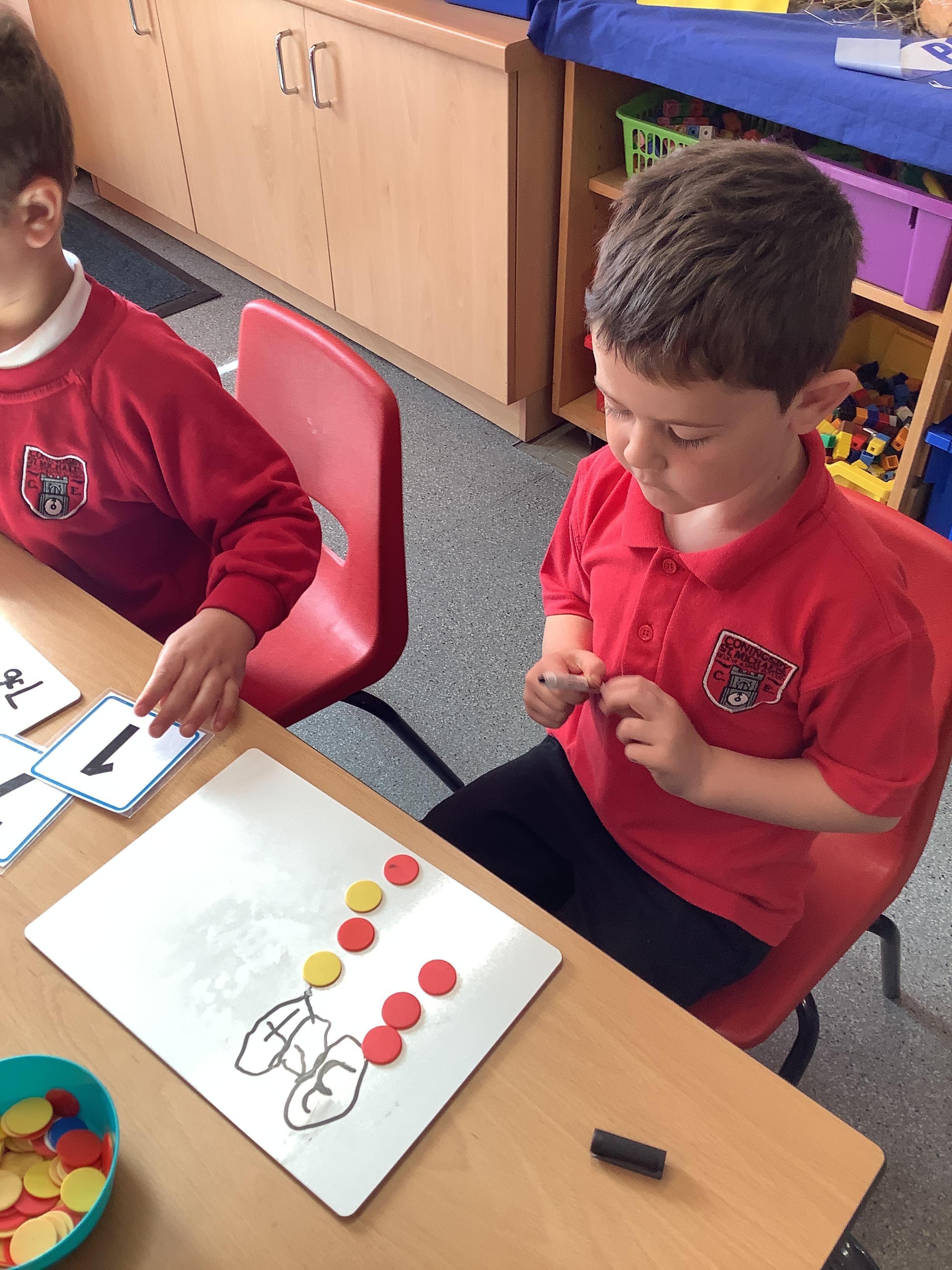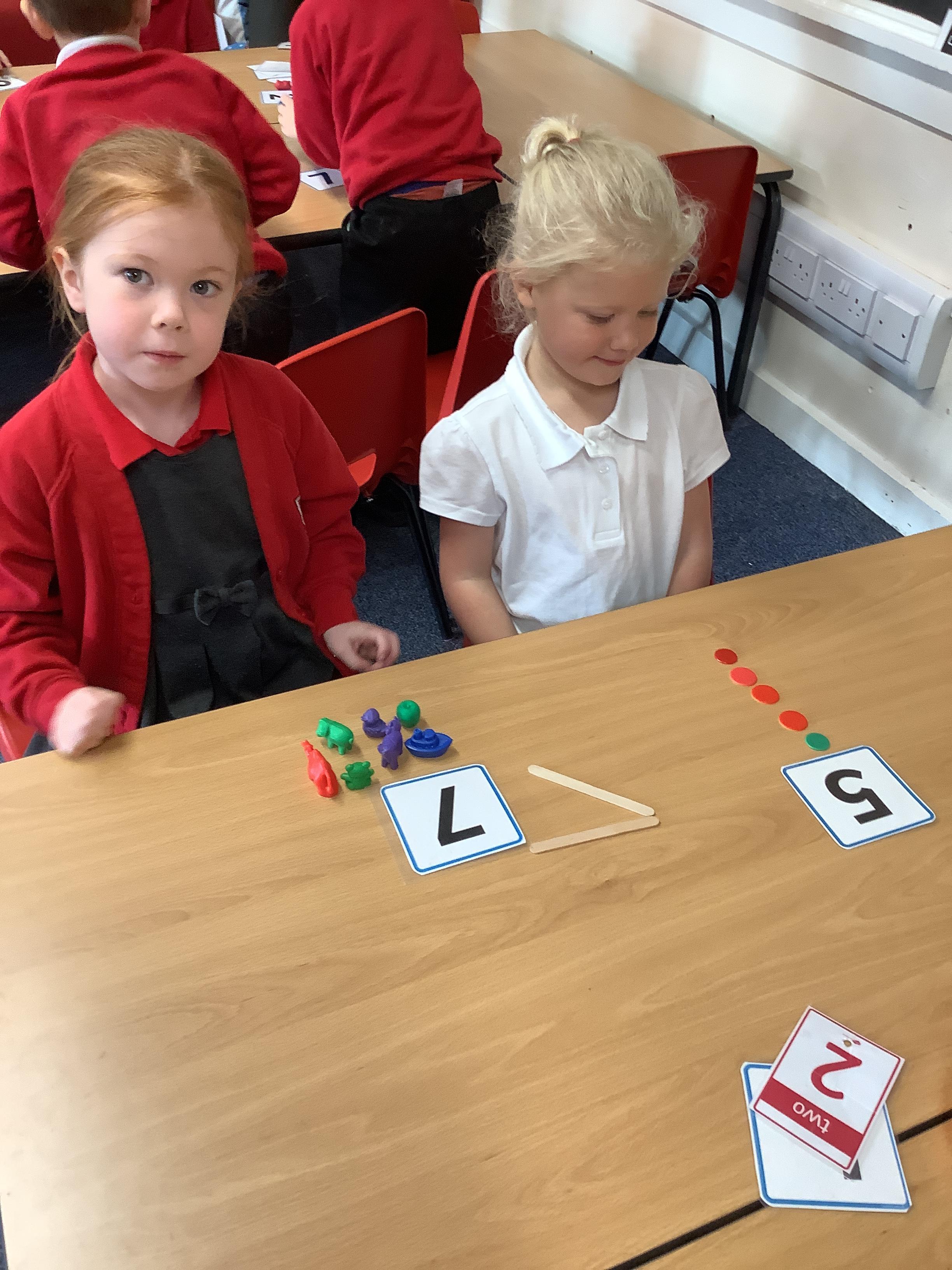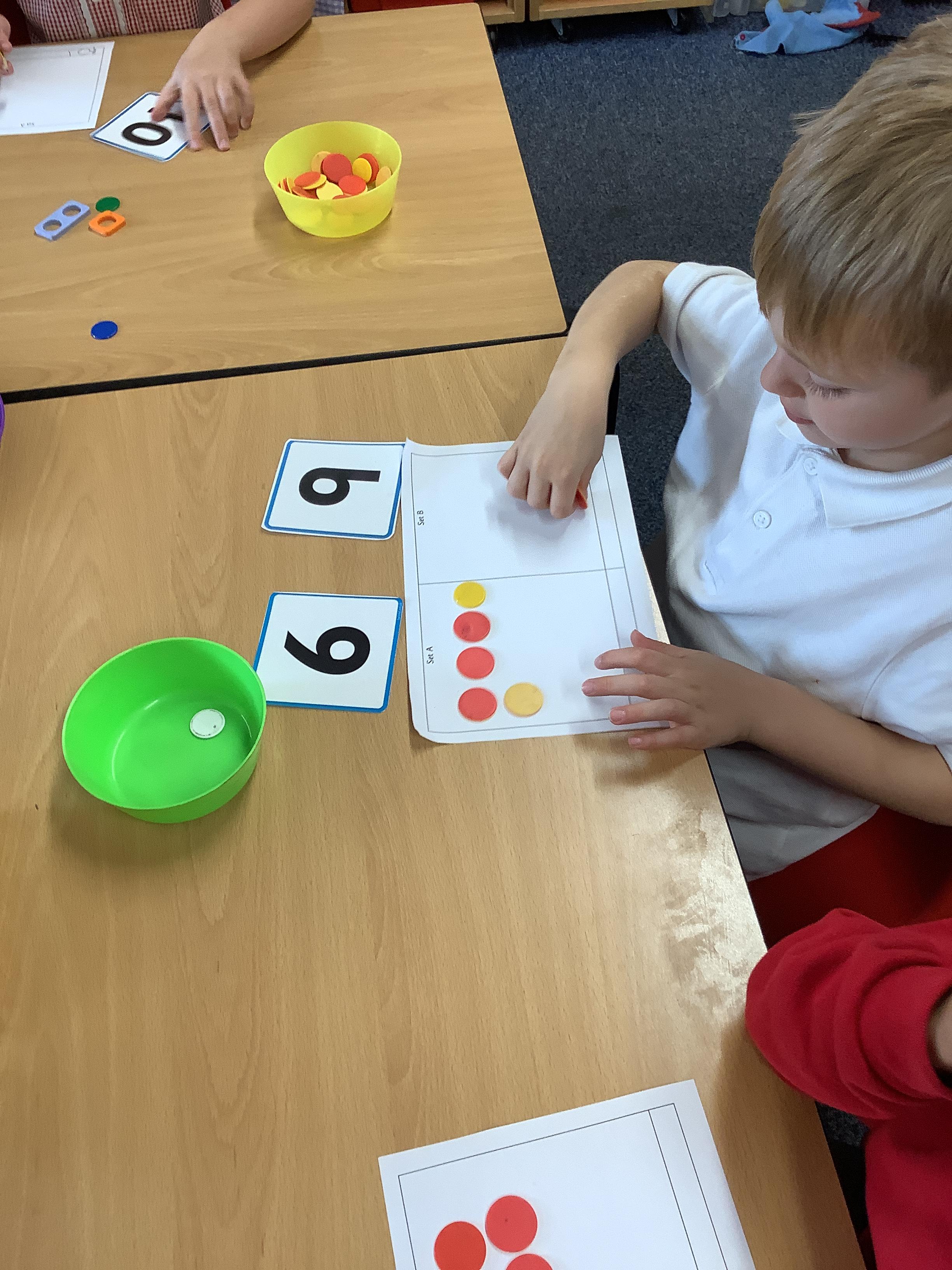 In maths we compared numbers. We used counters and pictures to check which numbers were greater than and less than.