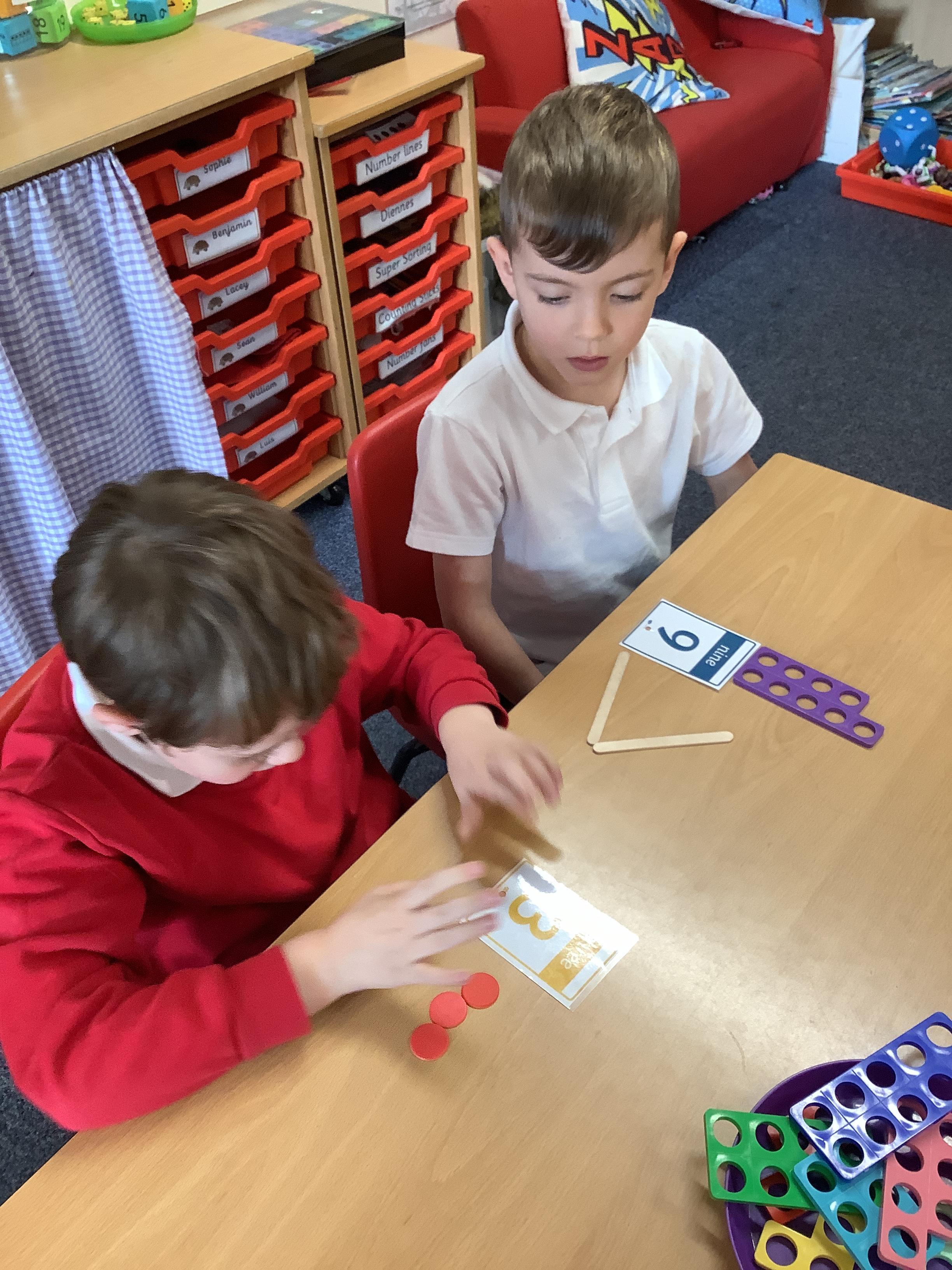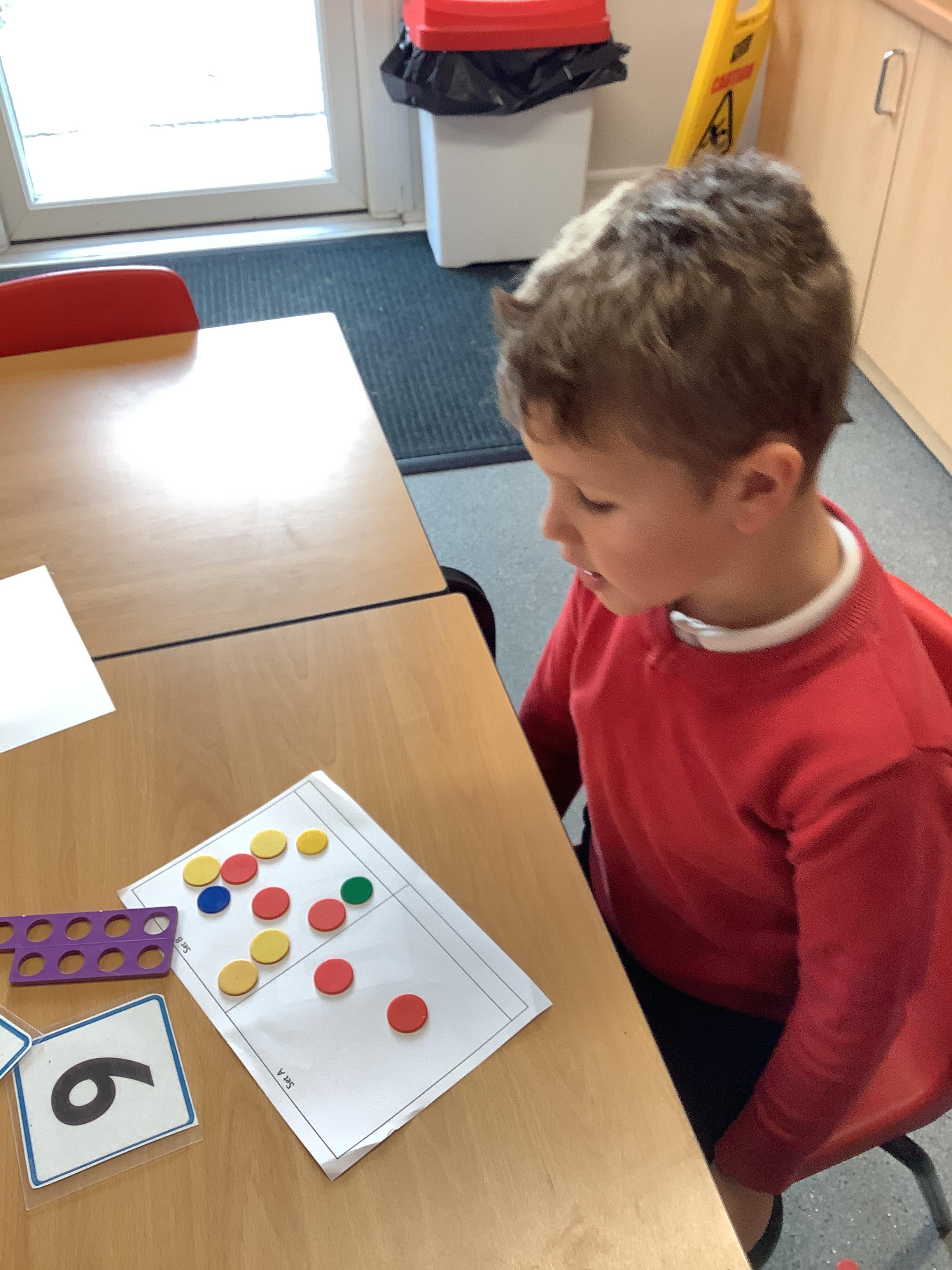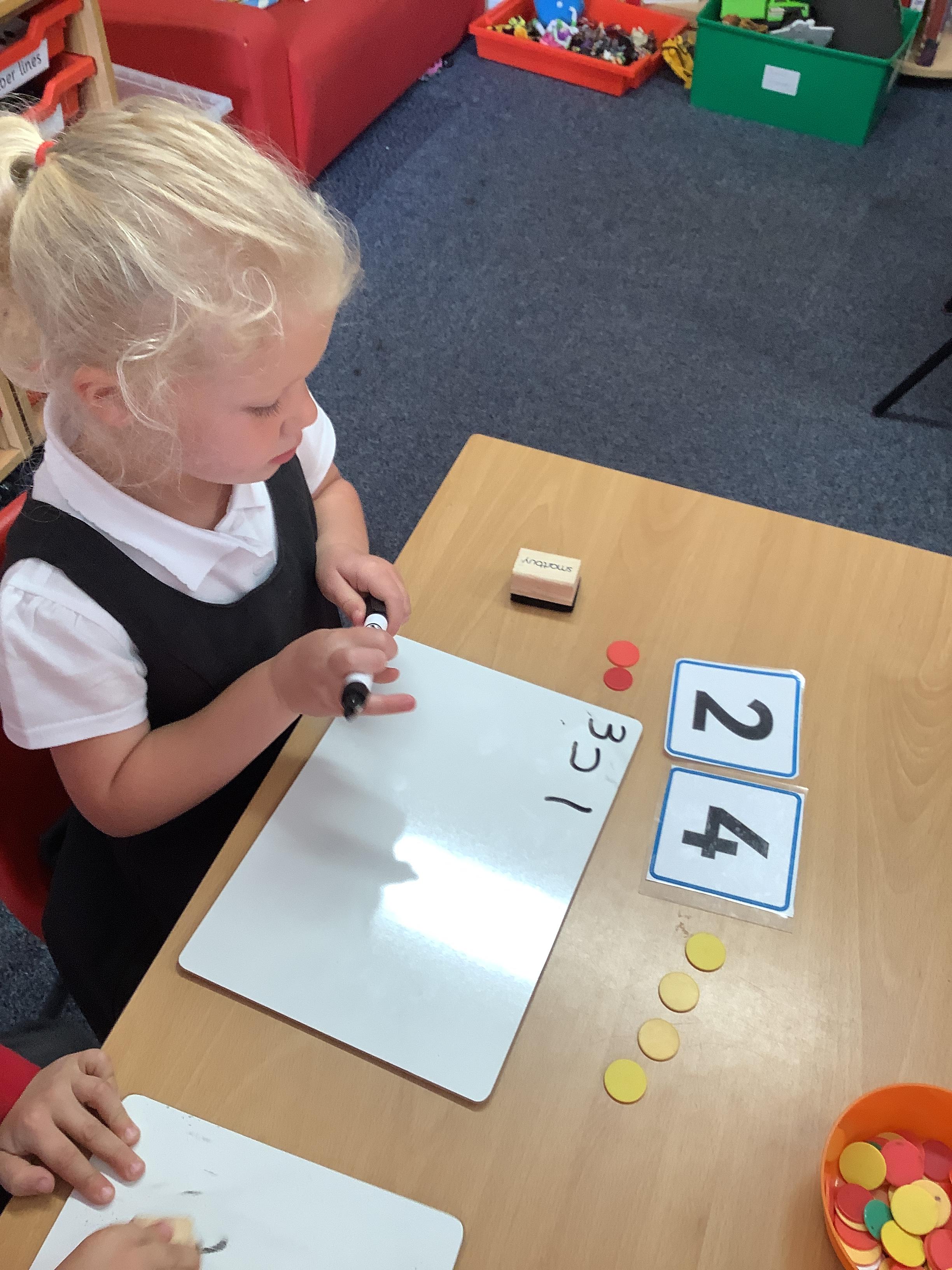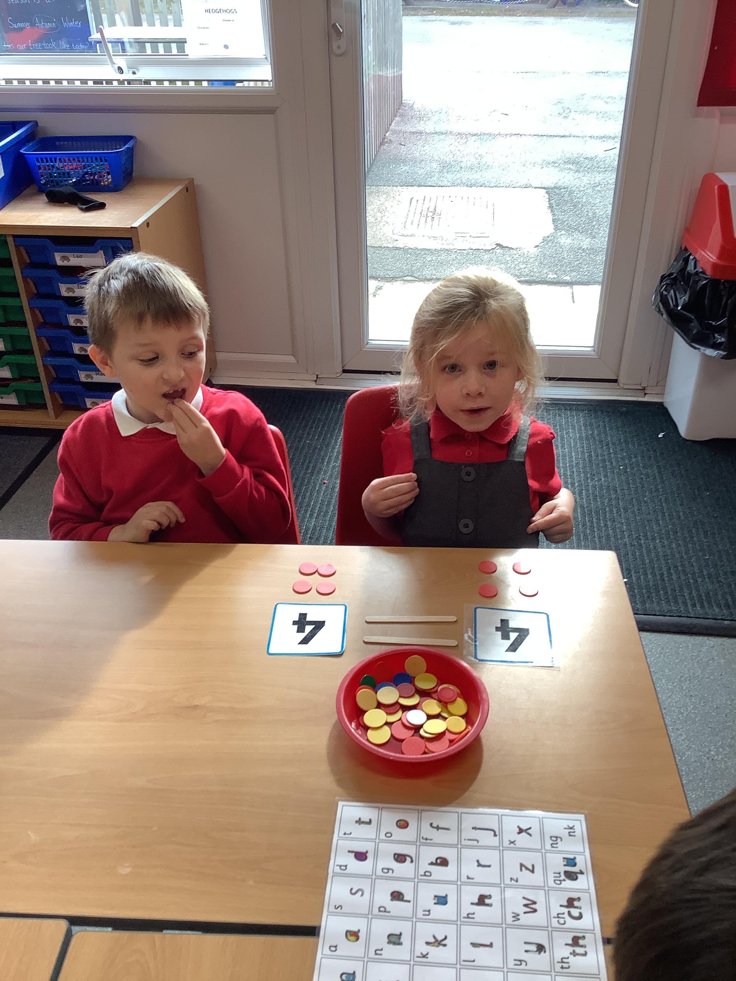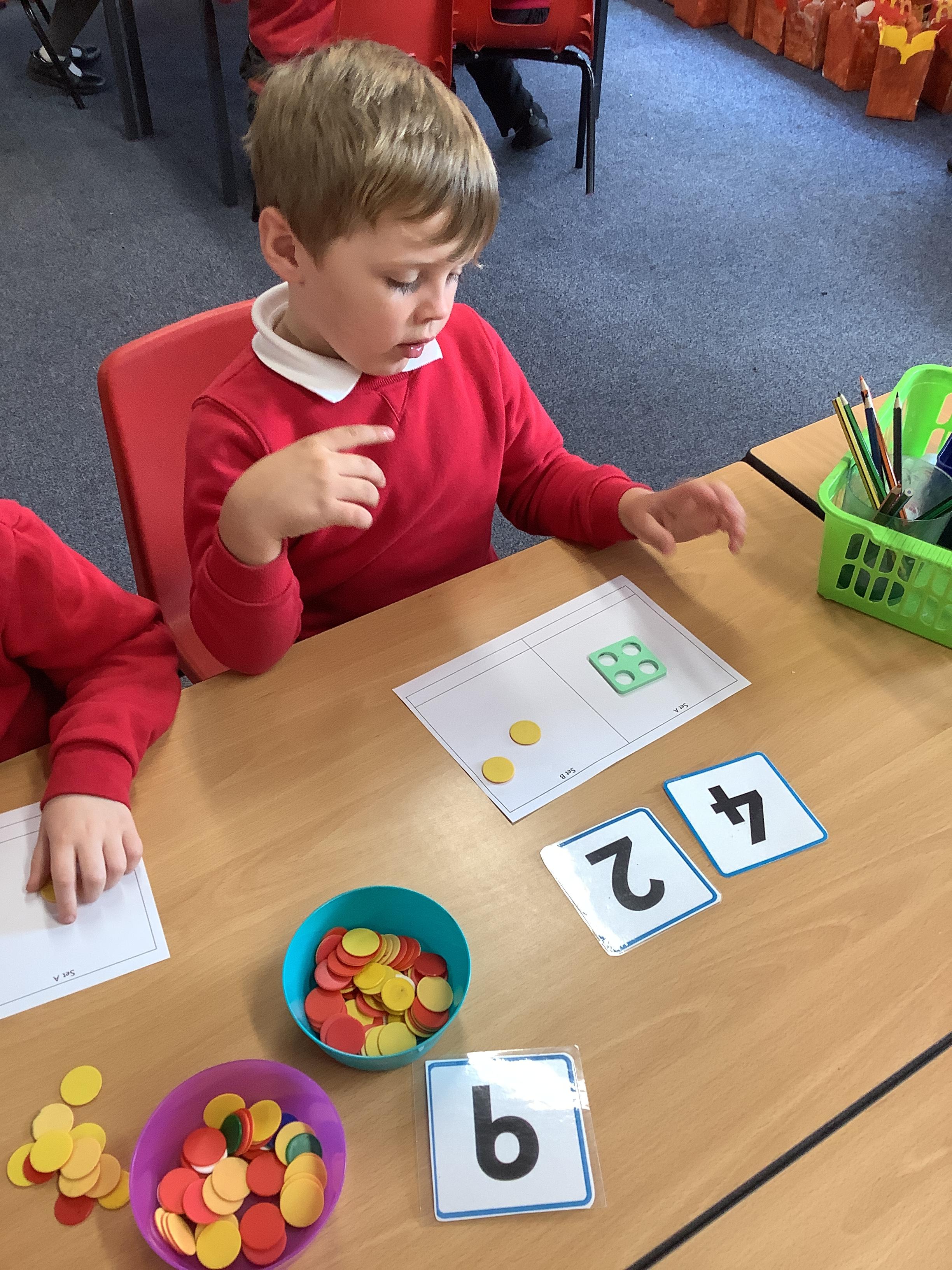 In maths we compared numbers. We used counters and pictures to check which numbers were greater than and less than.