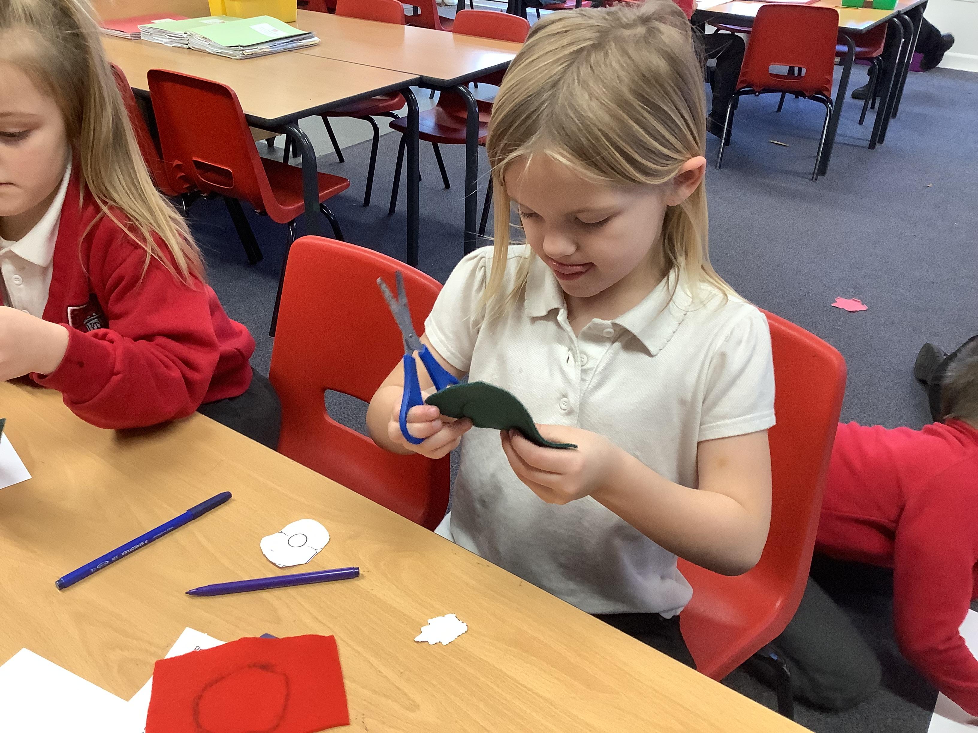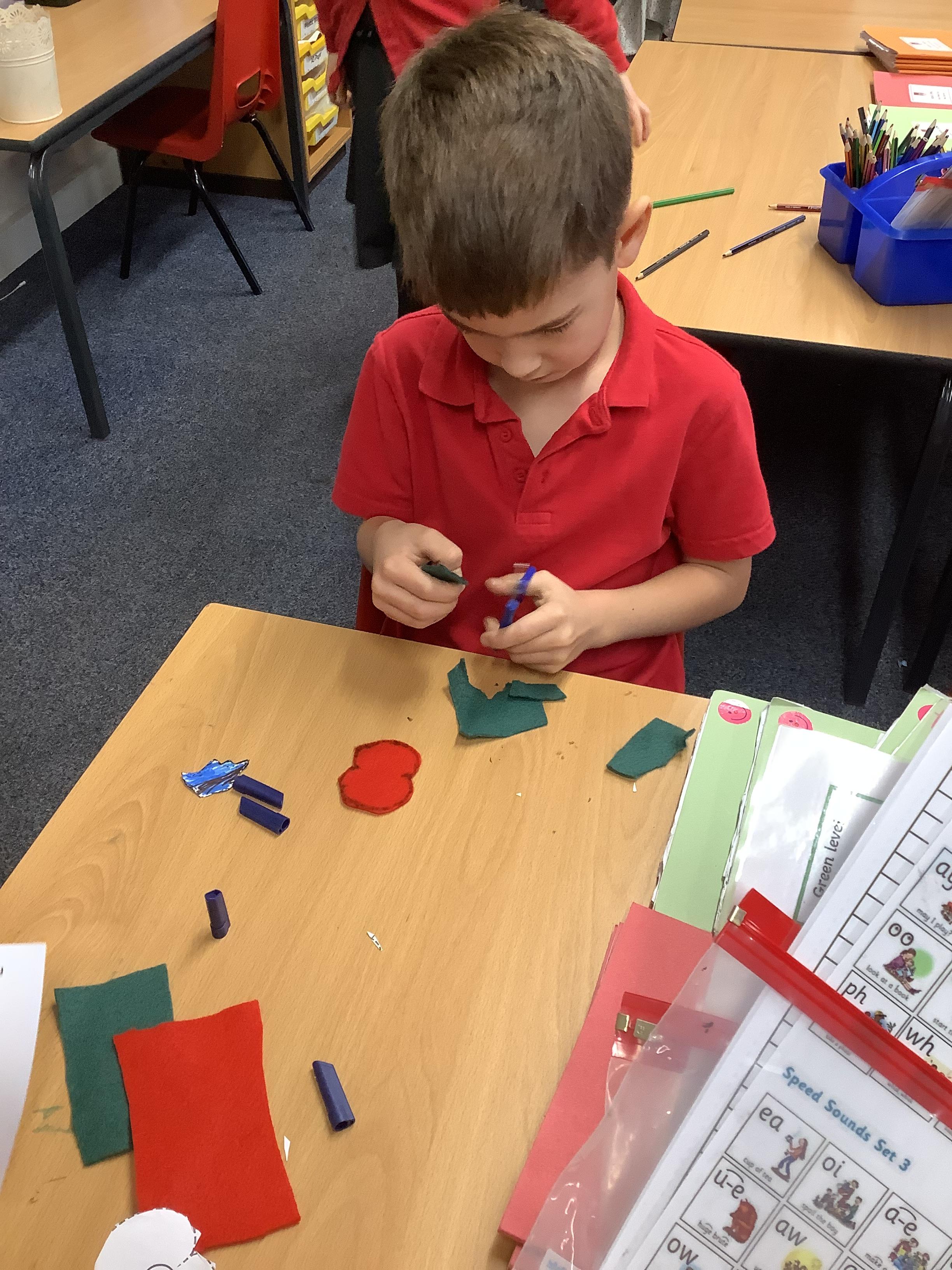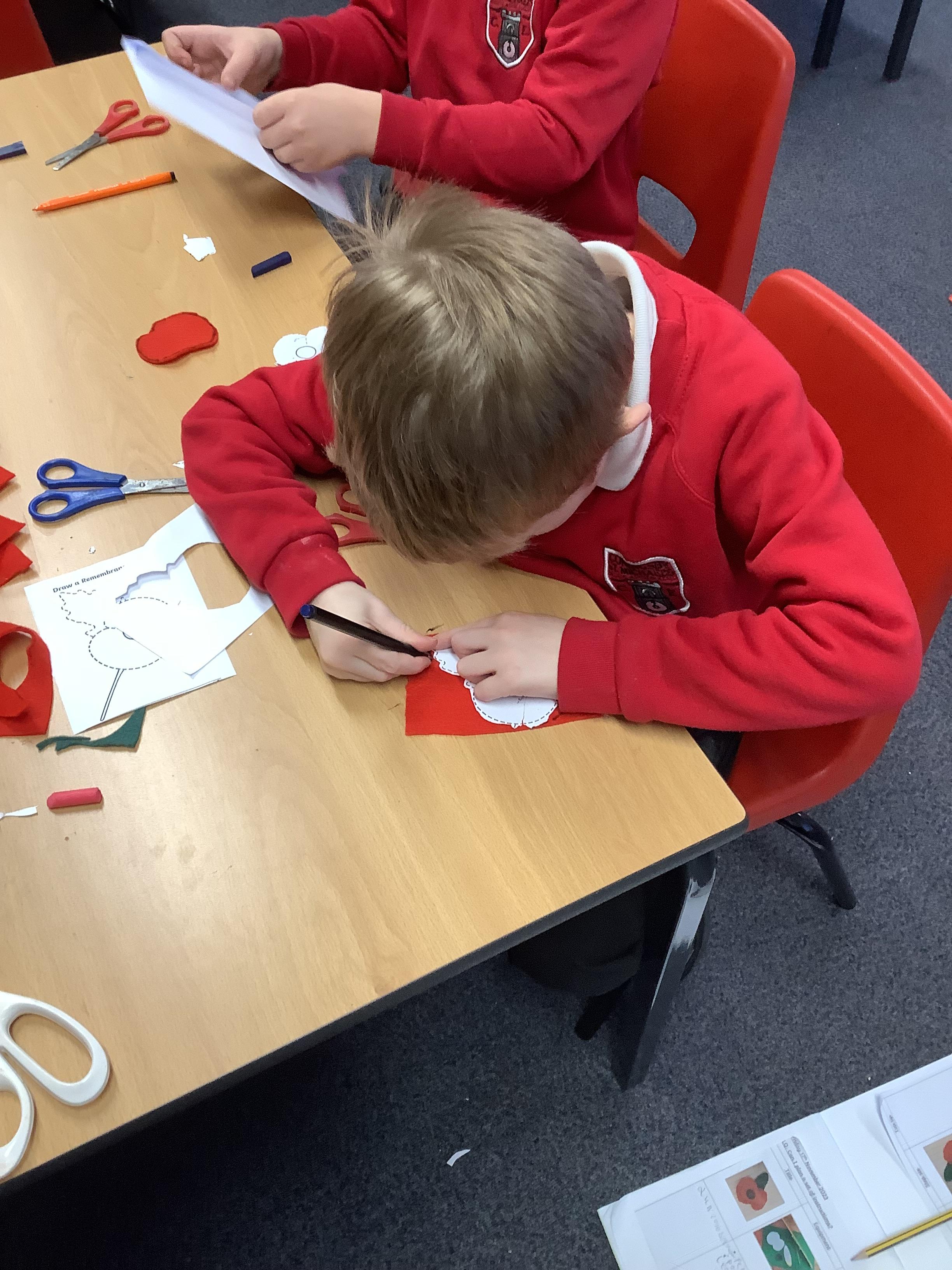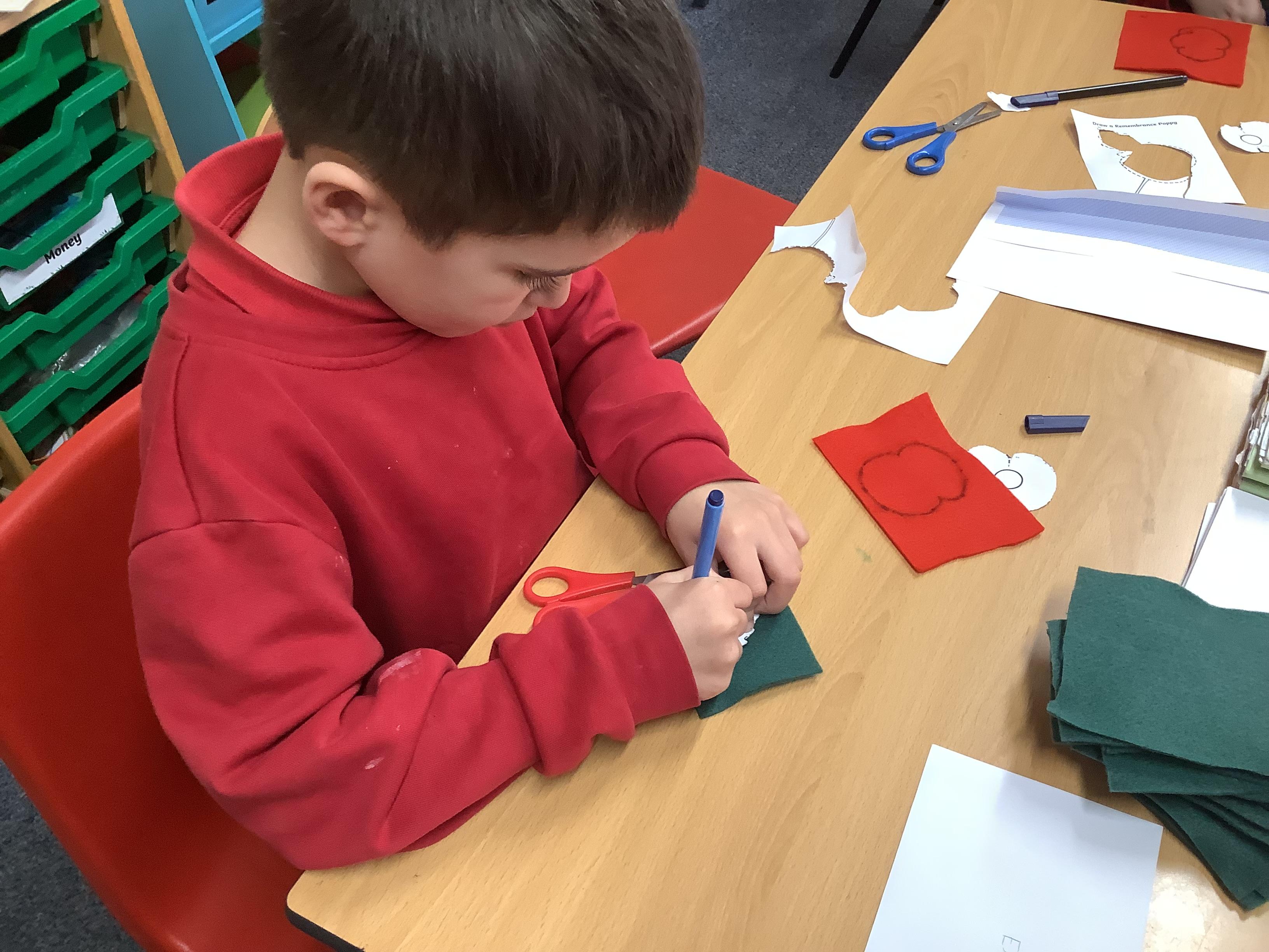 In Design and Technology this week, we started to make our poppies by drawing around templates onto felt and then carefully cutting them out. The children all did a brilliant job!