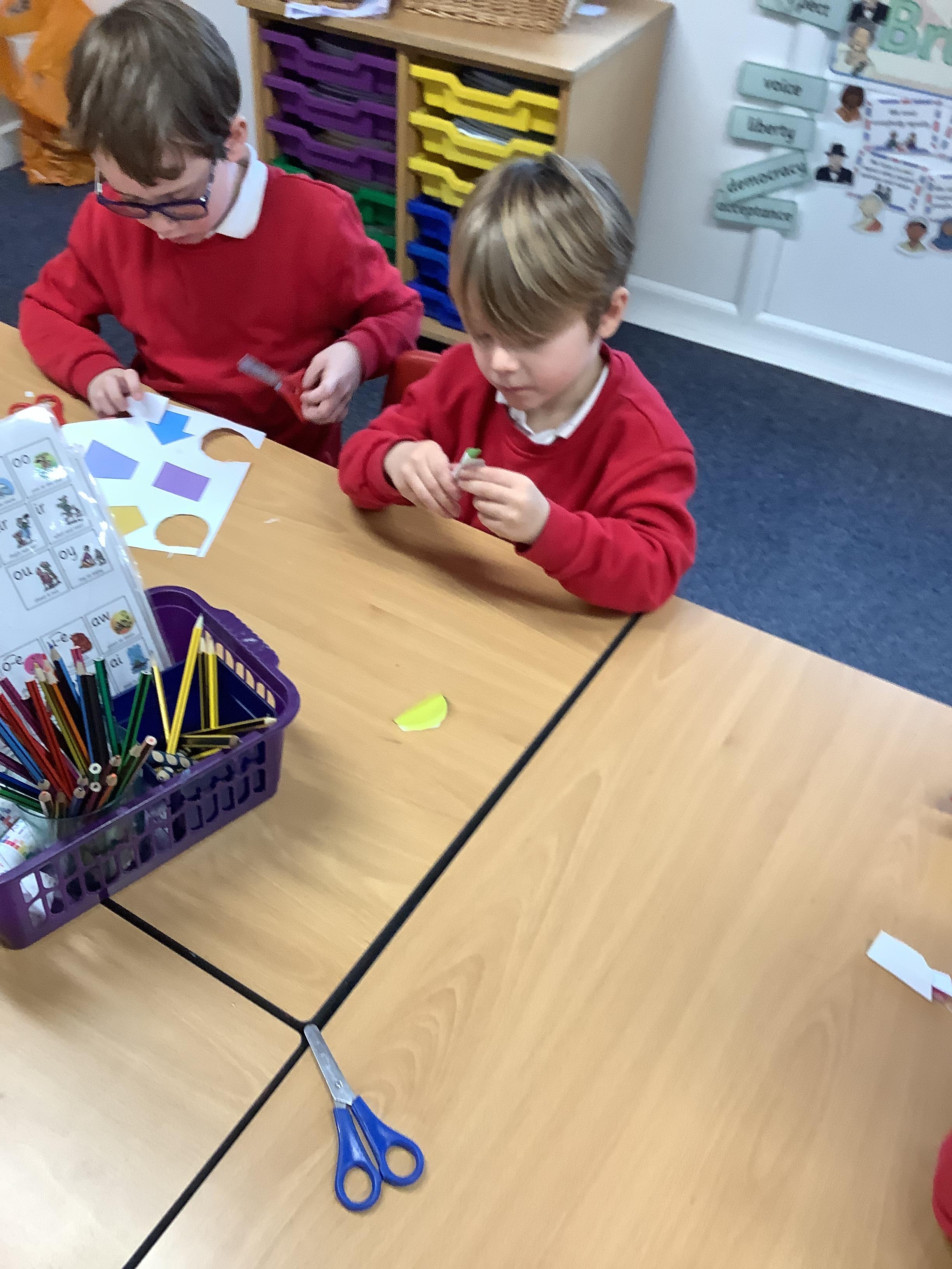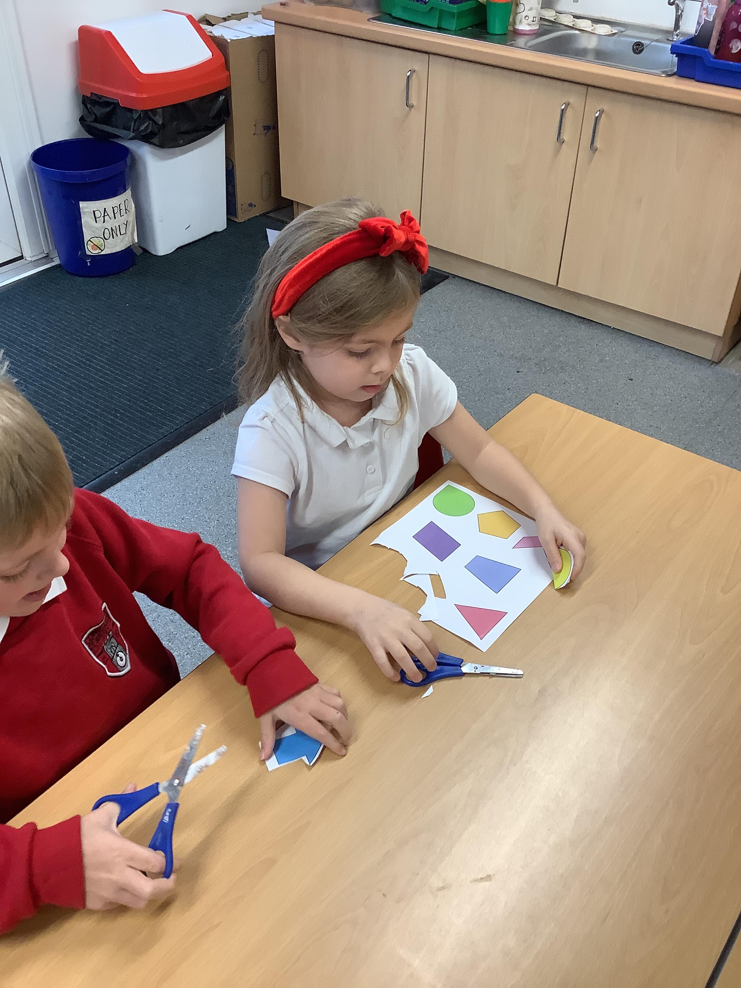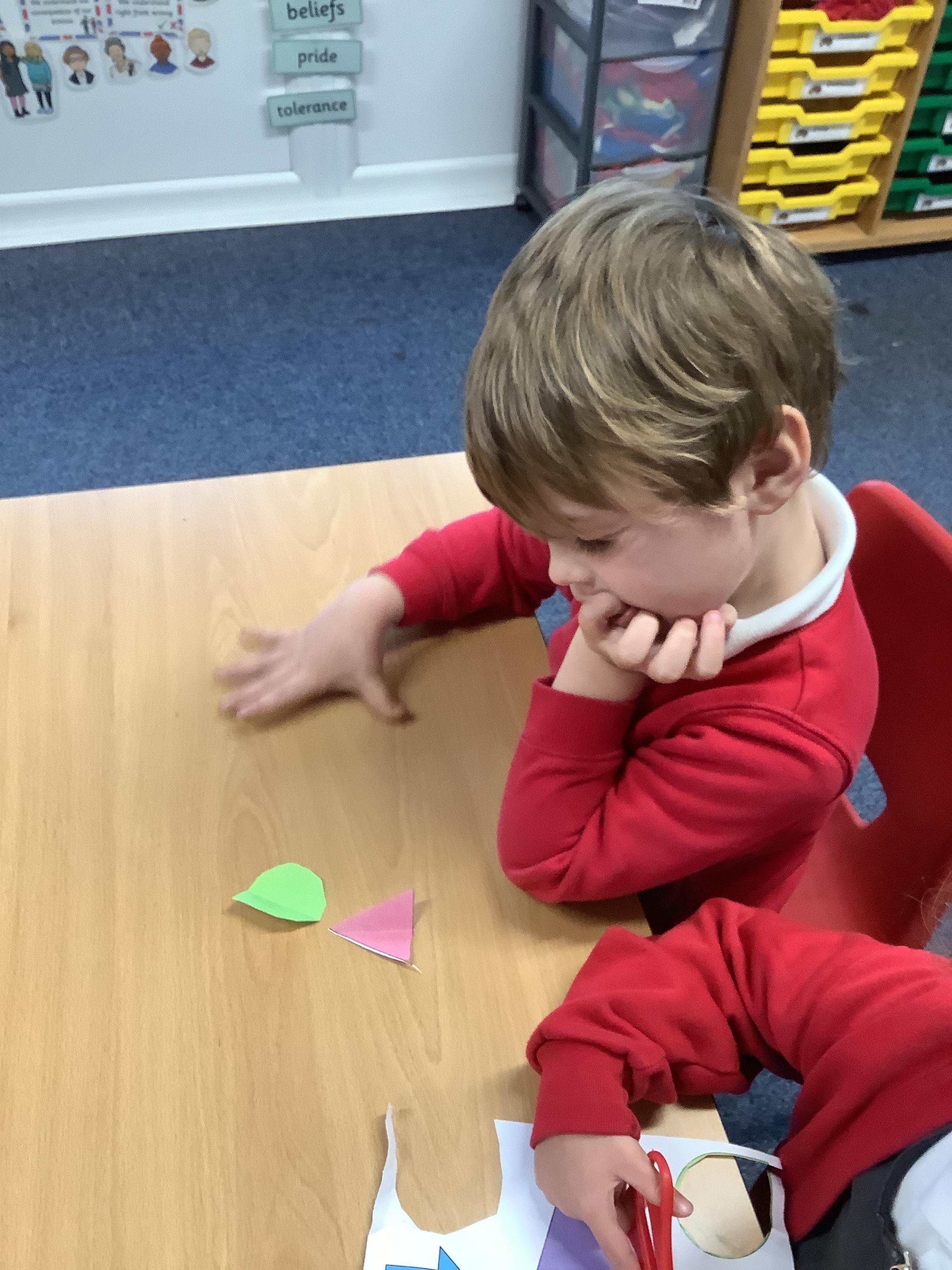 In Maths we explored 2D shapes by finding their line of symmetry. We worked with a partner to cut out and fold the shapes. We looked to see if they were symmetrical and sorted the shapes in to symmetrical and and not symmetrical.
