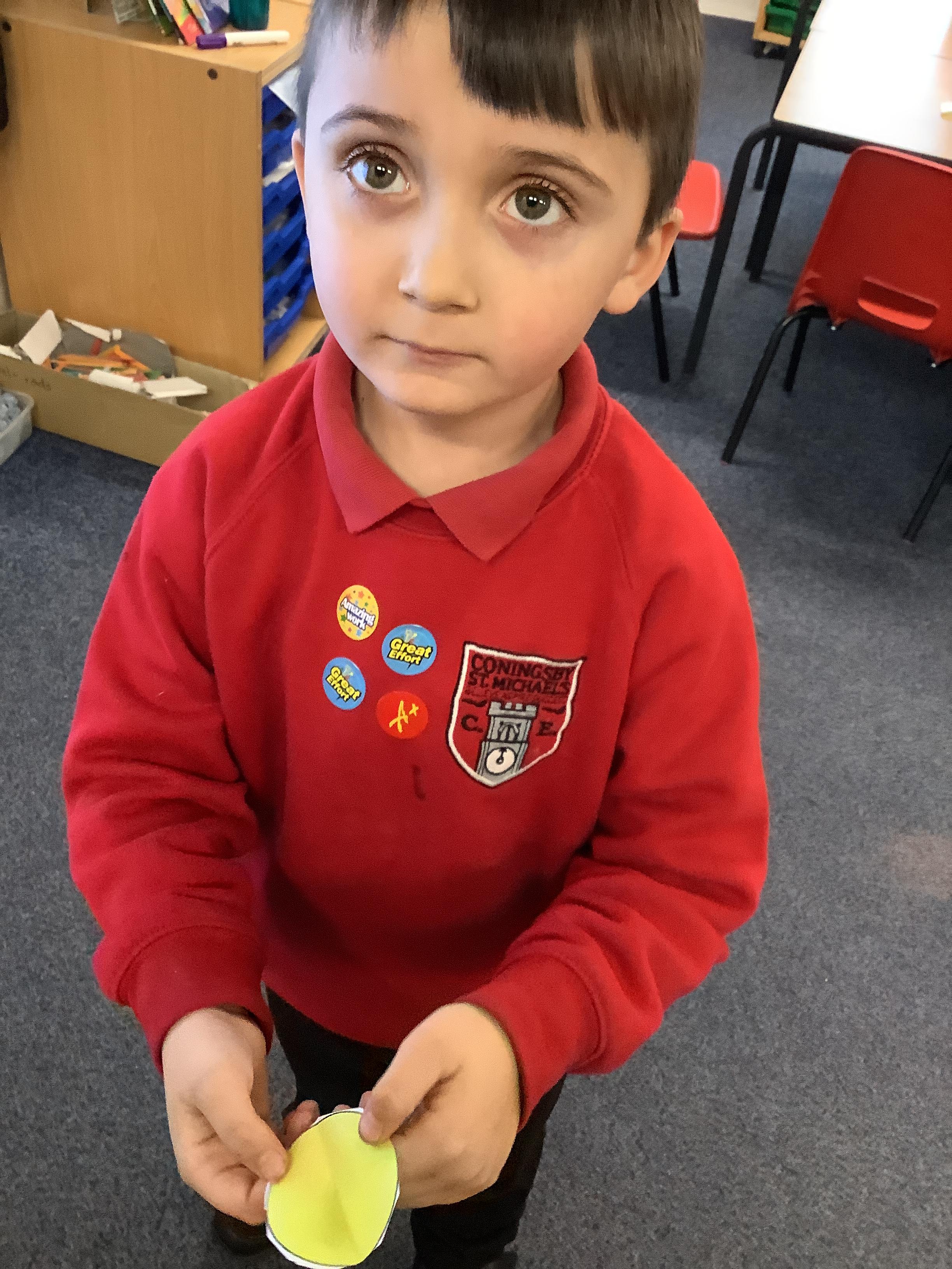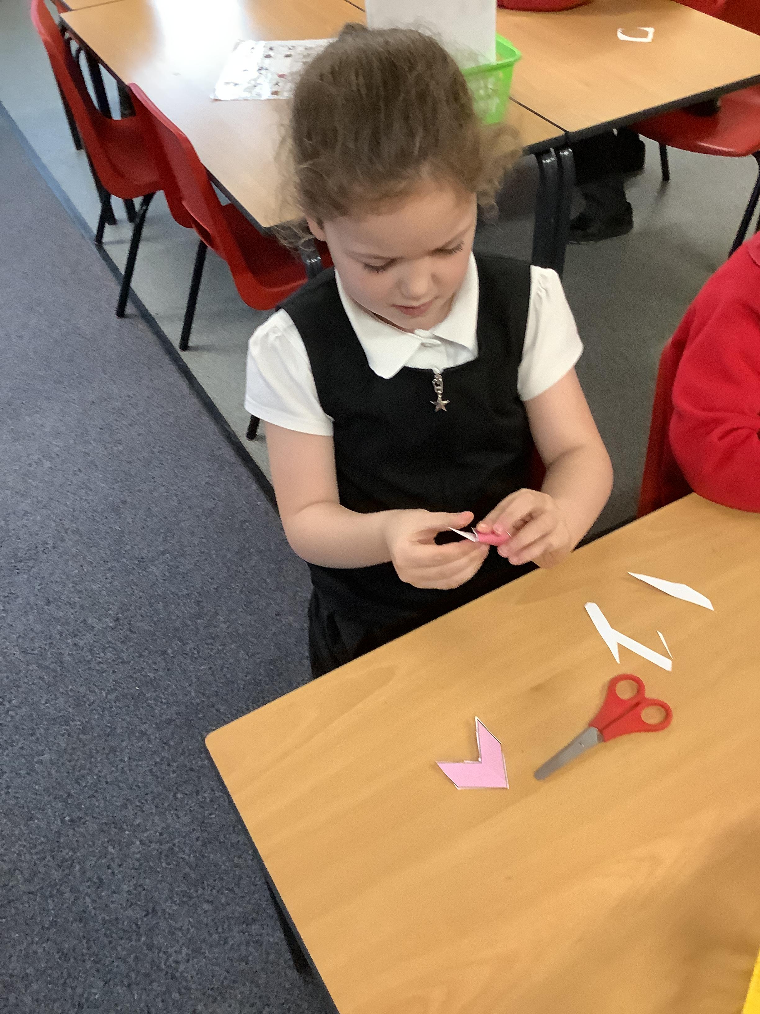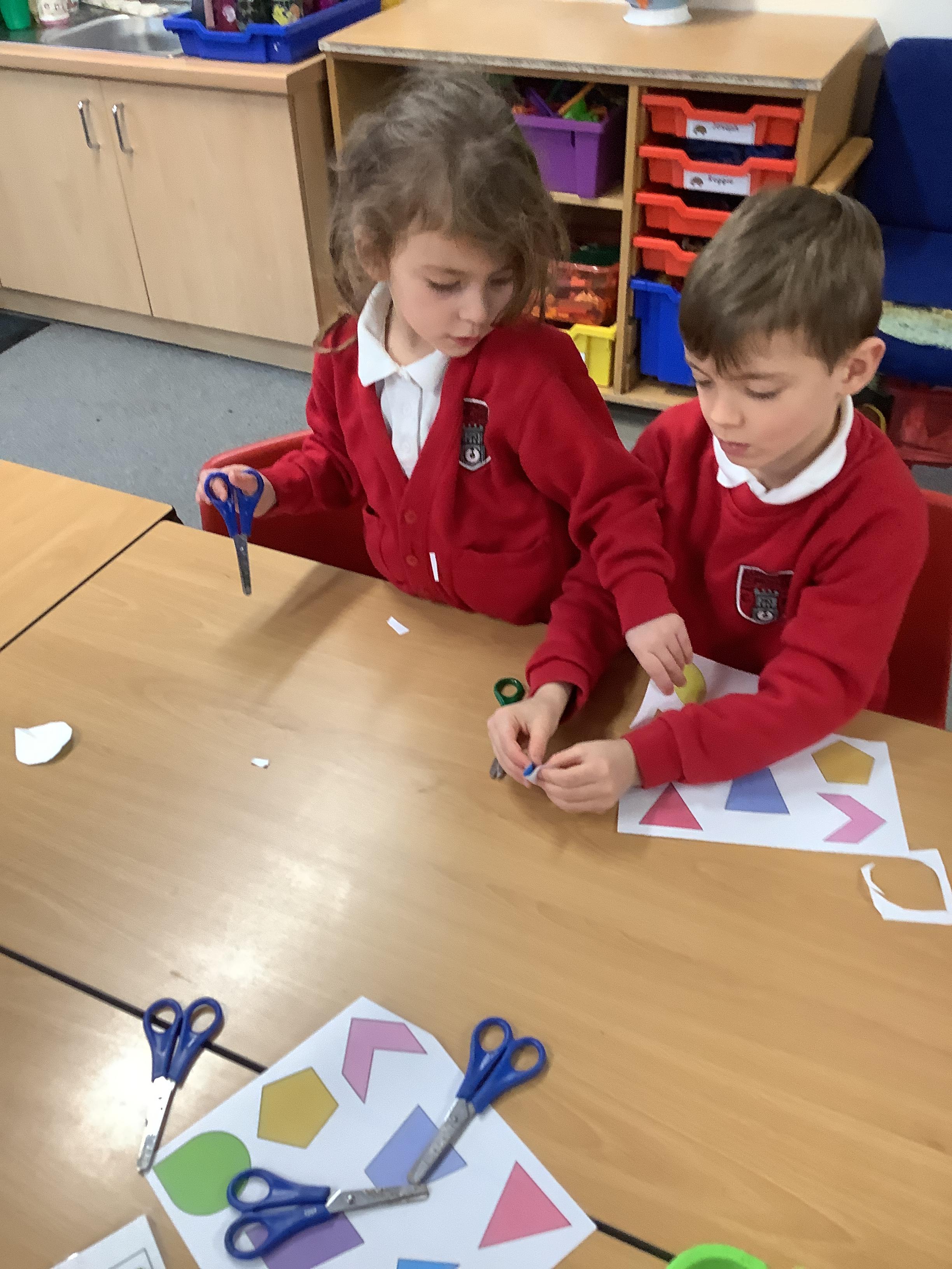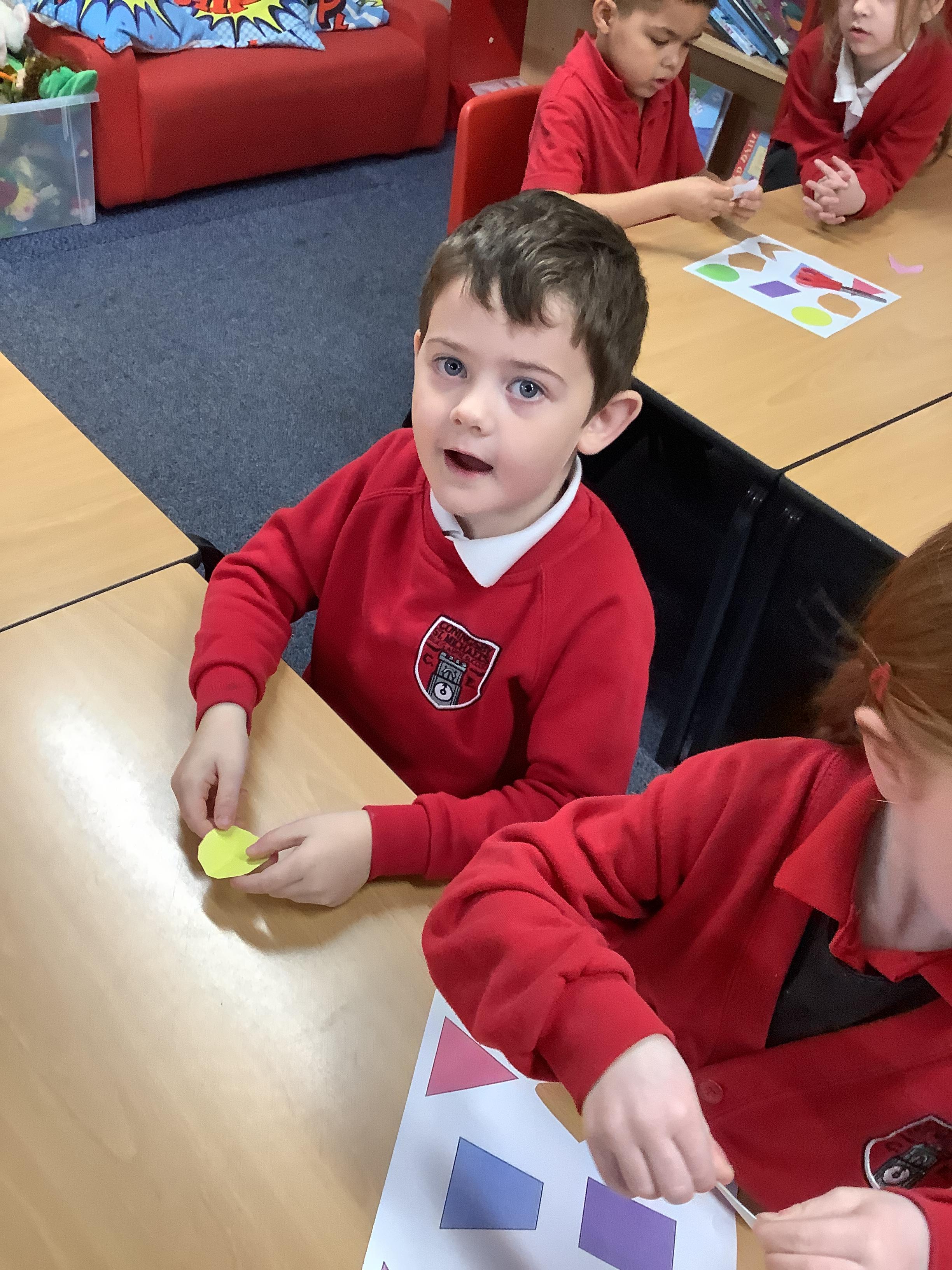 In Maths we explored 2D shapes by finding their line of symmetry. We worked with a partner to cut out and fold the shapes. We looked to see if they were symmetrical and sorted the shapes in to symmetrical and and not symmetrical.