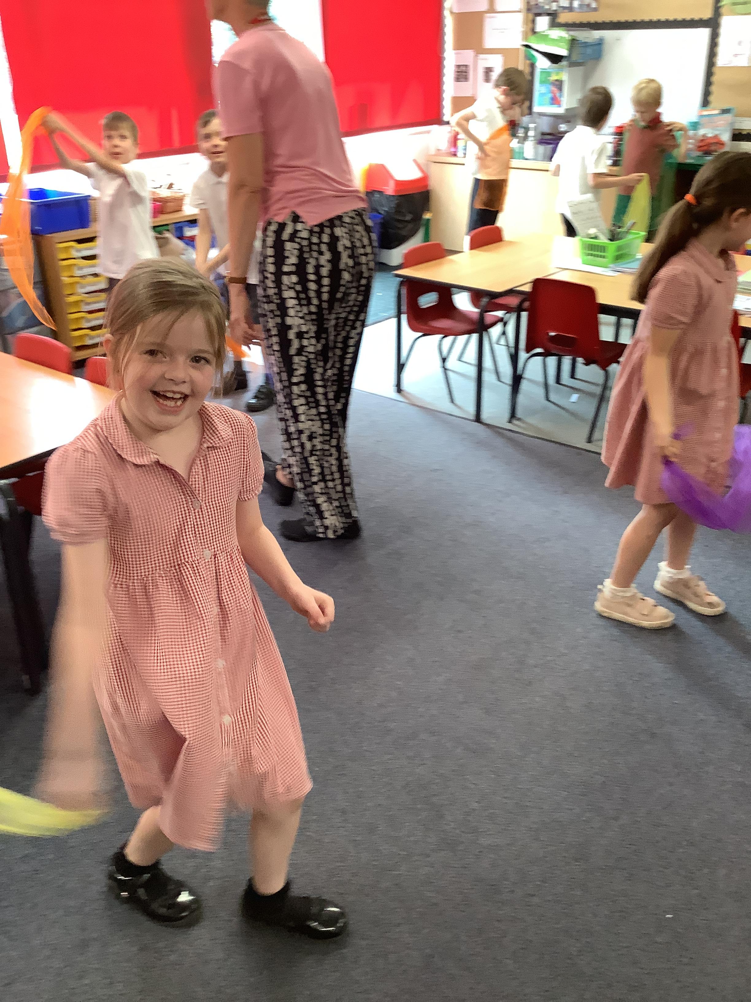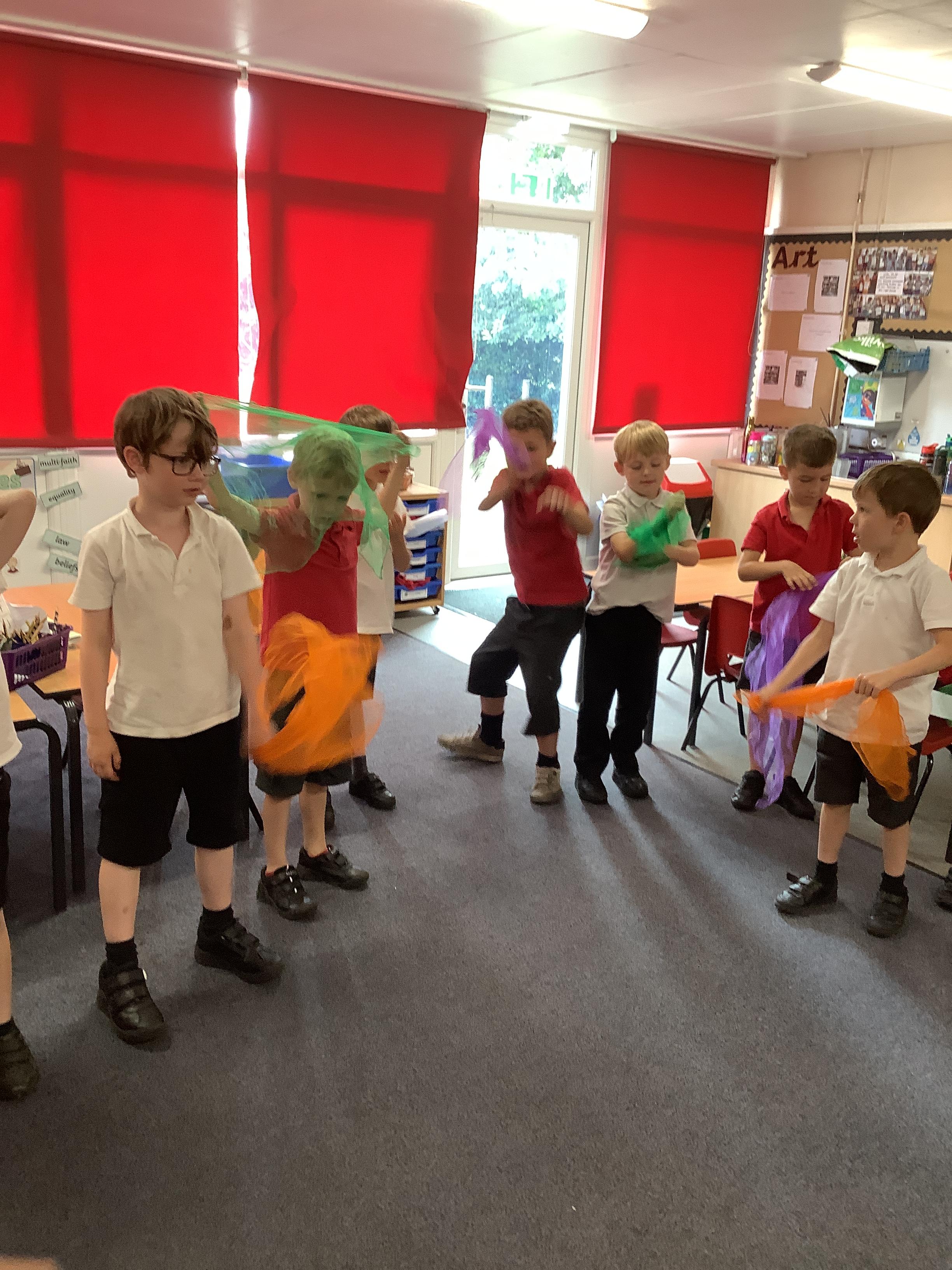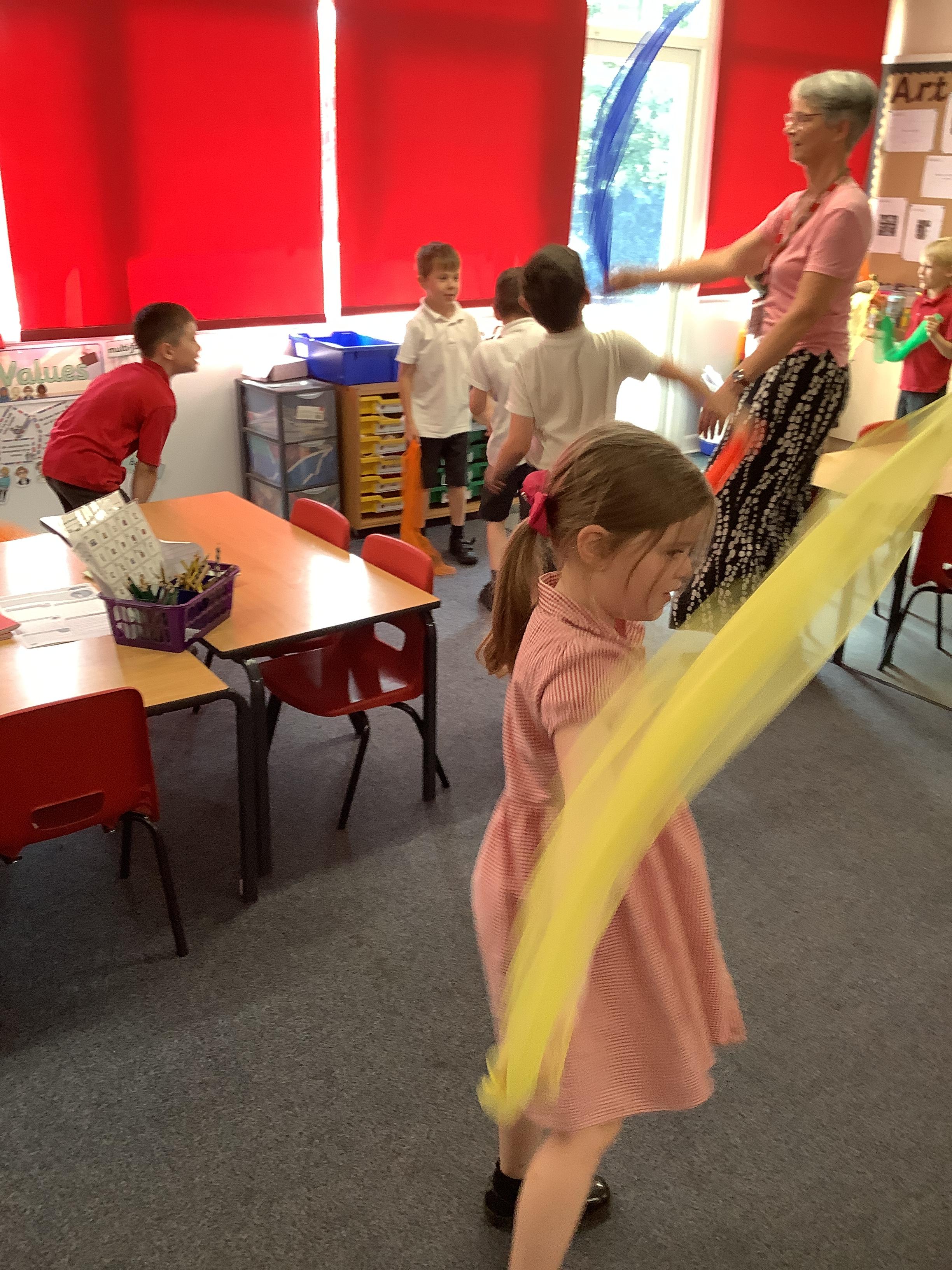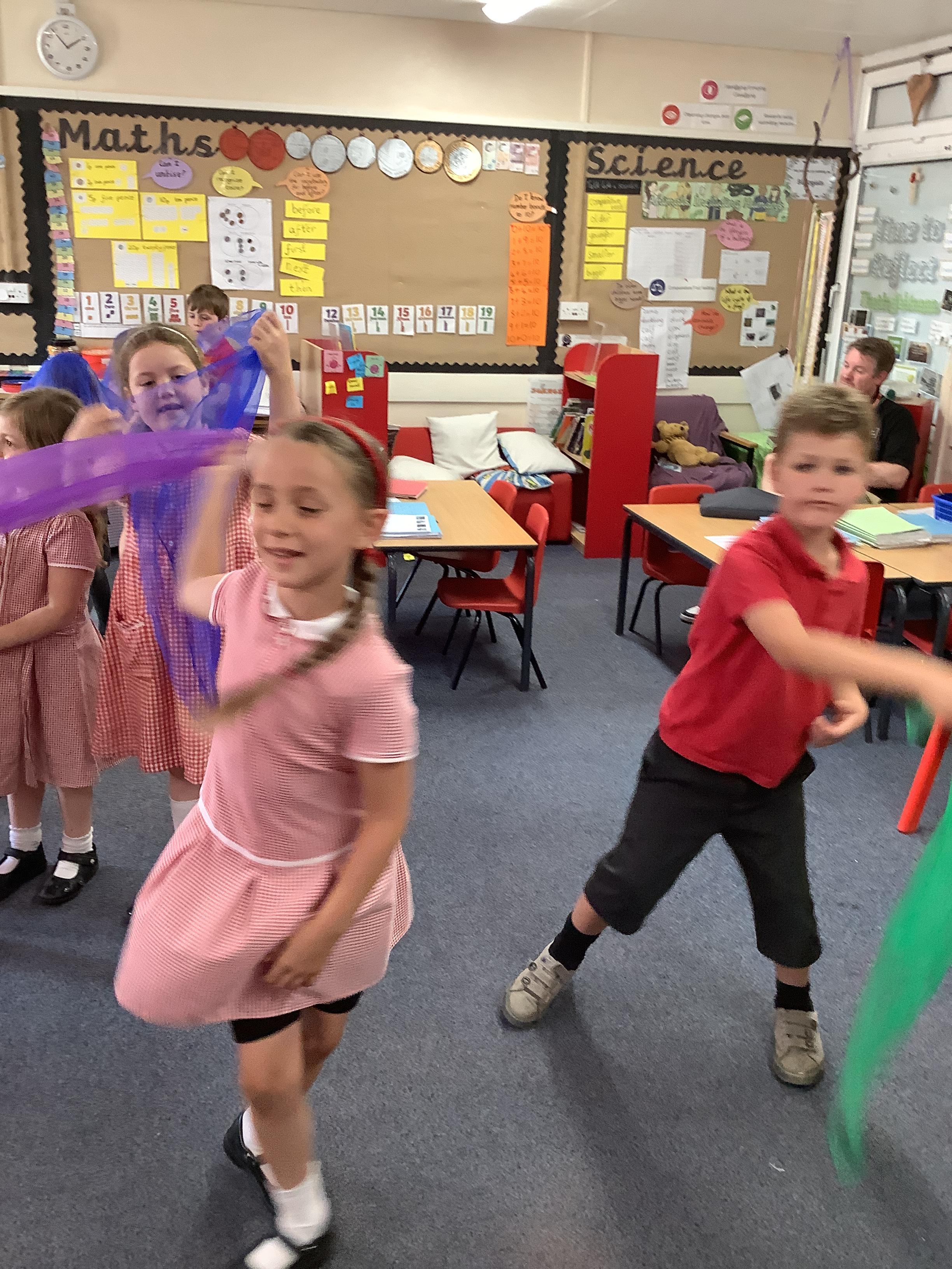 In Music this week we practised everything we have learnt this term, pulse, pitch, rhythm and beat. We also responded to a piece of music called the flower dance by dancing with scarves.