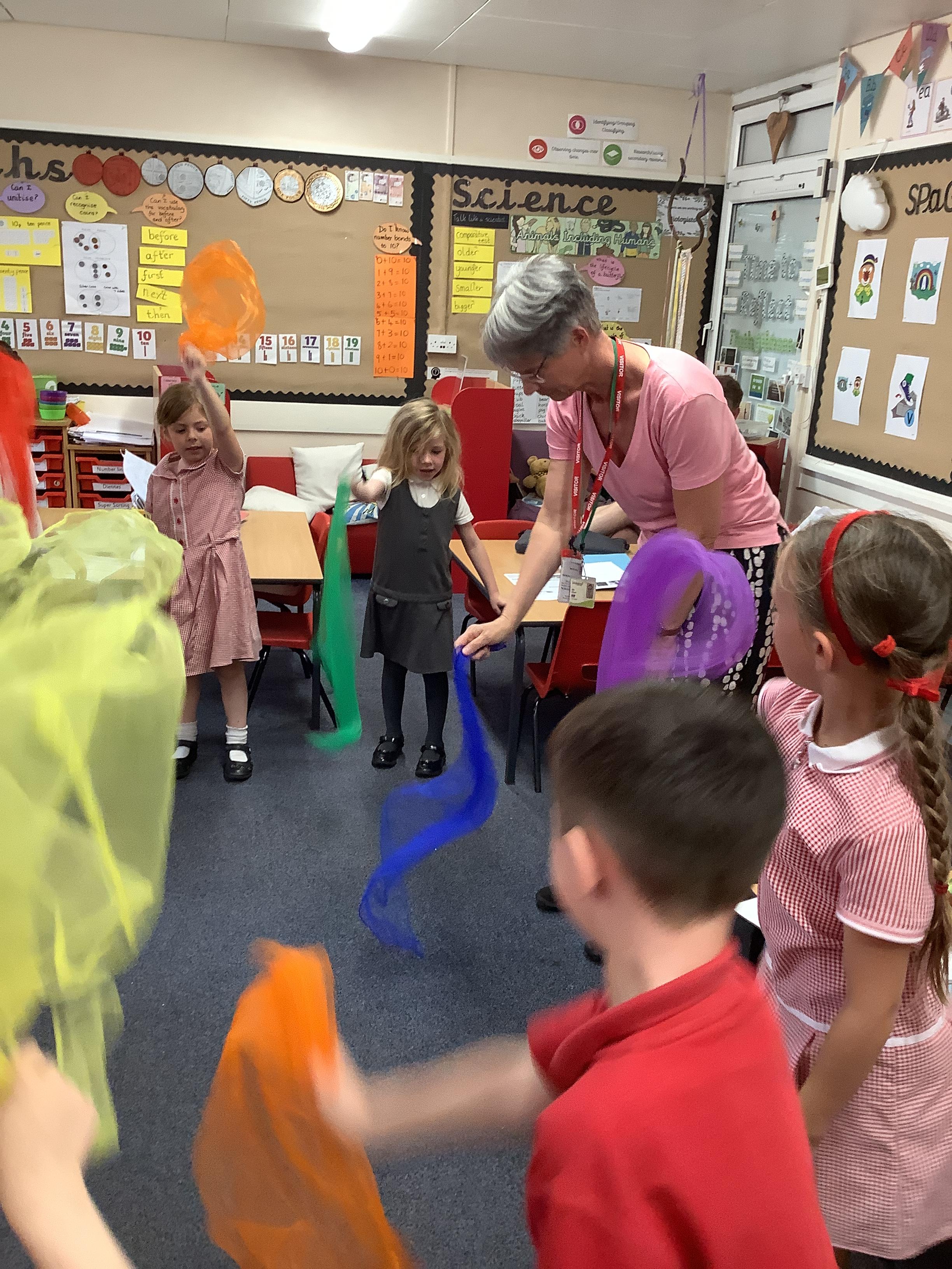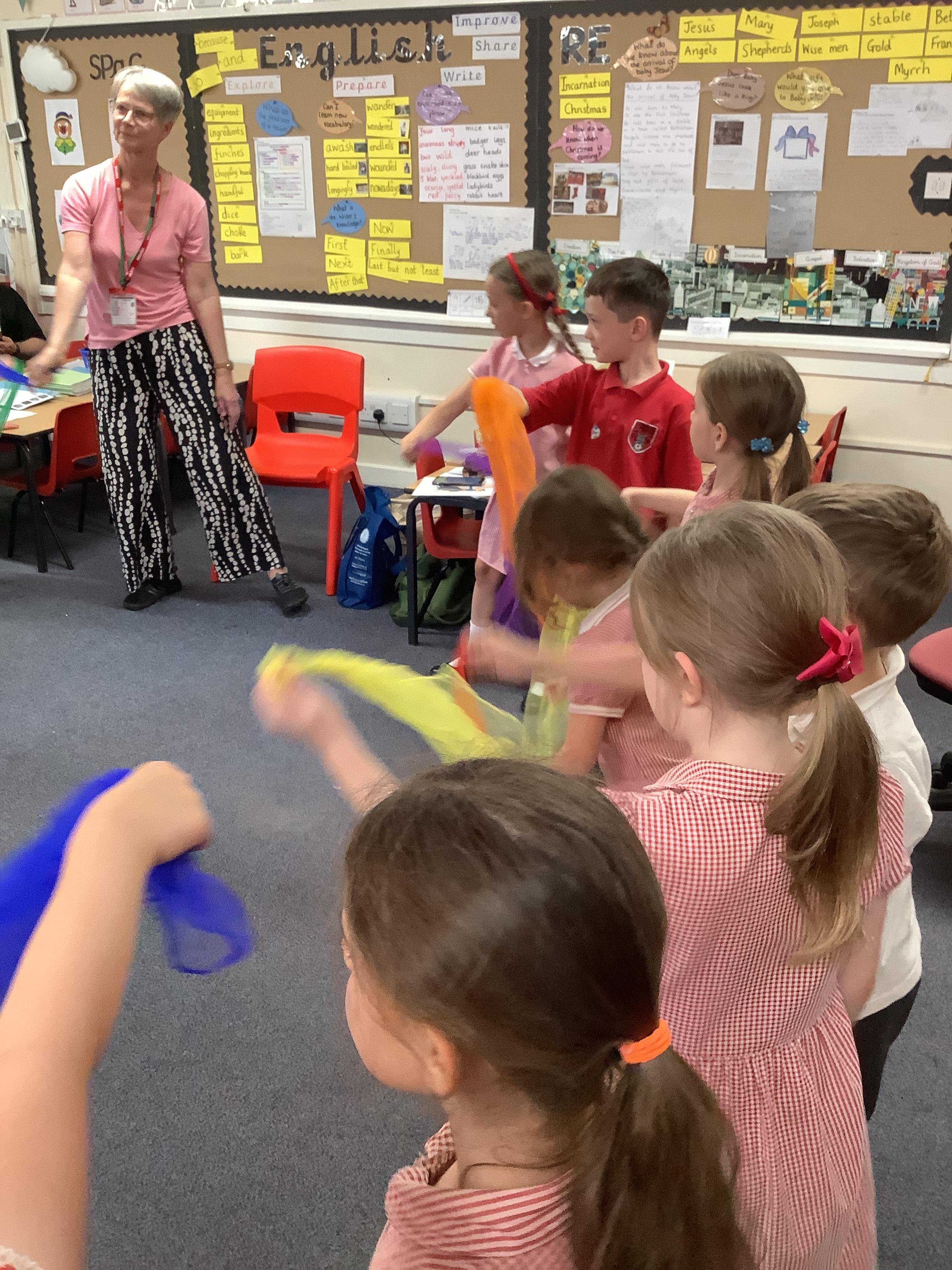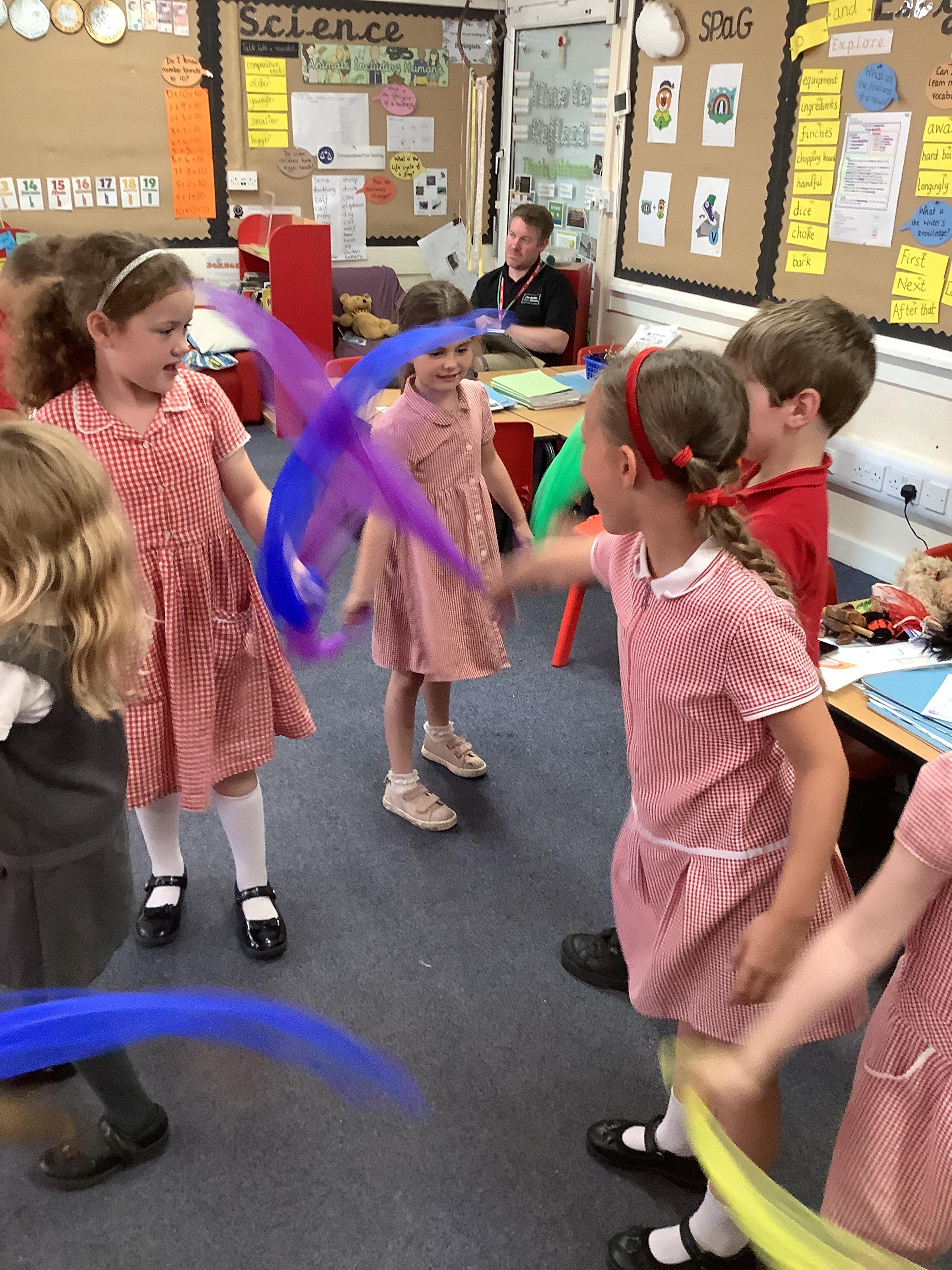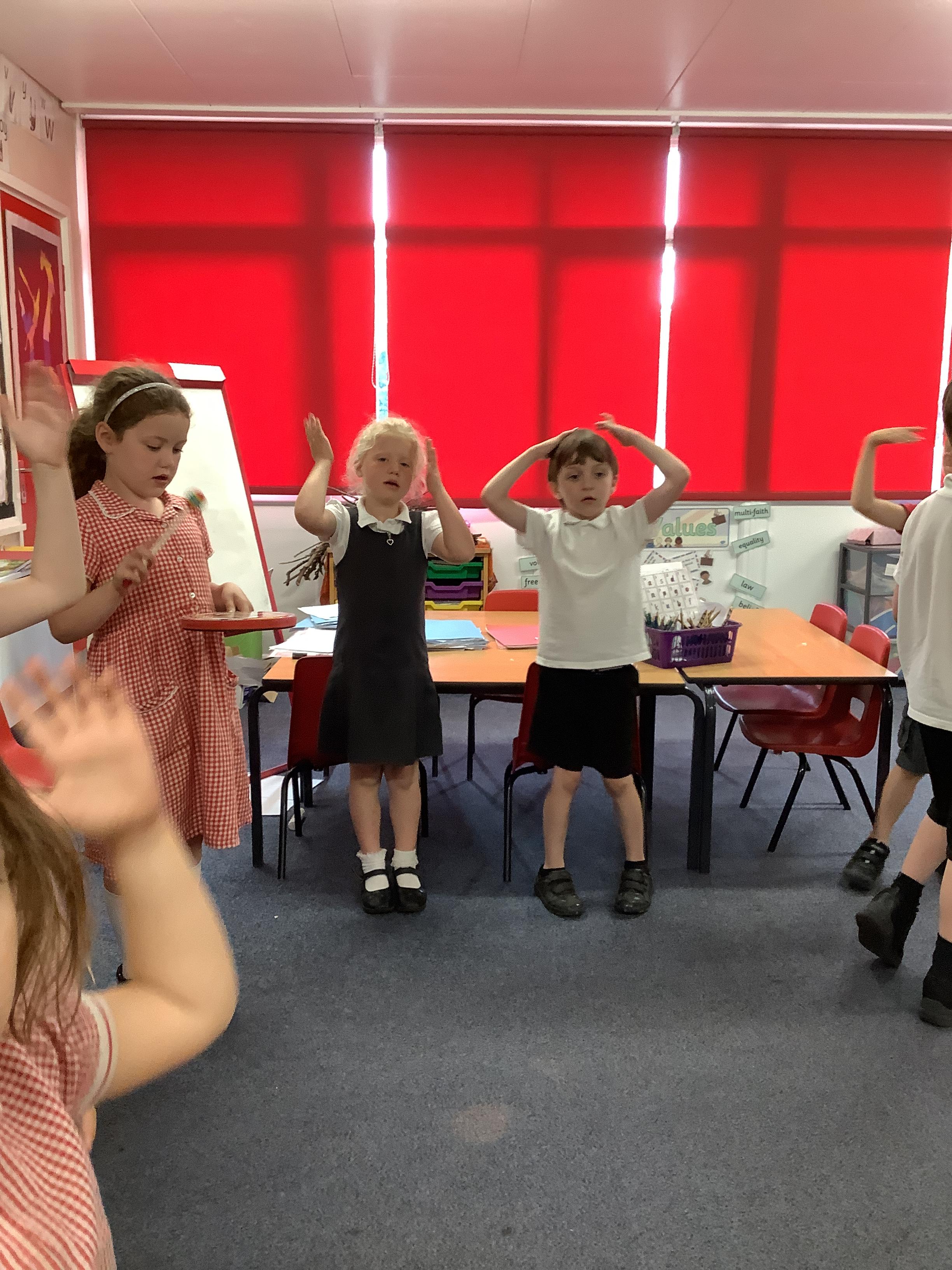 In Music this week we practised everything we have learnt this term, pulse, pitch, rhythm and beat. We also responded to a piece of music called the flower dance by dancing with scarves.