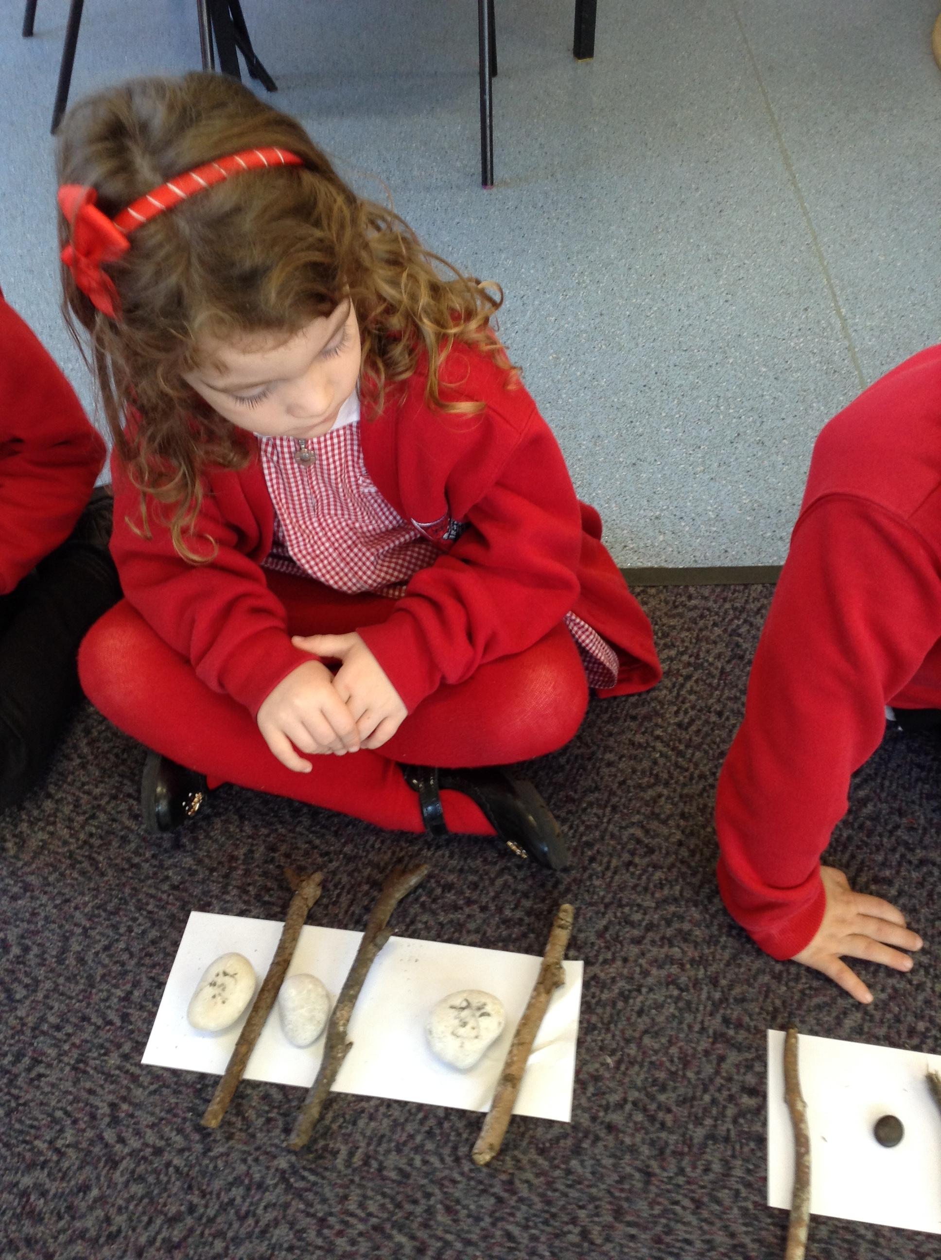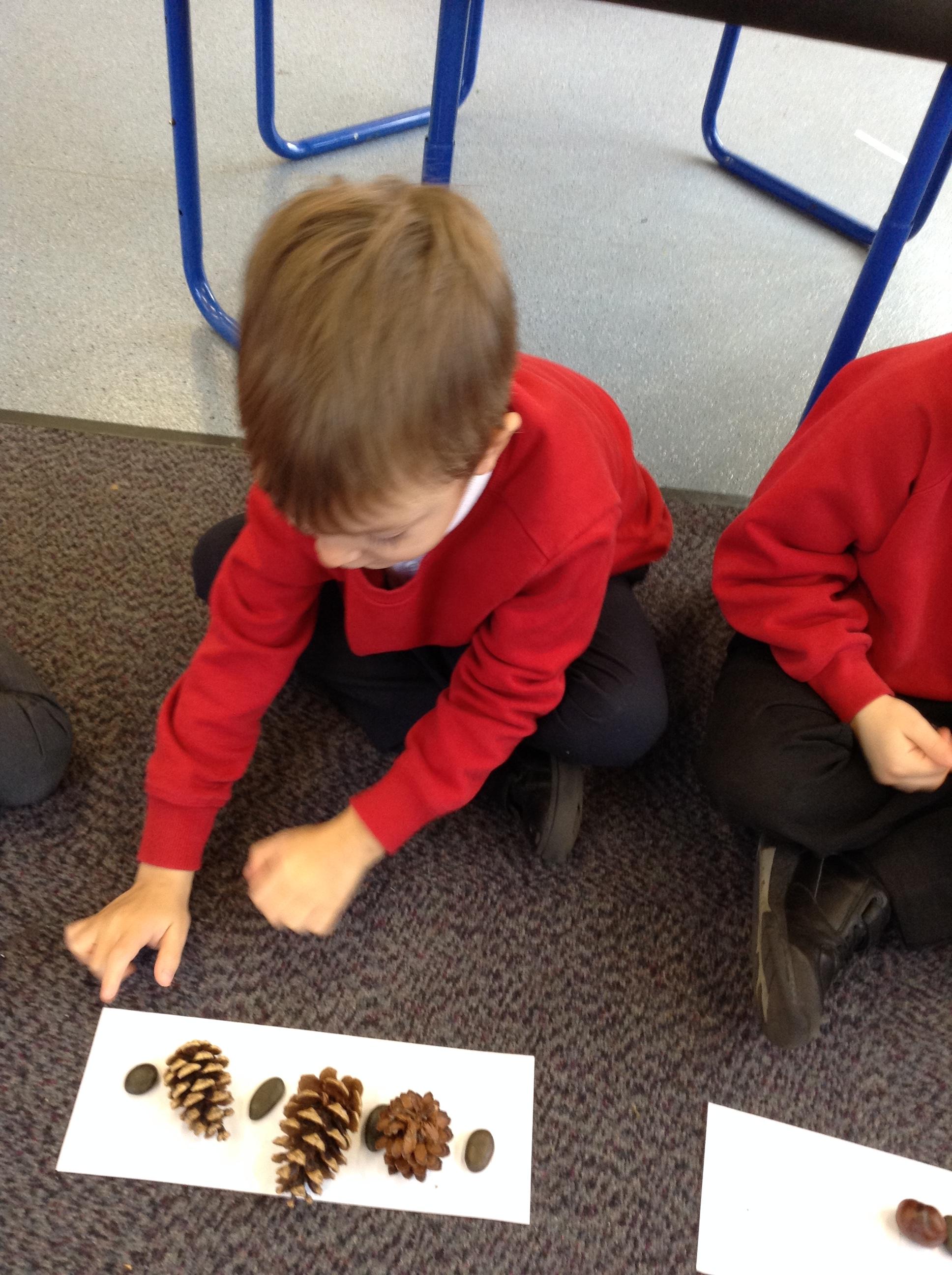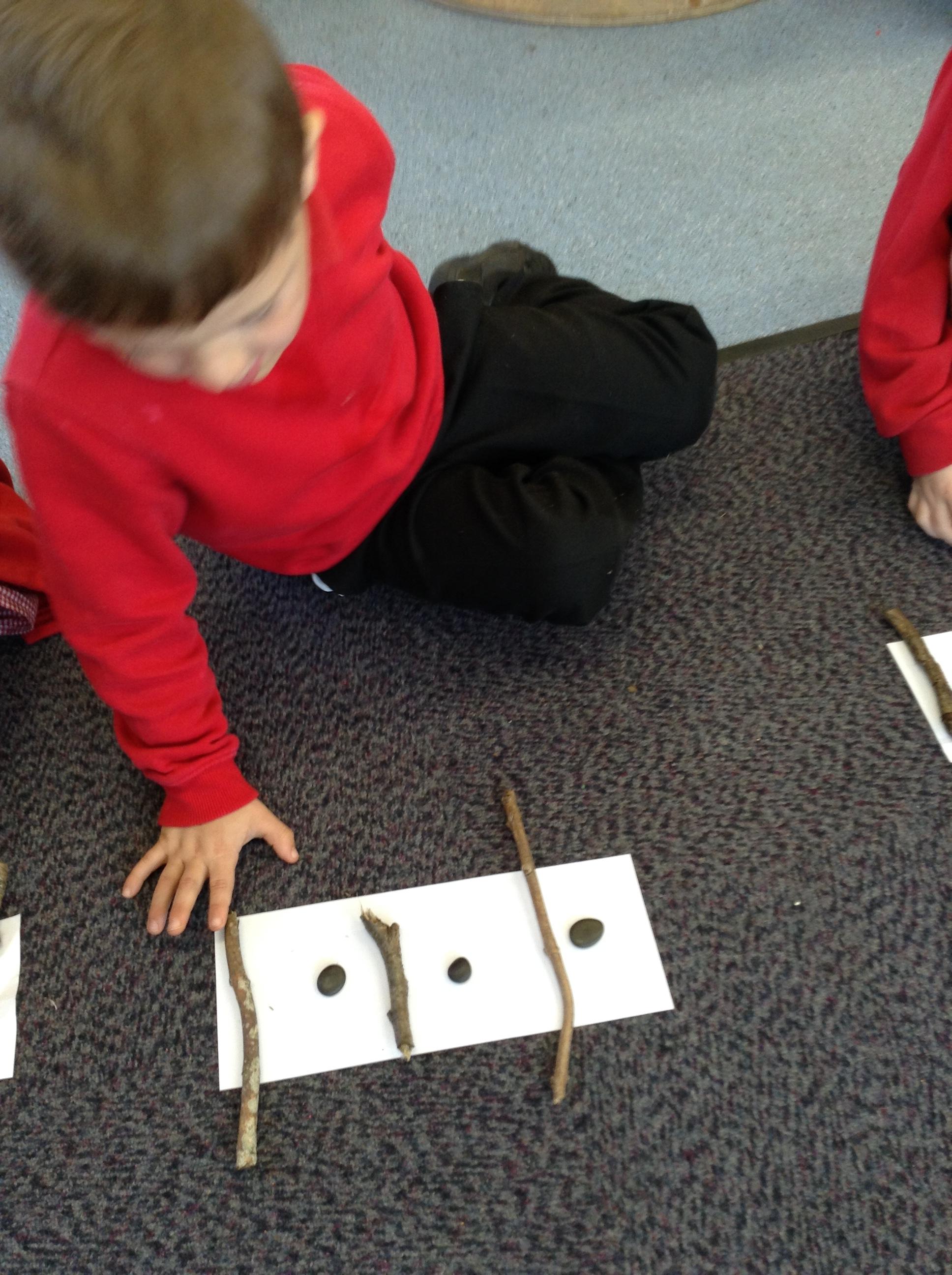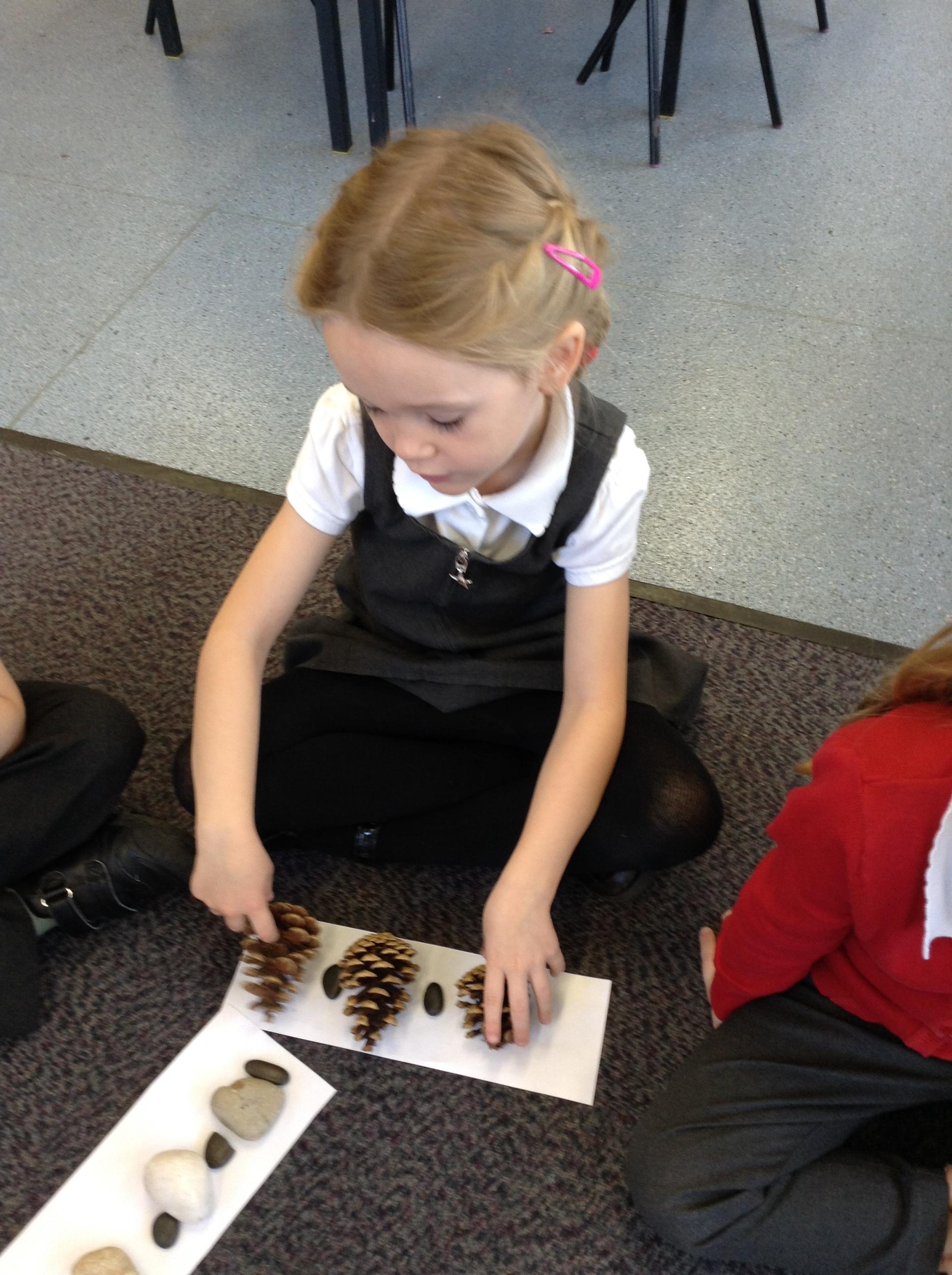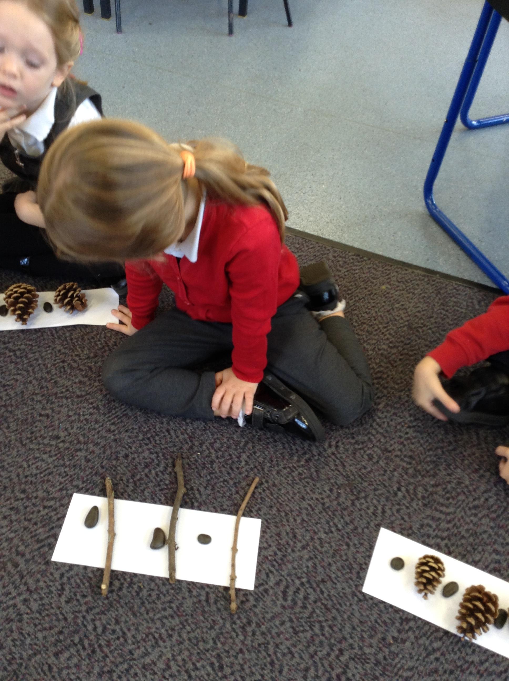 In maths this week we have been using natural objects to make repeating patterns. The children have been creating AB patterns and spotting mistakes and correcting them. Some of the children have gone on to create their own ABC patterns using 3 different objects.