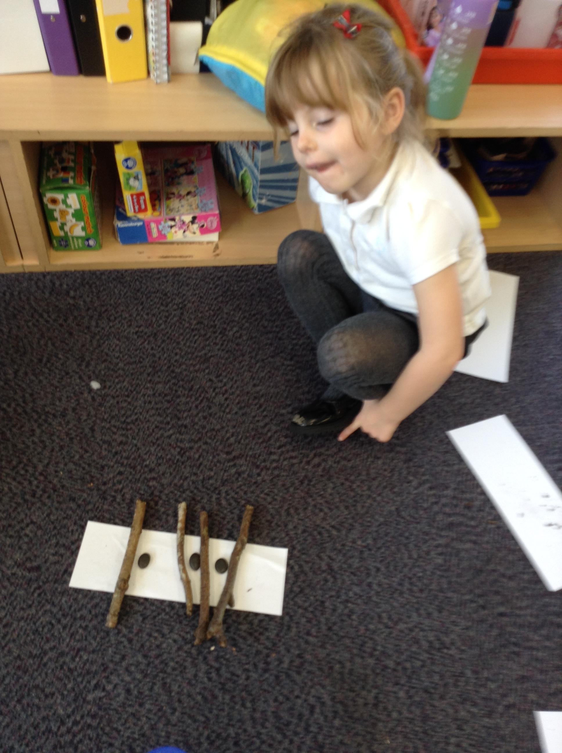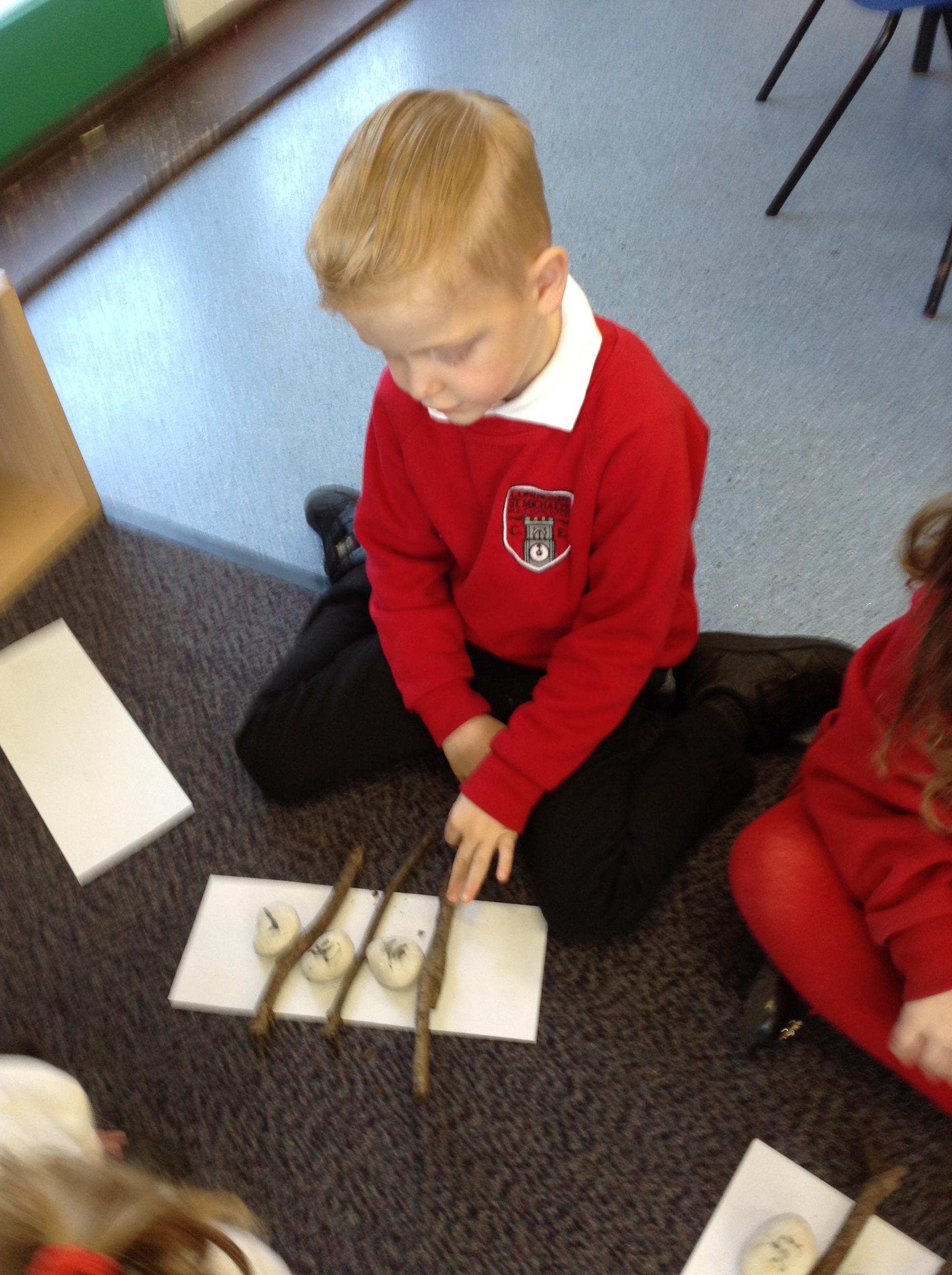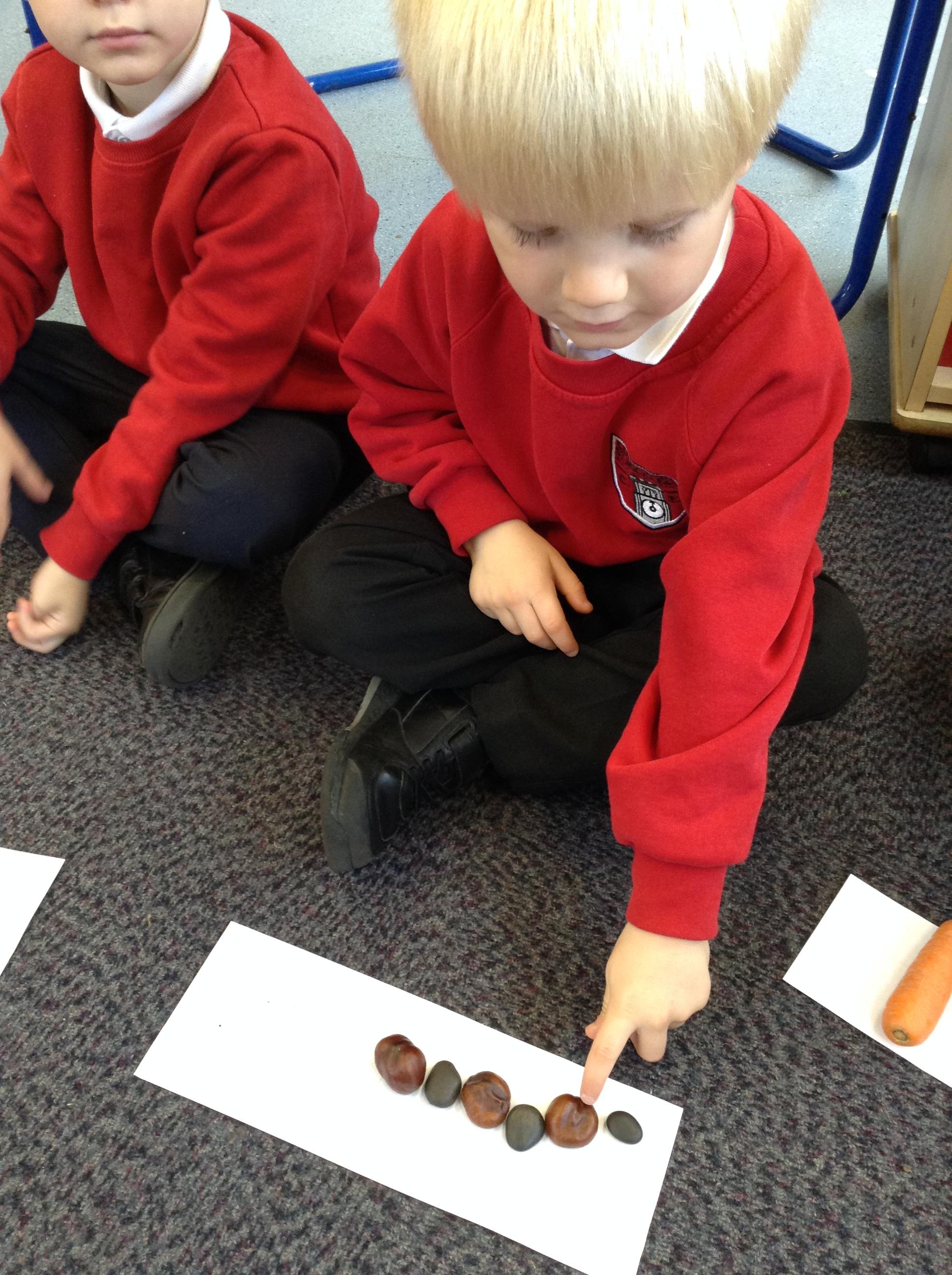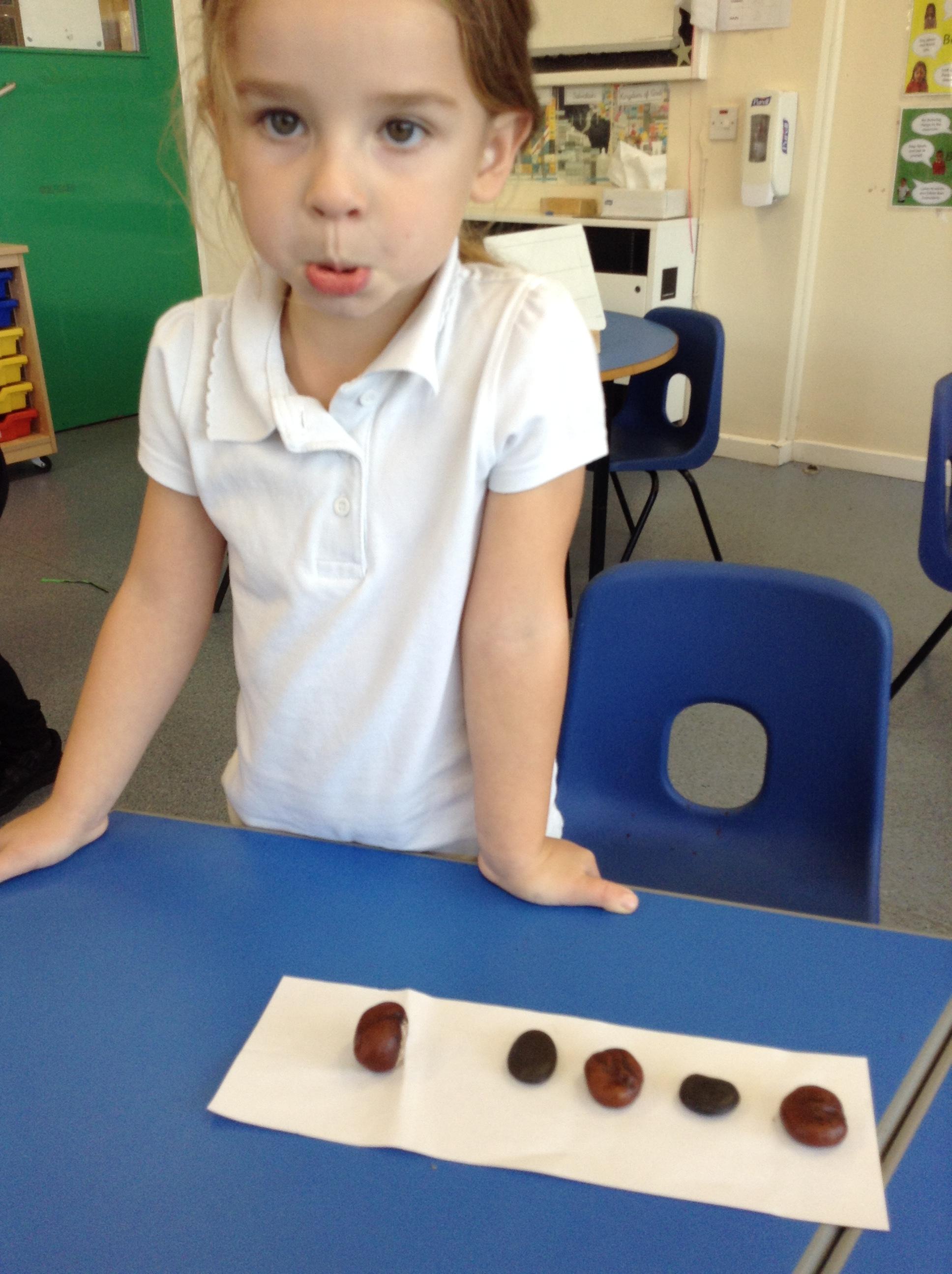In maths this week we have been using natural objects to make repeating patterns. The children have been creating AB patterns and spotting mistakes and correcting them. Some of the children have gone on to create their own ABC patterns using 3 different objects.
