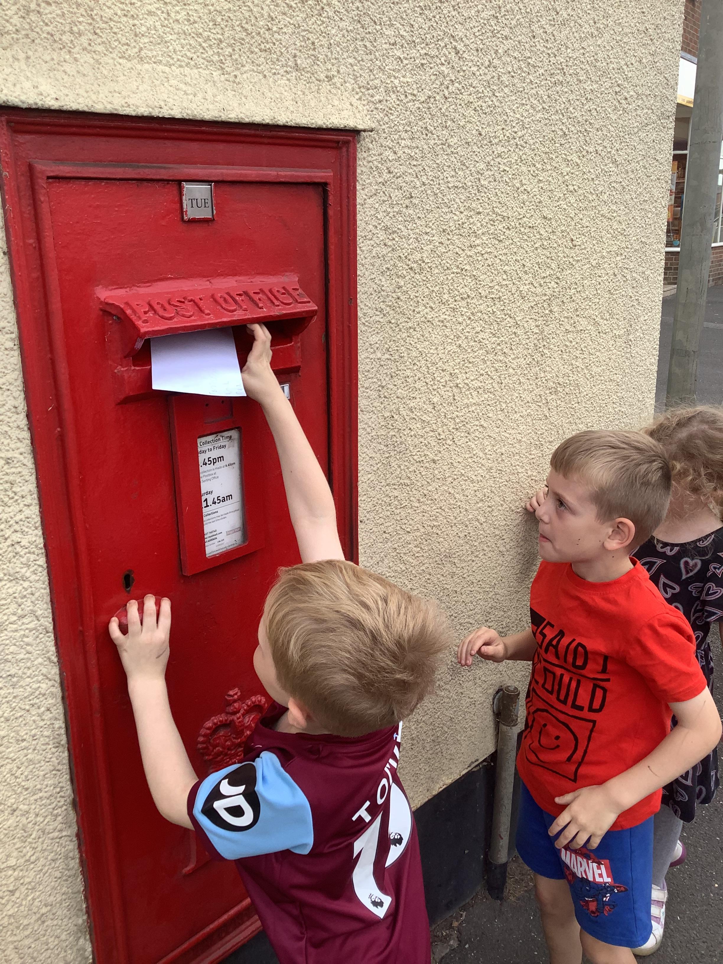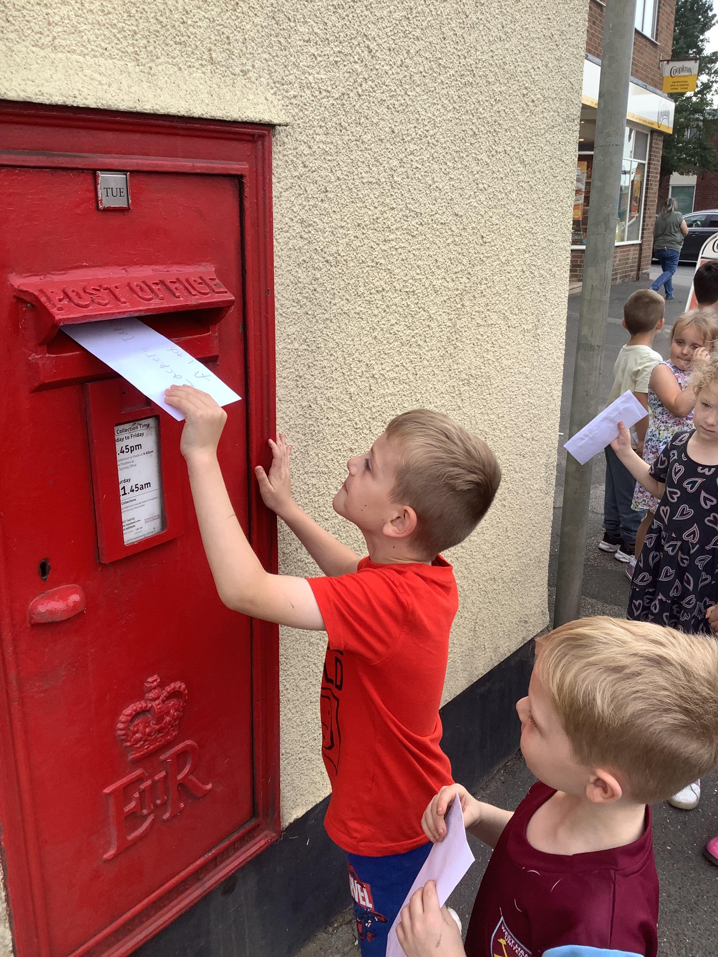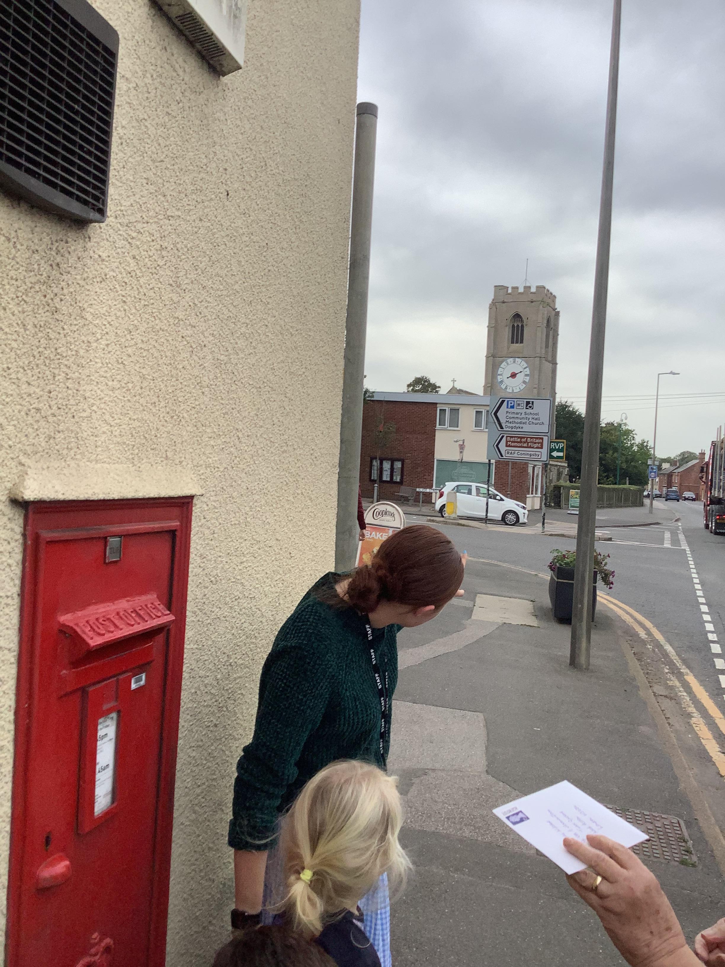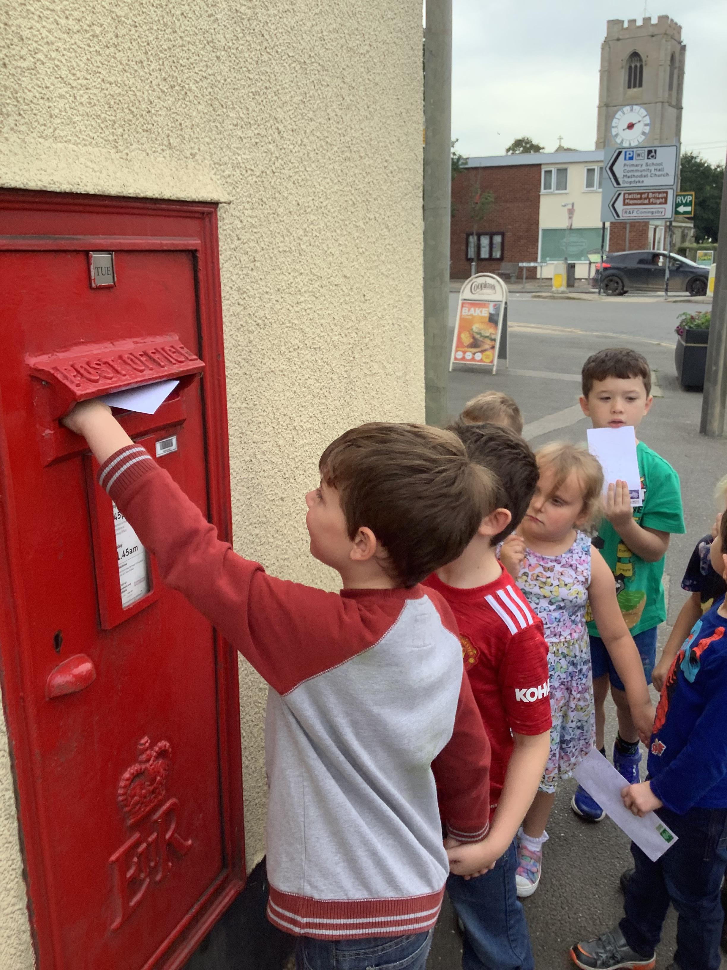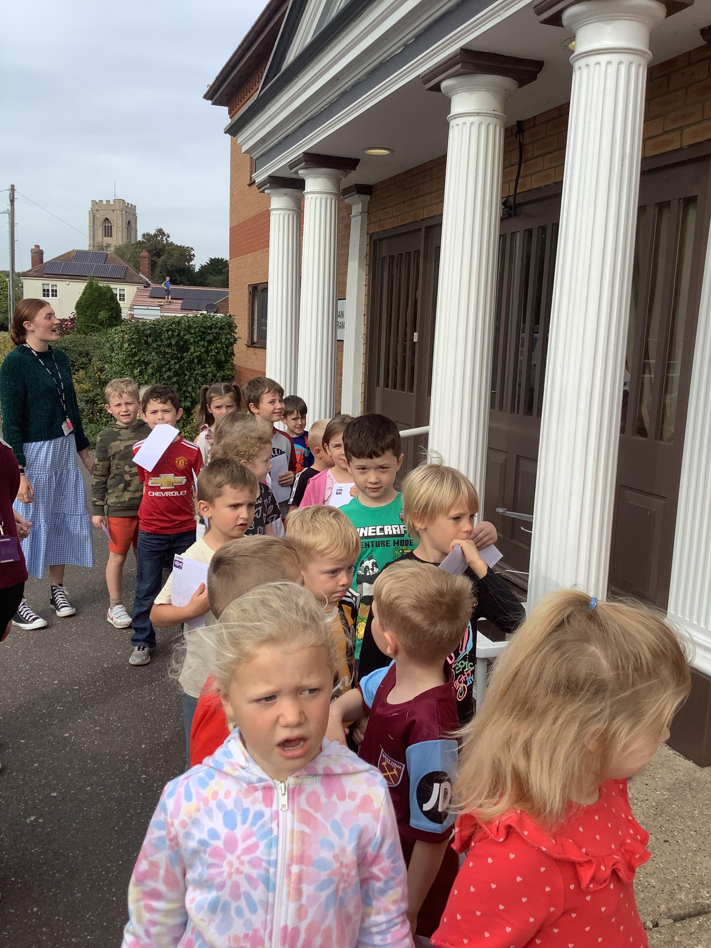 Today we went on a Geography field trip. We looked at the human features of Coningsby like the doctors surgery, churches, shops, roads etc. We stopped at the post office to deliver our letters. We also found some crunchy Autumn leaves which was perfect as we're talking about Autumn in Science later this week. When we got back to class we drew a map of our route.