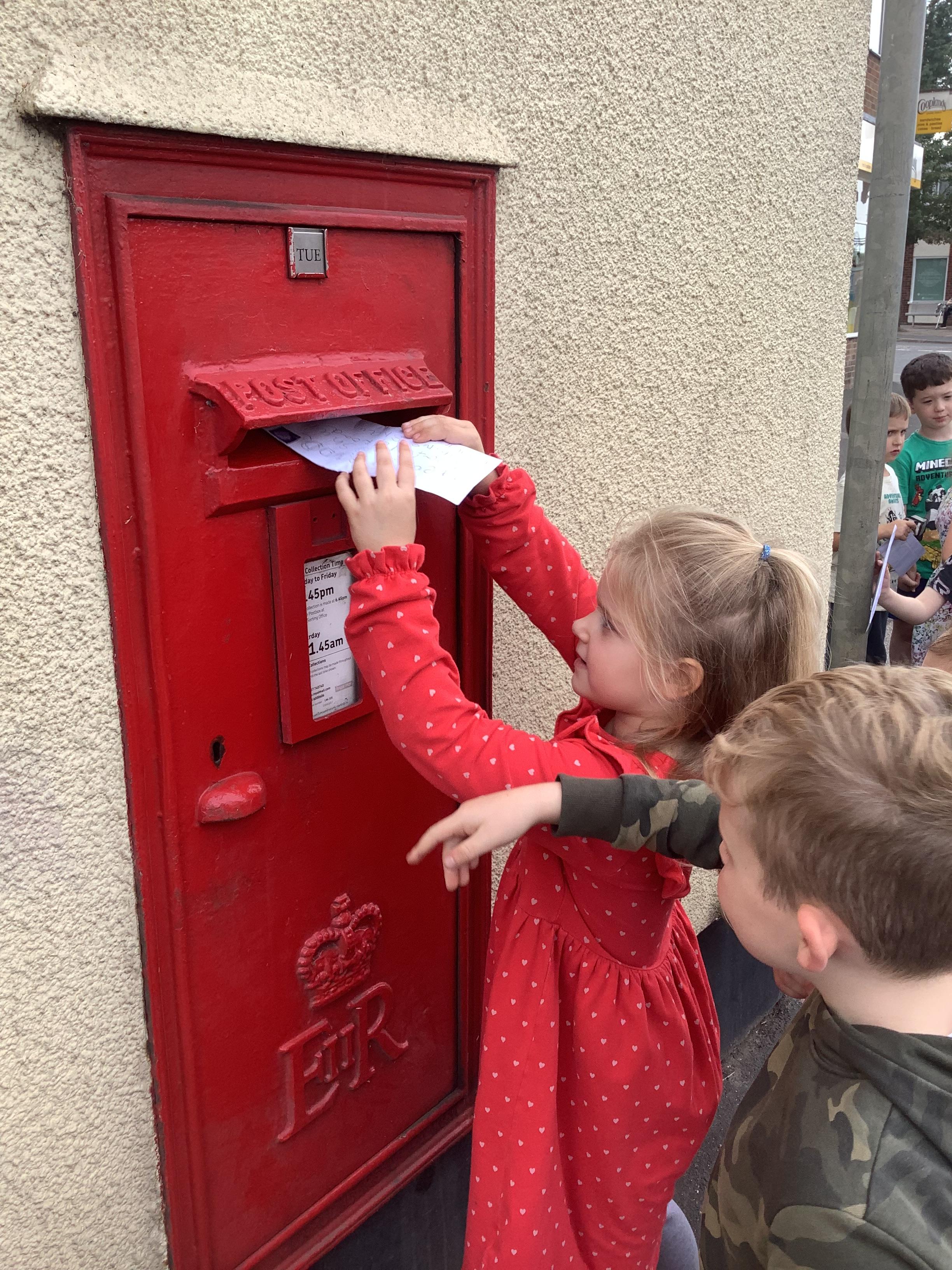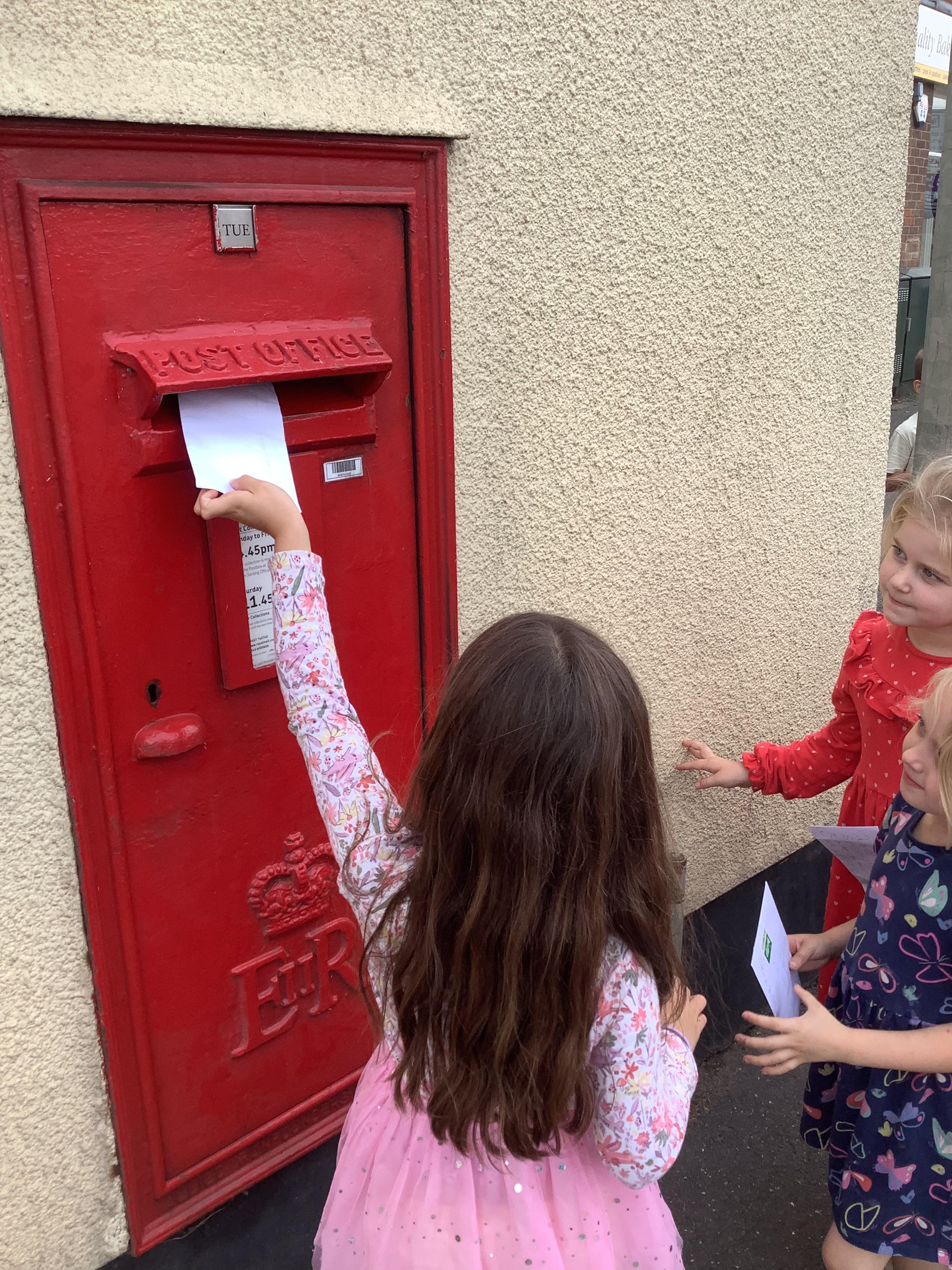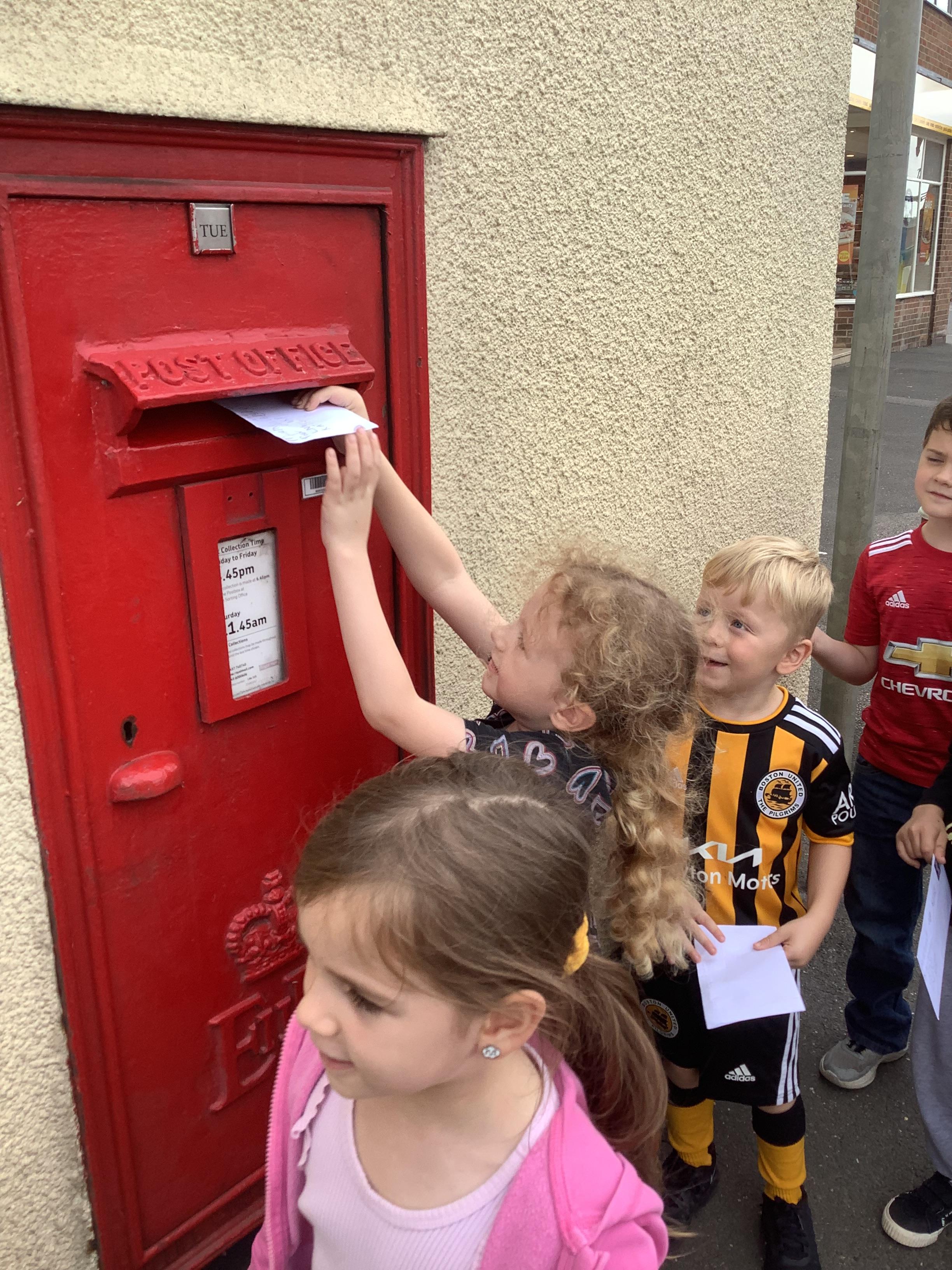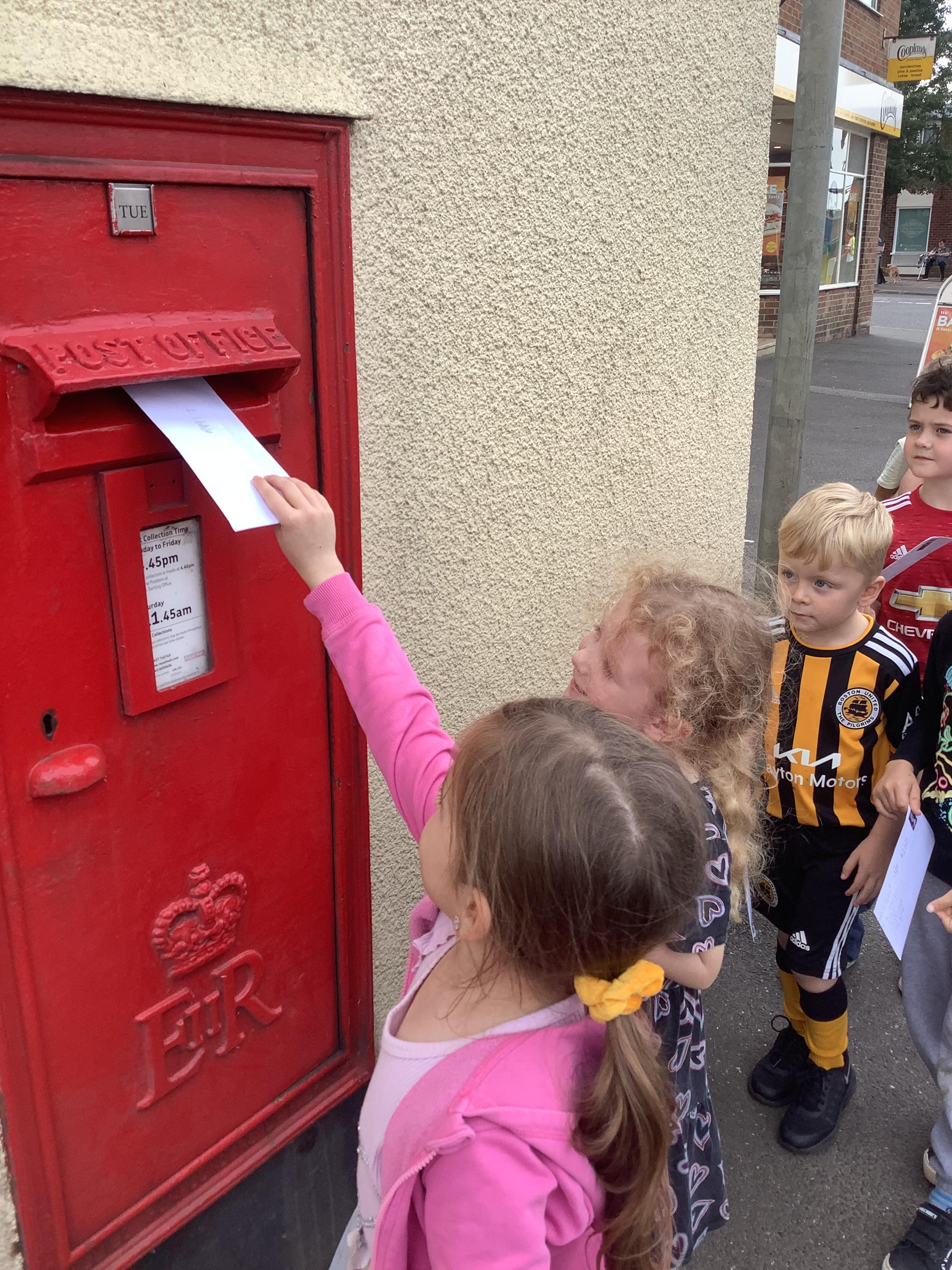 Today we went on a Geography field trip. We looked at the human features of Coningsby like the doctors surgery, churches, shops, roads etc. We stopped at the post office to deliver our letters. We also found some crunchy Autumn leaves which was perfect as we're talking about Autumn in Science later this week. When we got back to class we drew a map of our route.