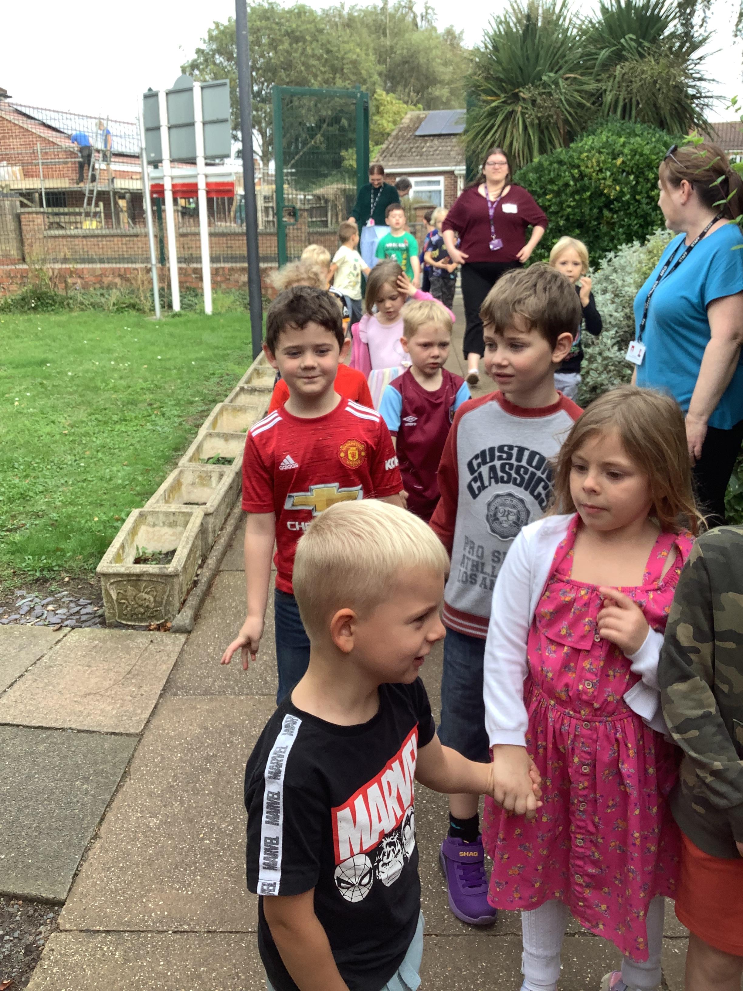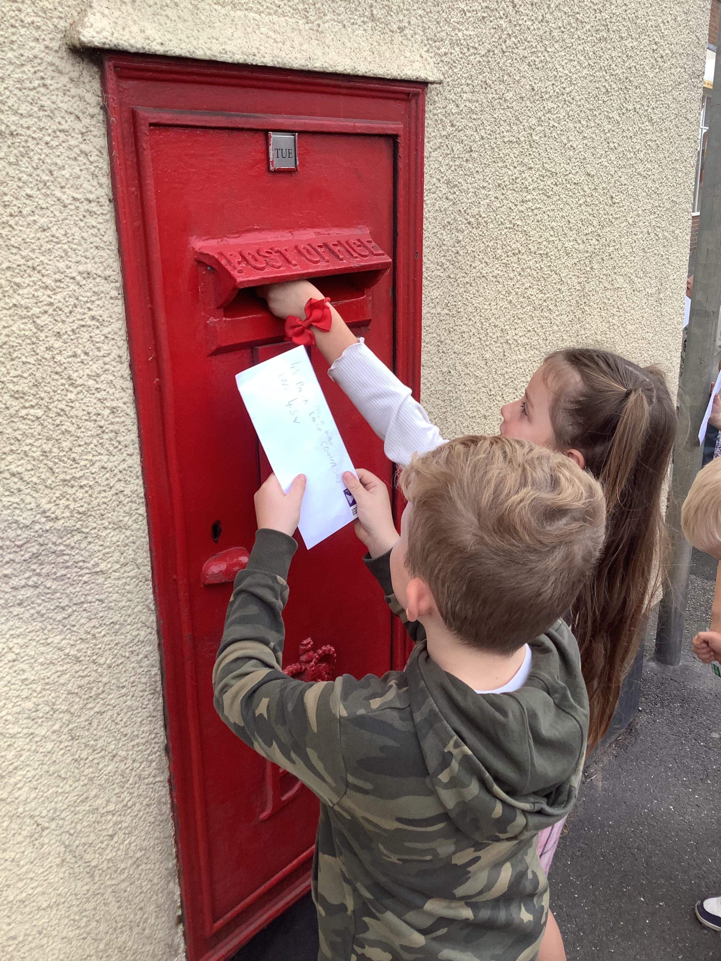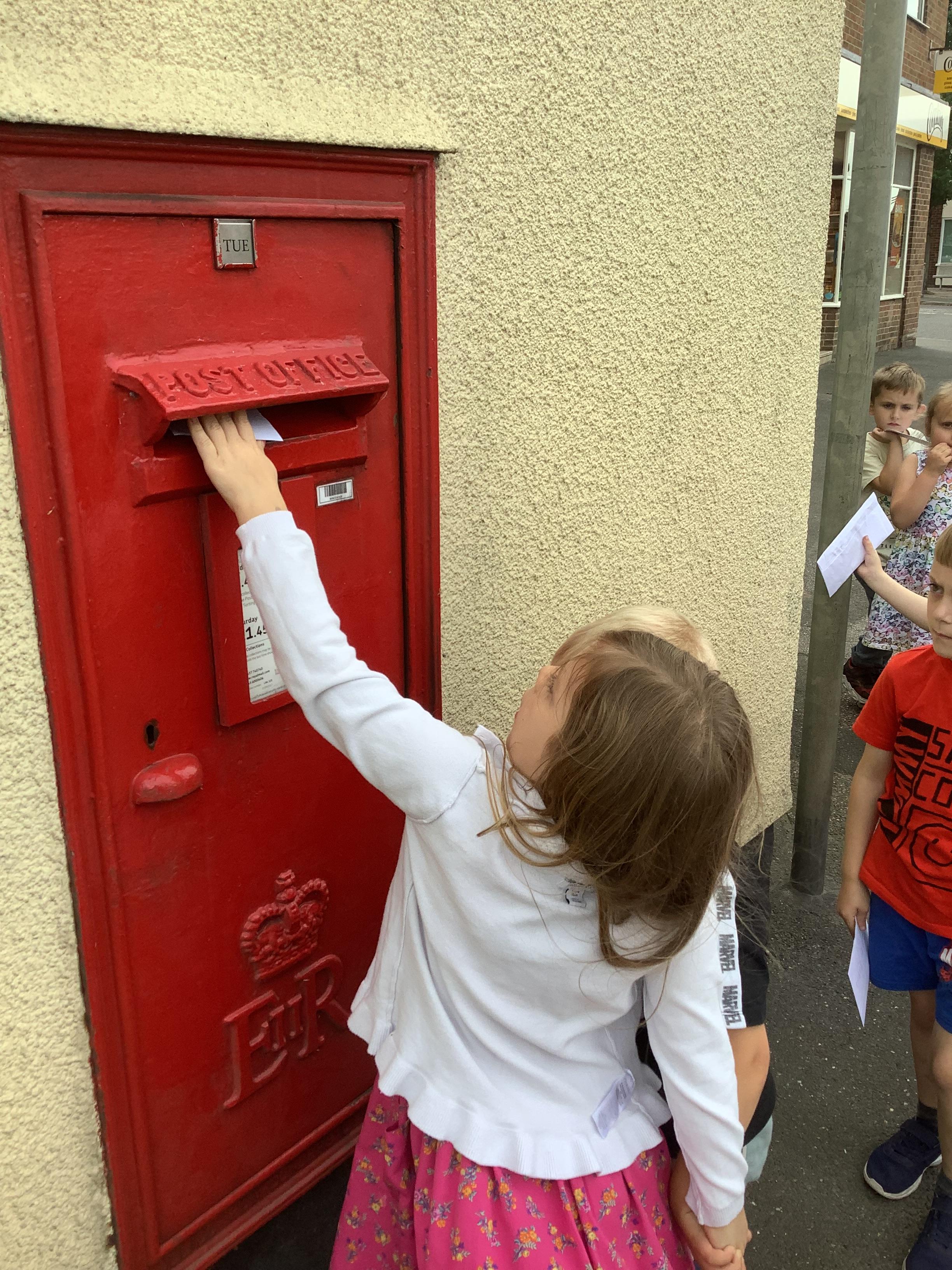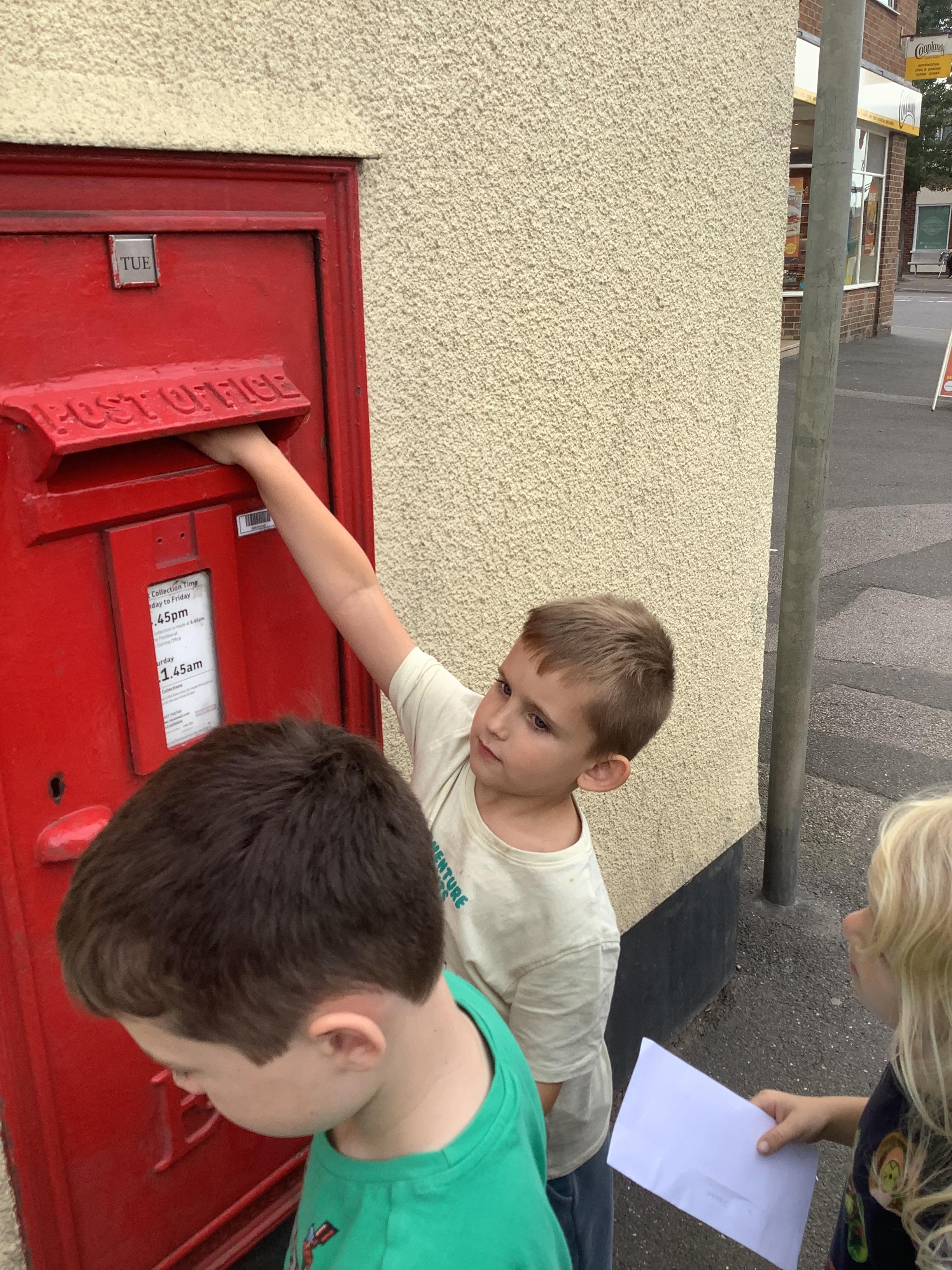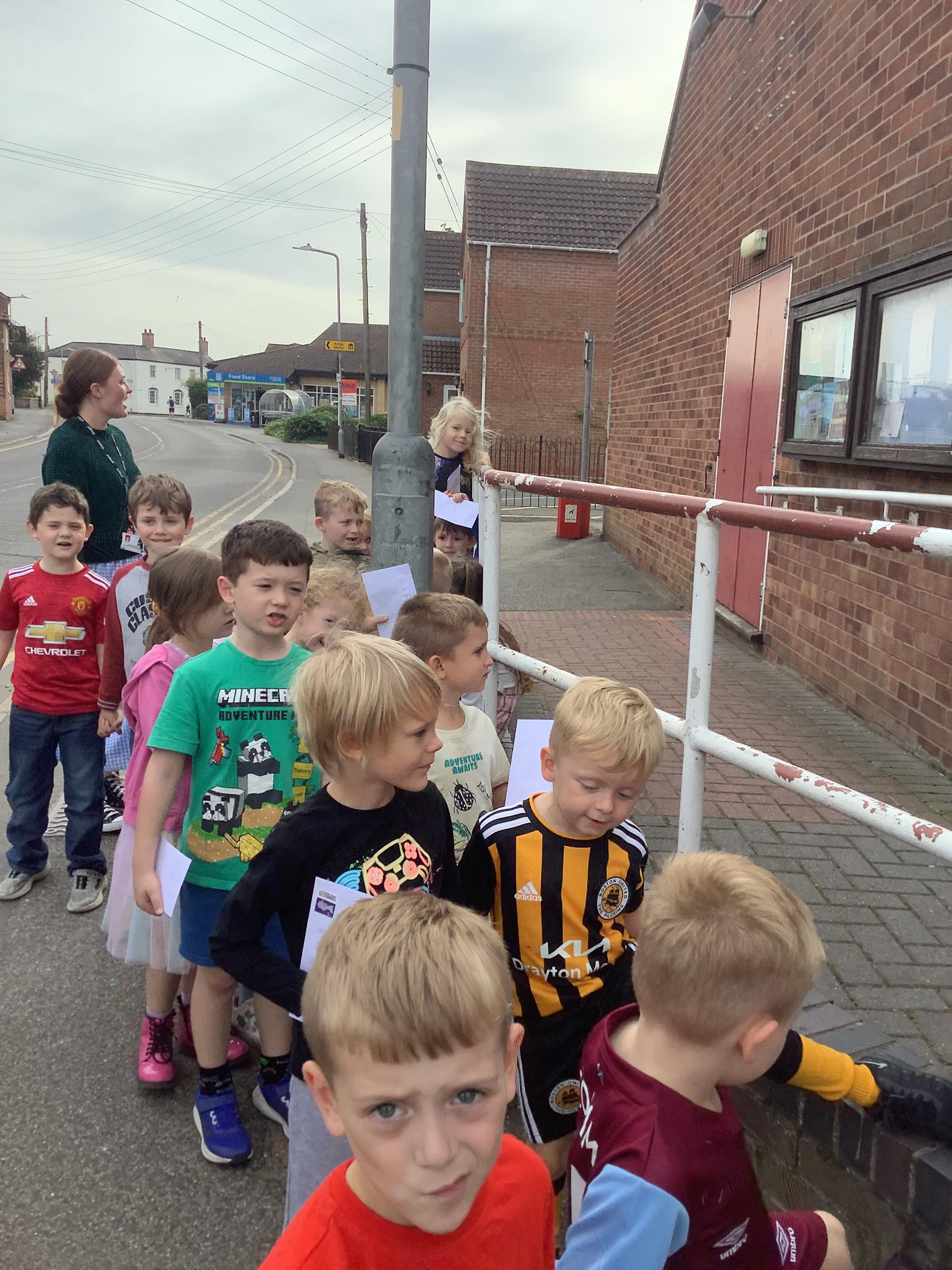 Today we went on a Geography field trip. We looked at the human features of Coningsby like the doctors surgery, churches, shops, roads etc. We stopped at the post office to deliver our letters. We also found some crunchy Autumn leaves which was perfect as we're talking about Autumn in Science later this week. When we got back to class we drew a map of our route.