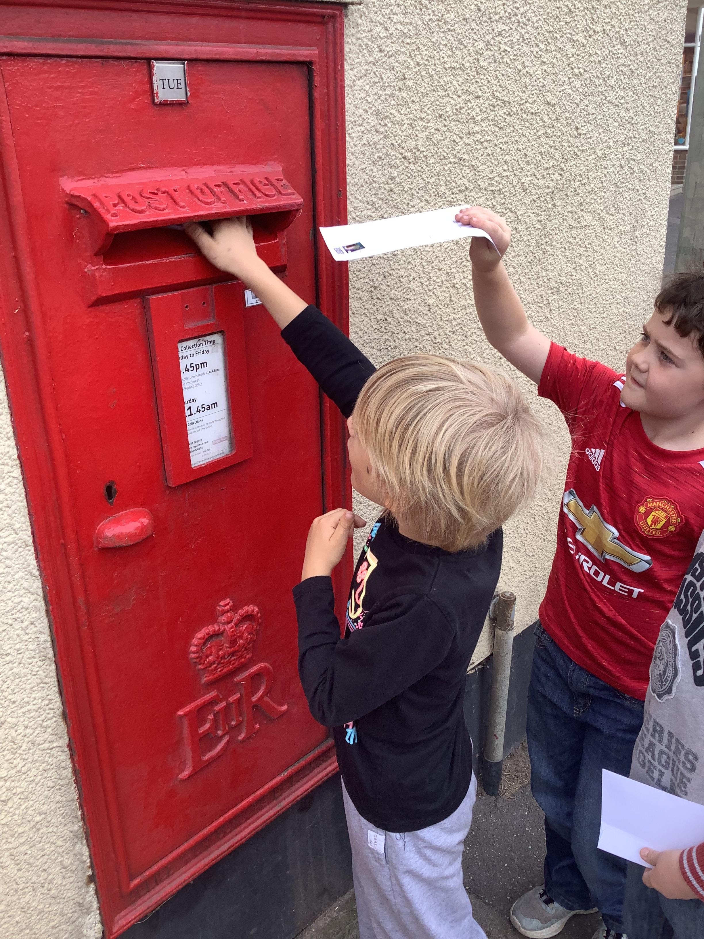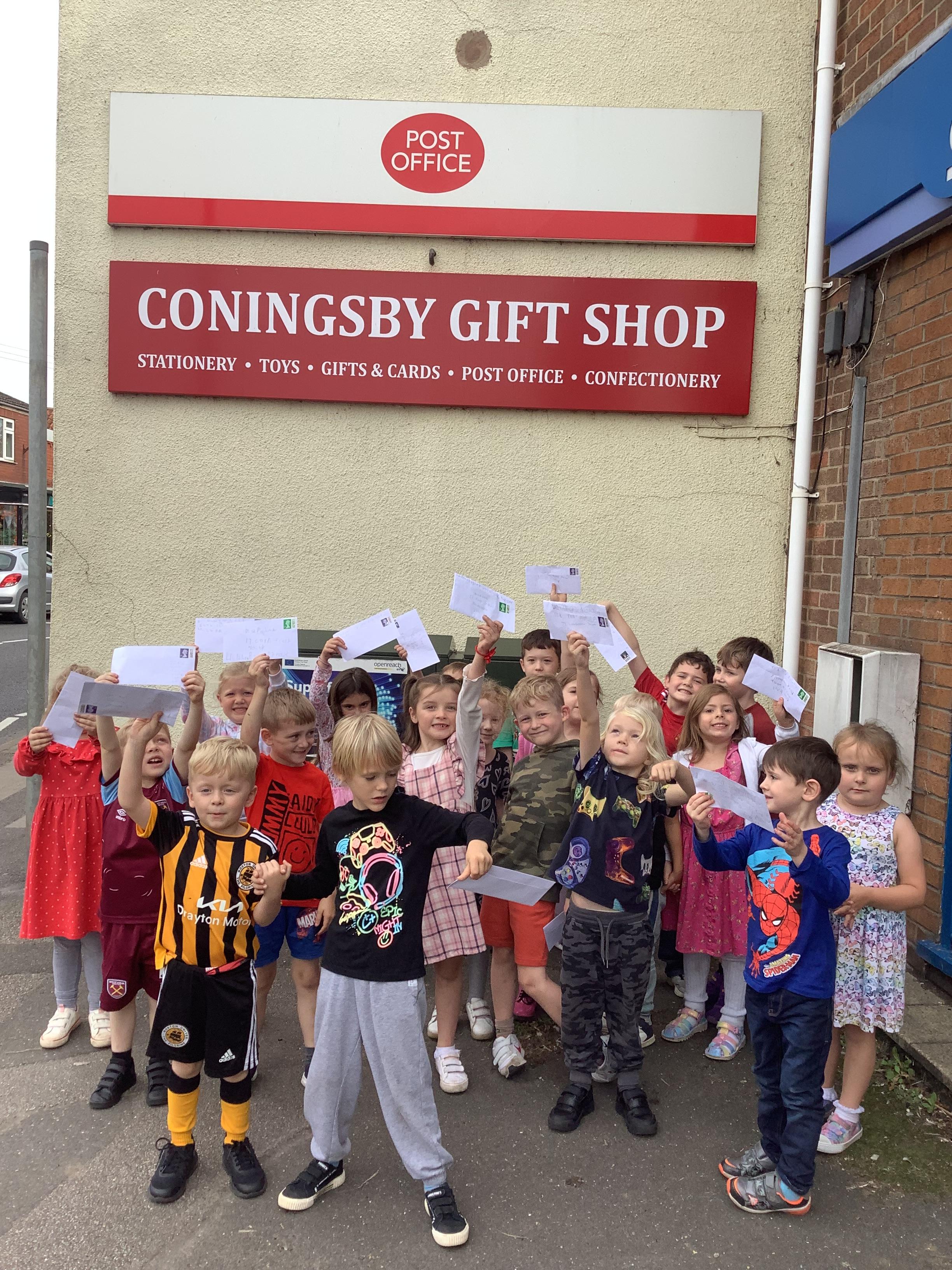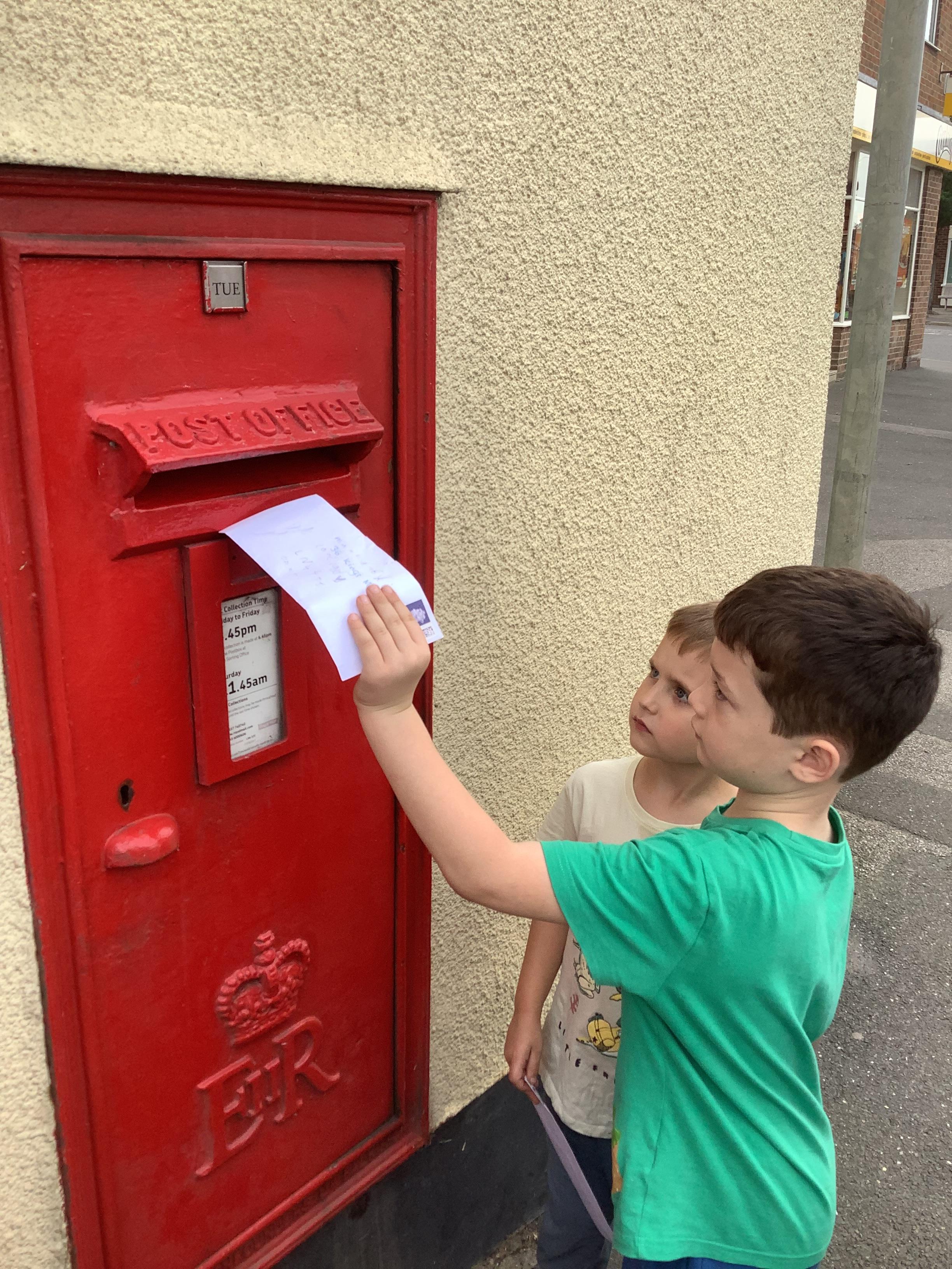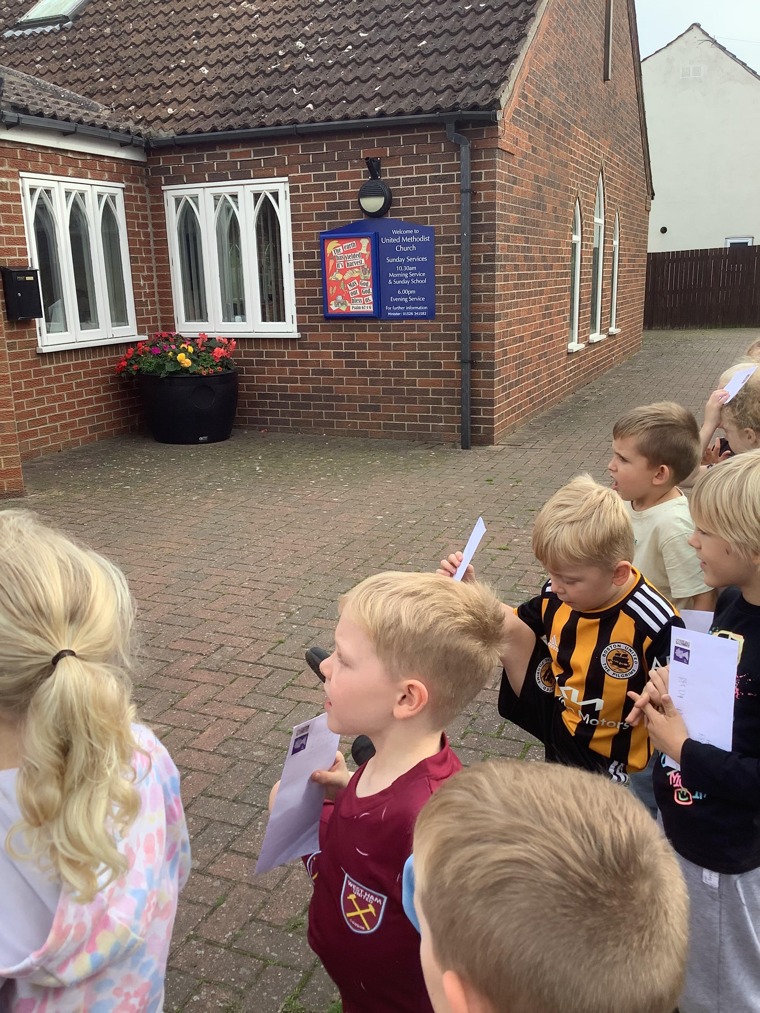 Today we went on a Geography field trip. We looked at the human features of Coningsby like the doctors surgery, churches, shops, roads etc. We stopped at the post office to deliver our letters. We also found some crunchy Autumn leaves which was perfect as we're talking about Autumn in Science later this week. When we got back to class we drew a map of our route.