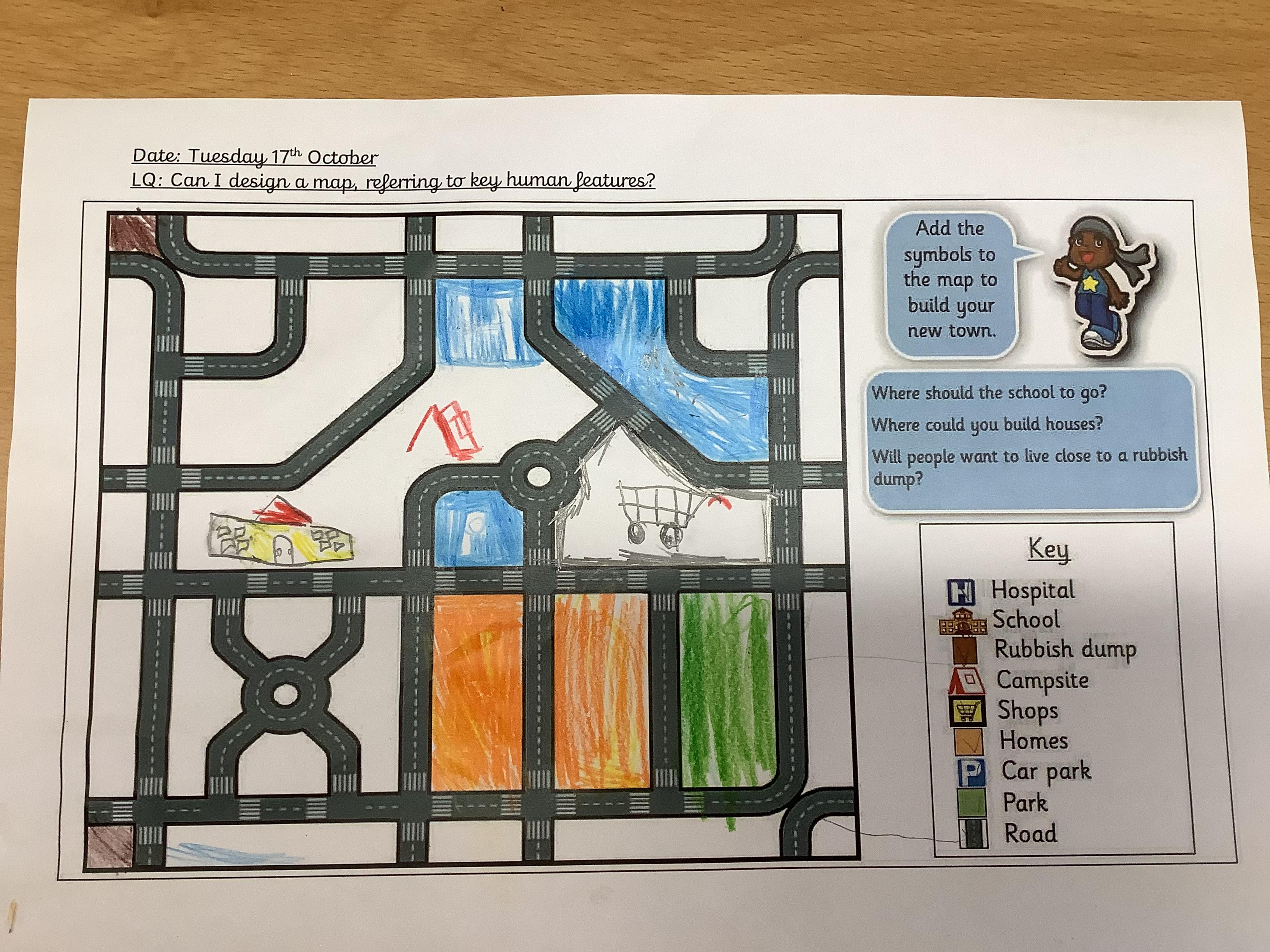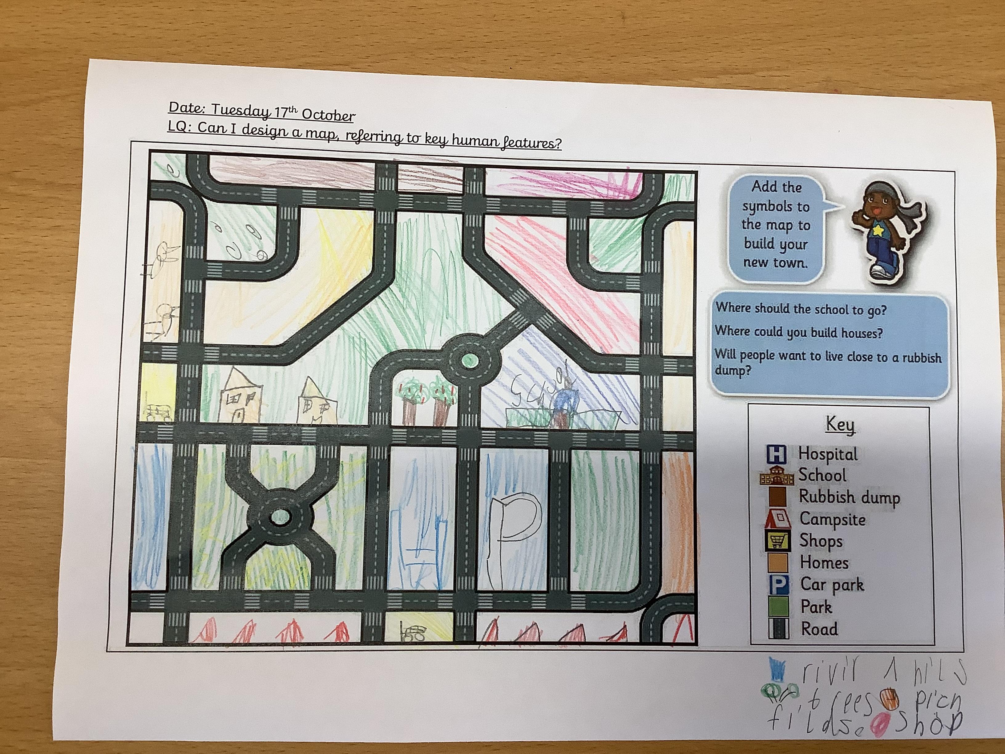 This week in Geography we discussed human features and natural features. We looked at a map of 'Spring town' - a make believe town and we discussed what human and natural features we could see. We realised that there were lots of things wrong with this town - there were no natural features, the houses were too close to the rubbish dump so it was smelly, the park was too far away from the houses and the car park was too far away from the shops! We then created our own map designs for this town, thinking about the different features we might include, their locations and how to make it a great town for its residents to live in.